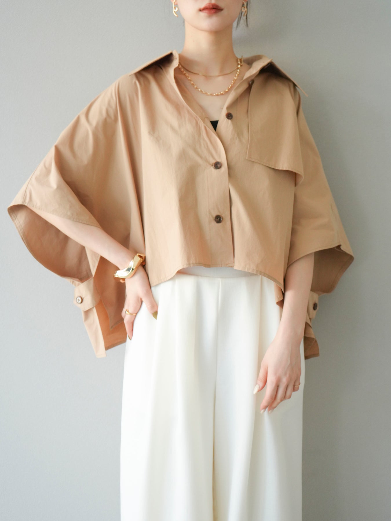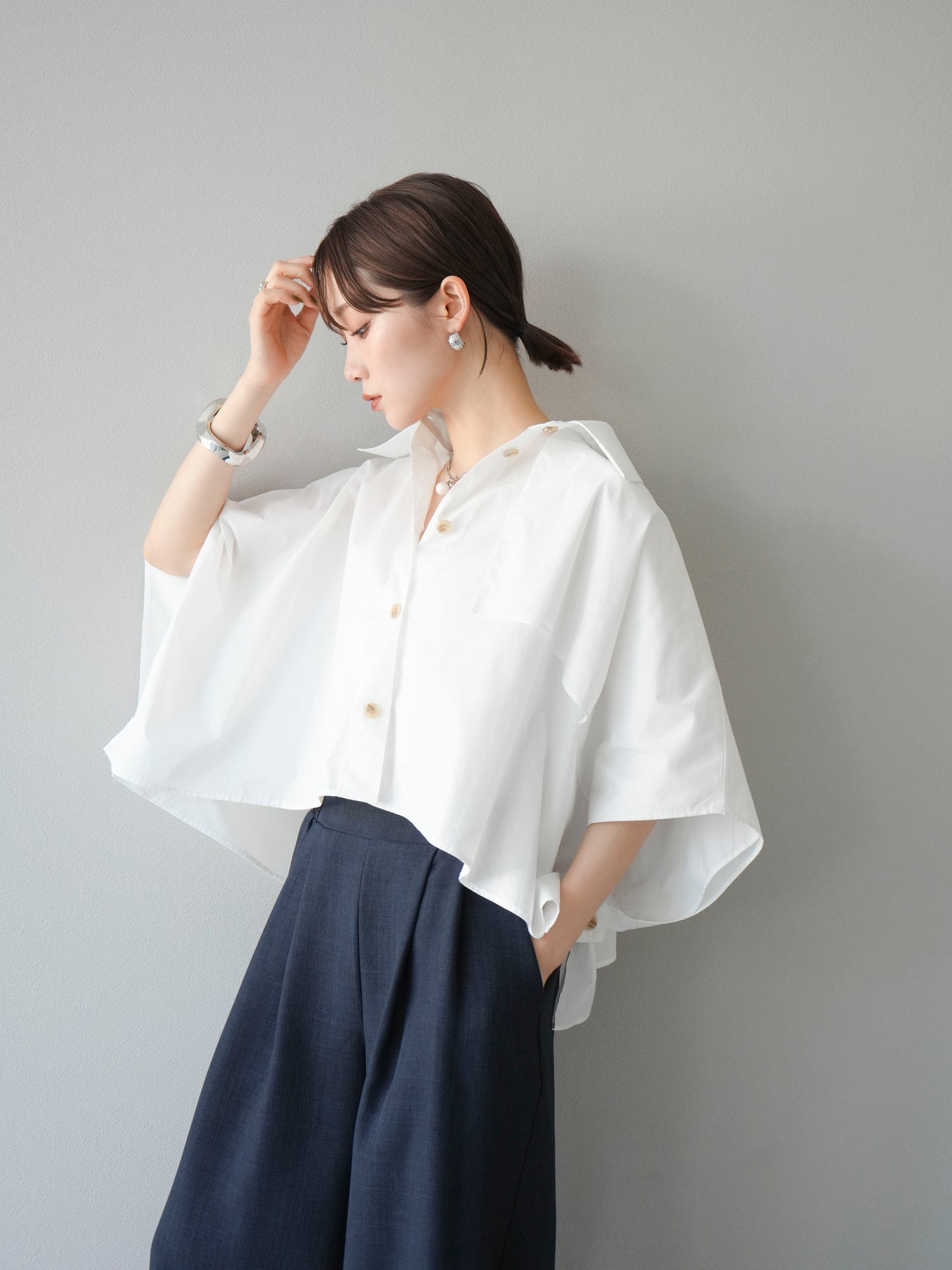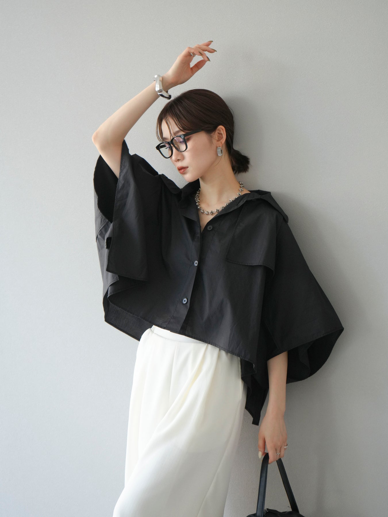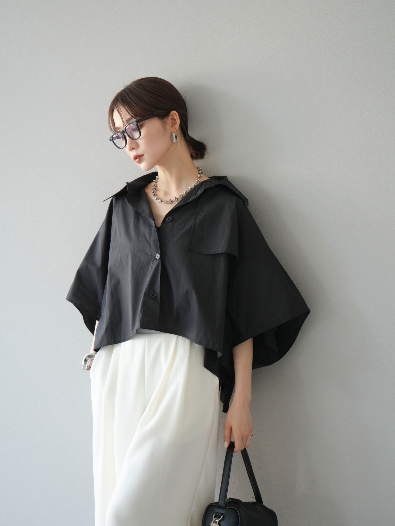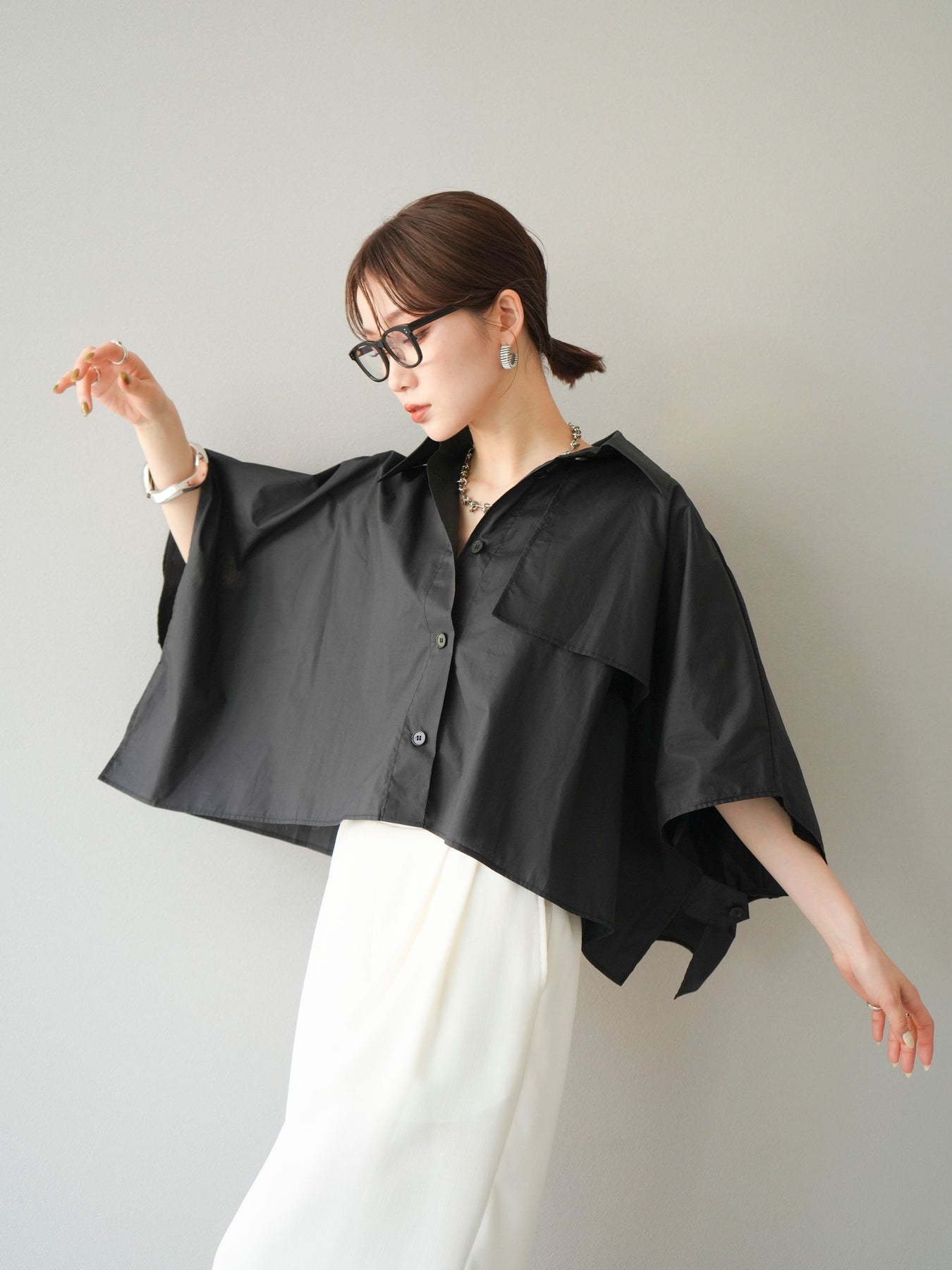 洗練されたシルエットが魅力の、ポンチョライクなショート丈シャツ。 身幅にゆとりを持たせたワイドシルエットと、構築的なデザインがスタイリングにモードな印象を与えてくれます。 風を通す軽やかな素材感と、抜け感のあるドロップショルダーがこなれた雰囲気を演出。 ショート丈ながら前後差のあるヘムラインで、ハイウエストボトムやワンピースとの相性も抜群です。 一枚で主役としても、タンクやキャミとのレイヤードで羽織りとしても活躍。 モードにもカジュアルにも着まわせる、夏の新定番シャツです