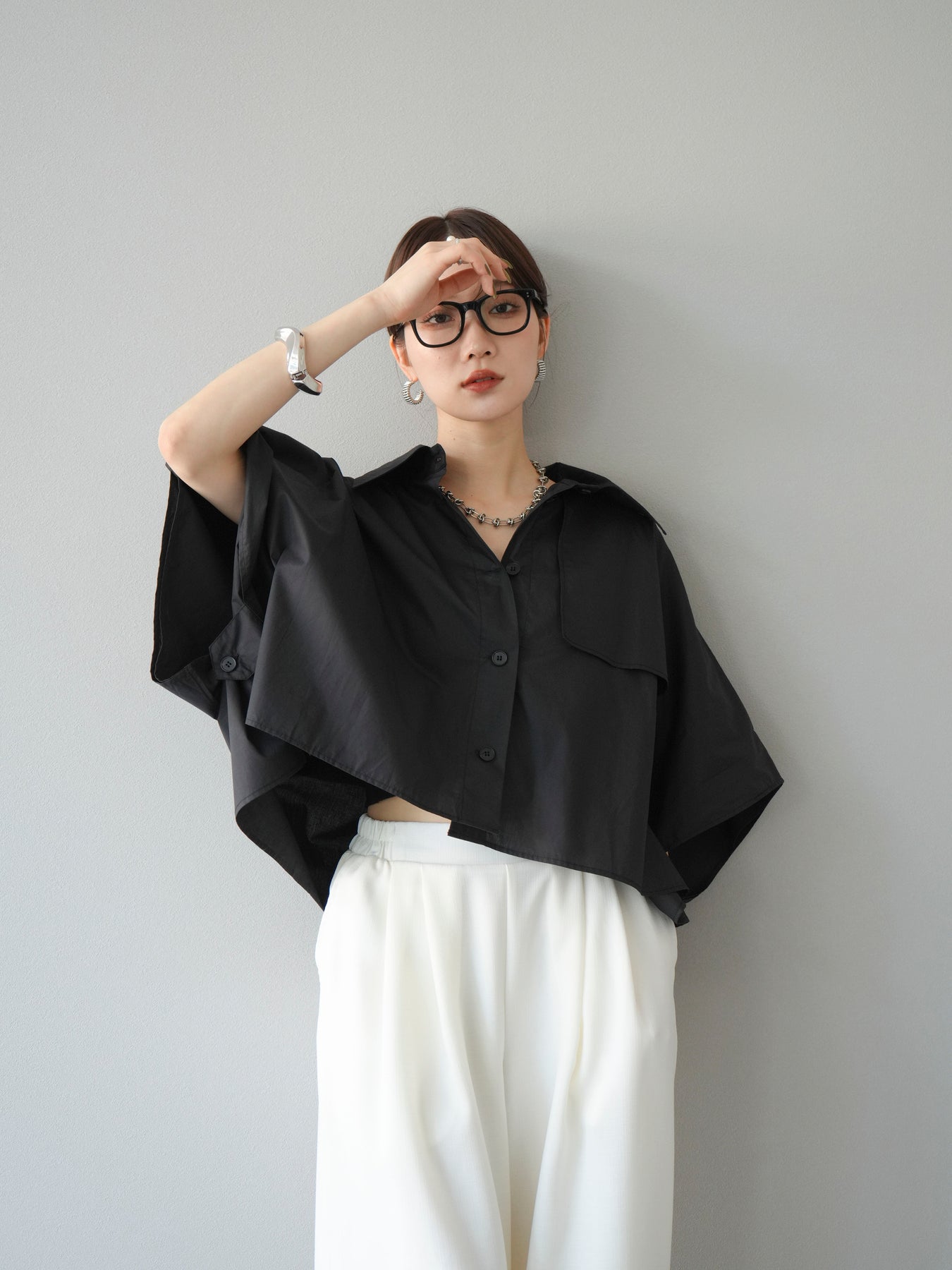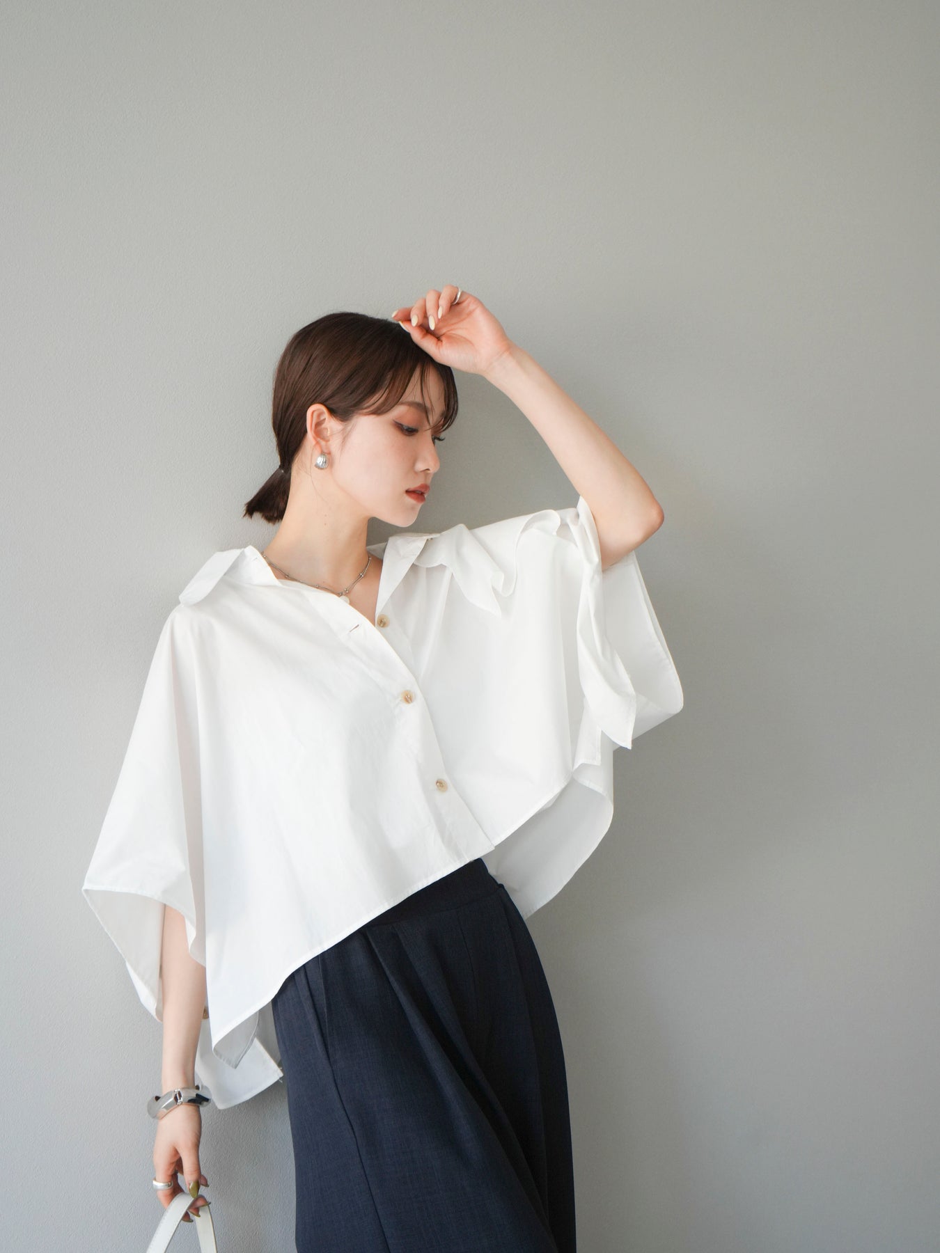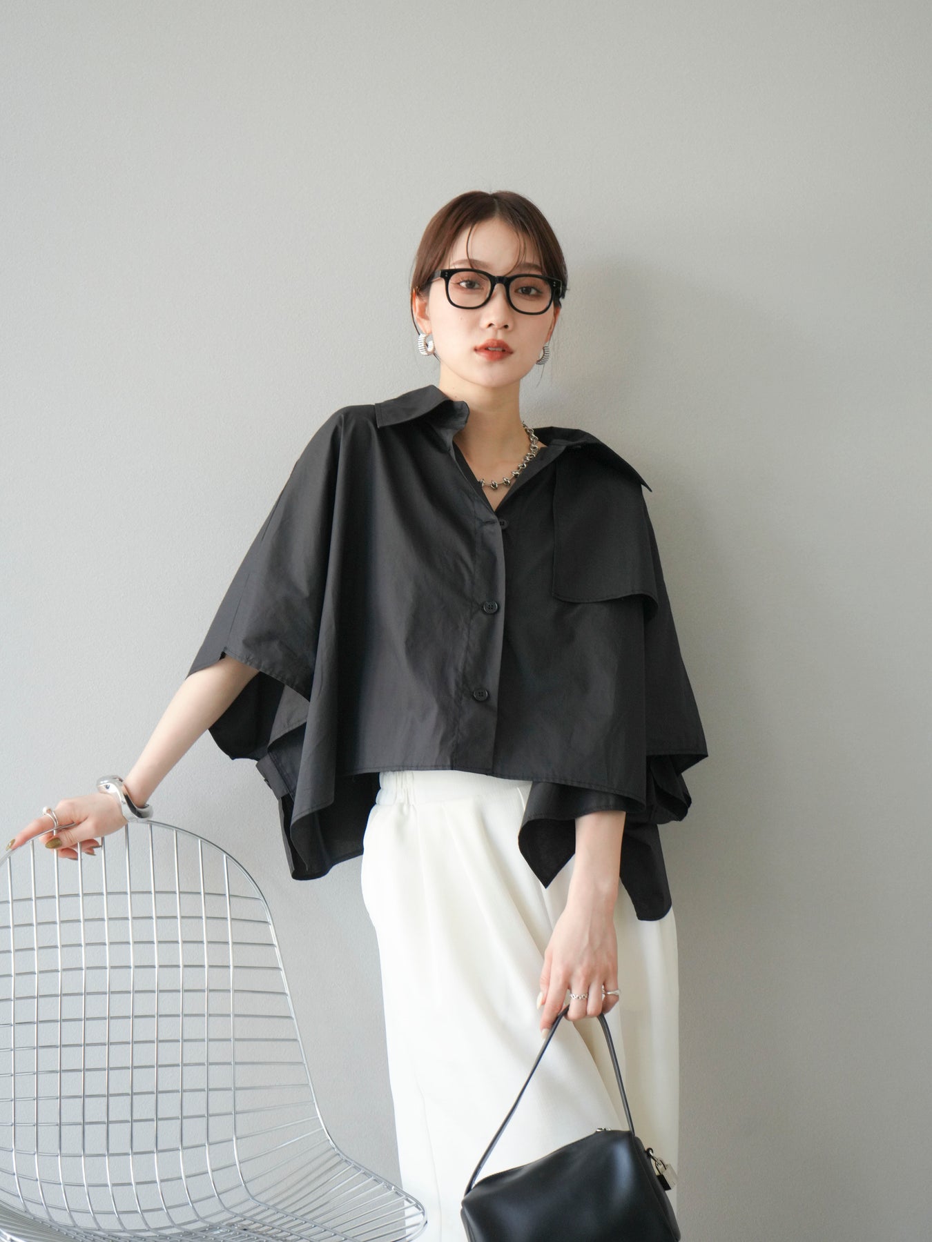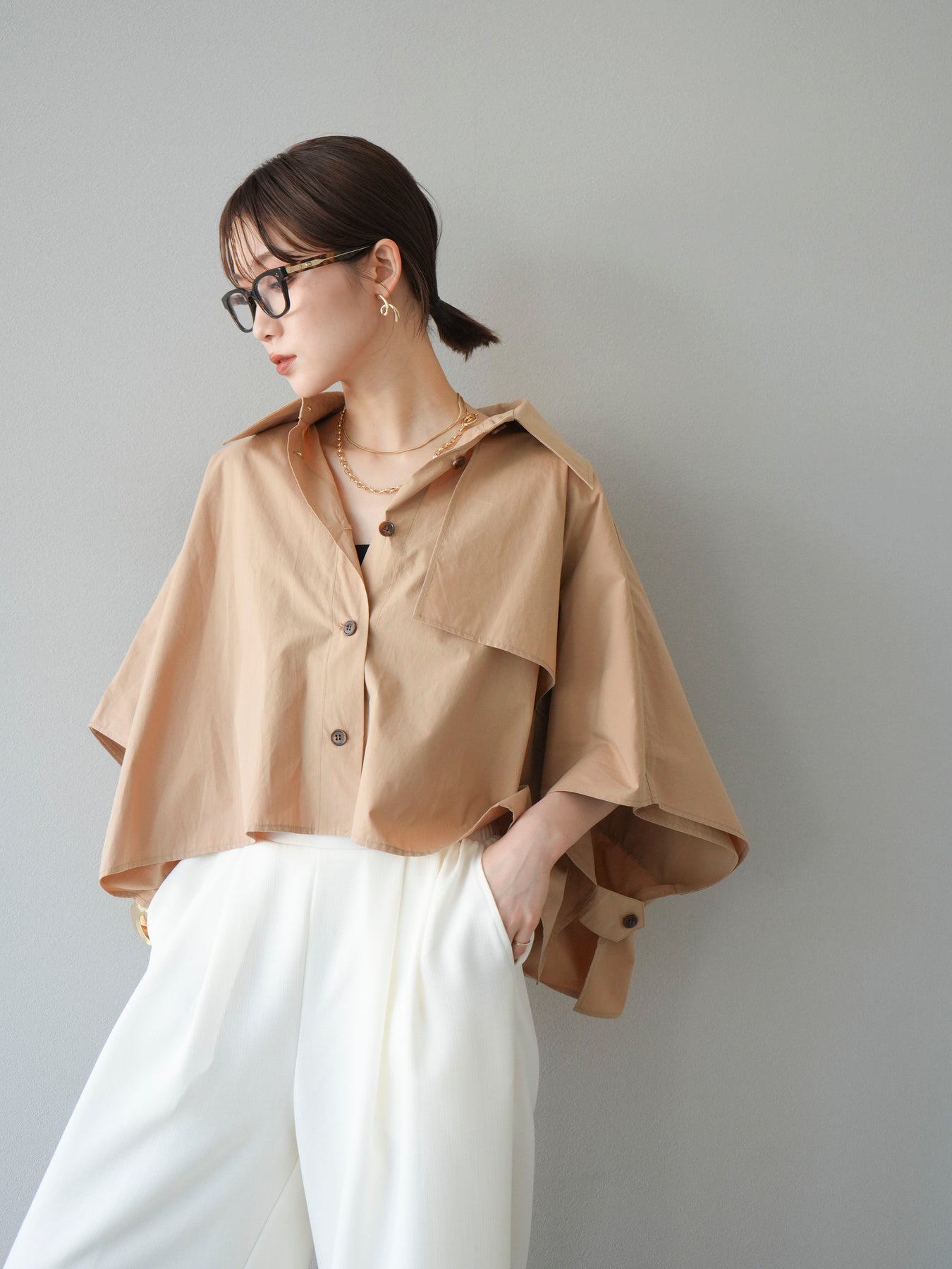 洗練されたシルエットが魅力の、ポンチョライクなショート丈シャツ。 身幅にゆとりを持たせたワイドシルエットと、構築的なデザインがスタイリングにモードな印象を与えてくれます。 風を通す軽やかな素材感と、抜け感のあるドロップショルダーがこなれた雰囲気を演出。 ショート丈ながら前後差のあるヘムラインで、ハイウエストボトムやワンピースとの相性も抜群です。 一枚で主役としても、タンクやキャミとのレイヤードで羽織りとしても活躍。 モードにもカジュアルにも着まわせる、夏の新定番シャツです