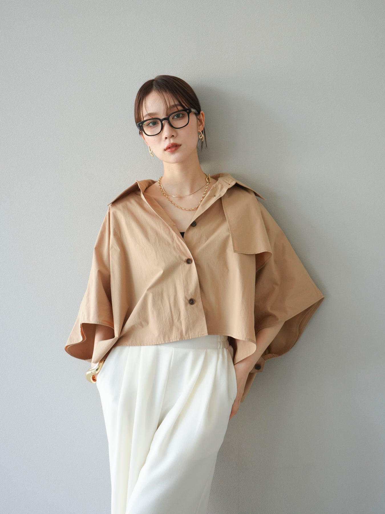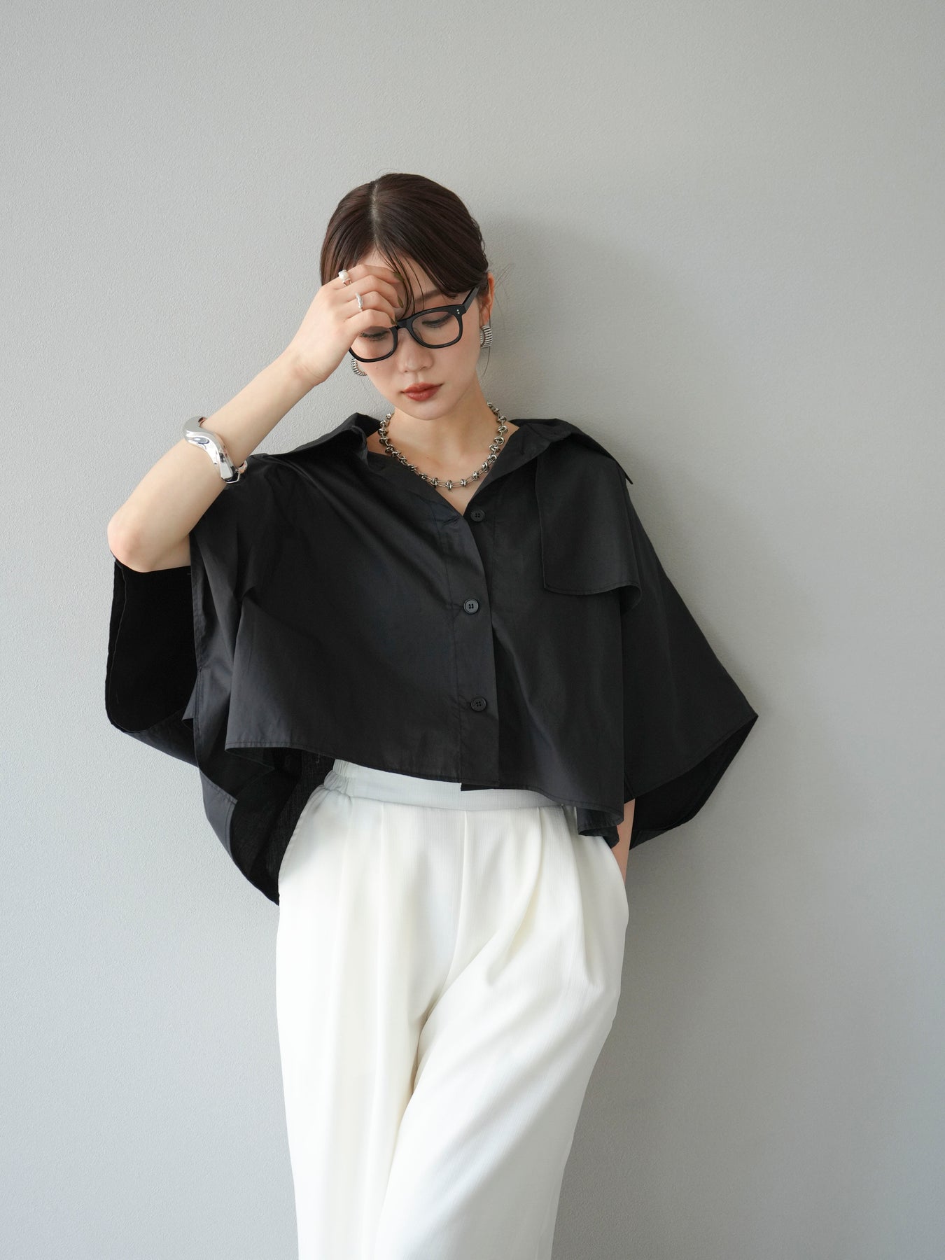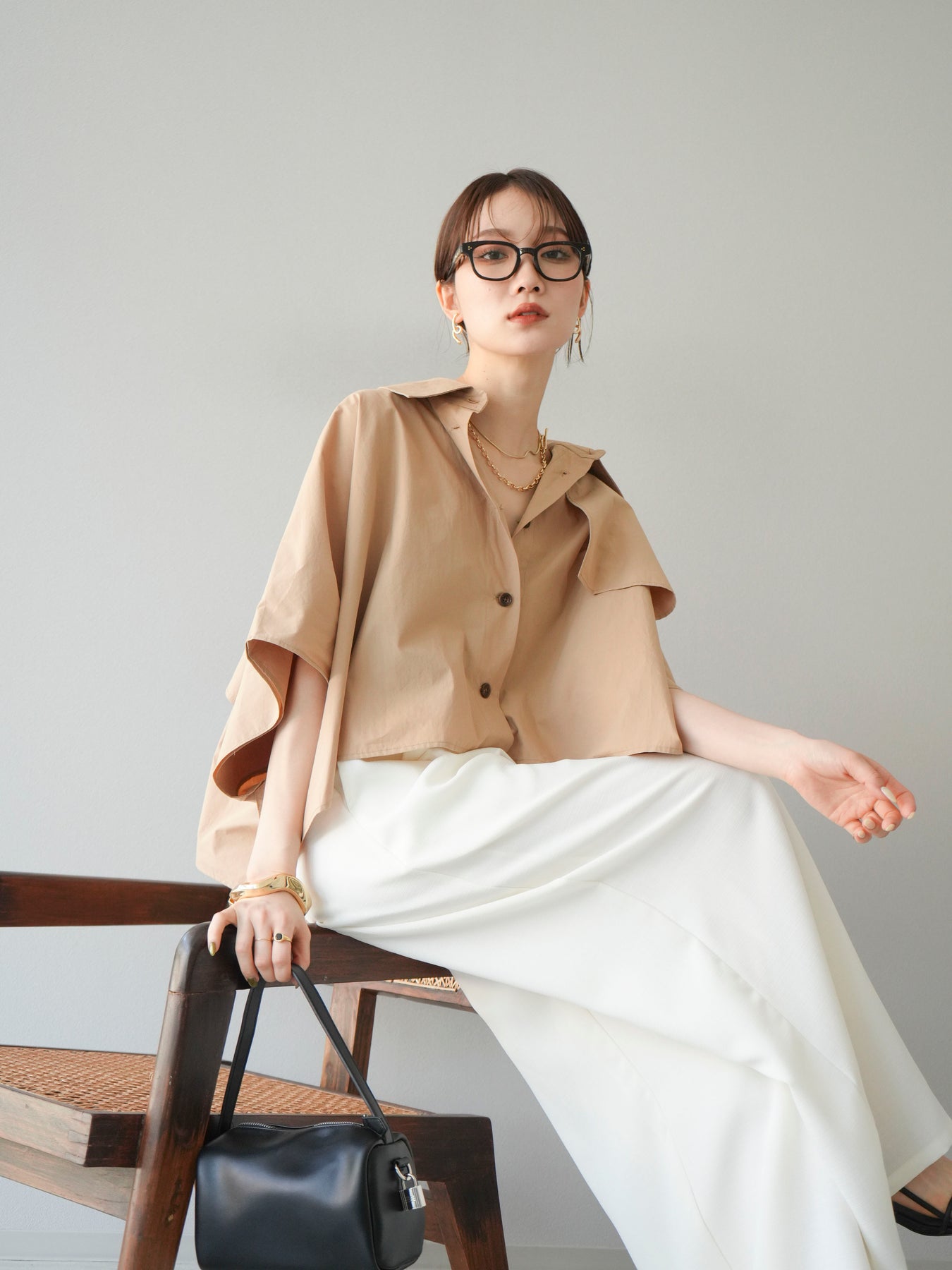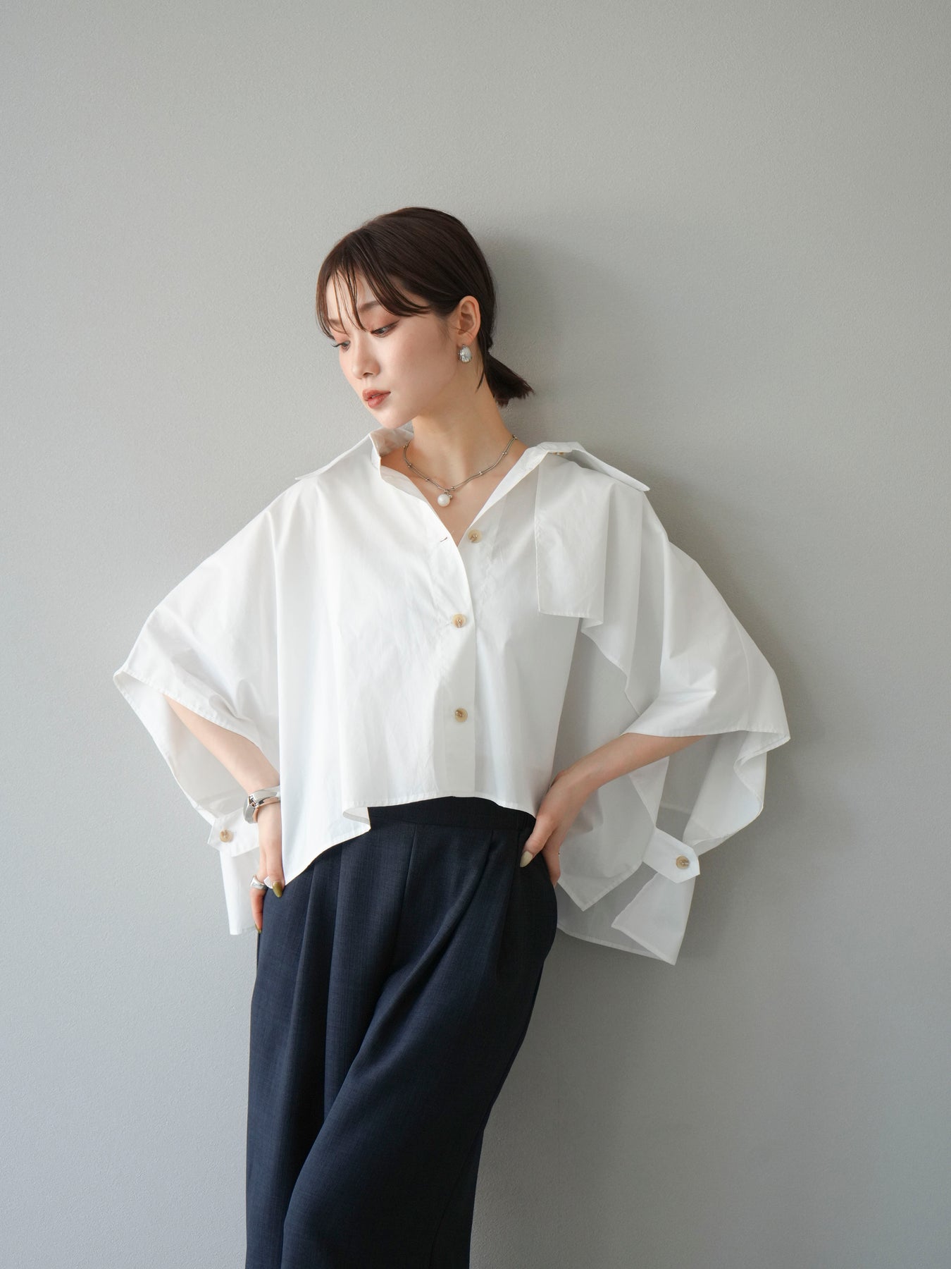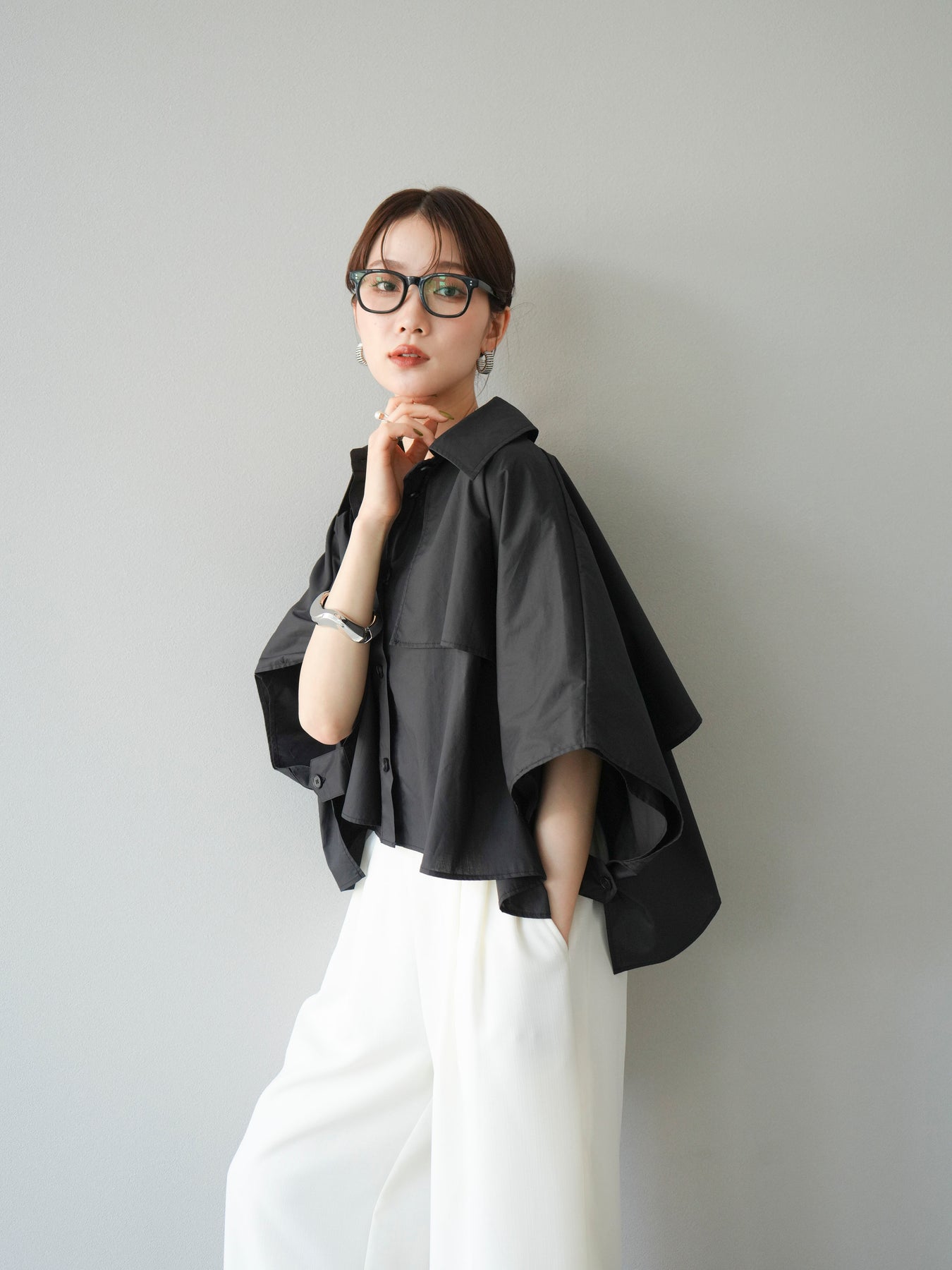 洗練されたシルエットが魅力の、ポンチョライクなショート丈シャツ。 身幅にゆとりを持たせたワイドシルエットと、構築的なデザインがスタイリングにモードな印象を与えてくれます。 風を通す軽やかな素材感と、抜け感のあるドロップショルダーがこなれた雰囲気を演出。 ショート丈ながら前後差のあるヘムラインで、ハイウエストボトムやワンピースとの相性も抜群です。 一枚で主役としても、タンクやキャミとのレイヤードで羽織りとしても活躍。 モードにもカジュアルにも着まわせる、夏の新定番シャツです