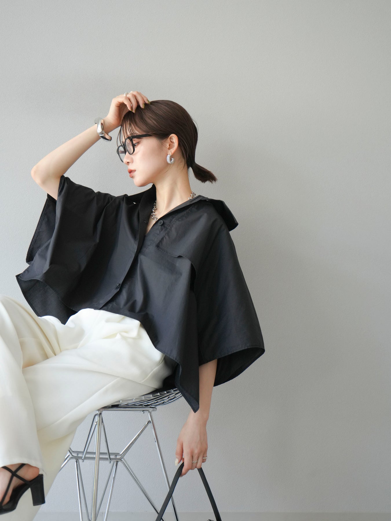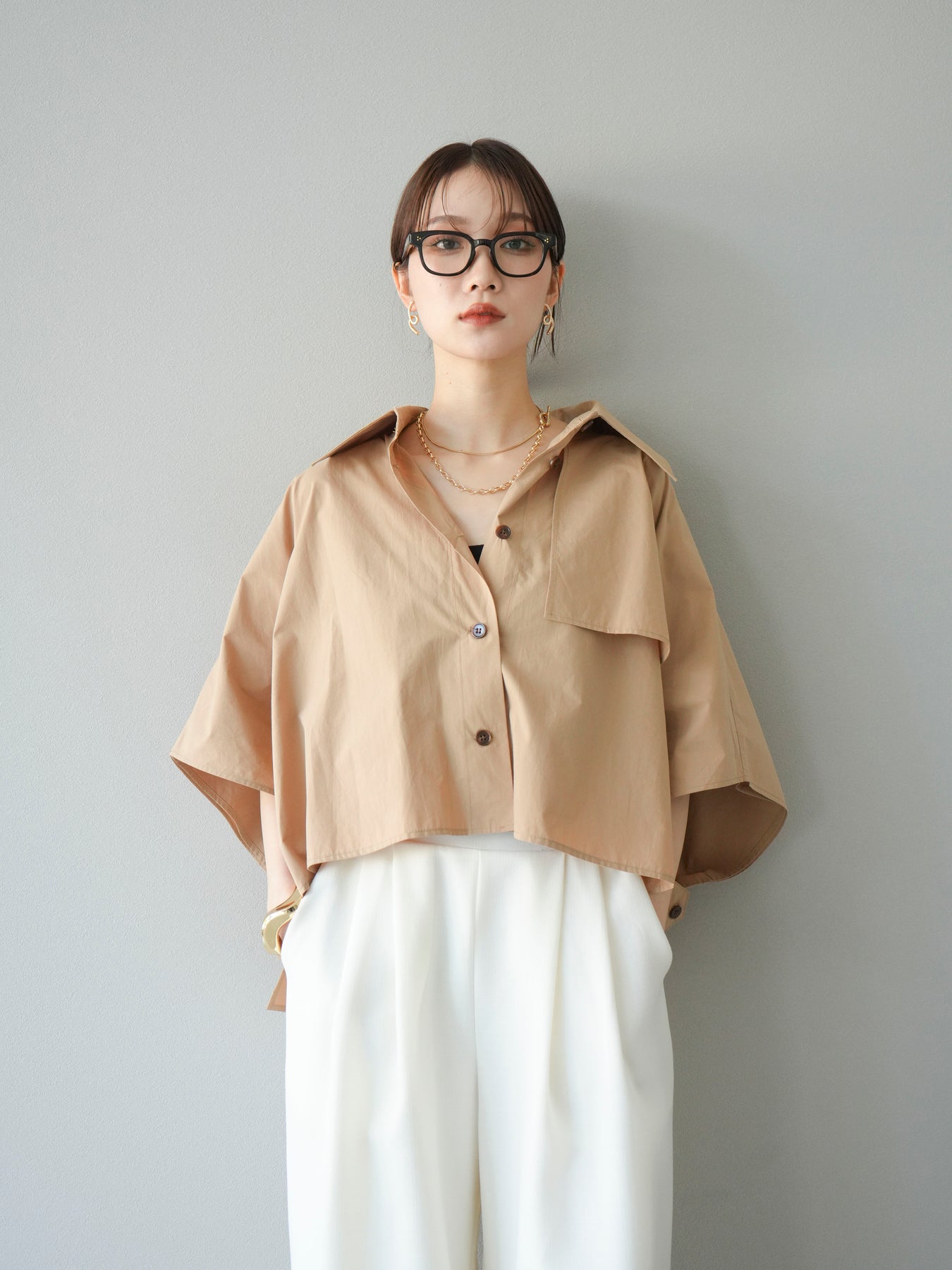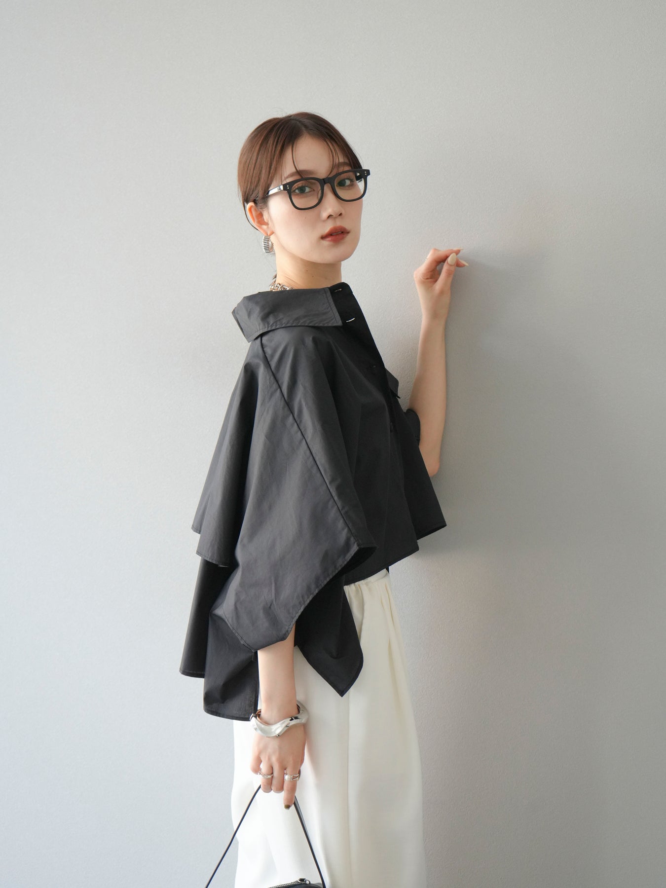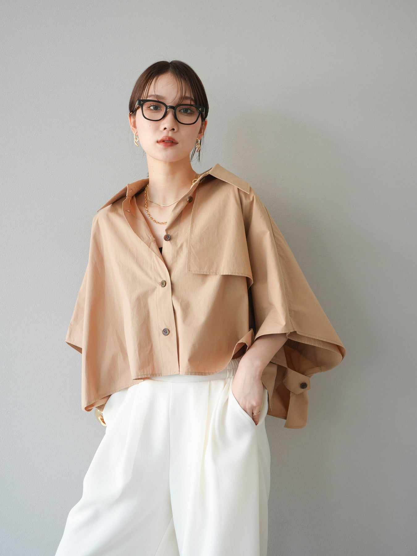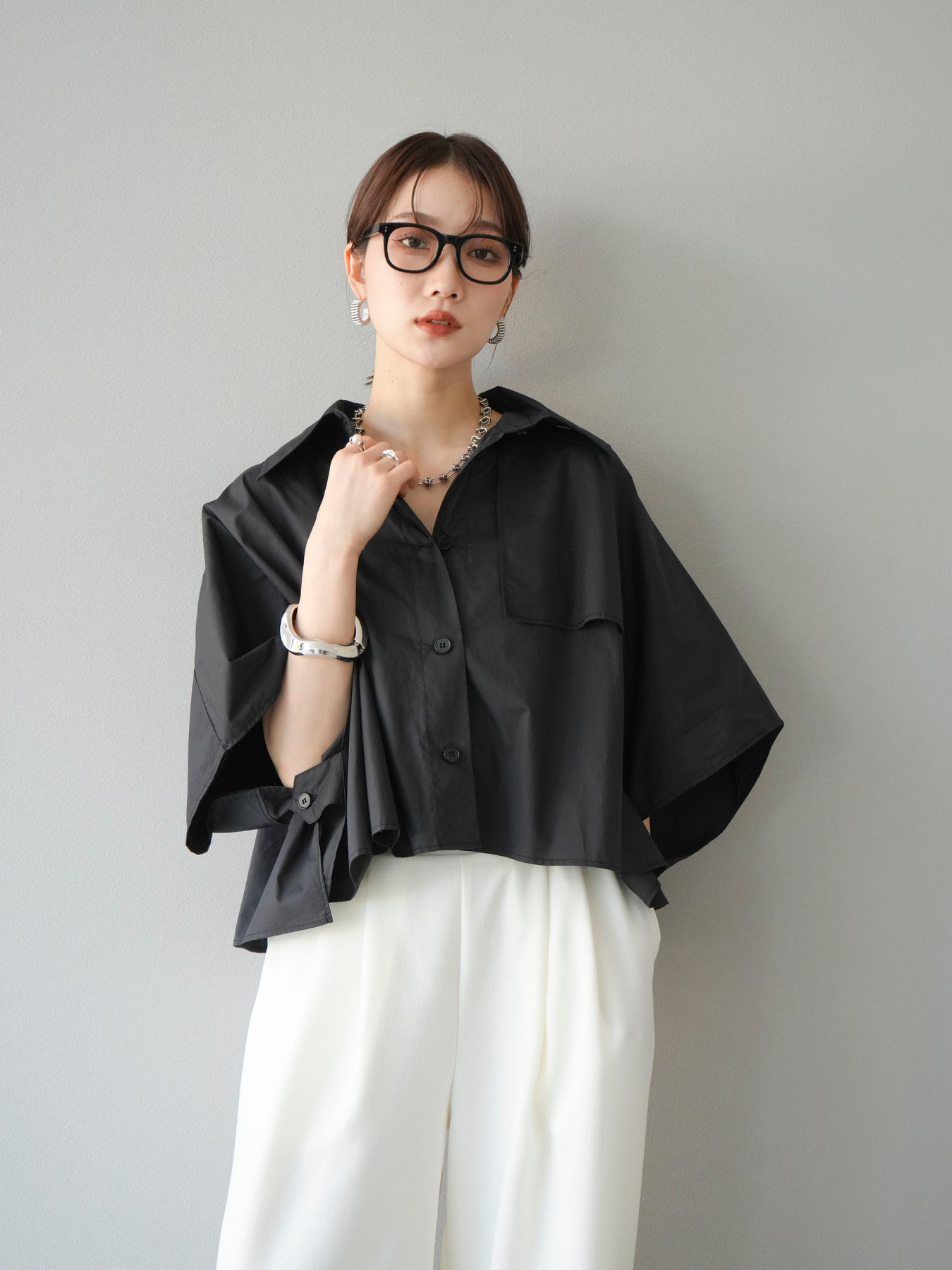 洗練されたシルエットが魅力の、ポンチョライクなショート丈シャツ。 身幅にゆとりを持たせたワイドシルエットと、構築的なデザインがスタイリングにモードな印象を与えてくれます。 風を通す軽やかな素材感と、抜け感のあるドロップショルダーがこなれた雰囲気を演出。 ショート丈ながら前後差のあるヘムラインで、ハイウエストボトムやワンピースとの相性も抜群です。 一枚で主役としても、タンクやキャミとのレイヤードで羽織りとしても活躍。 モードにもカジュアルにも着まわせる、夏の新定番シャツです