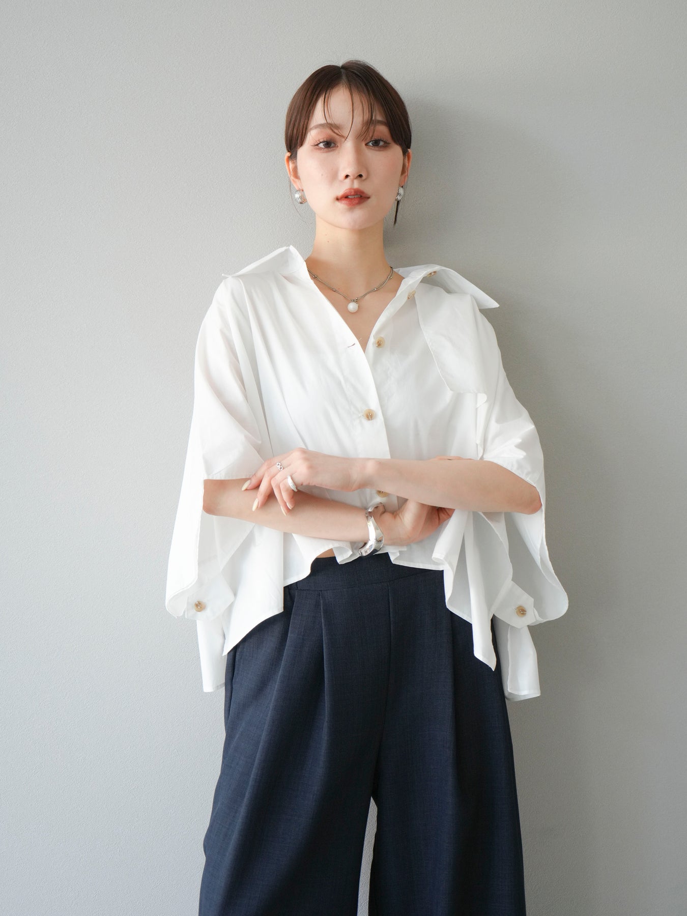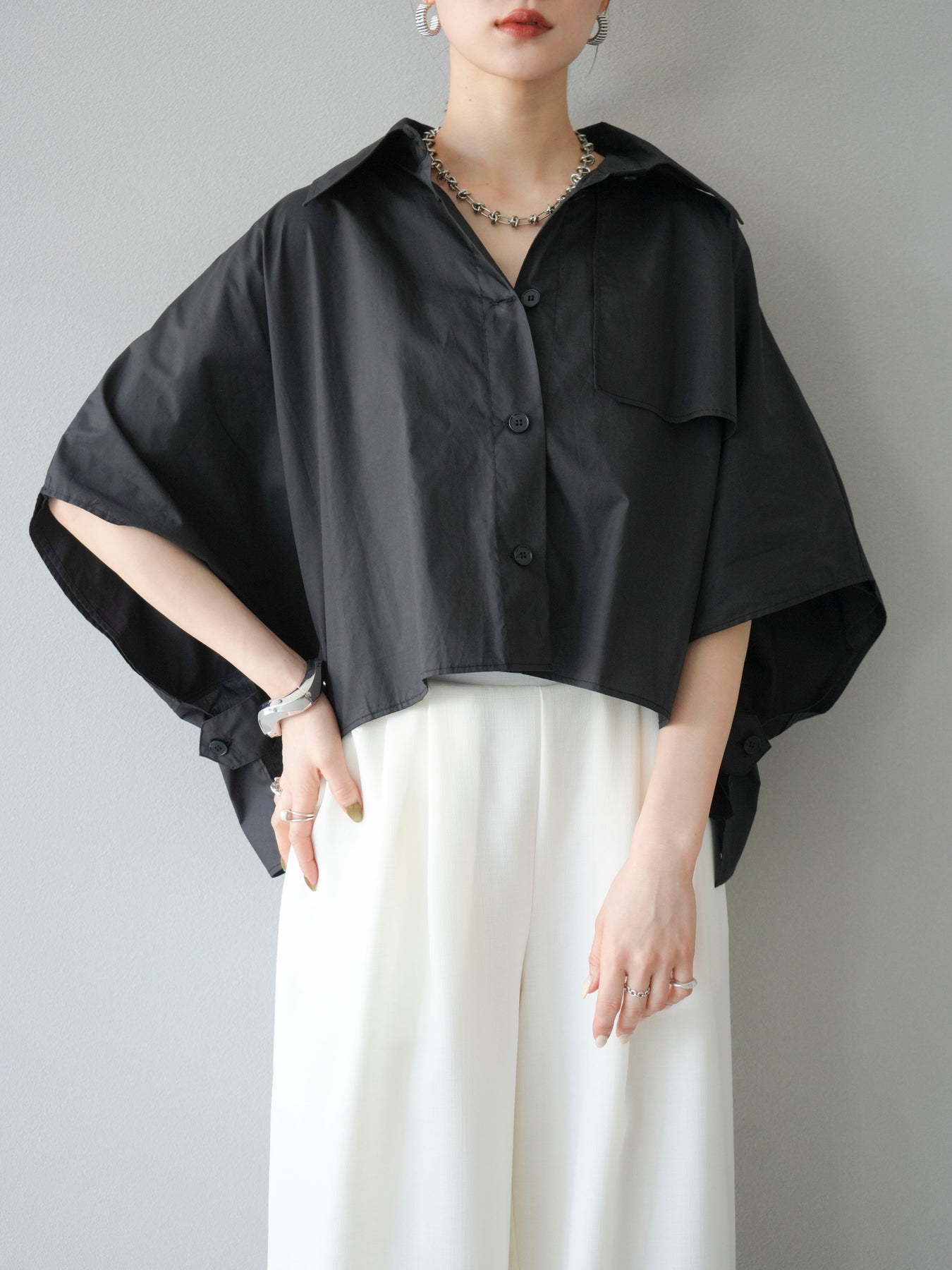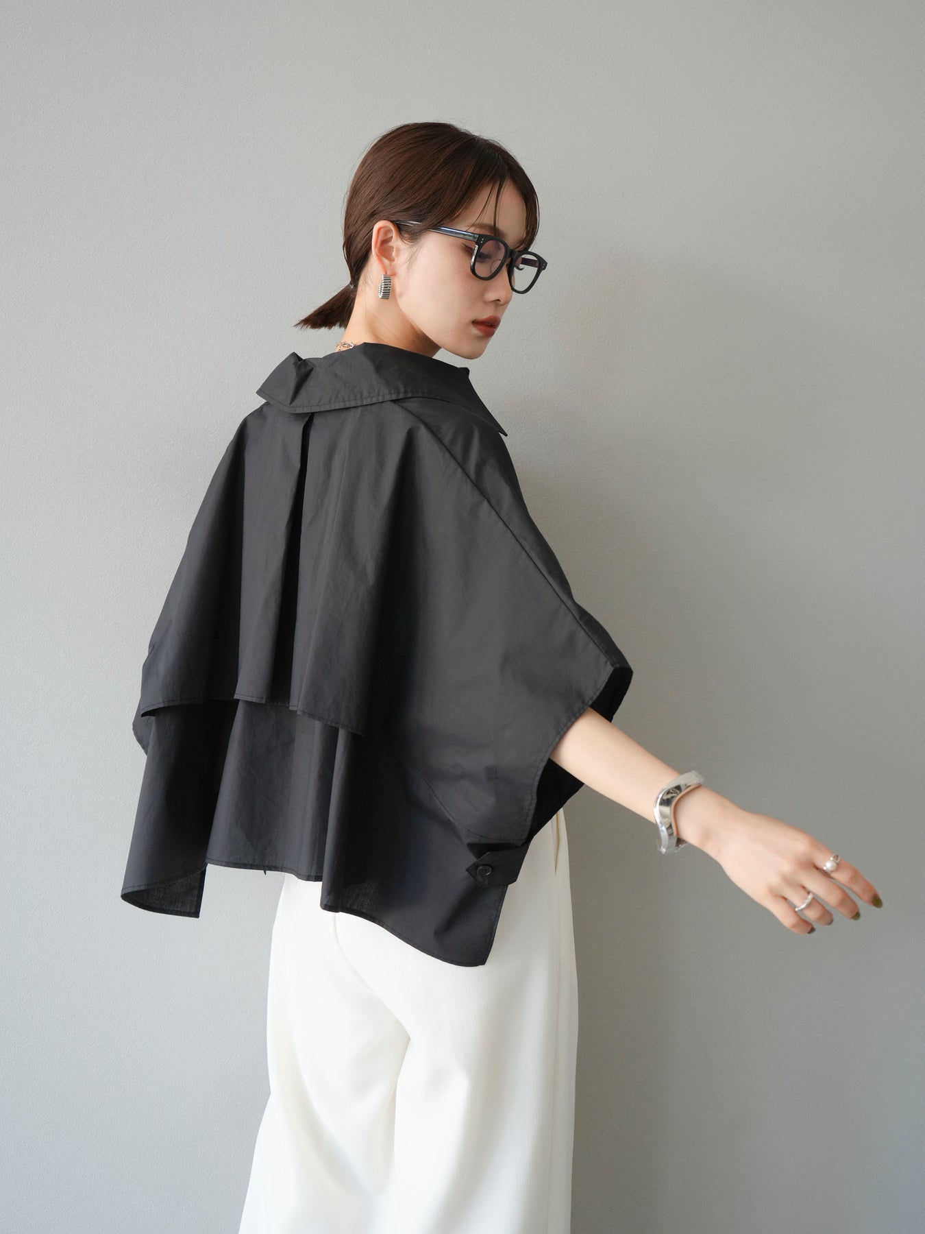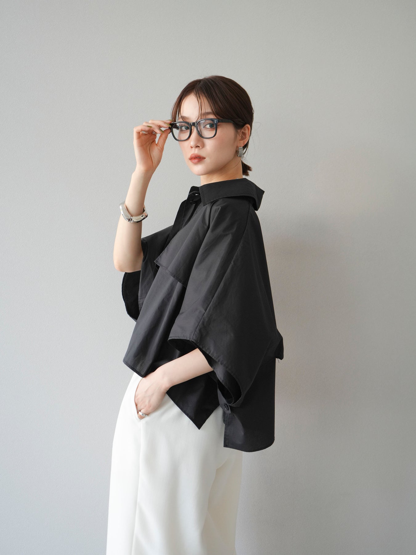 洗練されたシルエットが魅力の、ポンチョライクなショート丈シャツ。 身幅にゆとりを持たせたワイドシルエットと、構築的なデザインがスタイリングにモードな印象を与えてくれます。 風を通す軽やかな素材感と、抜け感のあるドロップショルダーがこなれた雰囲気を演出。 ショート丈ながら前後差のあるヘムラインで、ハイウエストボトムやワンピースとの相性も抜群です。 一枚で主役としても、タンクやキャミとのレイヤードで羽織りとしても活躍。 モードにもカジュアルにも着まわせる、夏の新定番シャツです
