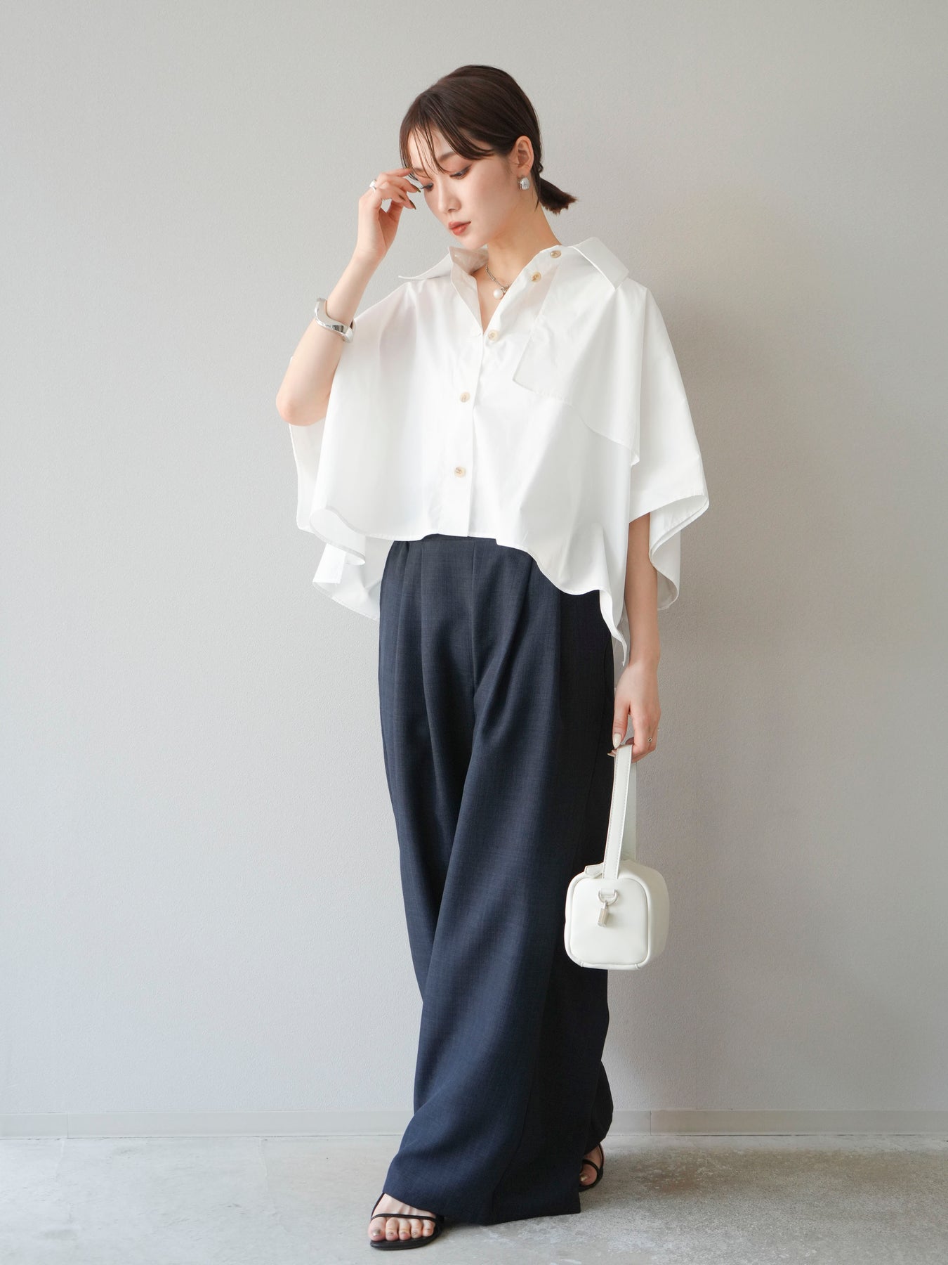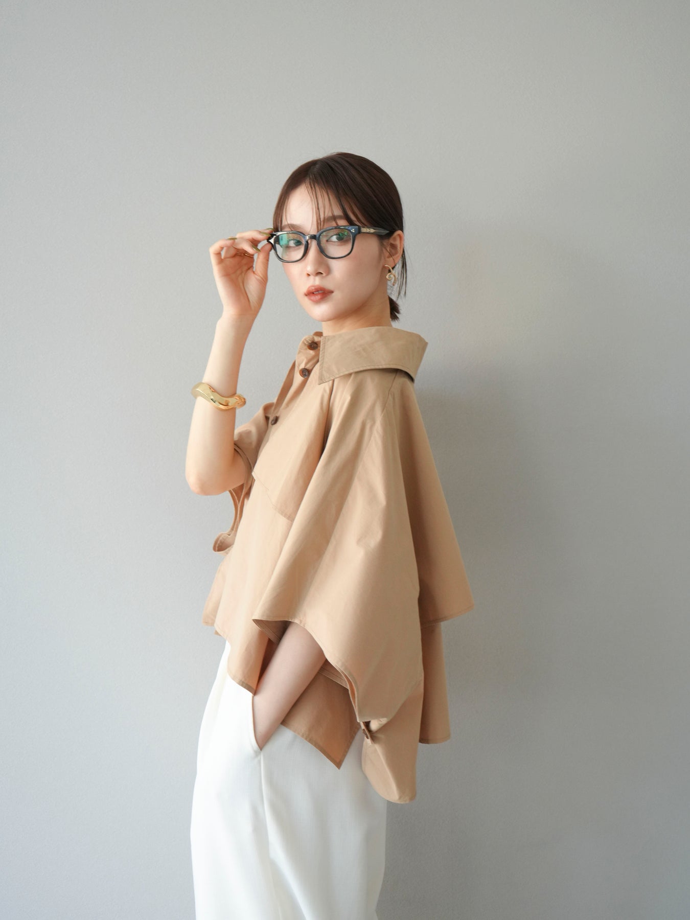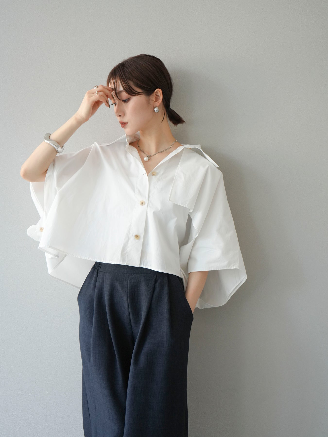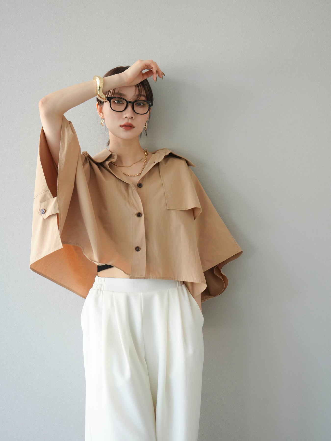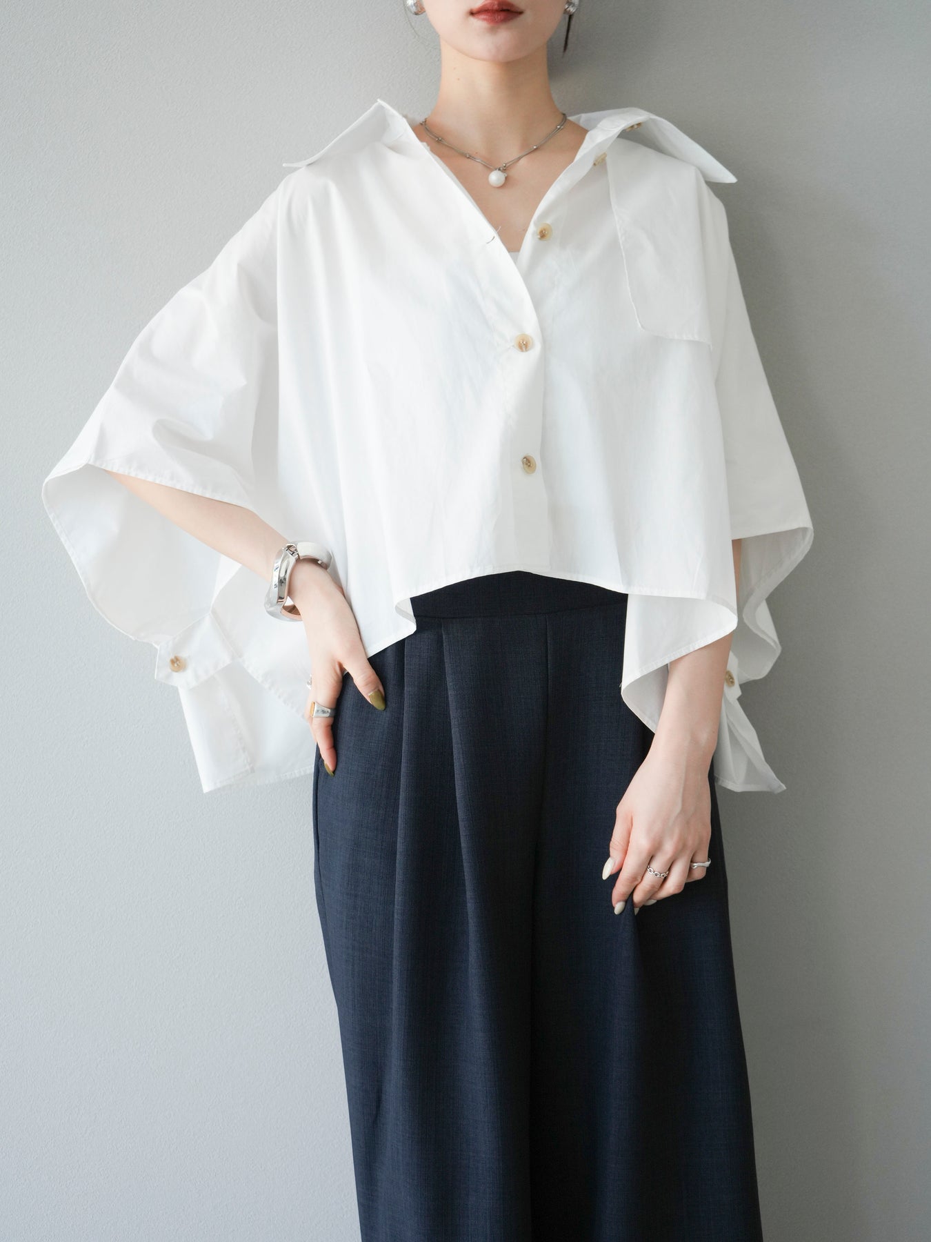 洗練されたシルエットが魅力の、ポンチョライクなショート丈シャツ。 身幅にゆとりを持たせたワイドシルエットと、構築的なデザインがスタイリングにモードな印象を与えてくれます。 風を通す軽やかな素材感と、抜け感のあるドロップショルダーがこなれた雰囲気を演出。 ショート丈ながら前後差のあるヘムラインで、ハイウエストボトムやワンピースとの相性も抜群です。 一枚で主役としても、タンクやキャミとのレイヤードで羽織りとしても活躍。 モードにもカジュアルにも着まわせる、夏の新定番シャツです