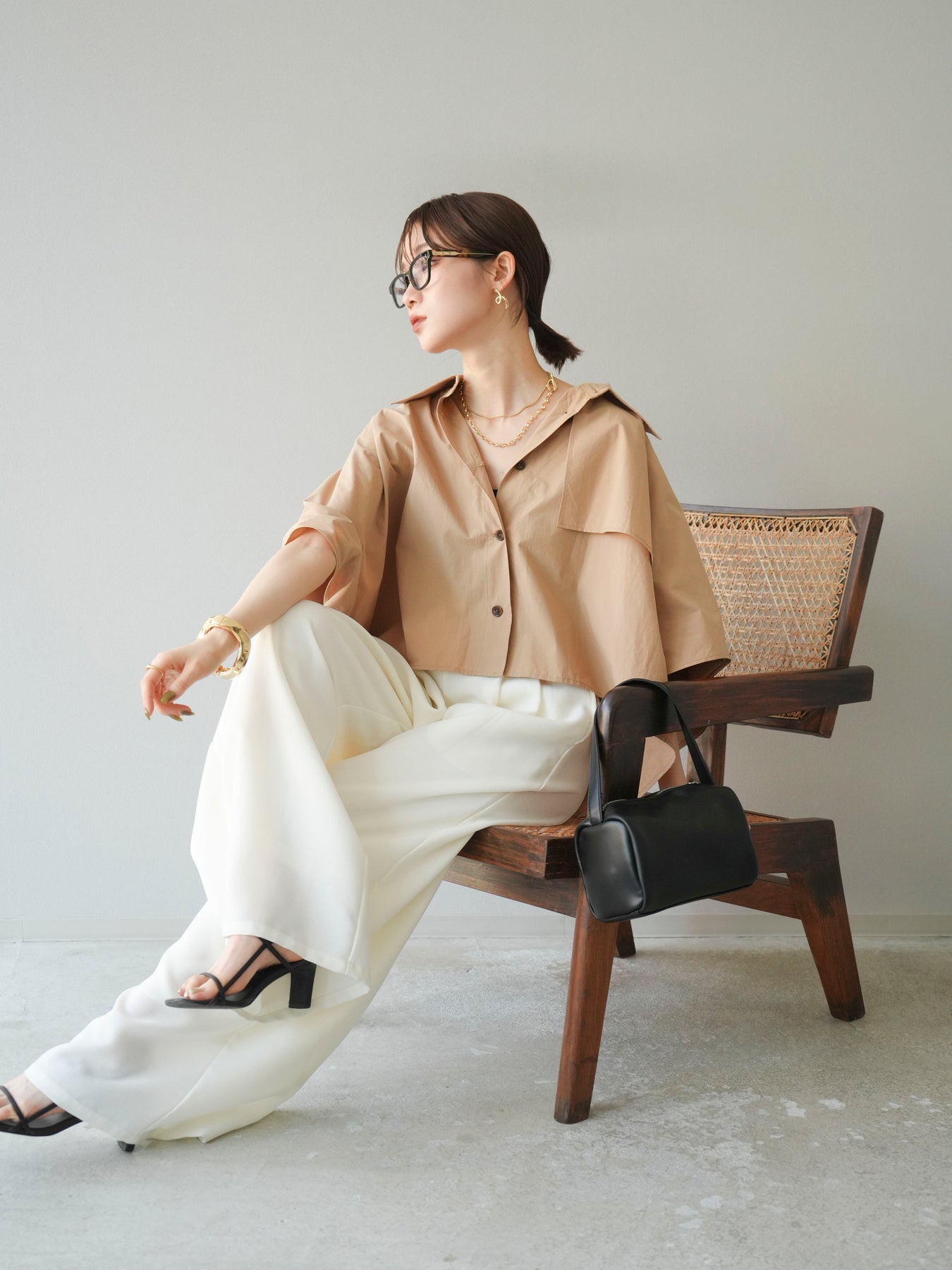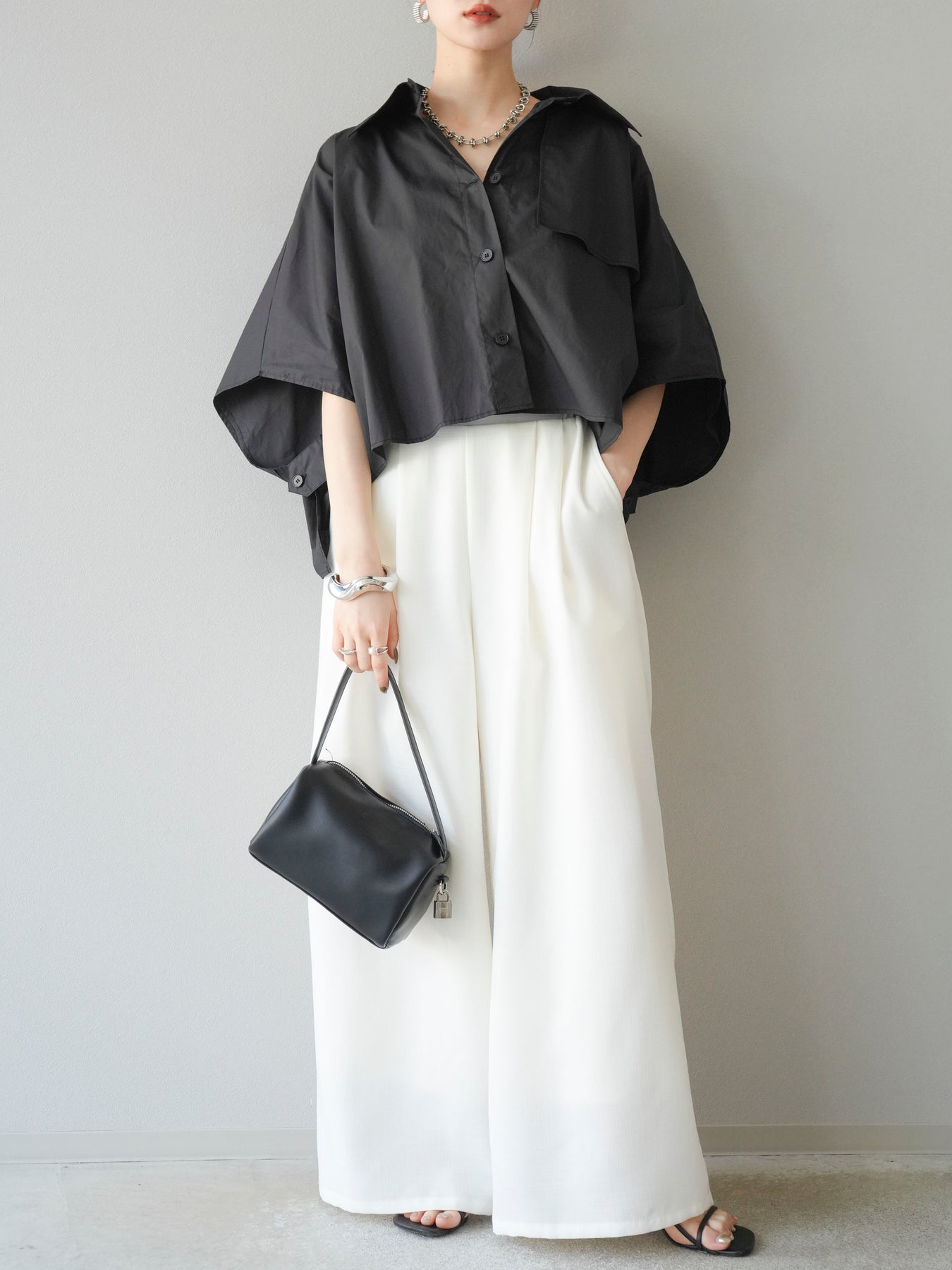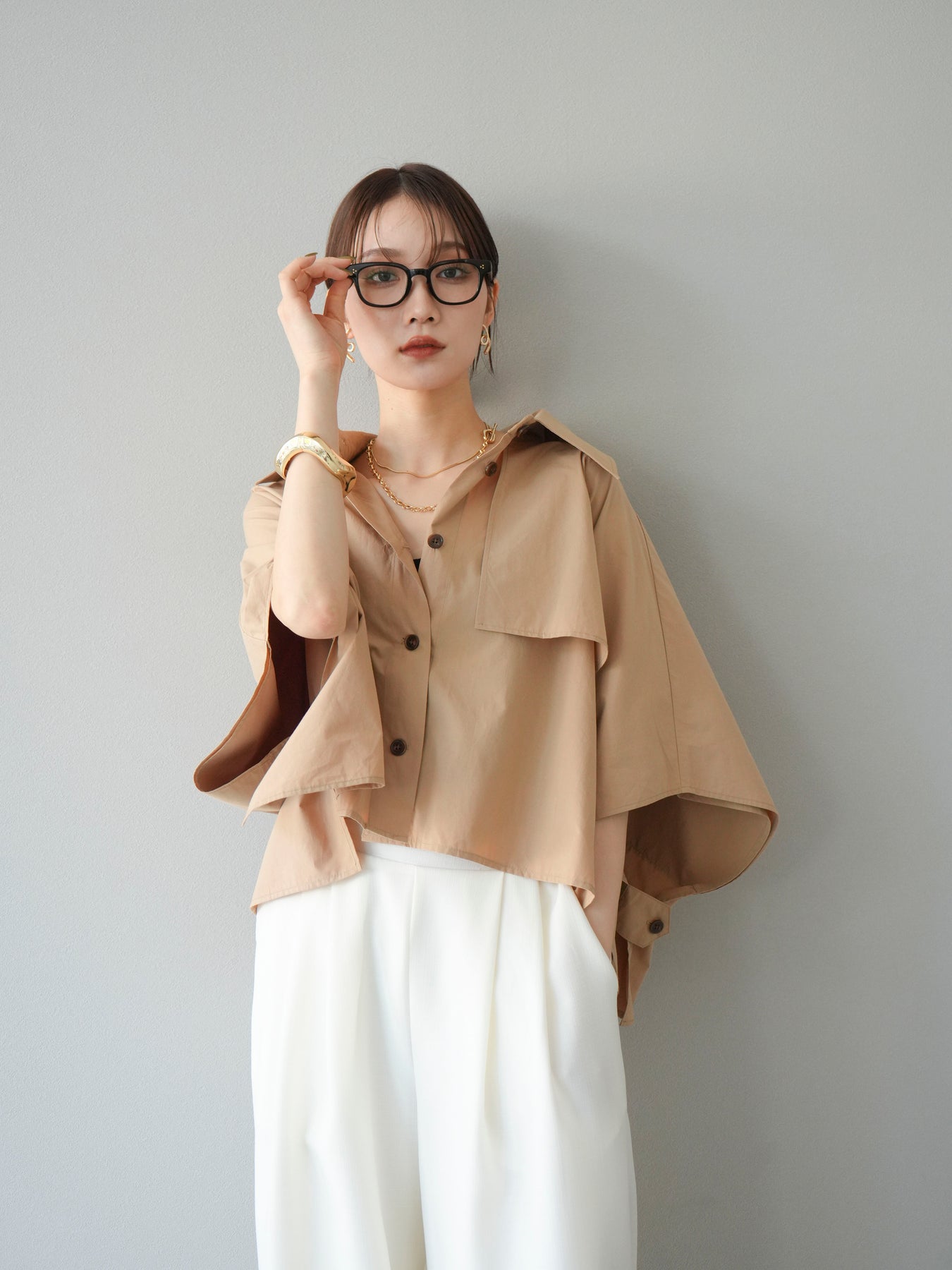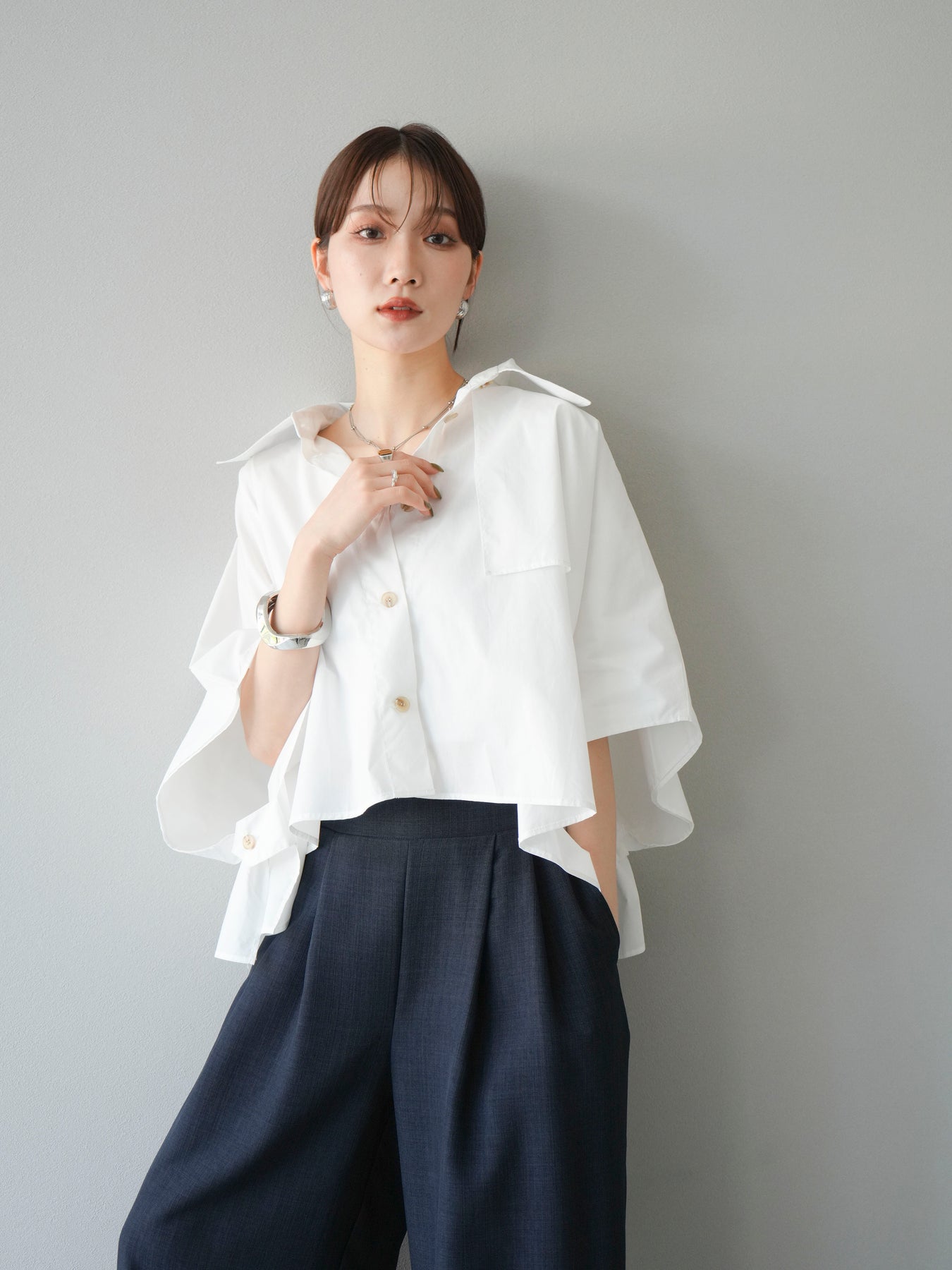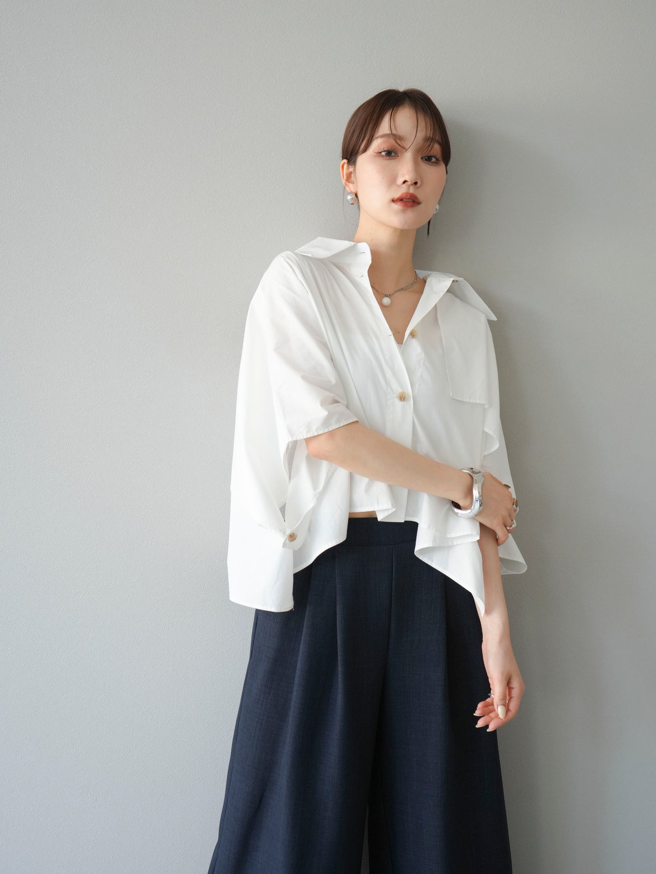 洗練されたシルエットが魅力の、ポンチョライクなショート丈シャツ。 身幅にゆとりを持たせたワイドシルエットと、構築的なデザインがスタイリングにモードな印象を与えてくれます。 風を通す軽やかな素材感と、抜け感のあるドロップショルダーがこなれた雰囲気を演出。 ショート丈ながら前後差のあるヘムラインで、ハイウエストボトムやワンピースとの相性も抜群です。 一枚で主役としても、タンクやキャミとのレイヤードで羽織りとしても活躍。 モードにもカジュアルにも着まわせる、夏の新定番シャツです