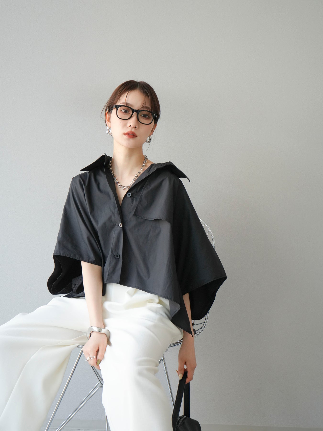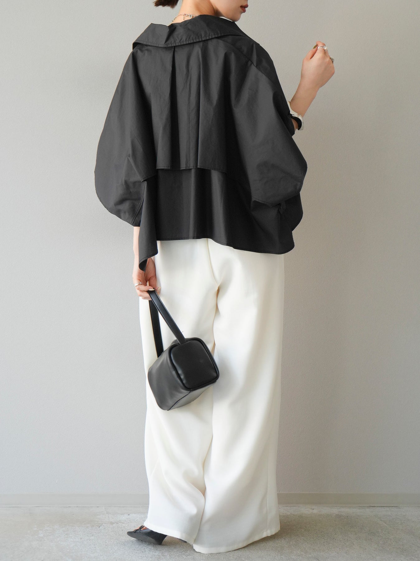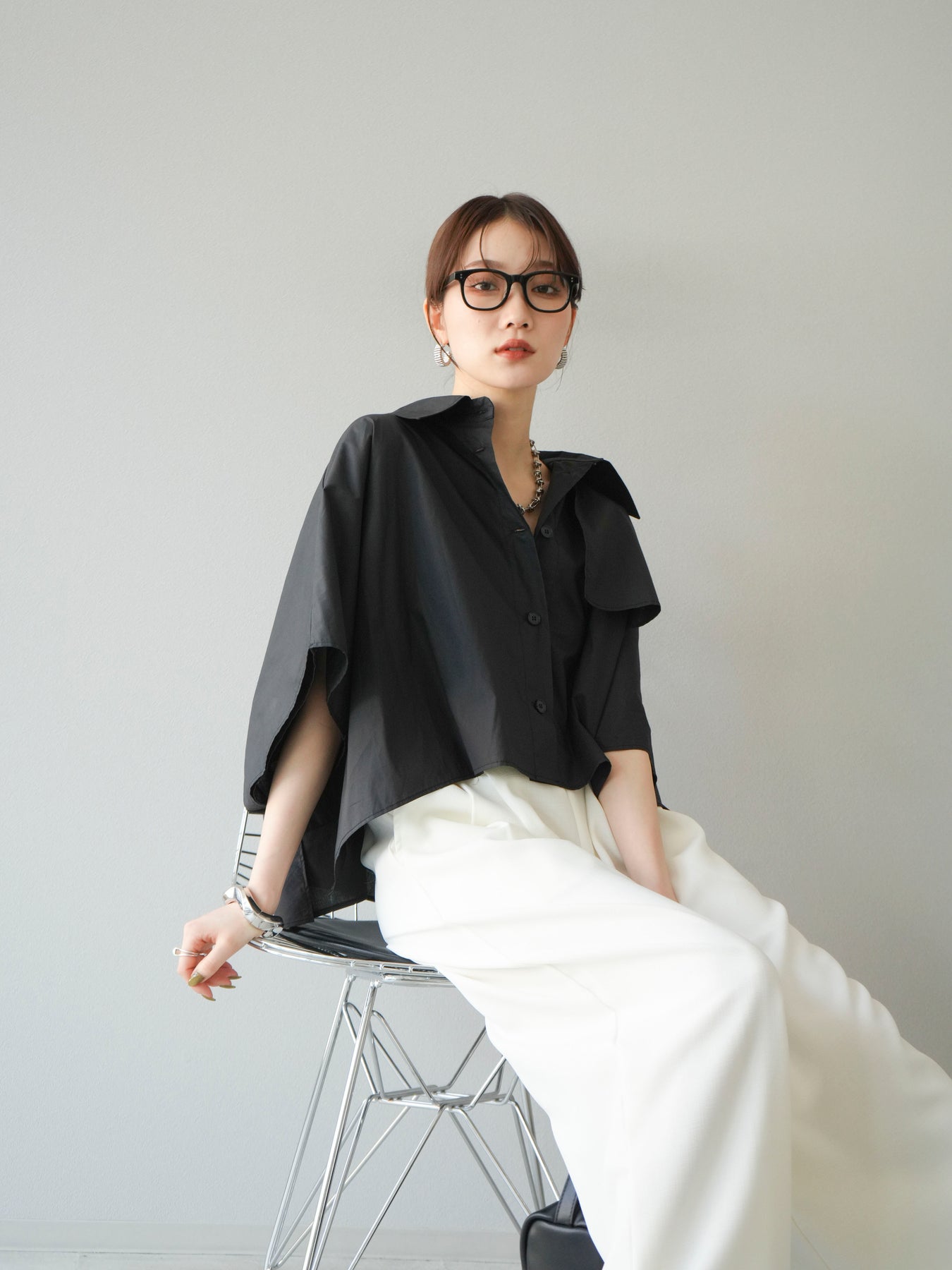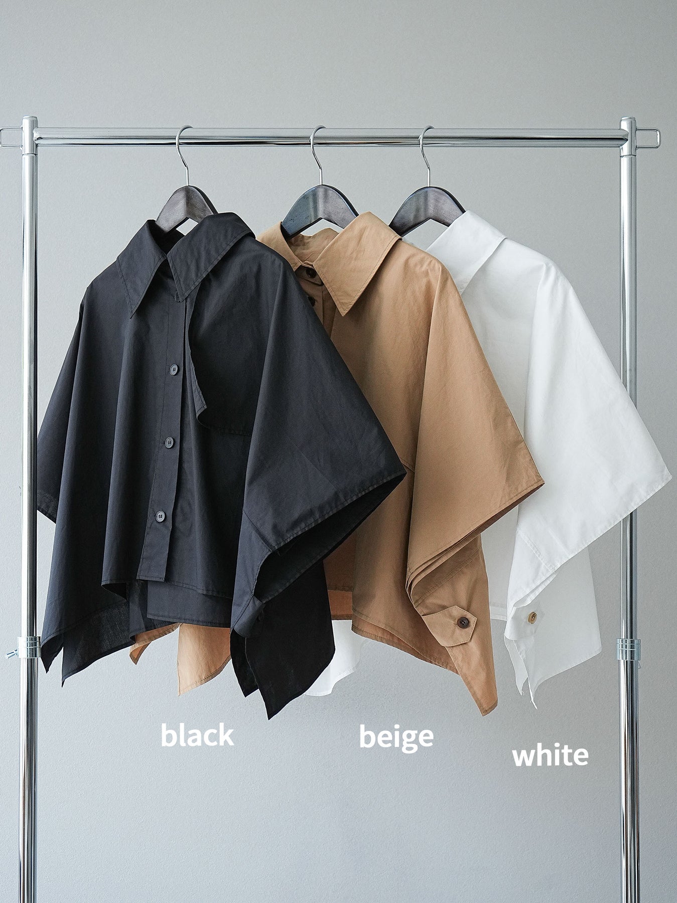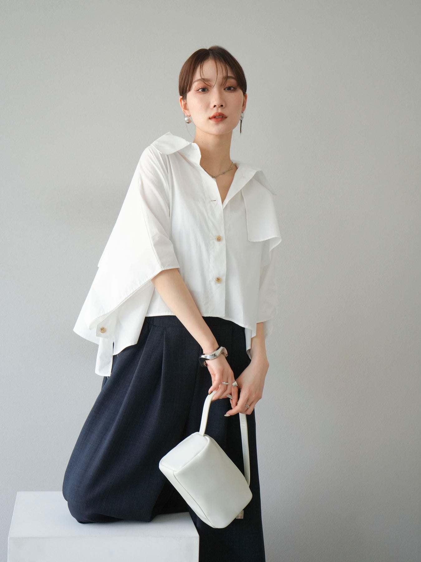 洗練されたシルエットが魅力の、ポンチョライクなショート丈シャツ。 身幅にゆとりを持たせたワイドシルエットと、構築的なデザインがスタイリングにモードな印象を与えてくれます。 風を通す軽やかな素材感と、抜け感のあるドロップショルダーがこなれた雰囲気を演出。 ショート丈ながら前後差のあるヘムラインで、ハイウエストボトムやワンピースとの相性も抜群です。 一枚で主役としても、タンクやキャミとのレイヤードで羽織りとしても活躍。 モードにもカジュアルにも着まわせる、夏の新定番シャツです