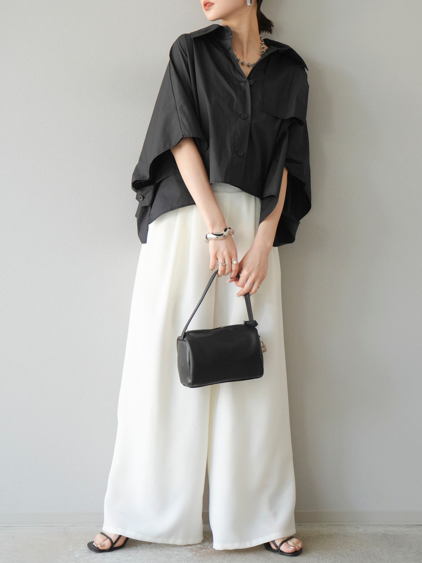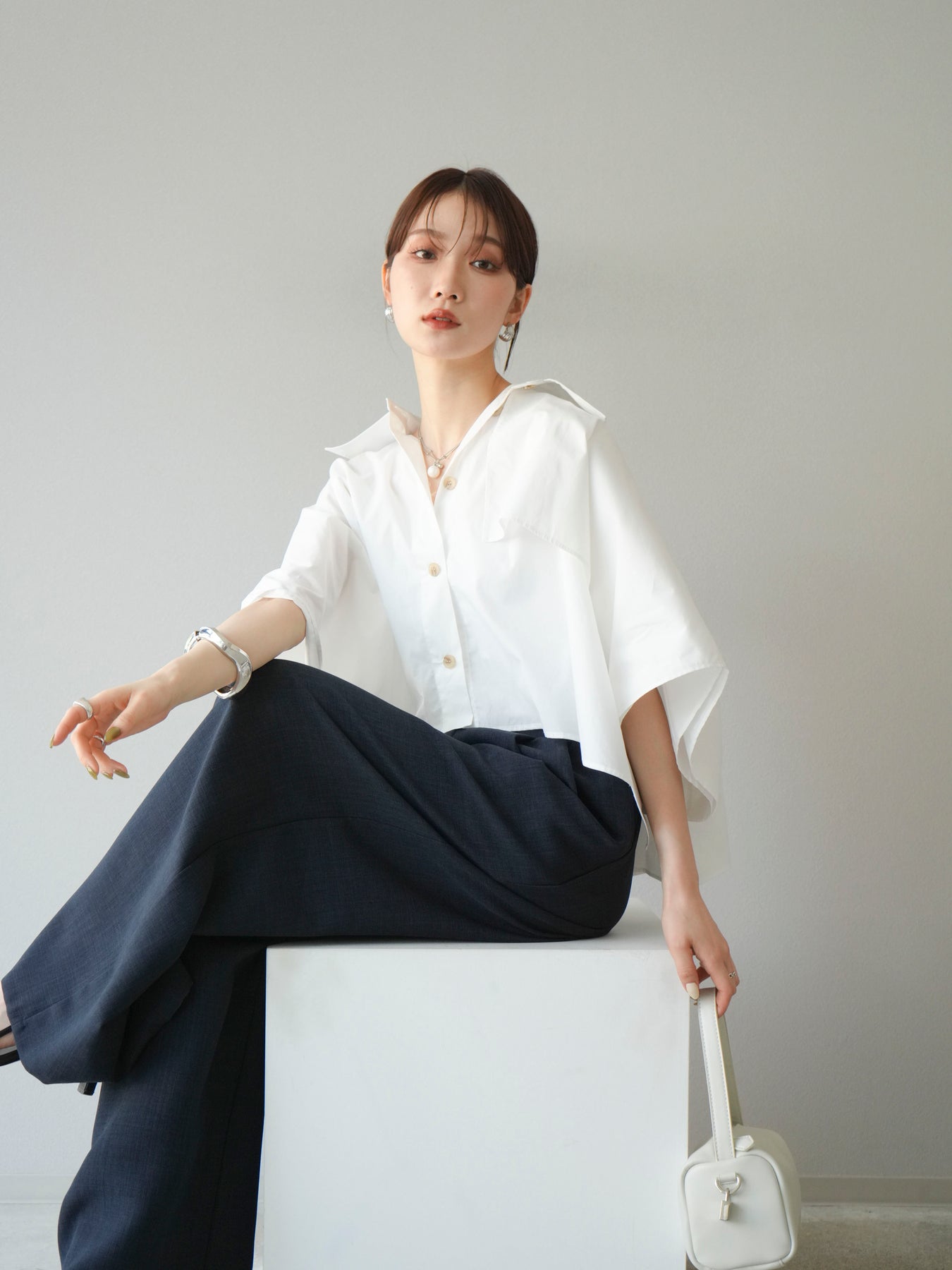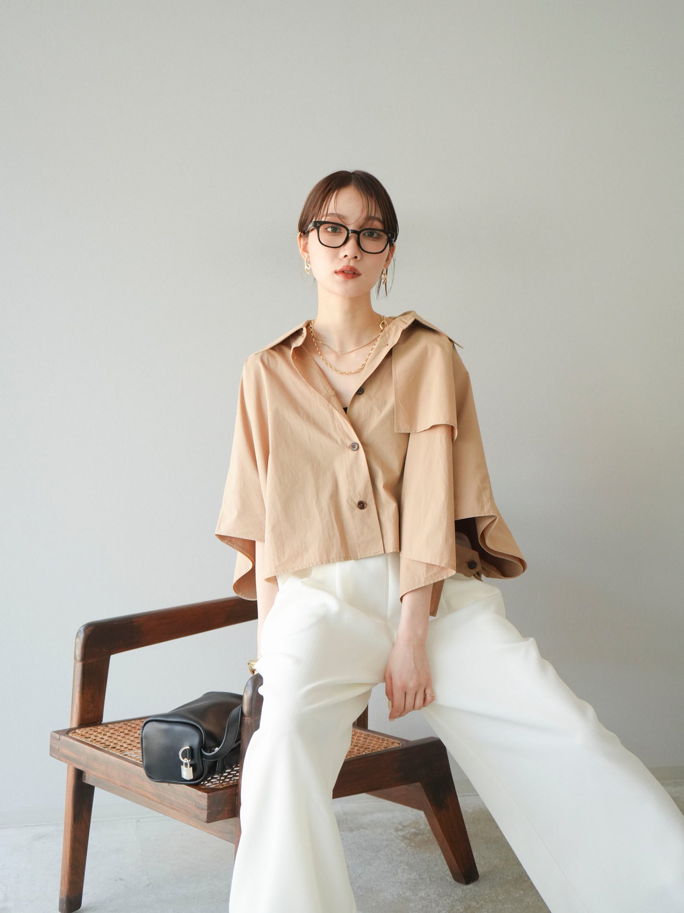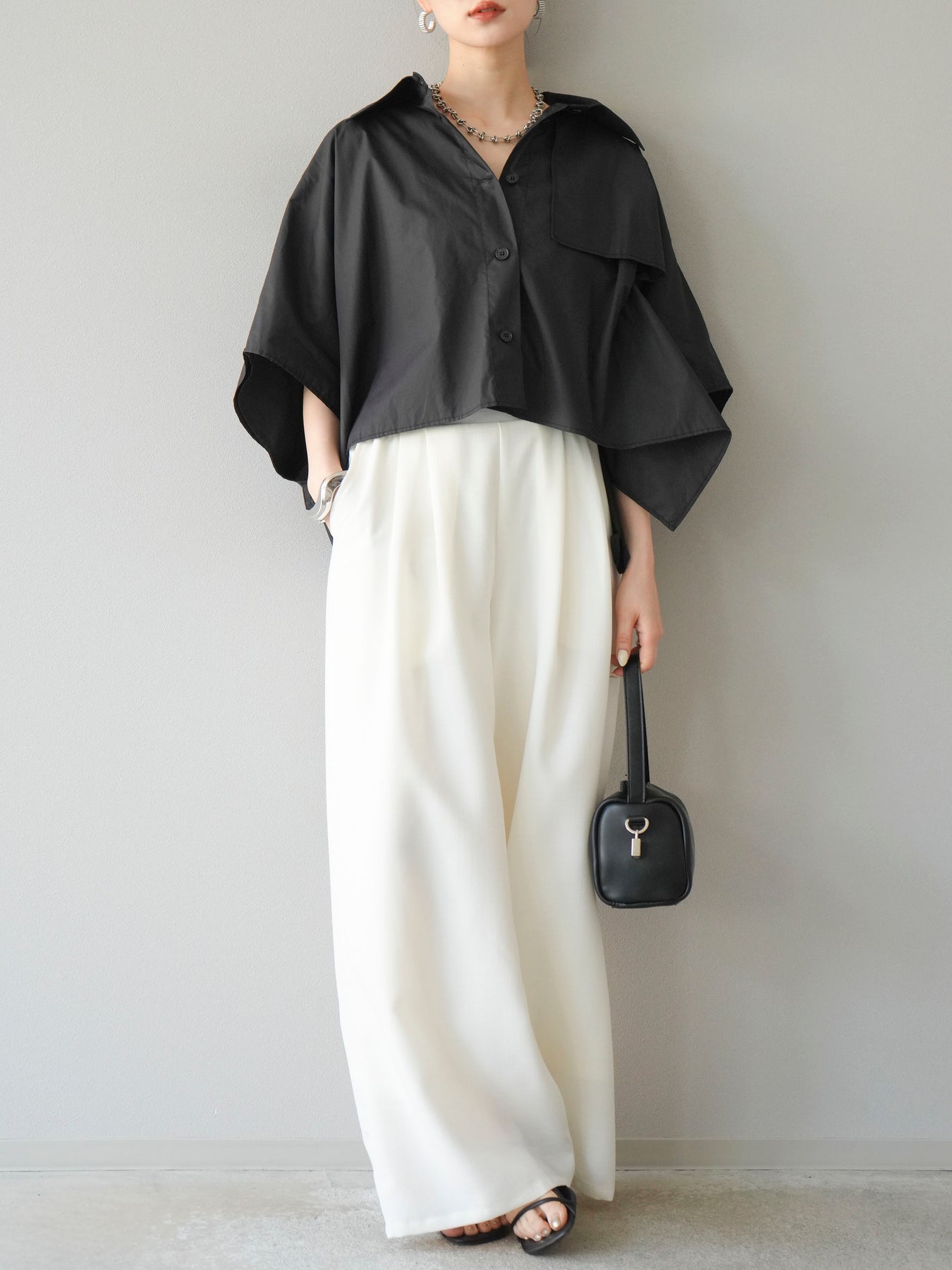 洗練されたシルエットが魅力の、ポンチョライクなショート丈シャツ。 身幅にゆとりを持たせたワイドシルエットと、構築的なデザインがスタイリングにモードな印象を与えてくれます。 風を通す軽やかな素材感と、抜け感のあるドロップショルダーがこなれた雰囲気を演出。 ショート丈ながら前後差のあるヘムラインで、ハイウエストボトムやワンピースとの相性も抜群です。 一枚で主役としても、タンクやキャミとのレイヤードで羽織りとしても活躍。 モードにもカジュアルにも着まわせる、夏の新定番シャツです