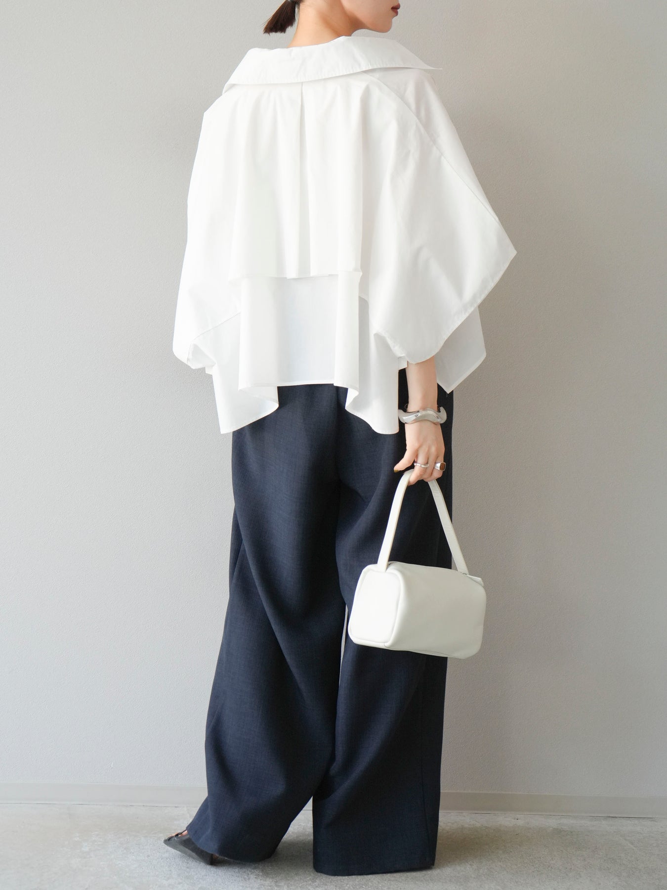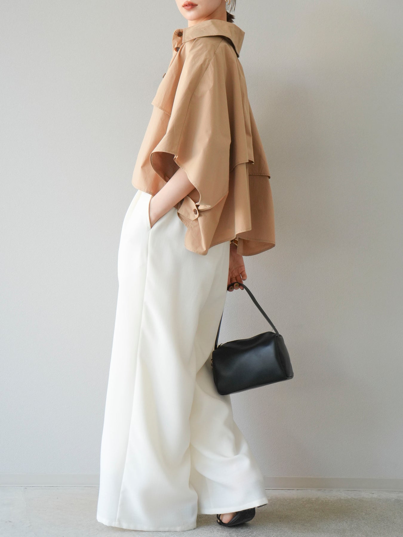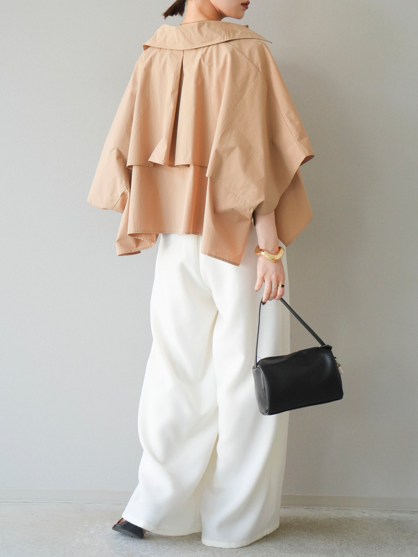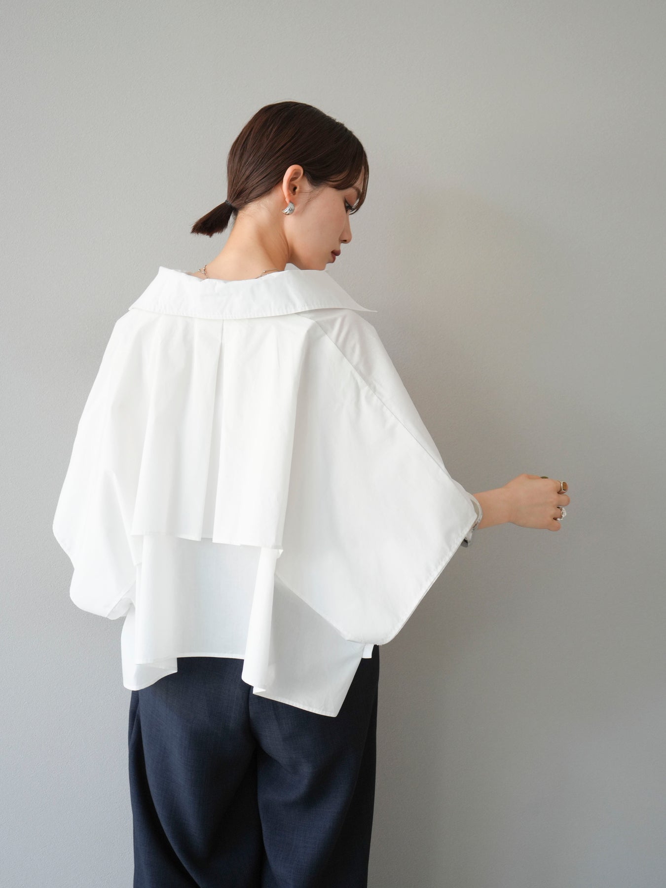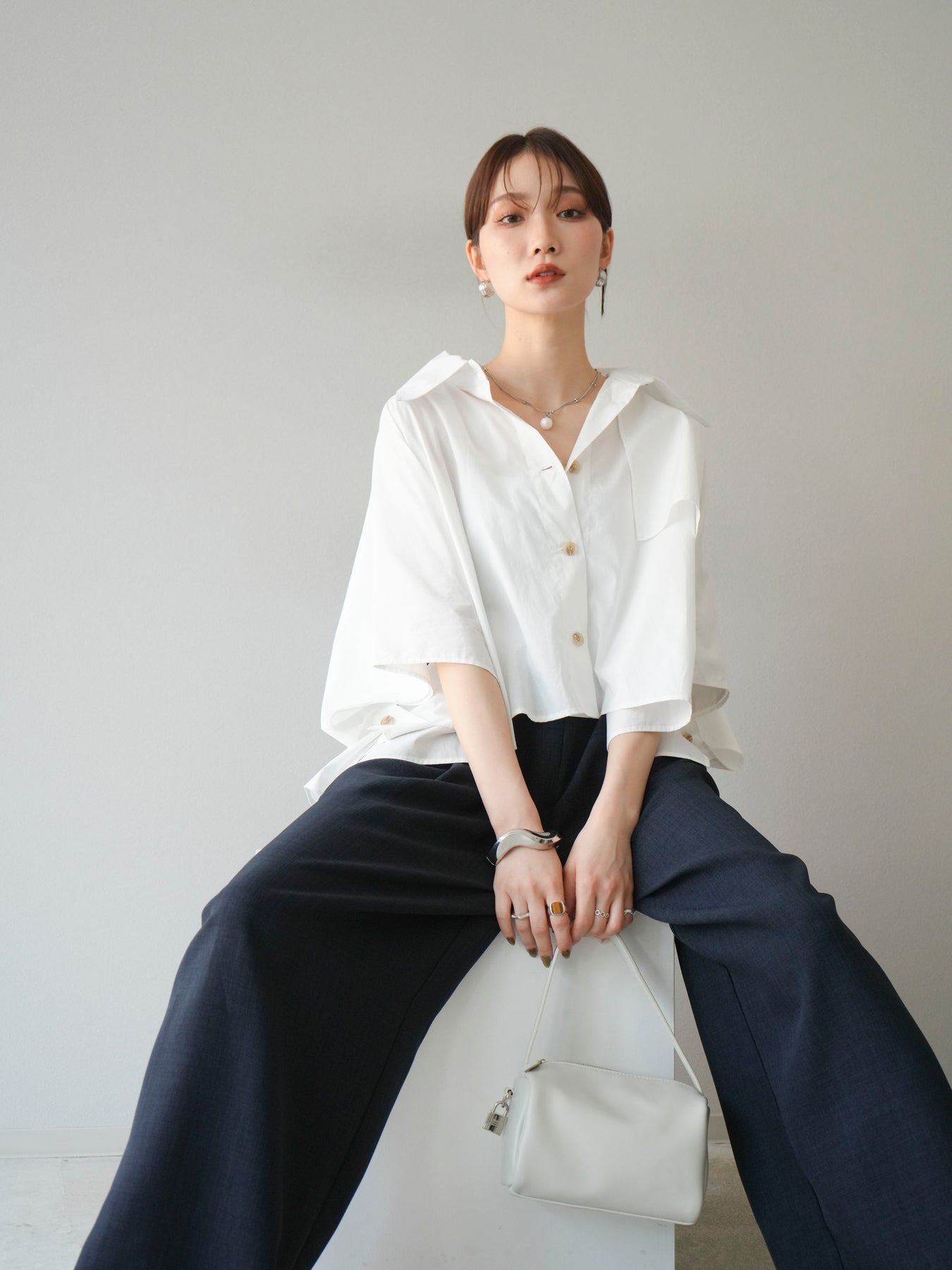 洗練されたシルエットが魅力の、ポンチョライクなショート丈シャツ。 身幅にゆとりを持たせたワイドシルエットと、構築的なデザインがスタイリングにモードな印象を与えてくれます。 風を通す軽やかな素材感と、抜け感のあるドロップショルダーがこなれた雰囲気を演出。 ショート丈ながら前後差のあるヘムラインで、ハイウエストボトムやワンピースとの相性も抜群です。 一枚で主役としても、タンクやキャミとのレイヤードで羽織りとしても活躍。 モードにもカジュアルにも着まわせる、夏の新定番シャツです