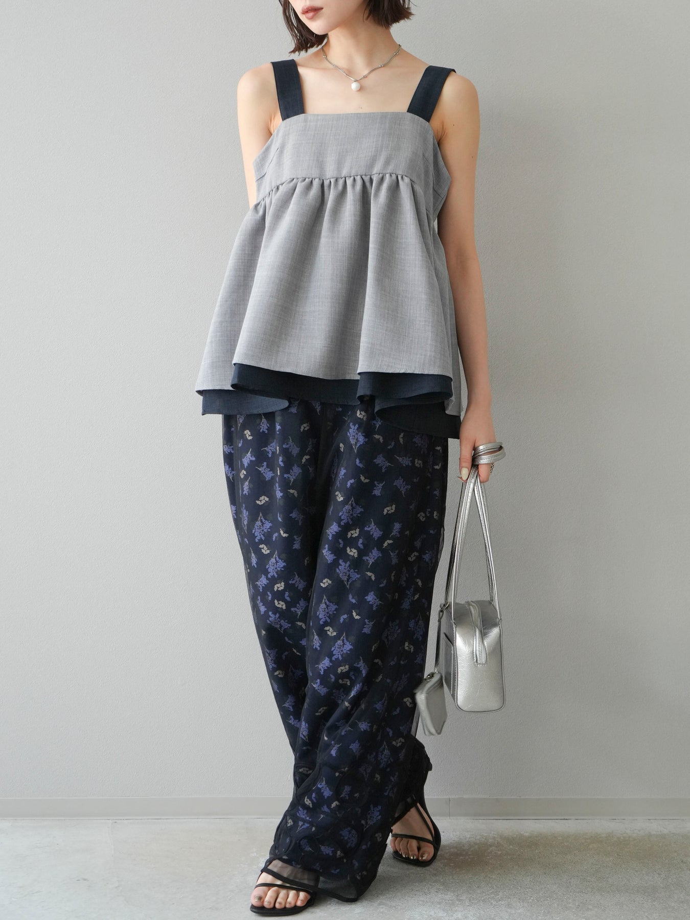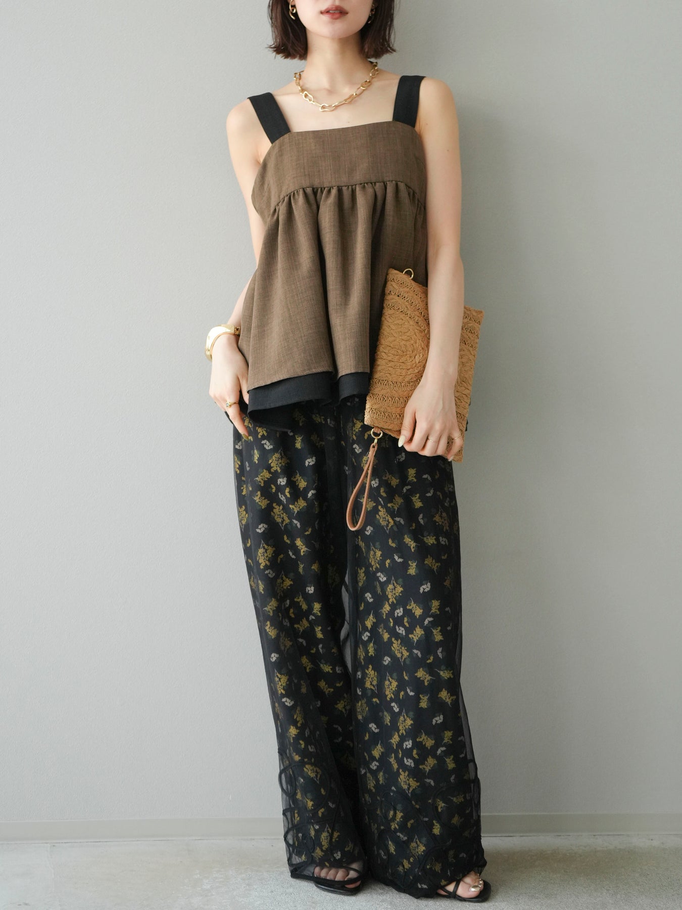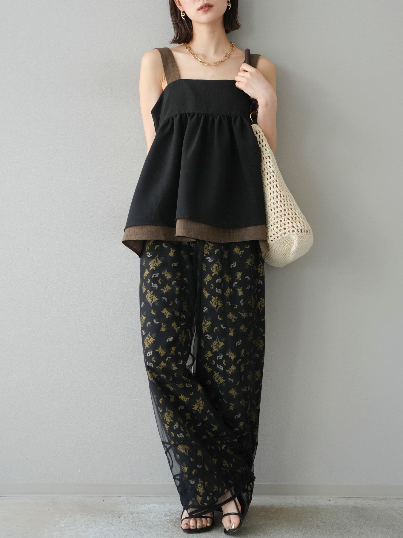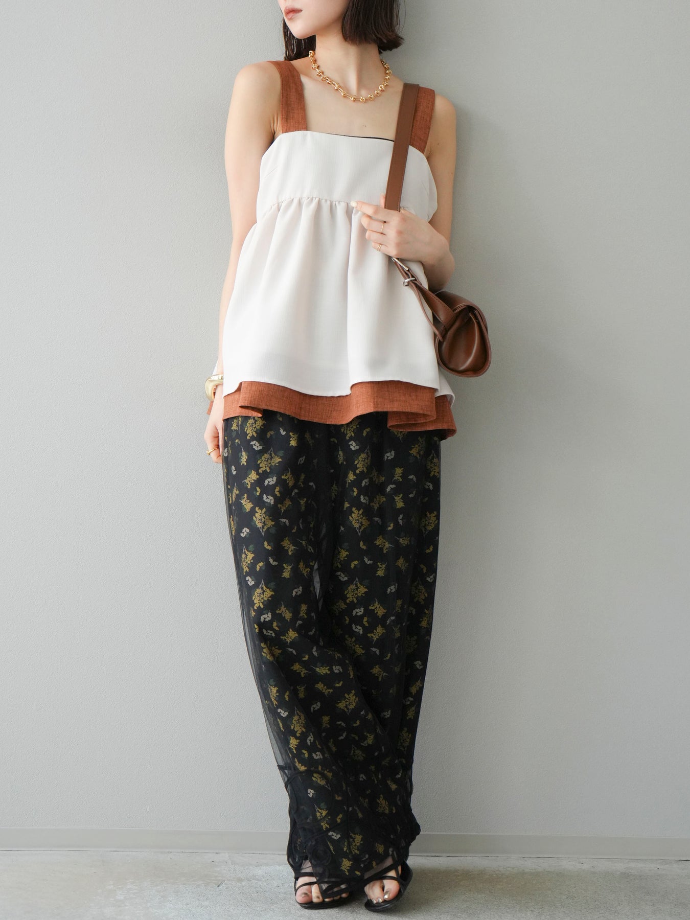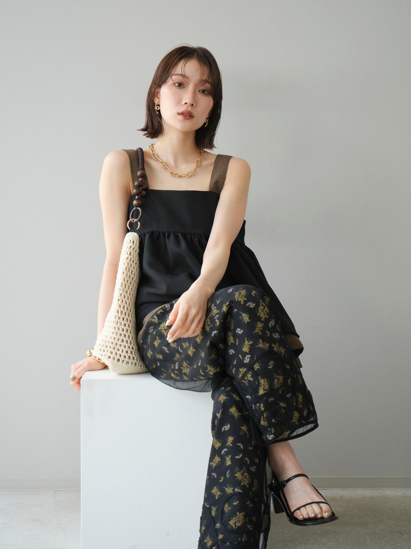 [SET]リネンライク配色フレアタンクトップ+ブーケプリントタックパンツ(2set)