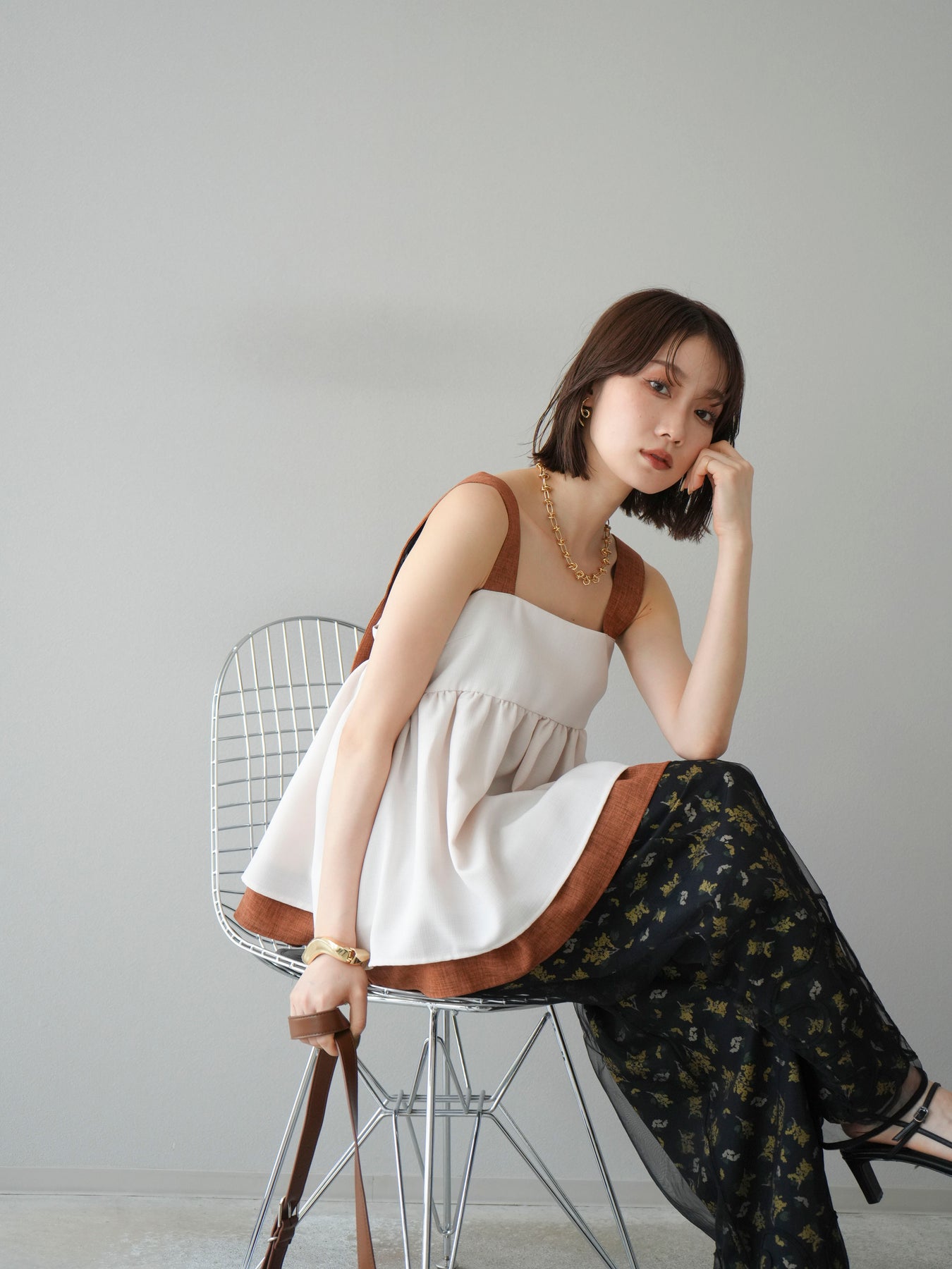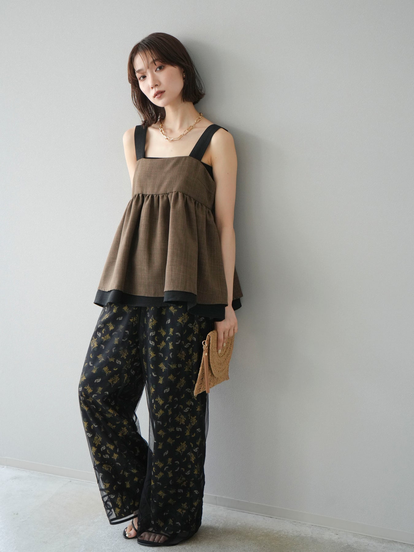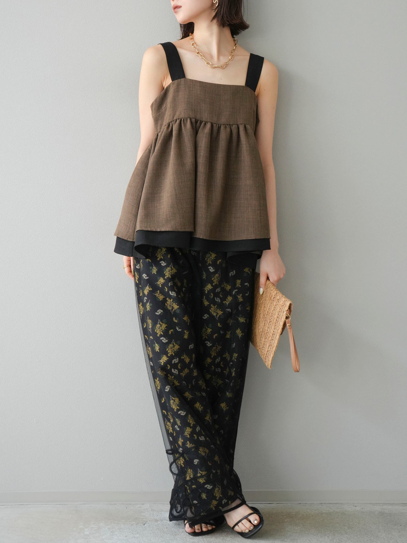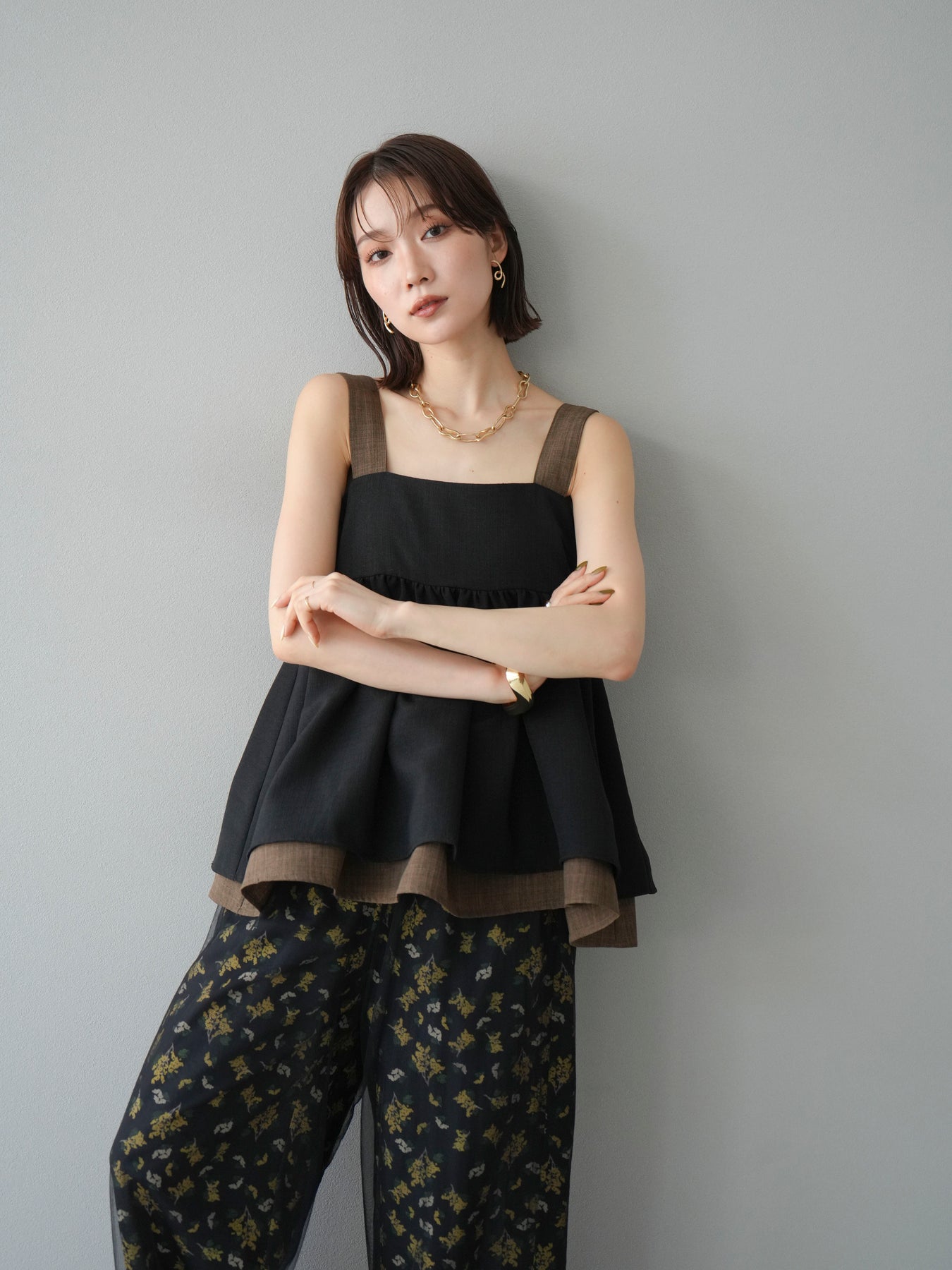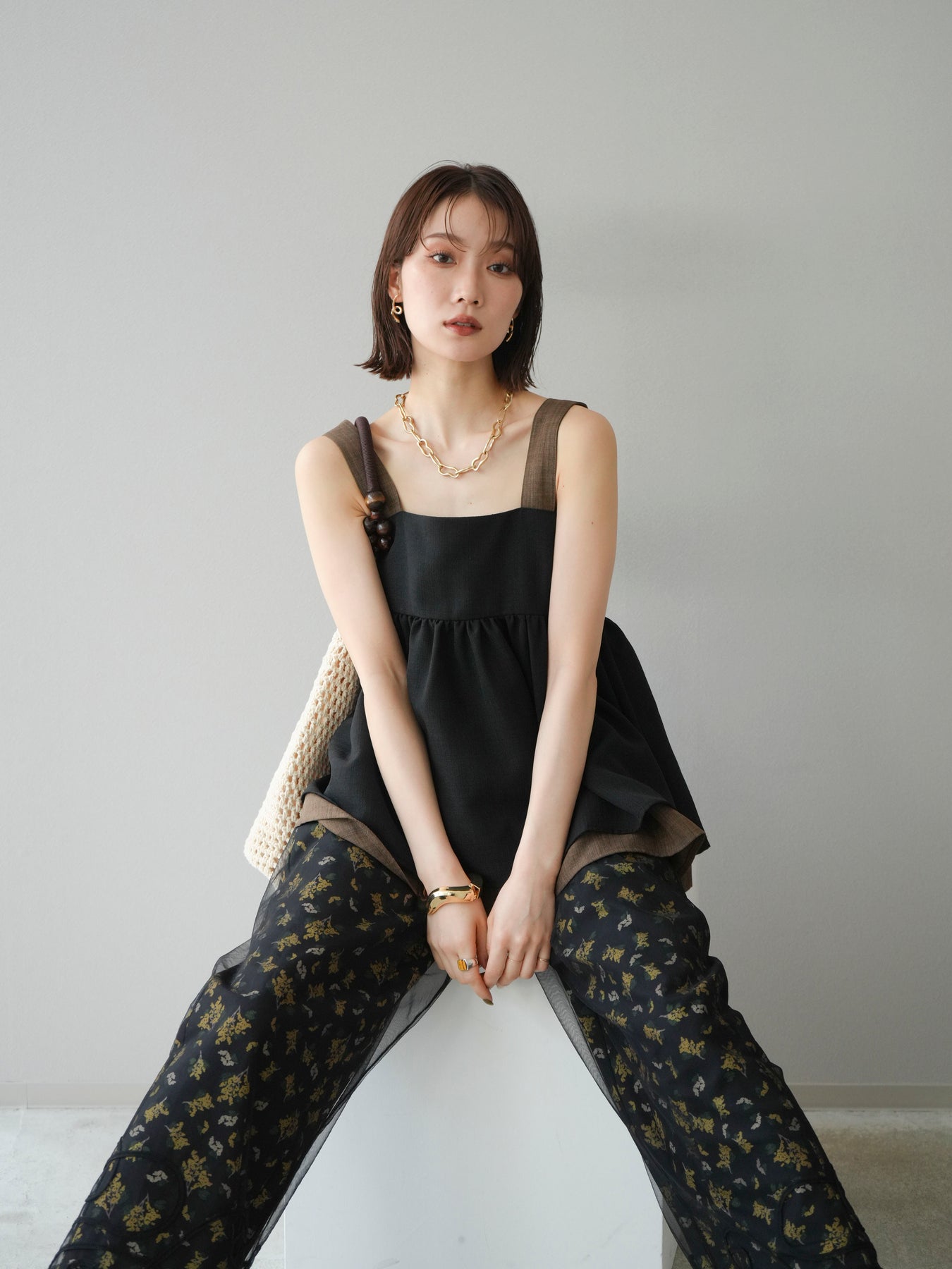 [SET]リネンライク配色フレアタンクトップ+ブーケプリントタックパンツ(2set)