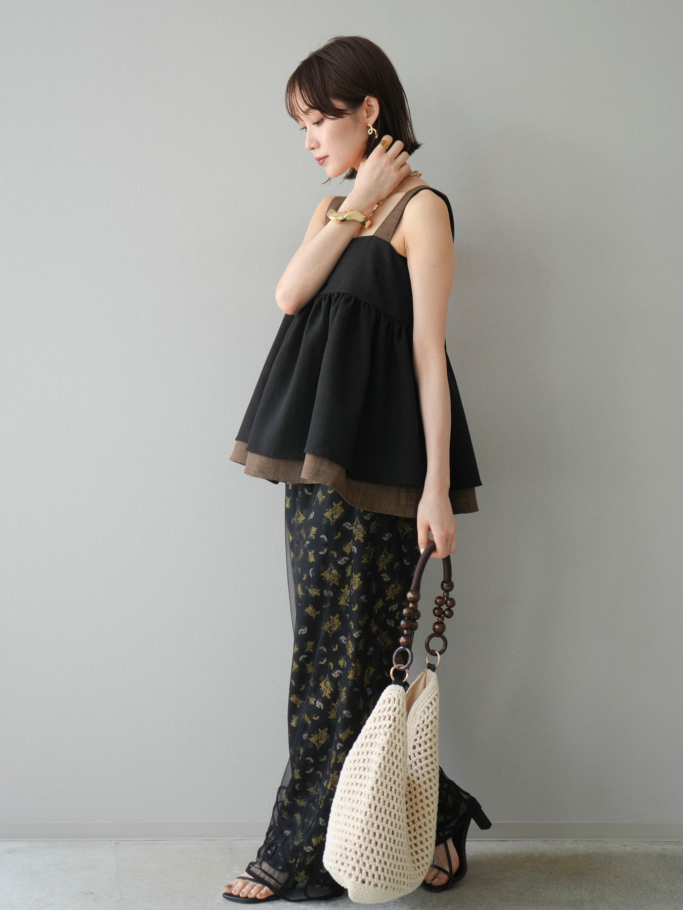 小花が散りばめられたブーケ柄が大人可愛い、主役級のキャミソールトップス。 細めのストラップとデコルテが綺麗に見えるネックラインで、女性らしさが際立つ一枚です。 切り替え位置を高めに設定したふんわりとしたシルエットが、体のラインをさりげなくカバーしつつ、軽やかで華やかな印象に。 さらりとした肌触りの素材感で、暑い季節も快適に着用できます。 一枚での着用はもちろん、インナーにTシャツやシアートップスをレイヤードするスタイルもおすすめ。 デニムやワイドパンツとの相性も抜群で、コーディネートに季節感をプラスしてくれるアイテムです。