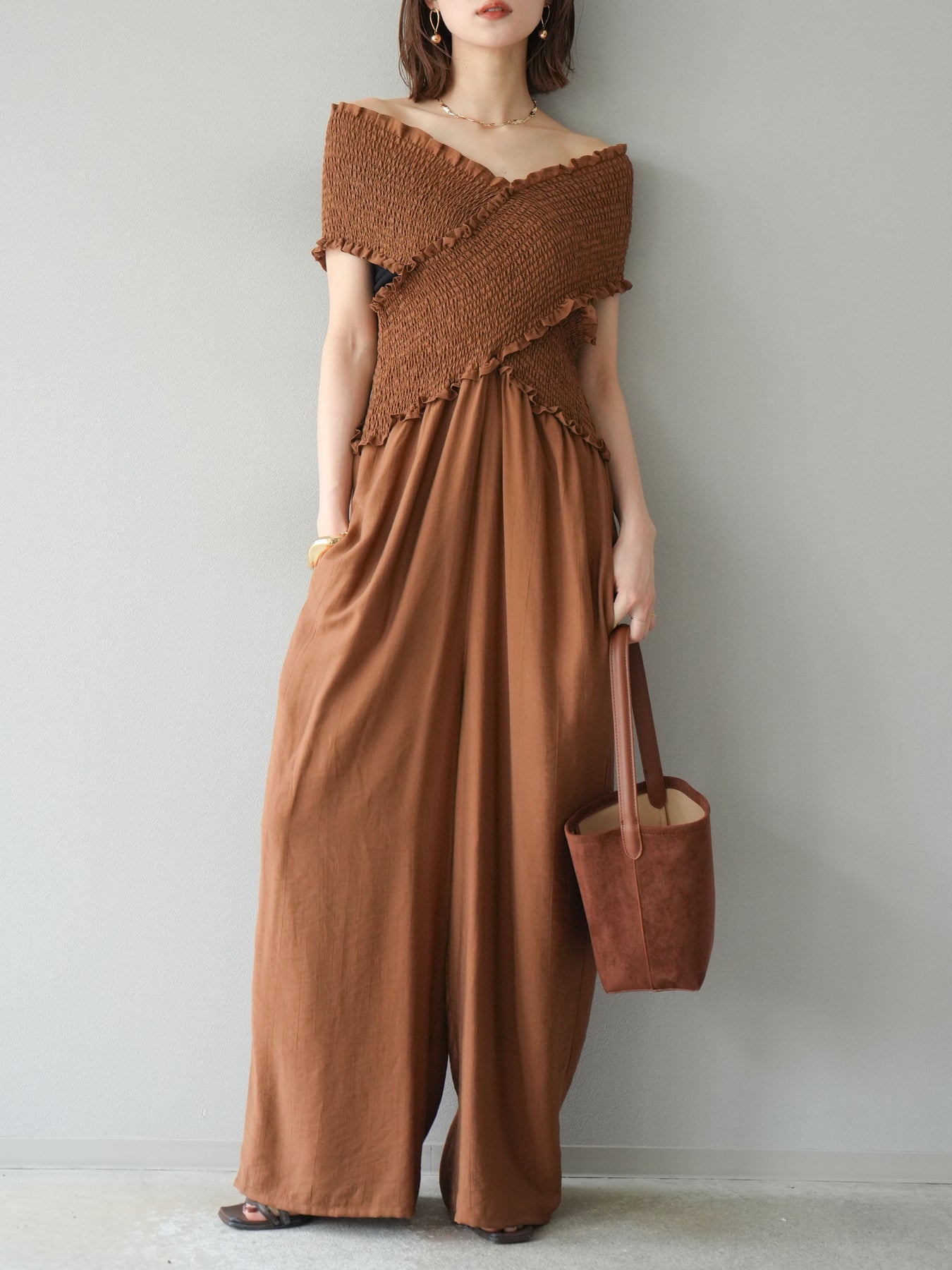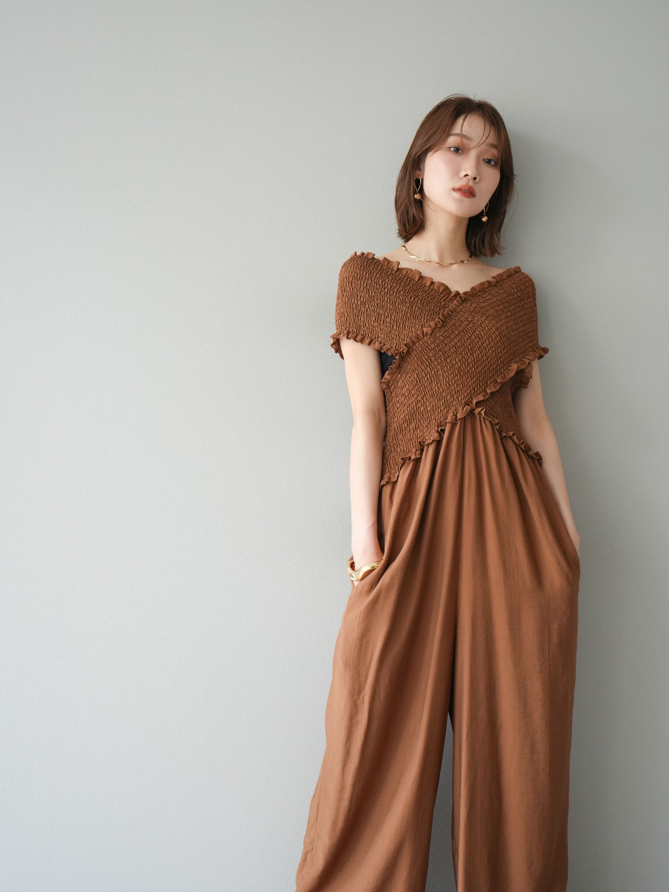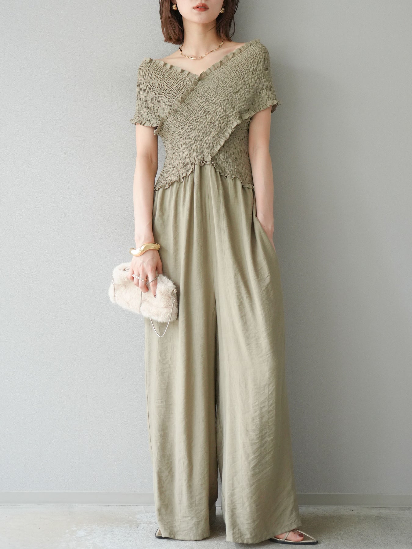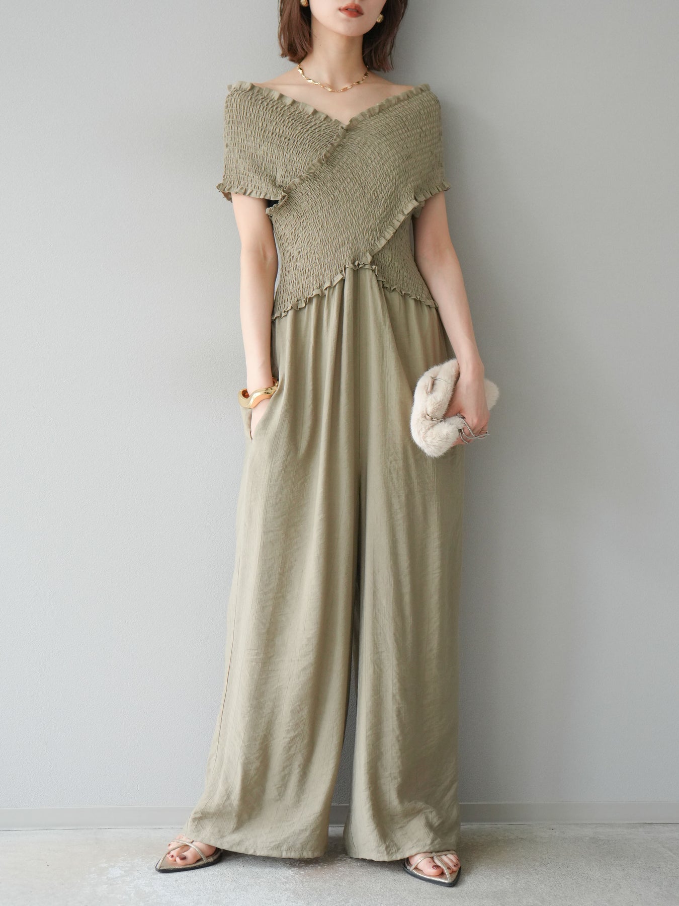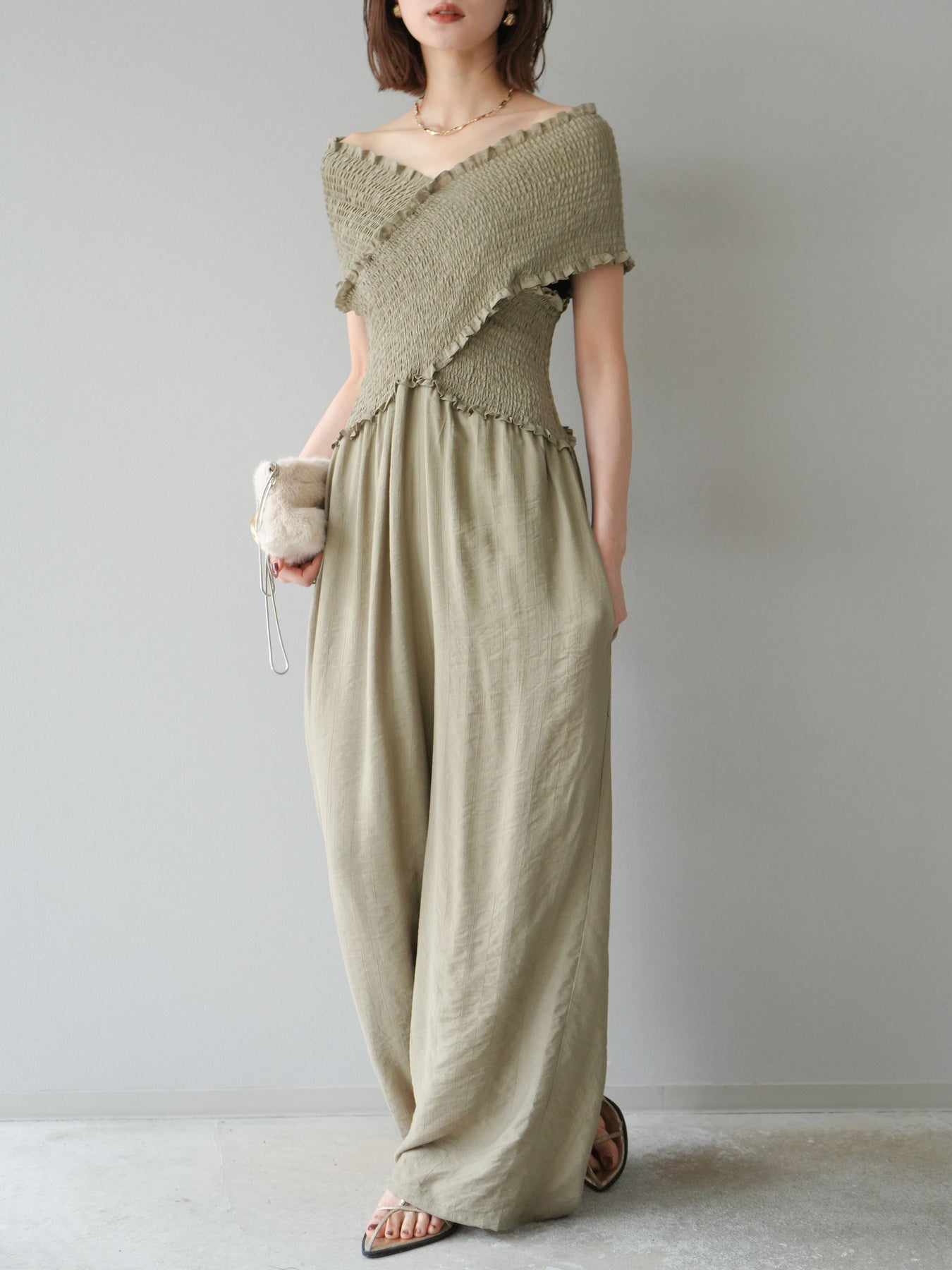 クロス状に切り替えたシャーリングデザインが目を惹くサロペット。 デコルテを美しく見せるオフショルダー風のネックラインが、女性らしさを引き立てます。 ボリューム感のあるパンツシルエットで、リラックス感と華やかさを両立。 一枚で着映えする存在感のあるデザインで、夏のお出かけシーンにもおすすめのアイテムです。