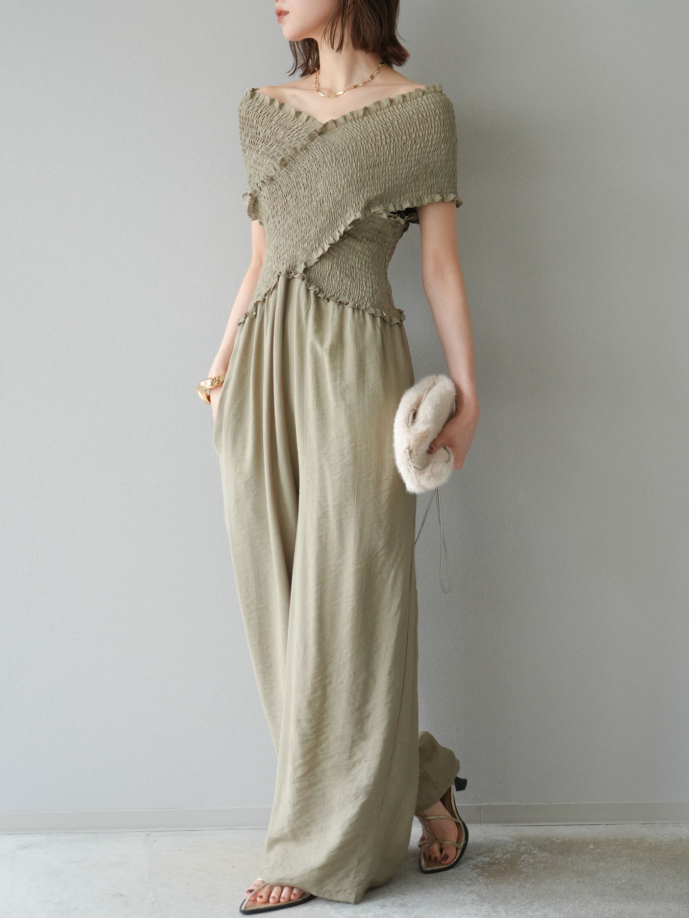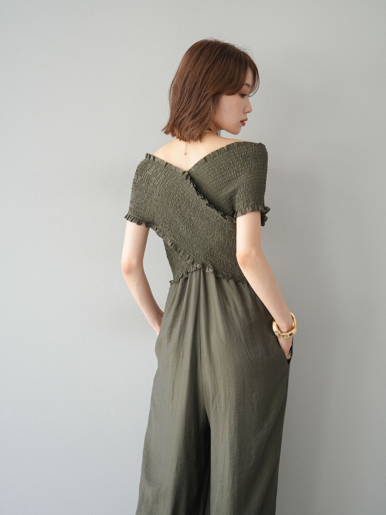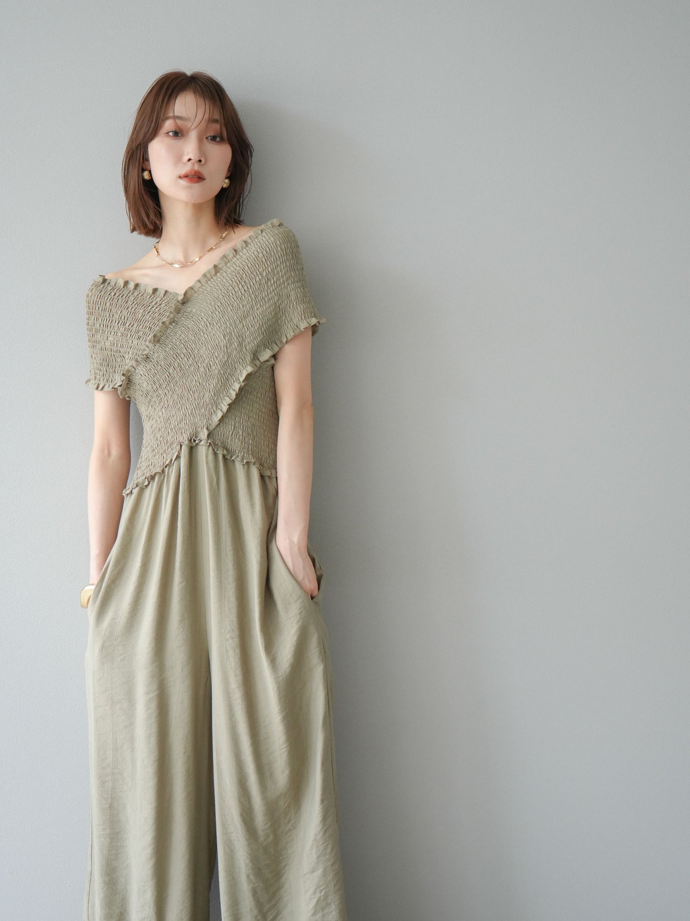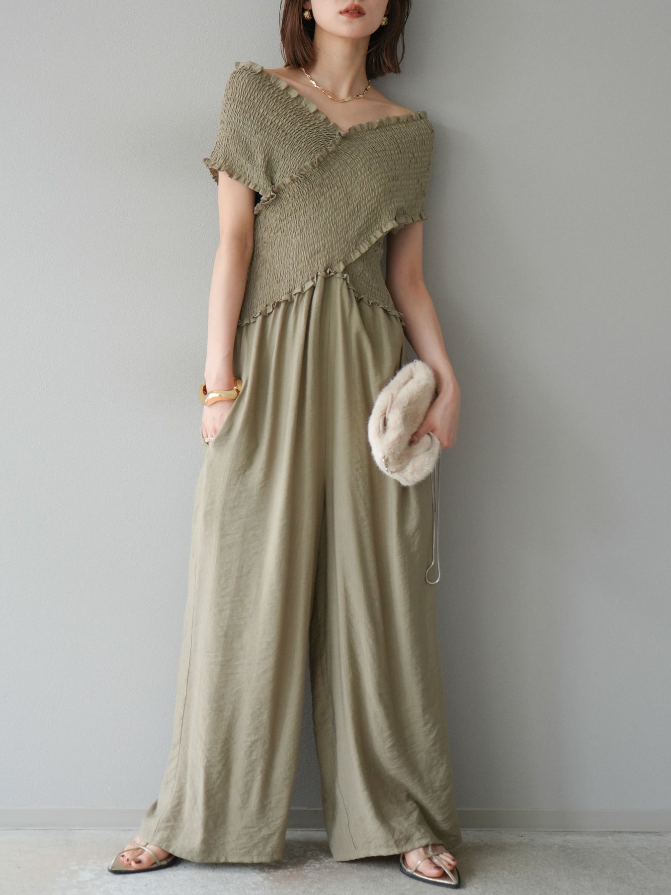クロス状に切り替えたシャーリングデザインが目を惹くサロペット。 デコルテを美しく見せるオフショルダー風のネックラインが、女性らしさを引き立てます。 ボリューム感のあるパンツシルエットで、リラックス感と華やかさを両立。 一枚で着映えする存在感のあるデザインで、夏のお出かけシーンにもおすすめのアイテムです。