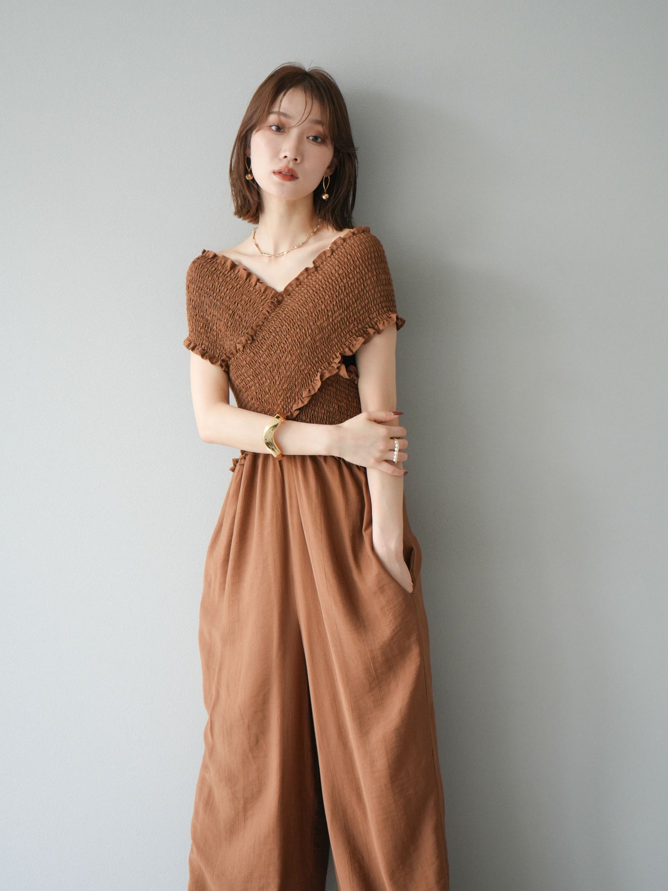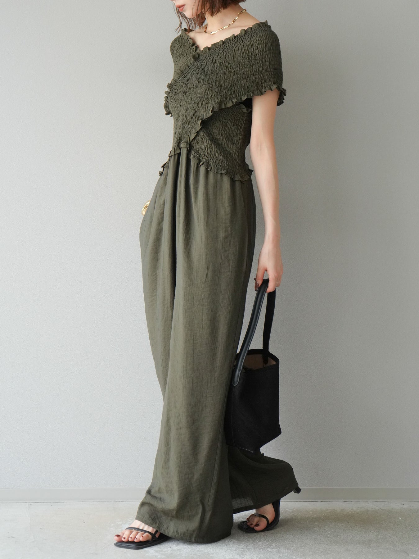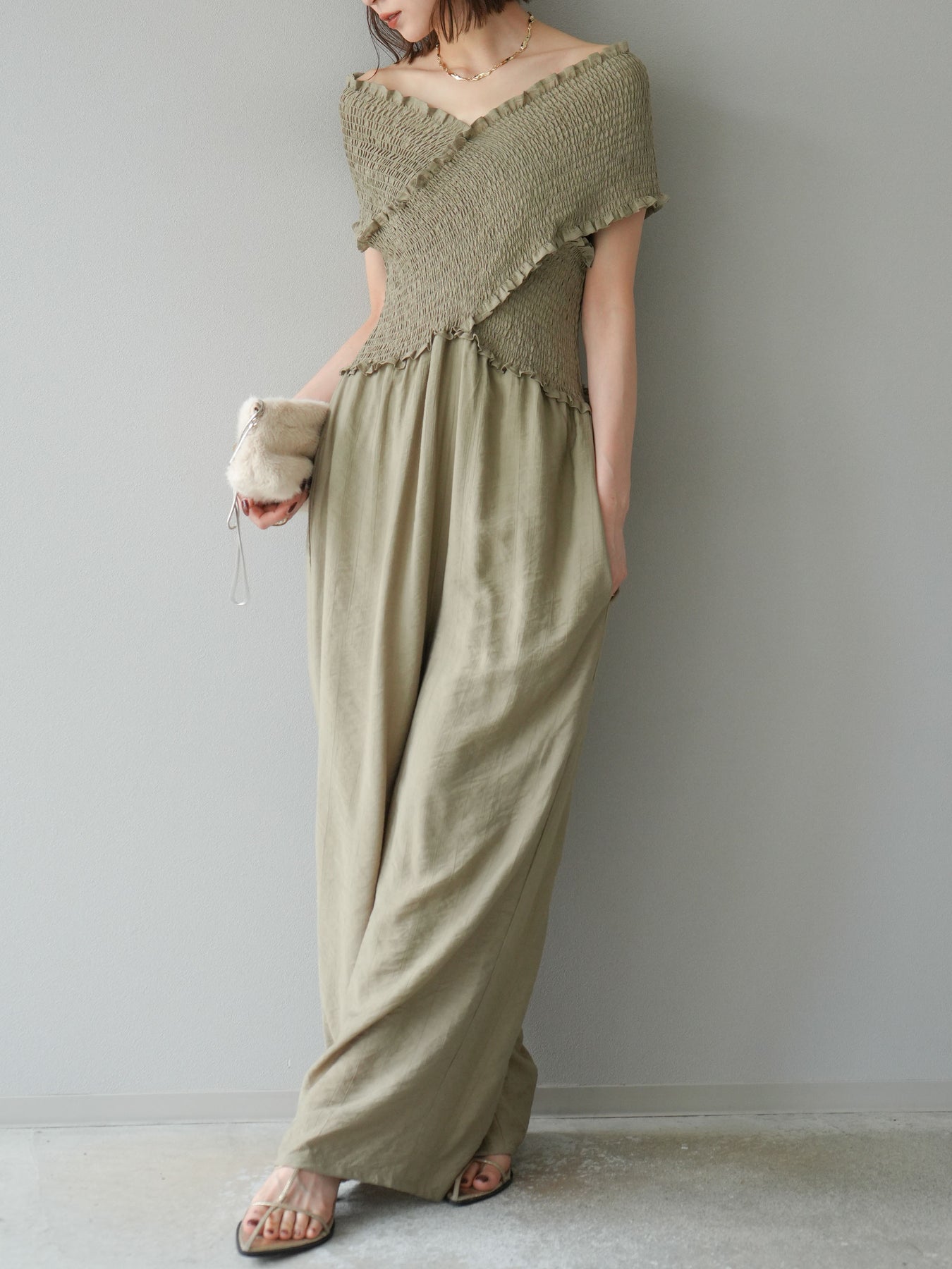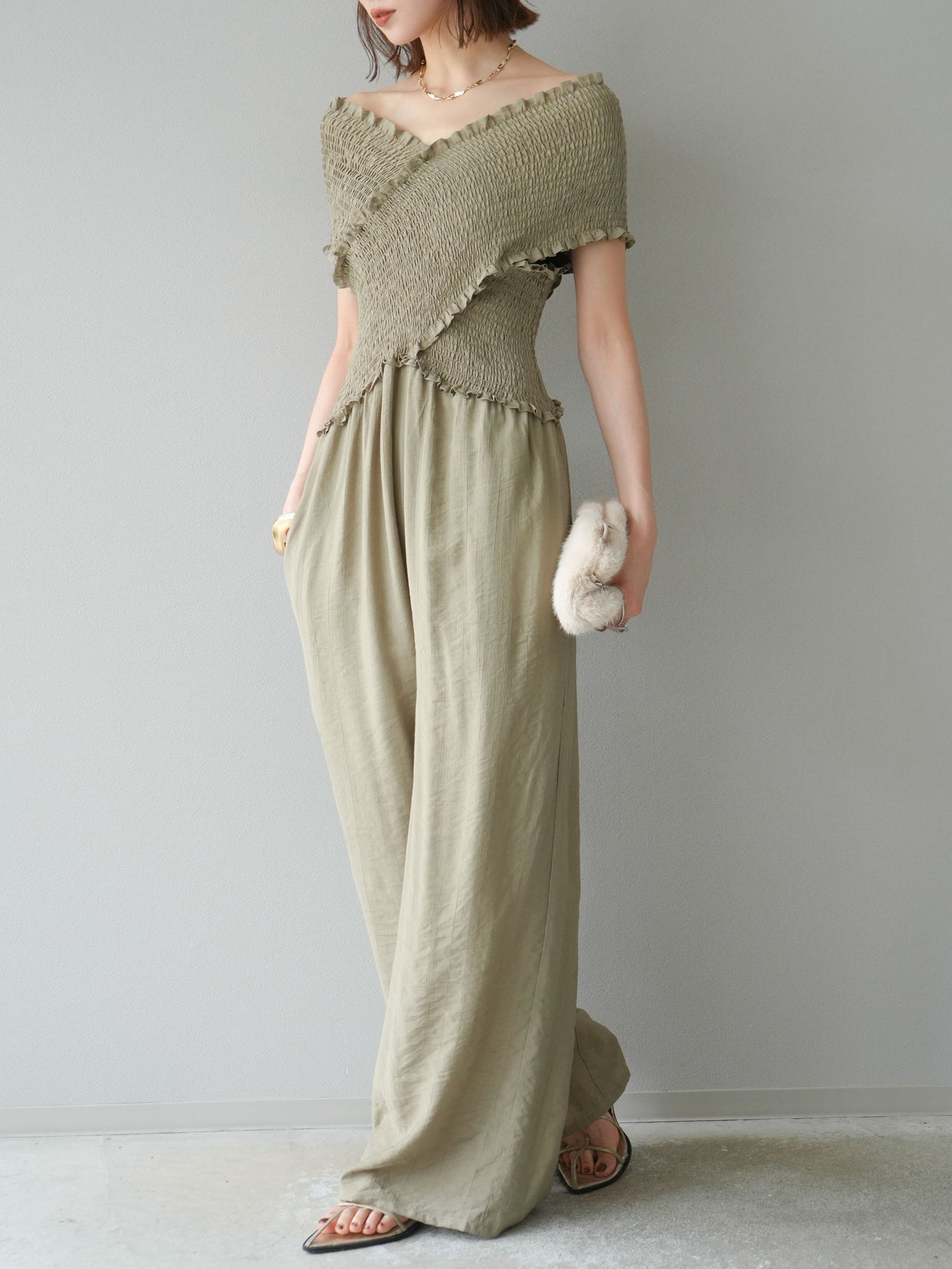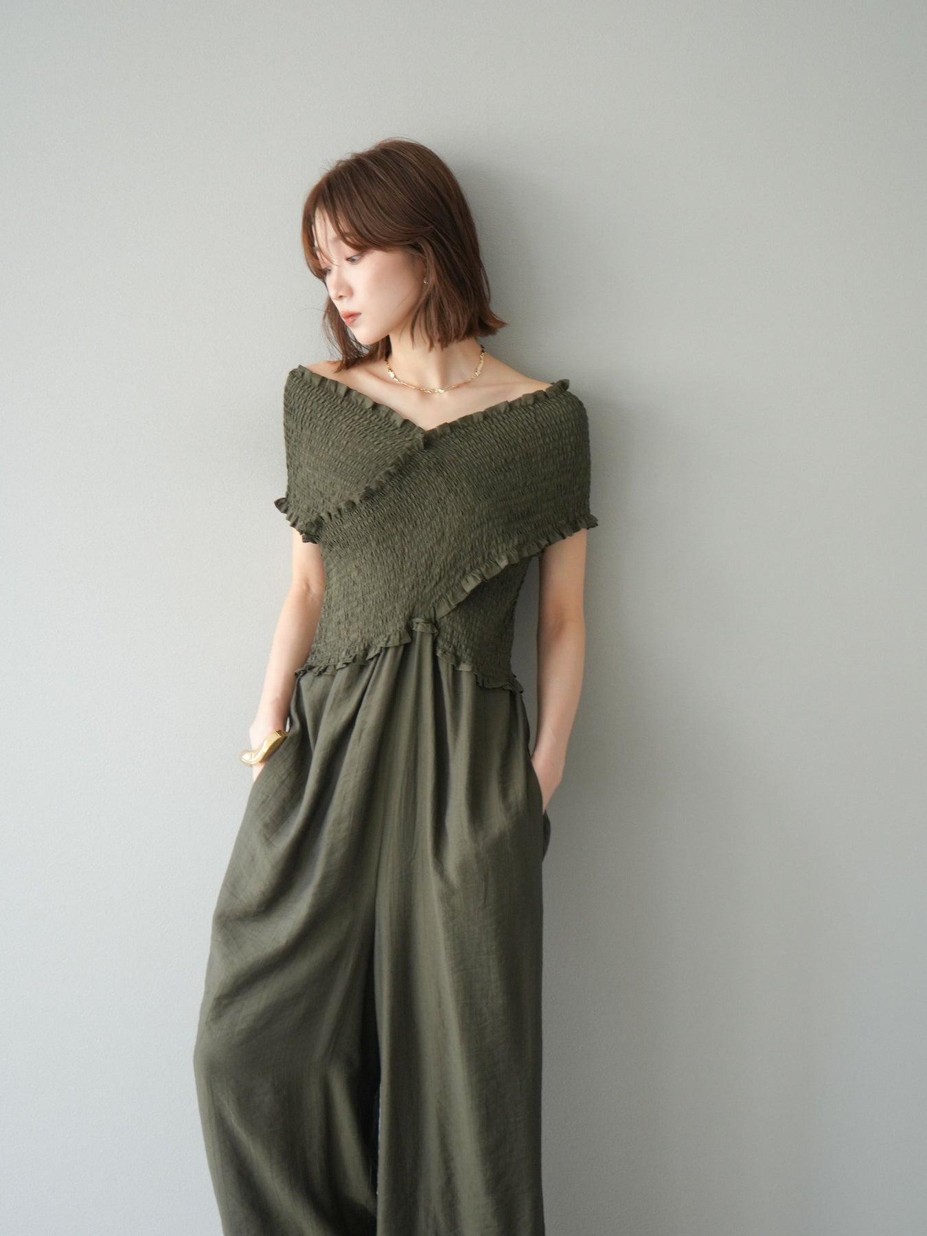 クロス状に切り替えたシャーリングデザインが目を惹くサロペット。 デコルテを美しく見せるオフショルダー風のネックラインが、女性らしさを引き立てます。 ボリューム感のあるパンツシルエットで、リラックス感と華やかさを両立。 一枚で着映えする存在感のあるデザインで、夏のお出かけシーンにもおすすめのアイテムです。