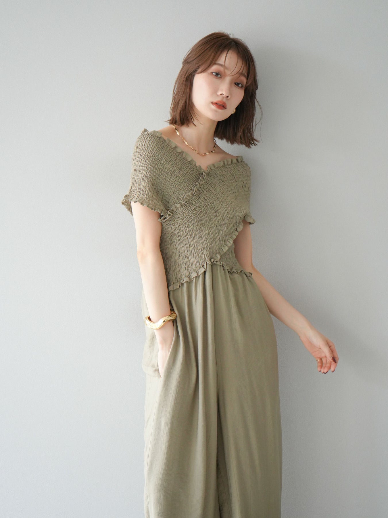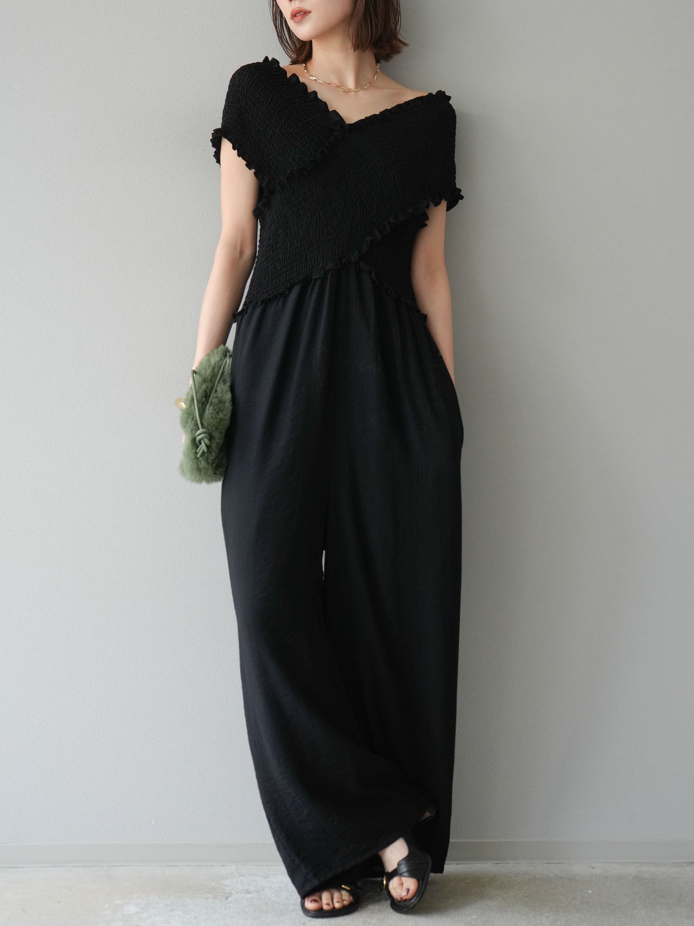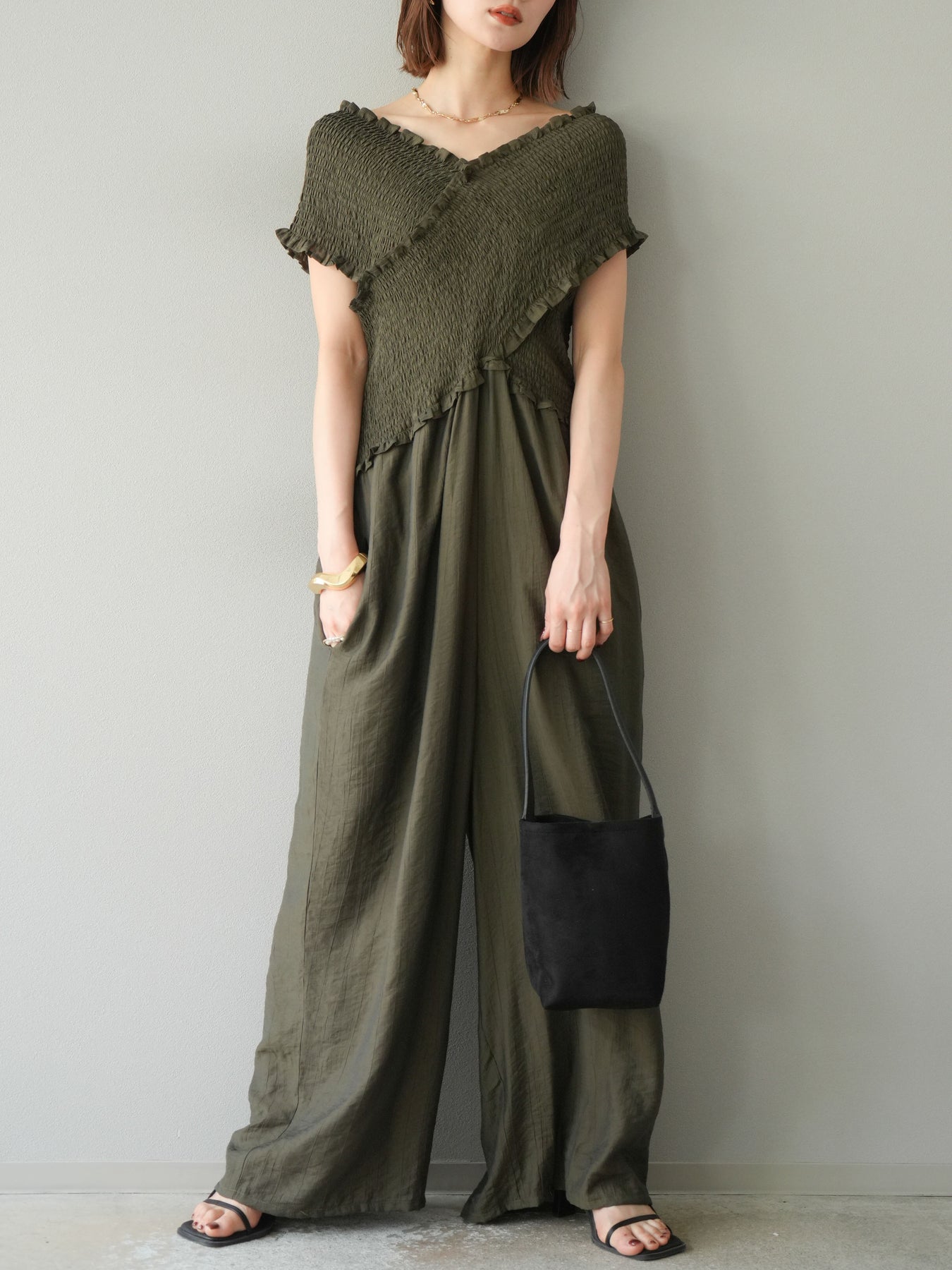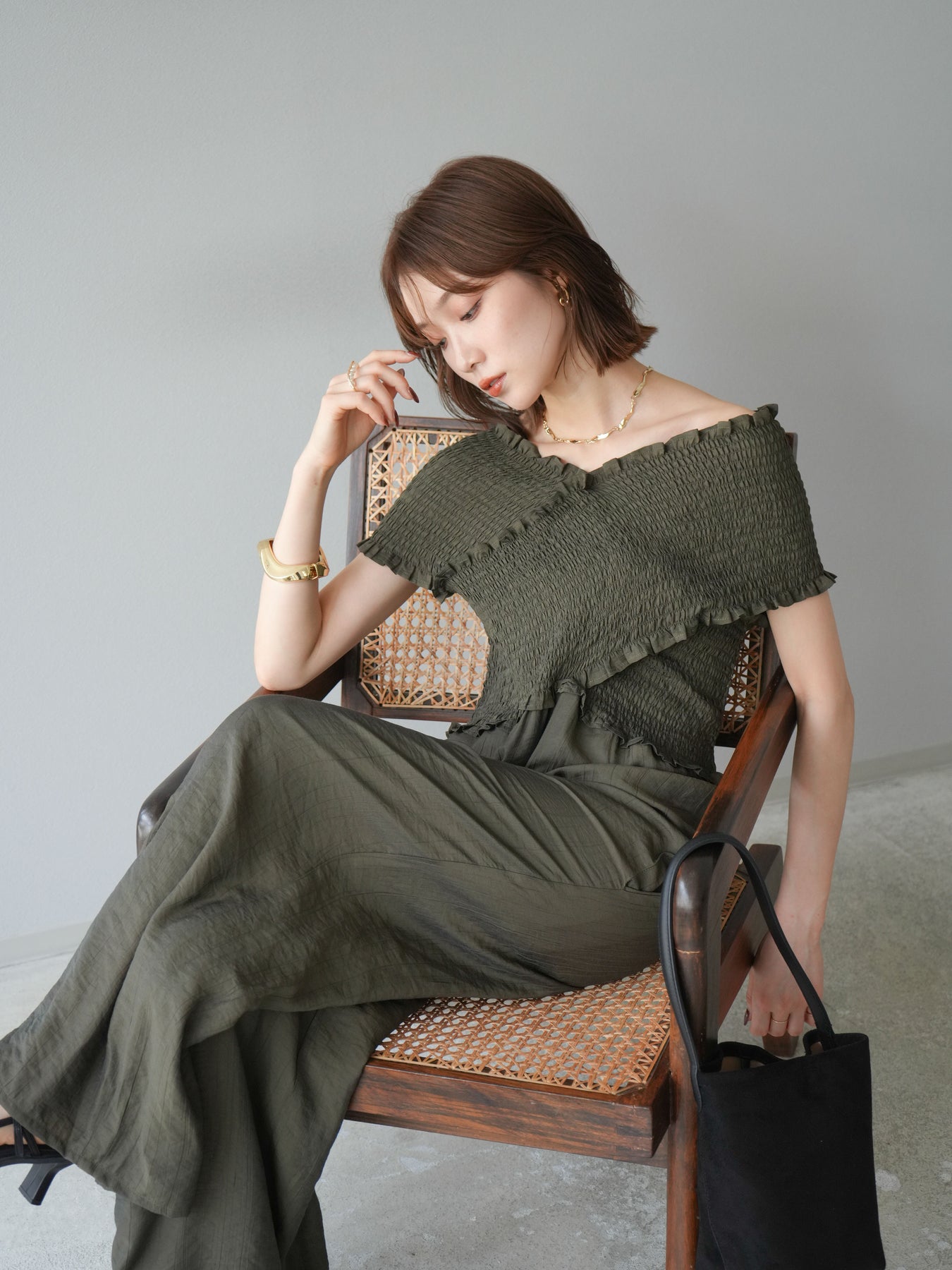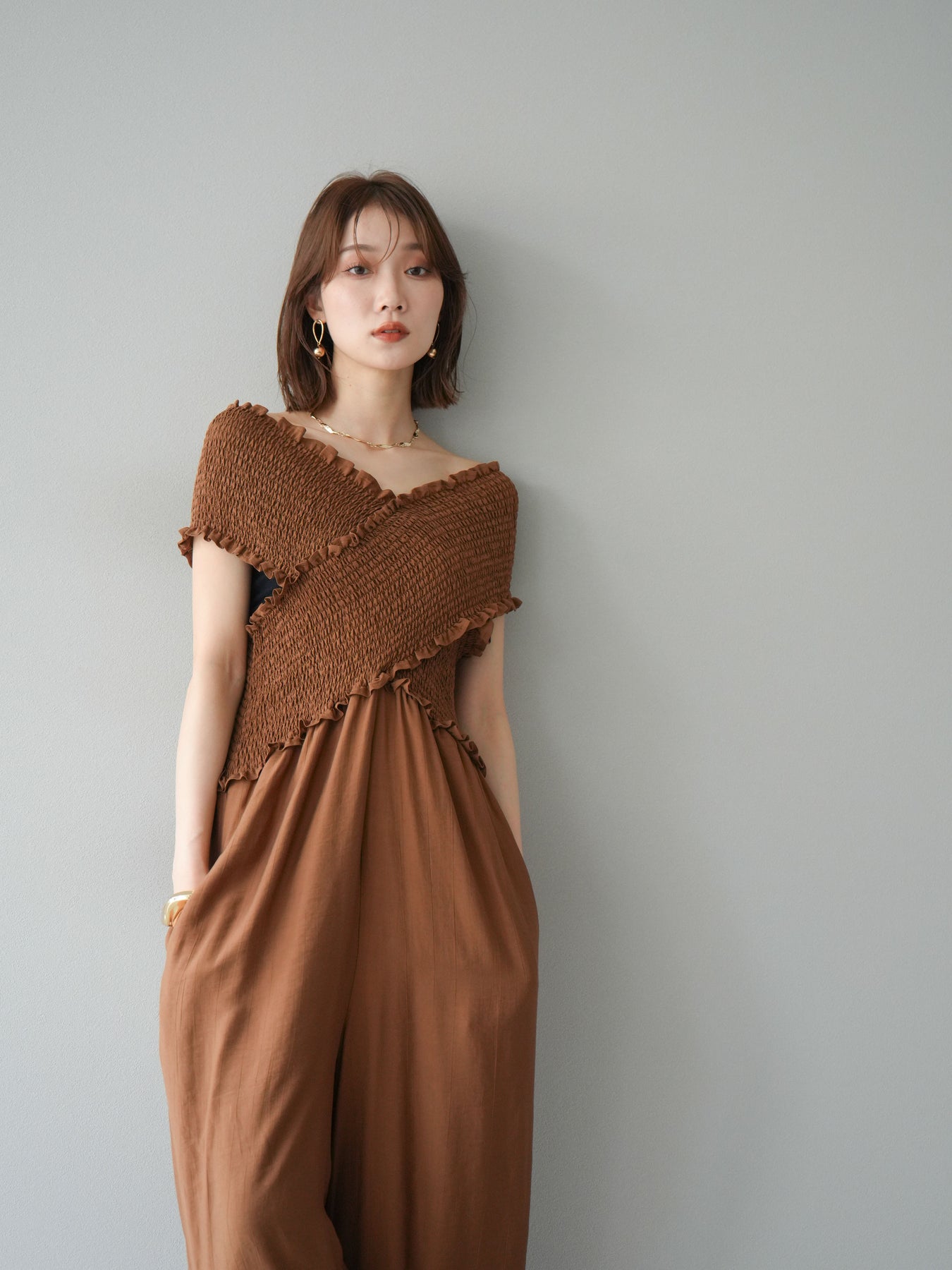 クロス状に切り替えたシャーリングデザインが目を惹くサロペット。 デコルテを美しく見せるオフショルダー風のネックラインが、女性らしさを引き立てます。 ボリューム感のあるパンツシルエットで、リラックス感と華やかさを両立。 一枚で着映えする存在感のあるデザインで、夏のお出かけシーンにもおすすめのアイテムです。