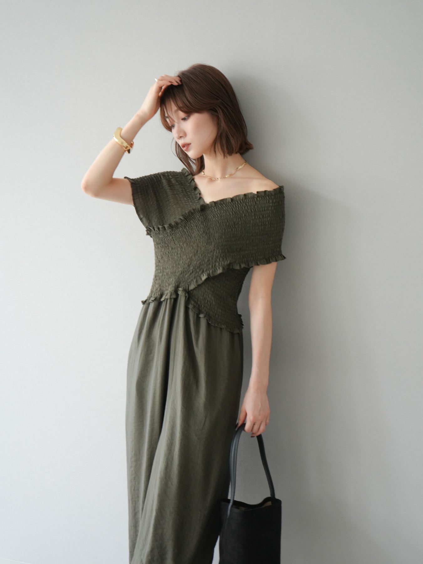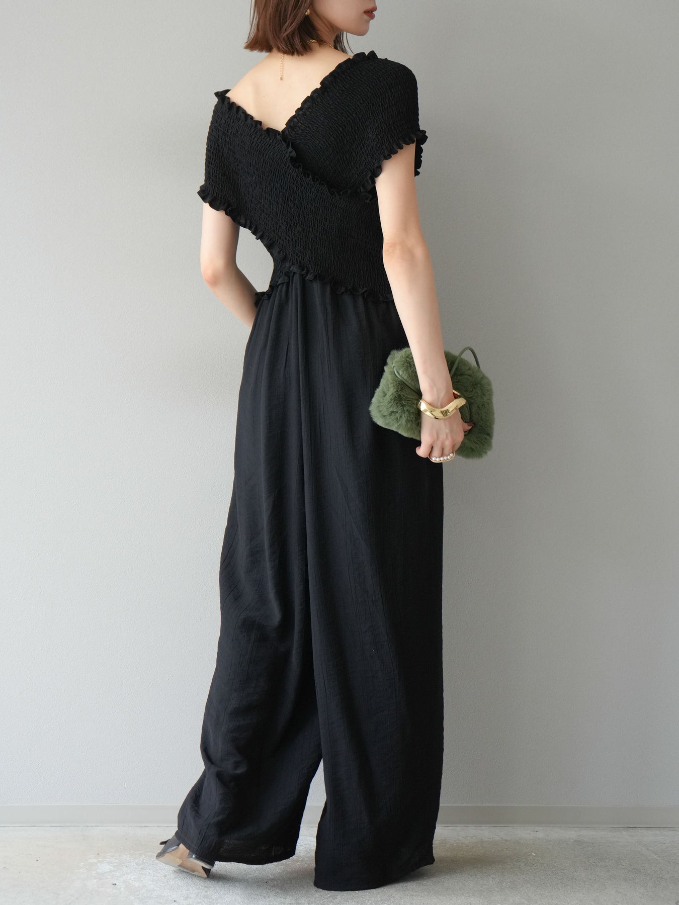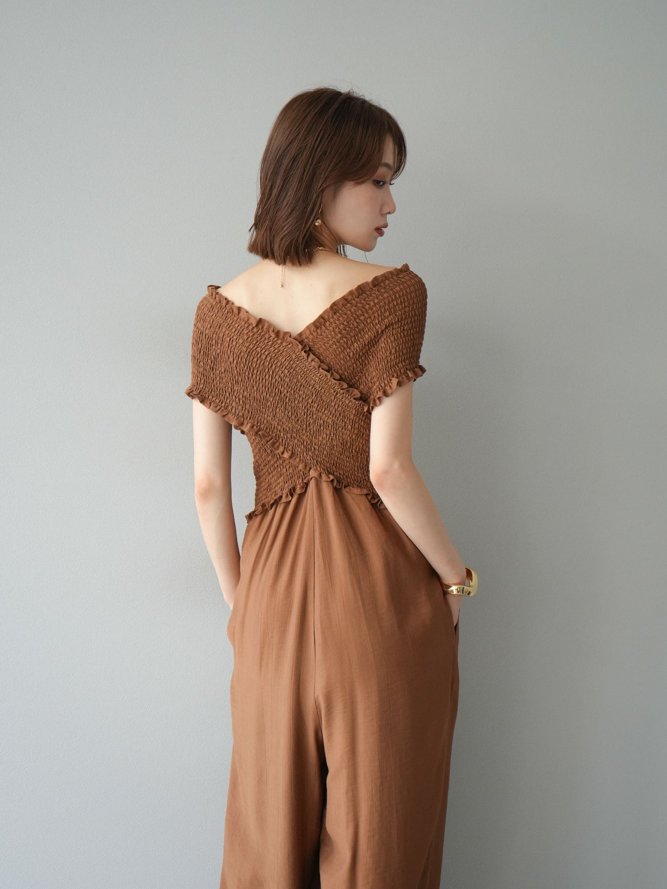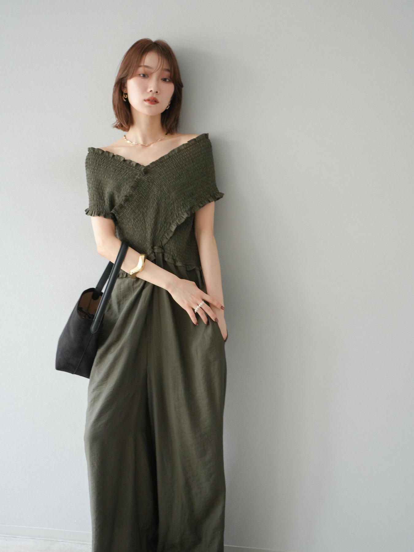クロス状に切り替えたシャーリングデザインが目を惹くサロペット。 デコルテを美しく見せるオフショルダー風のネックラインが、女性らしさを引き立てます。 ボリューム感のあるパンツシルエットで、リラックス感と華やかさを両立。 一枚で着映えする存在感のあるデザインで、夏のお出かけシーンにもおすすめのアイテムです。