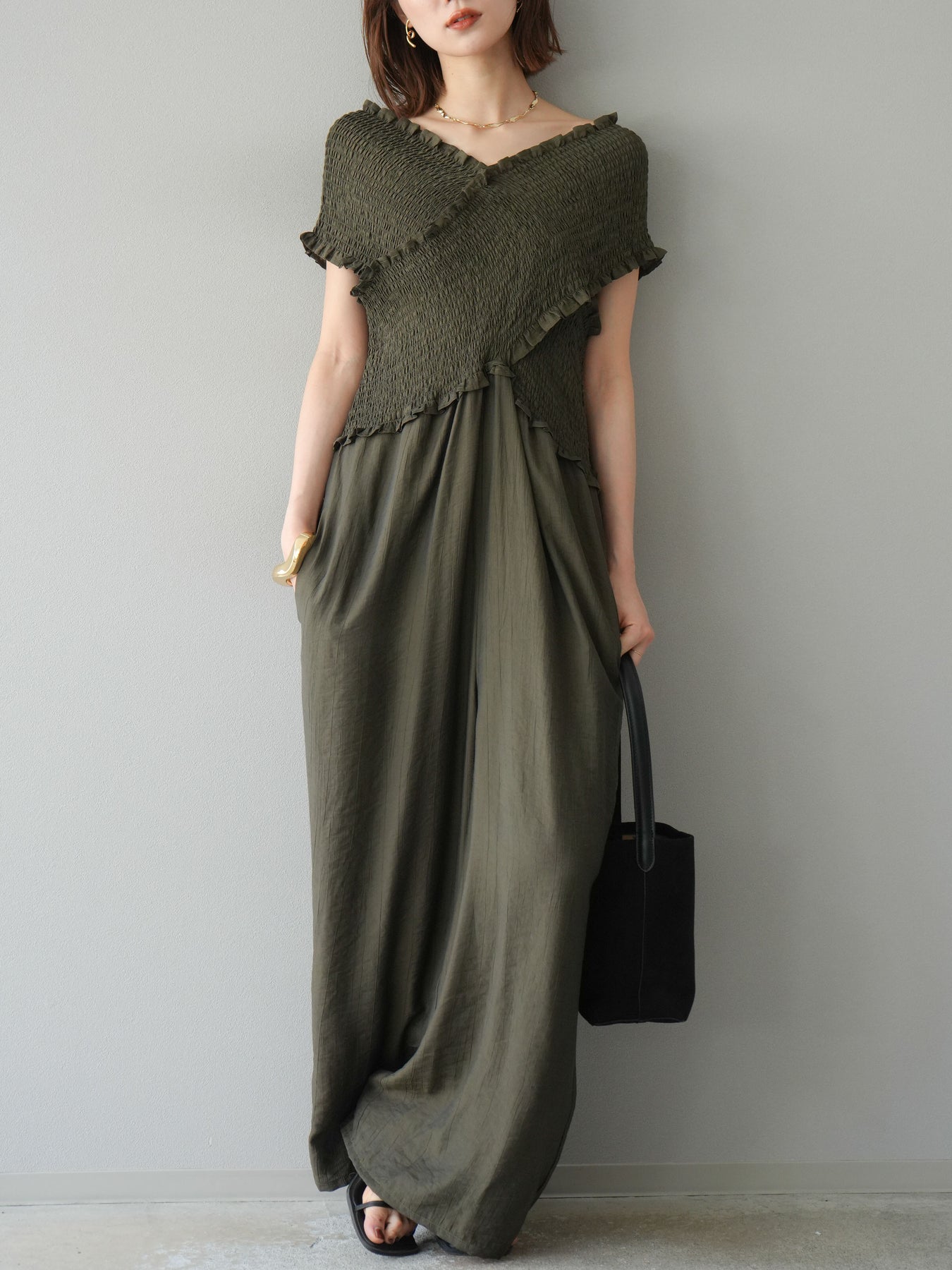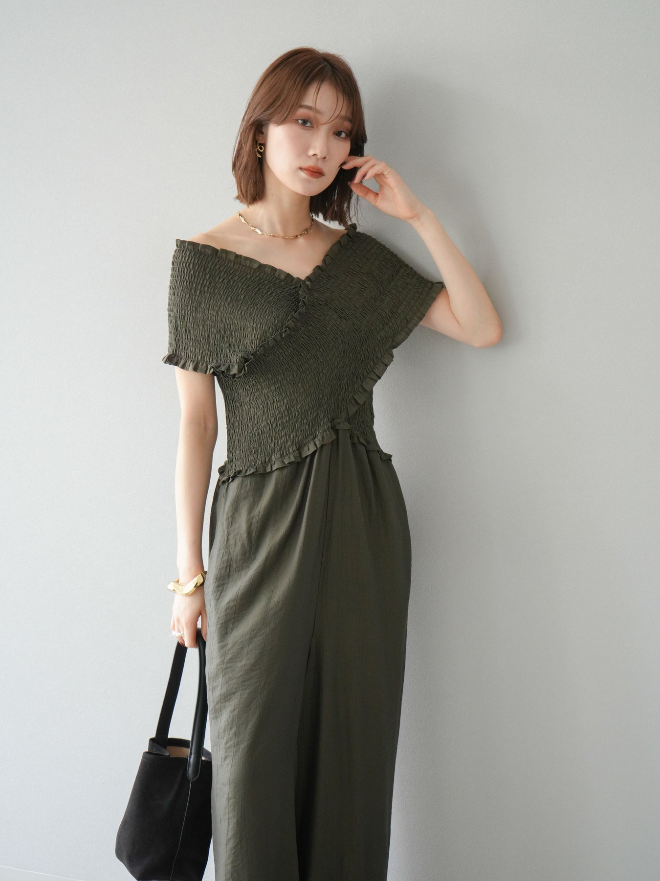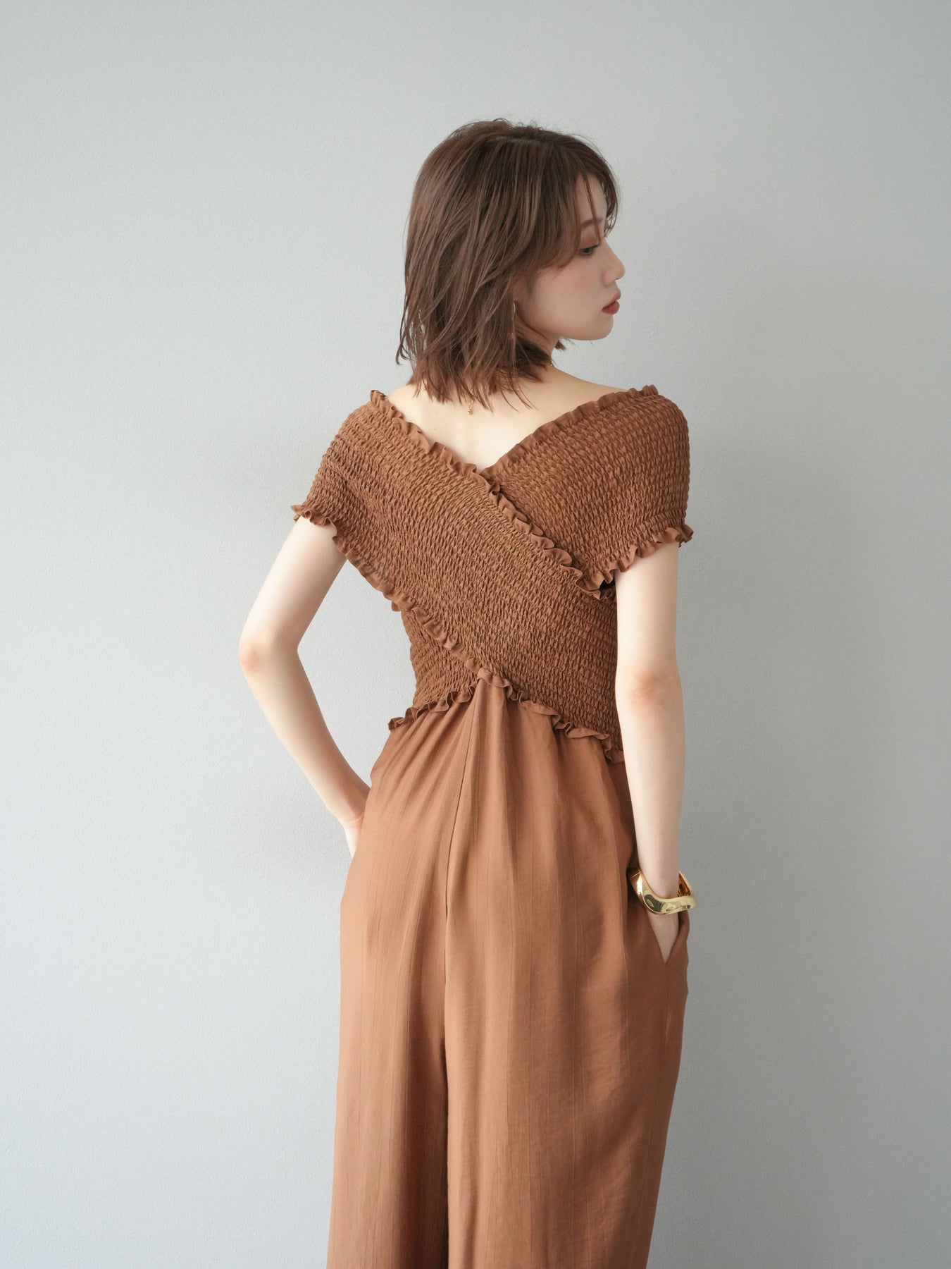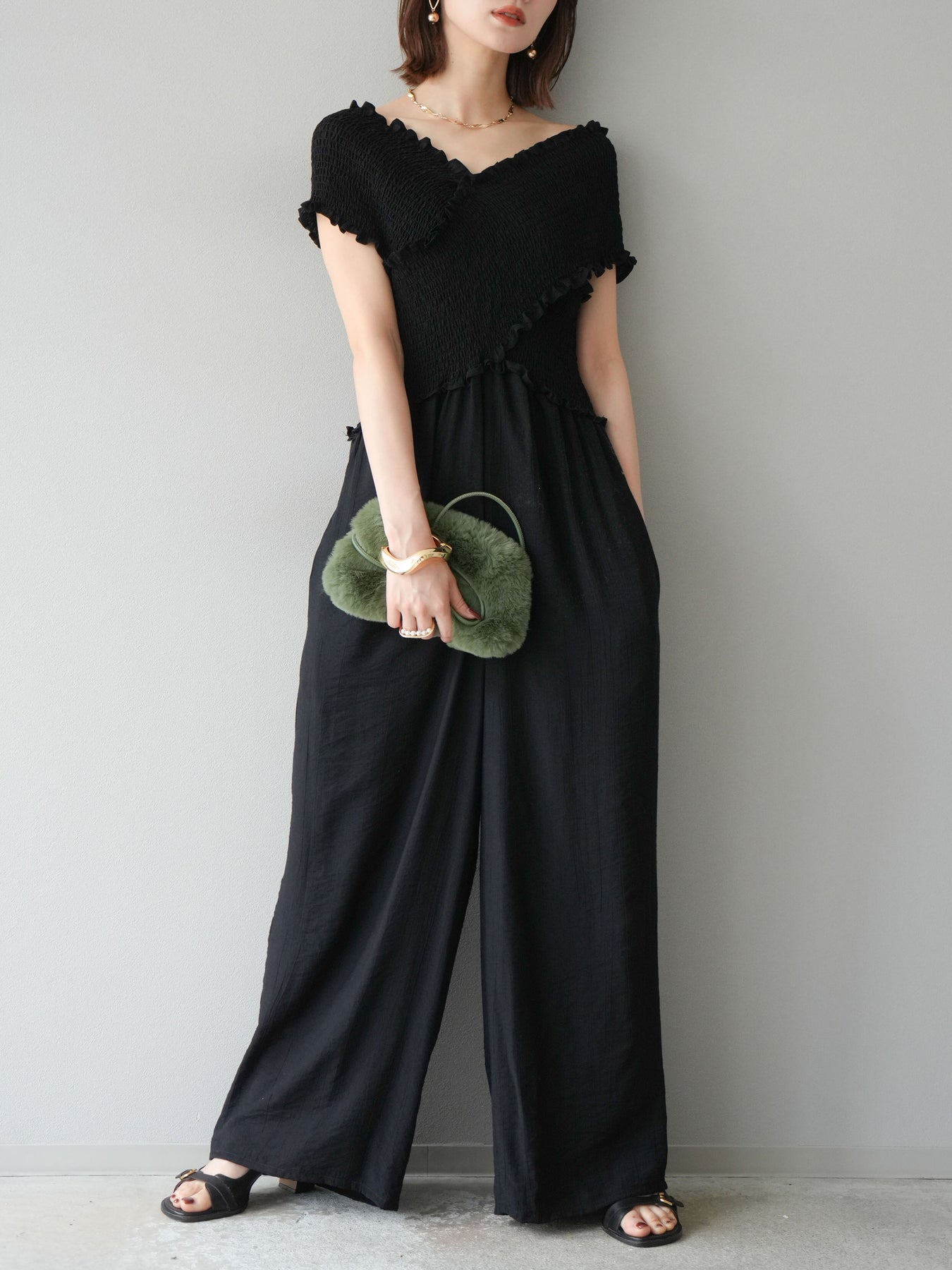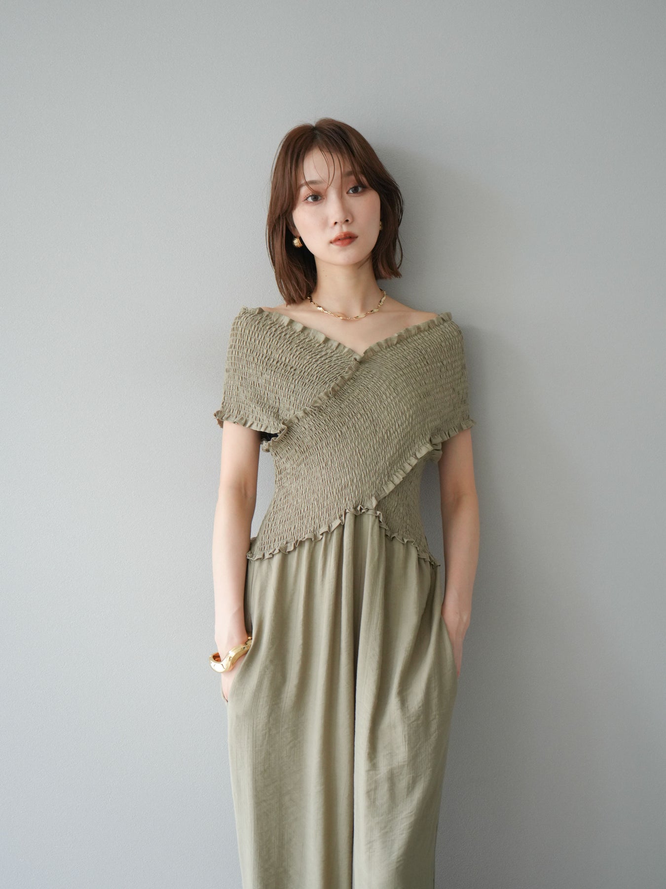 クロス状に切り替えたシャーリングデザインが目を惹くサロペット。 デコルテを美しく見せるオフショルダー風のネックラインが、女性らしさを引き立てます。 ボリューム感のあるパンツシルエットで、リラックス感と華やかさを両立。 一枚で着映えする存在感のあるデザインで、夏のお出かけシーンにもおすすめのアイテムです。