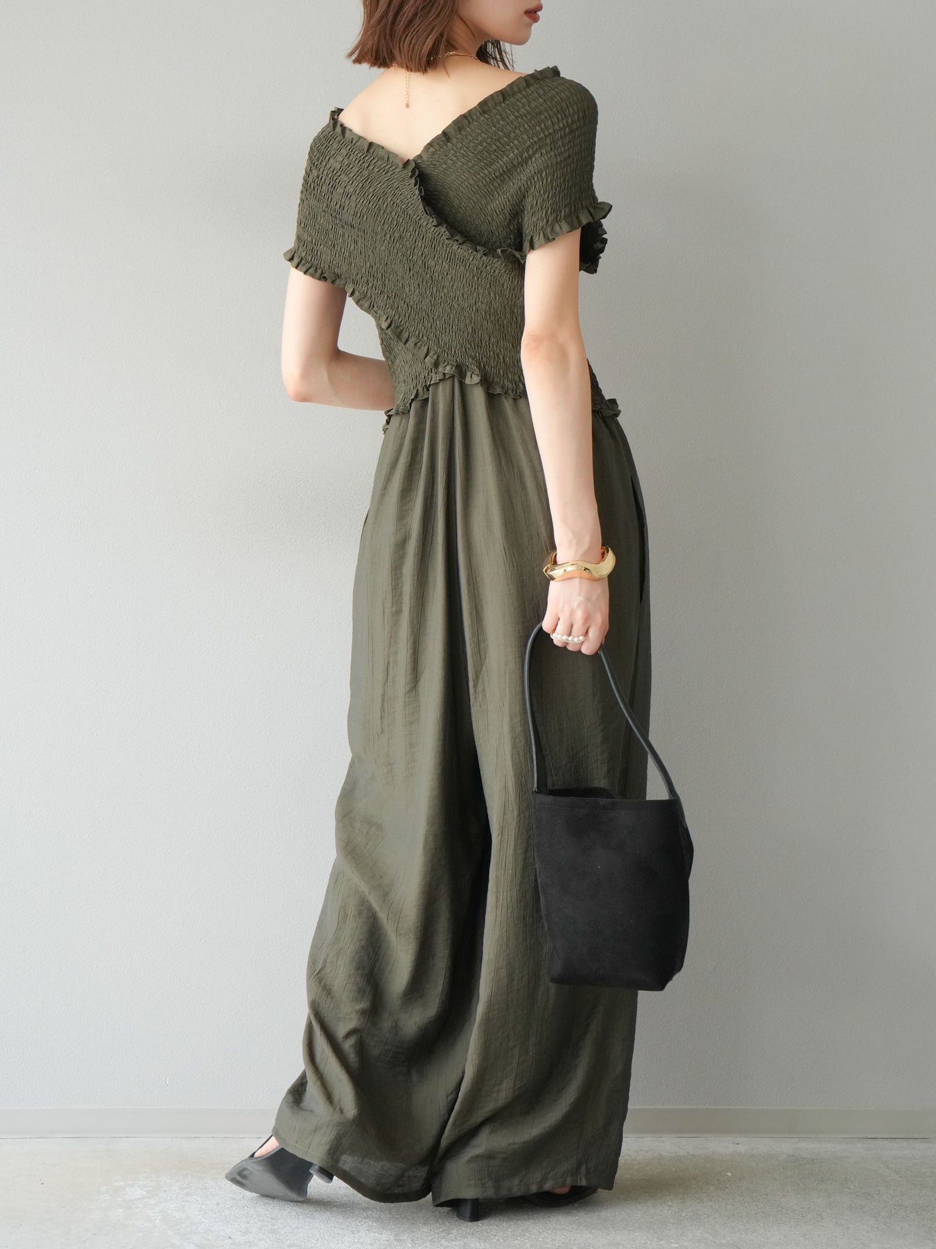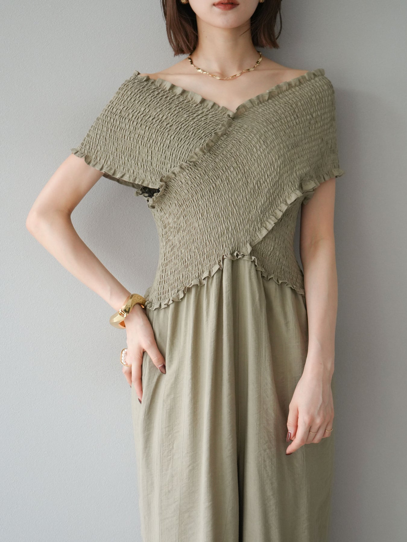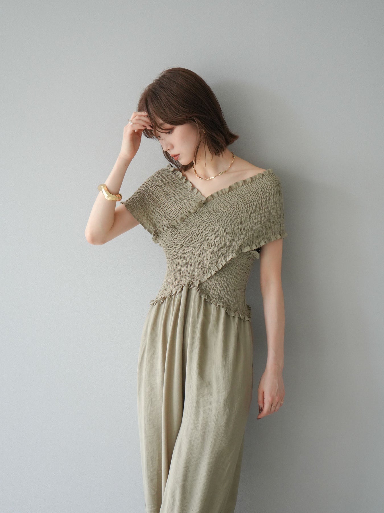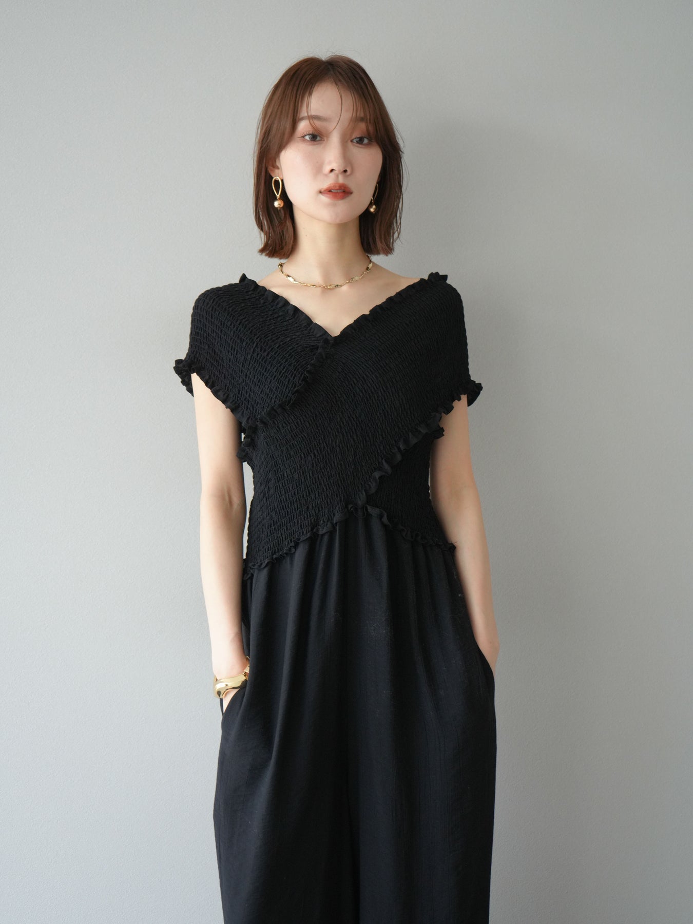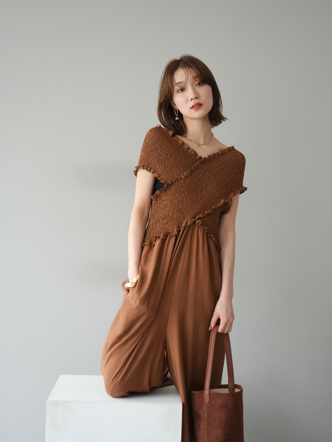 クロス状に切り替えたシャーリングデザインが目を惹くサロペット。 デコルテを美しく見せるオフショルダー風のネックラインが、女性らしさを引き立てます。 ボリューム感のあるパンツシルエットで、リラックス感と華やかさを両立。 一枚で着映えする存在感のあるデザインで、夏のお出かけシーンにもおすすめのアイテムです。