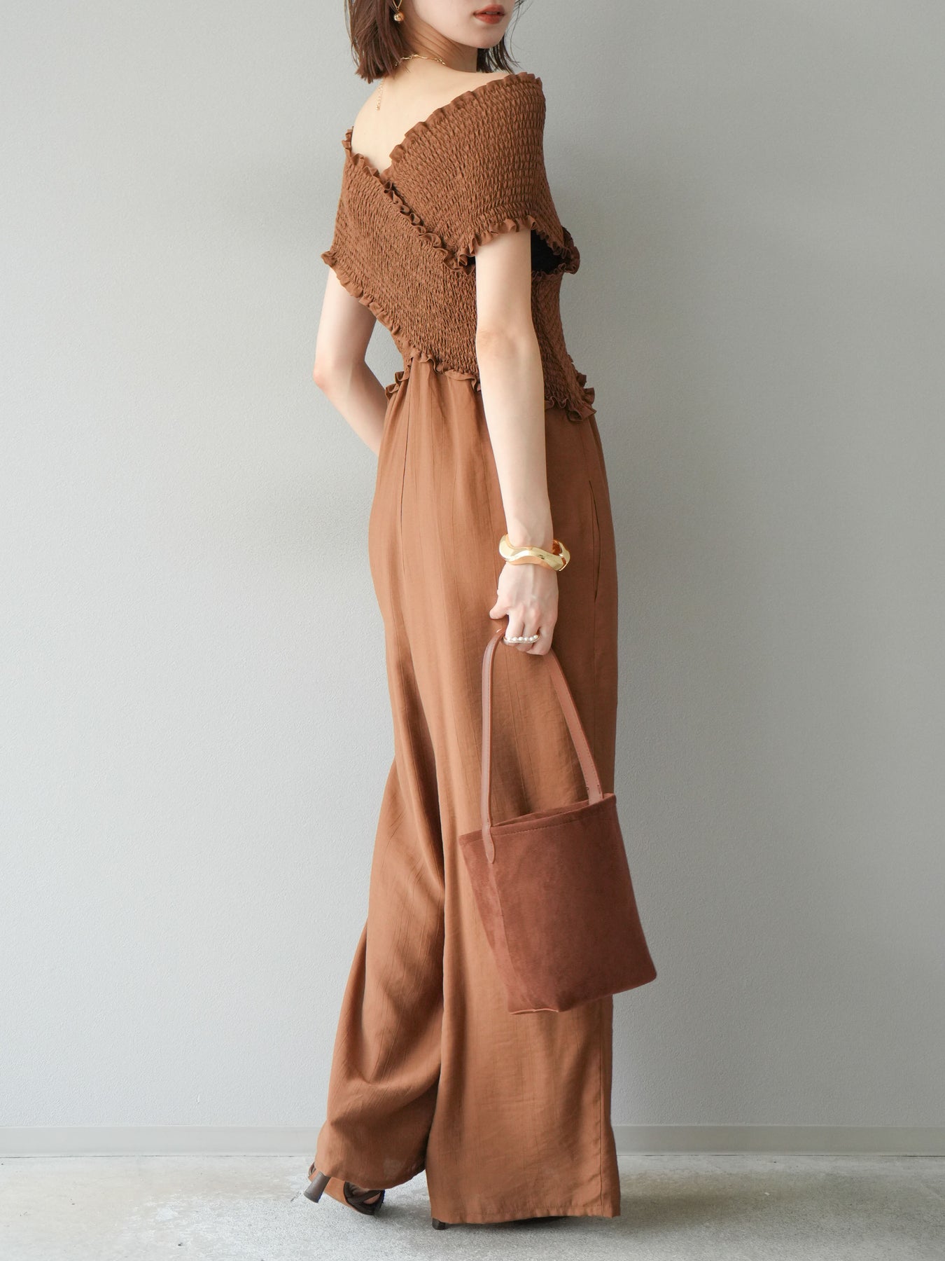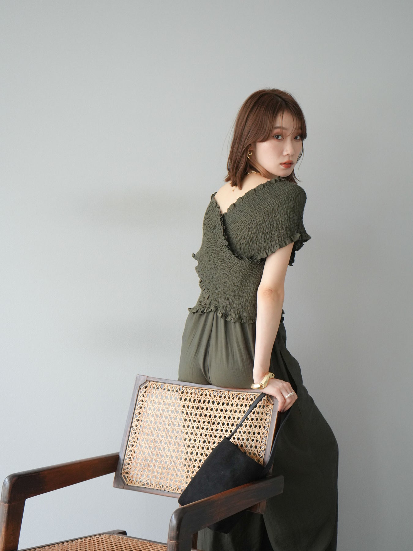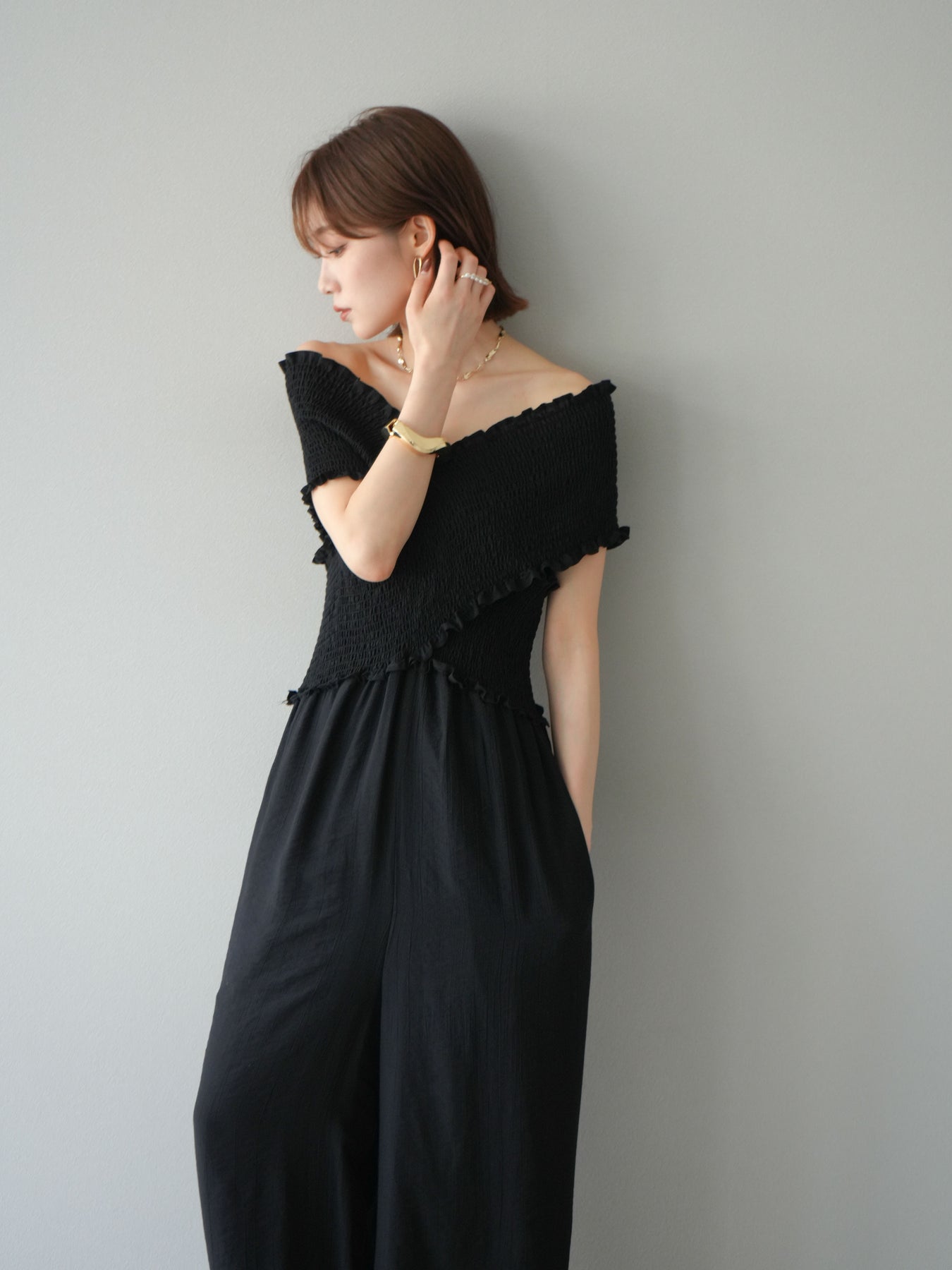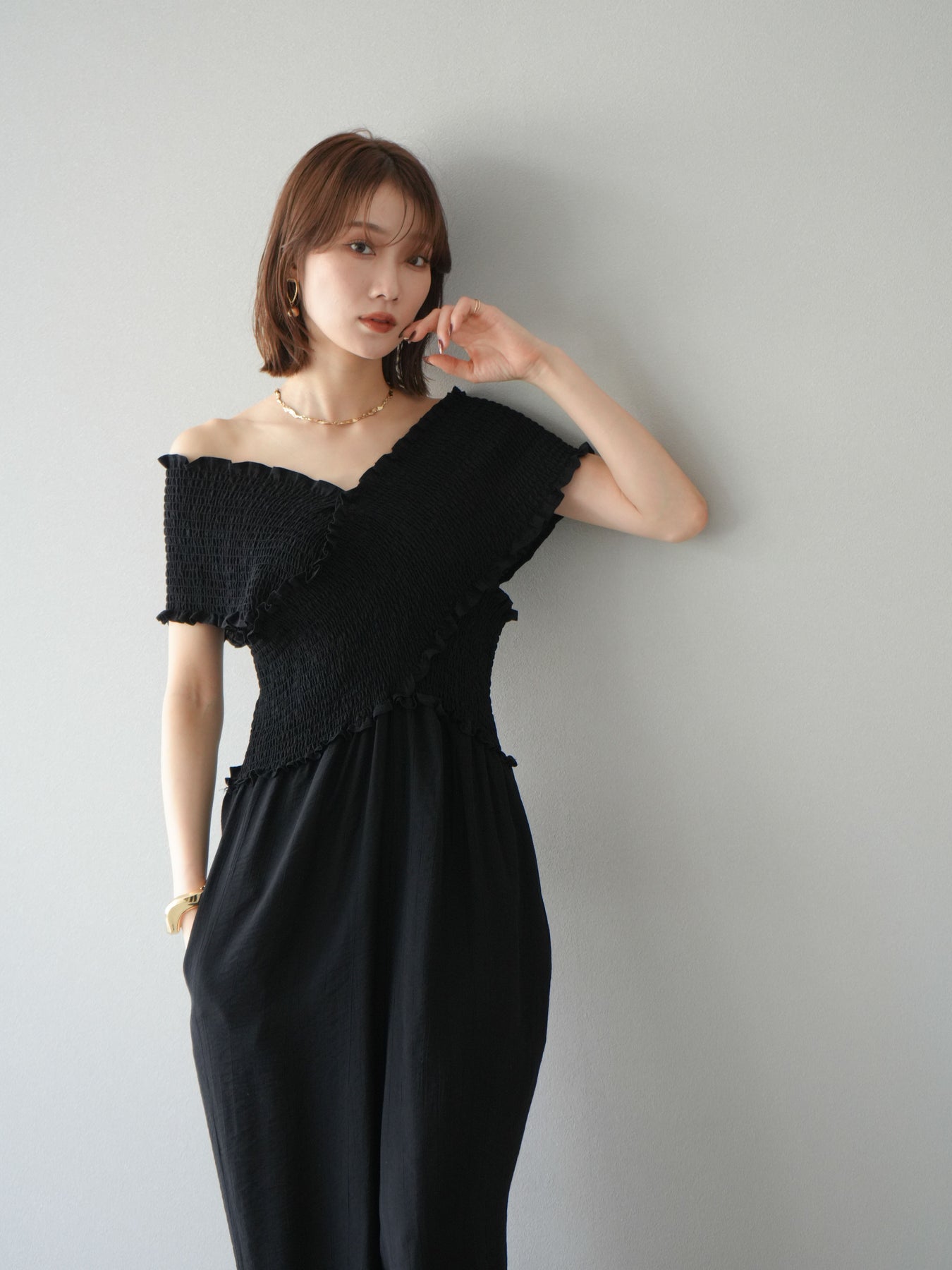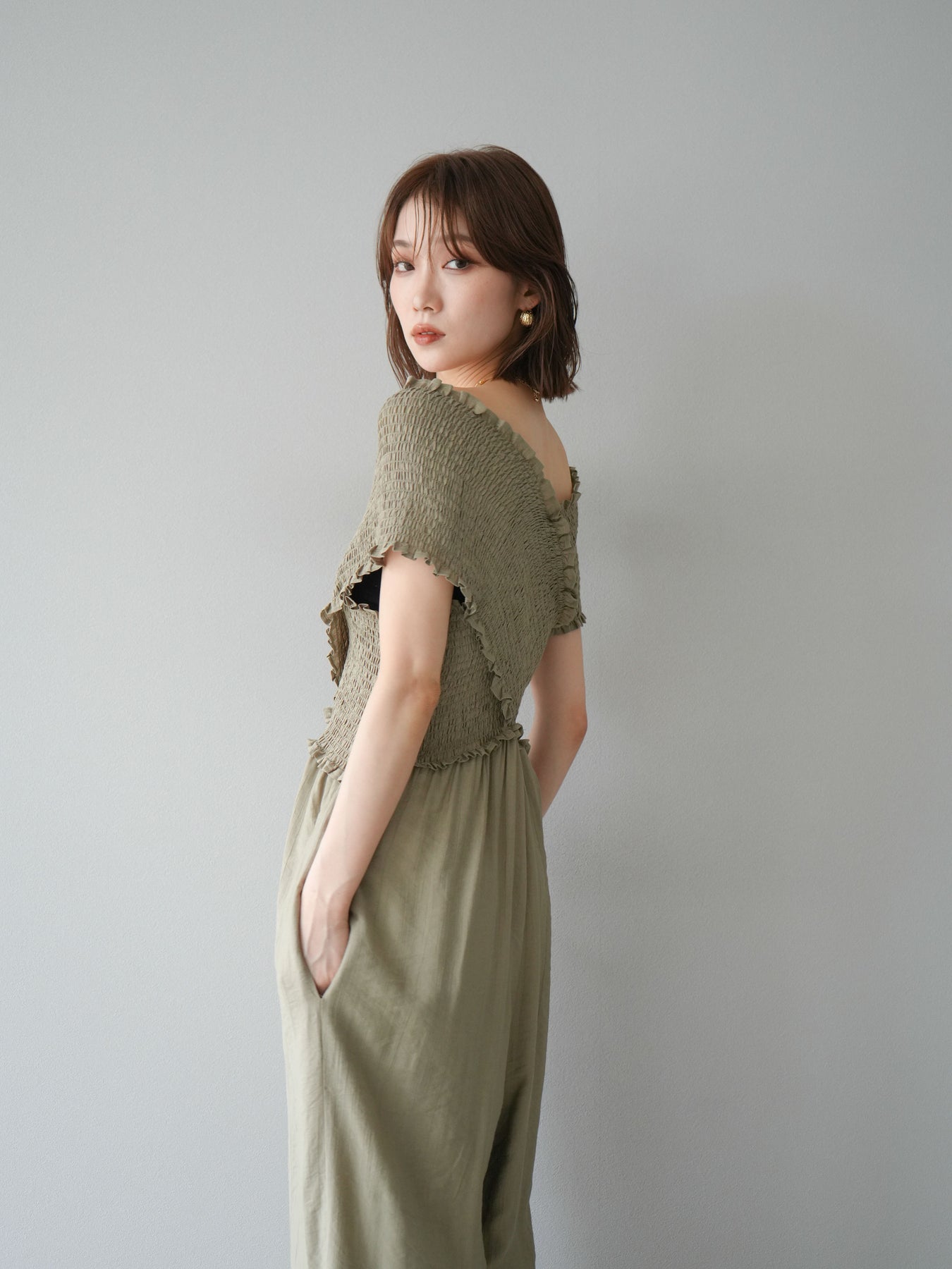 クロス状に切り替えたシャーリングデザインが目を惹くサロペット。 デコルテを美しく見せるオフショルダー風のネックラインが、女性らしさを引き立てます。 ボリューム感のあるパンツシルエットで、リラックス感と華やかさを両立。 一枚で着映えする存在感のあるデザインで、夏のお出かけシーンにもおすすめのアイテムです。