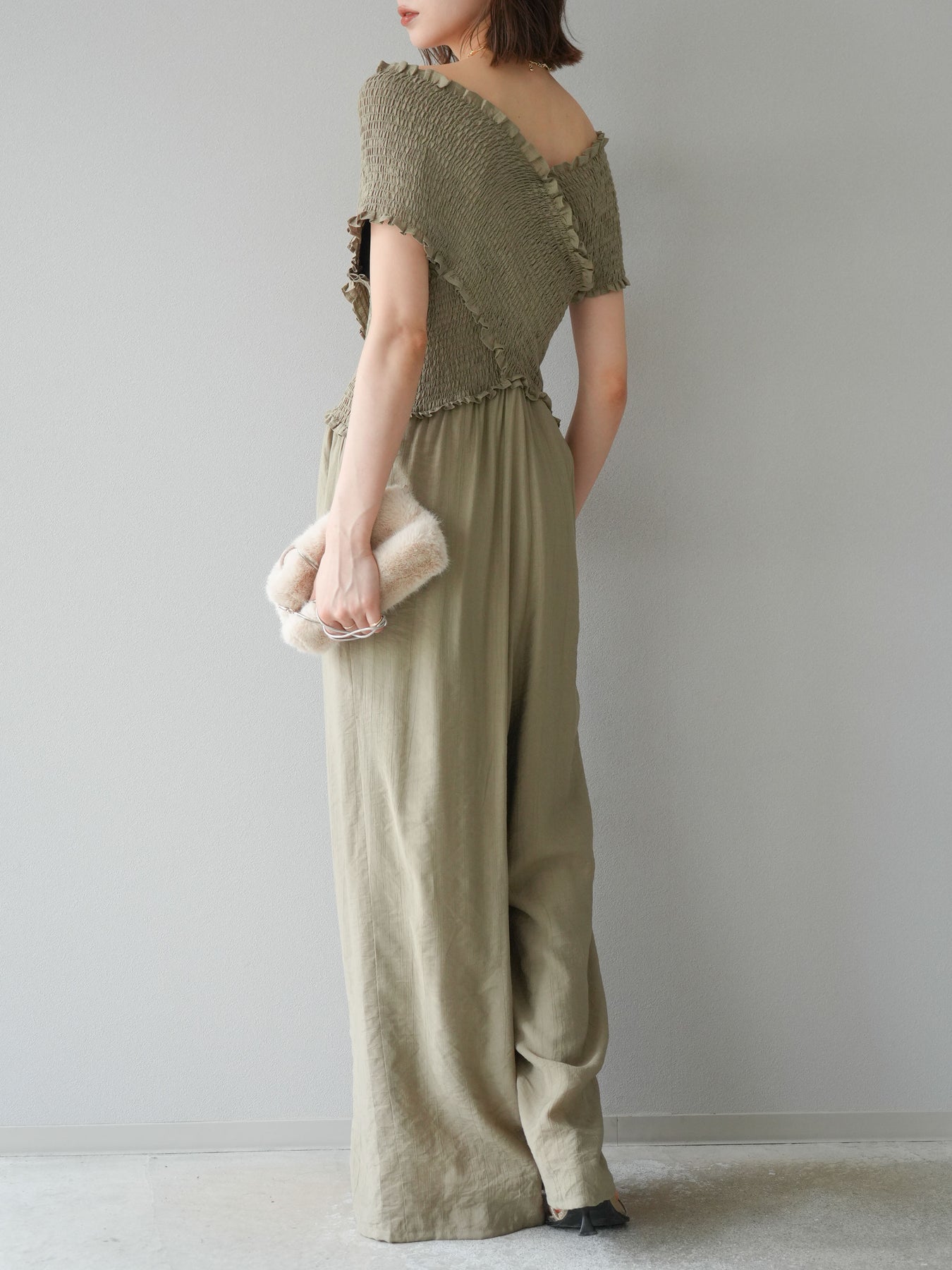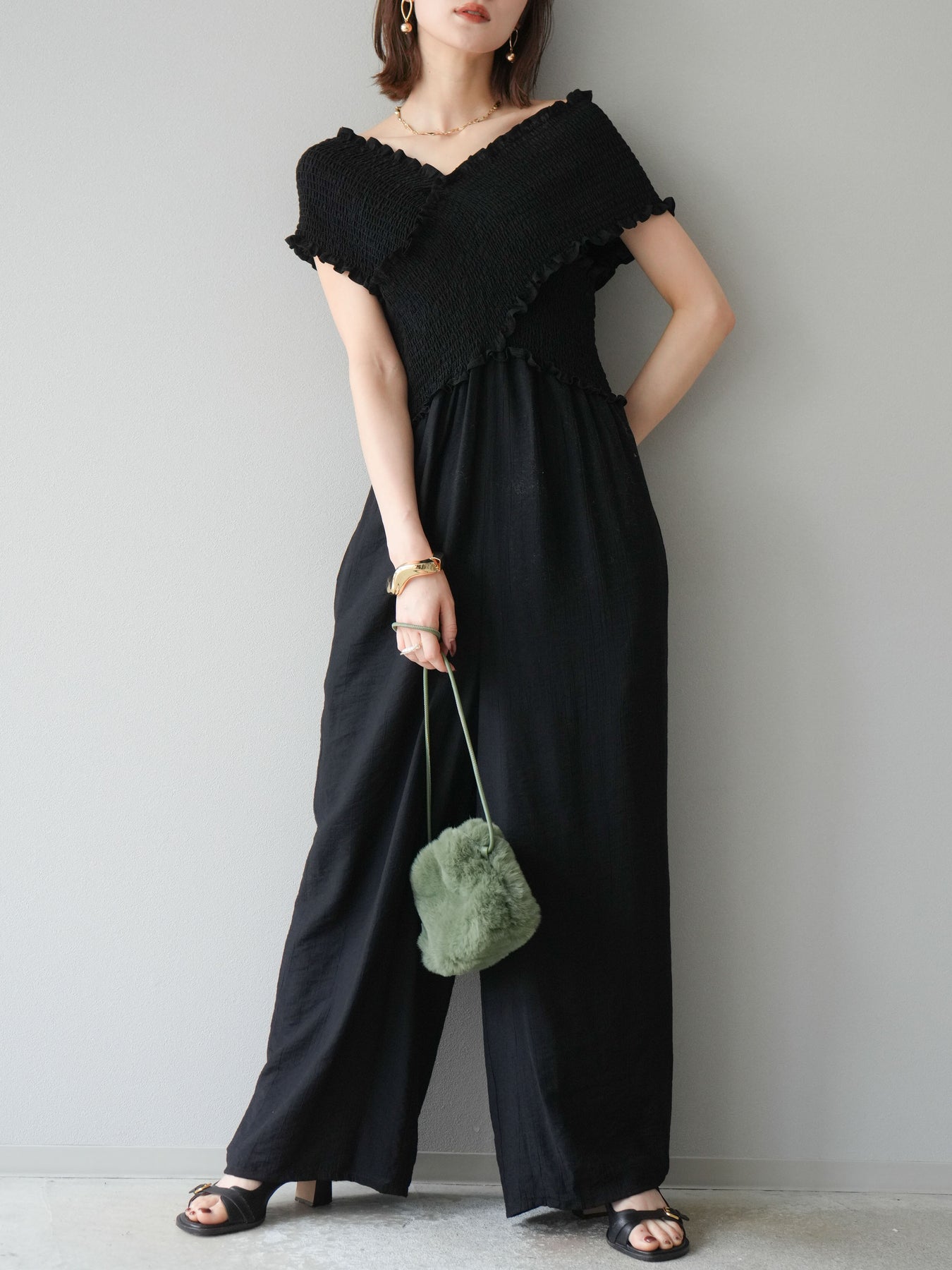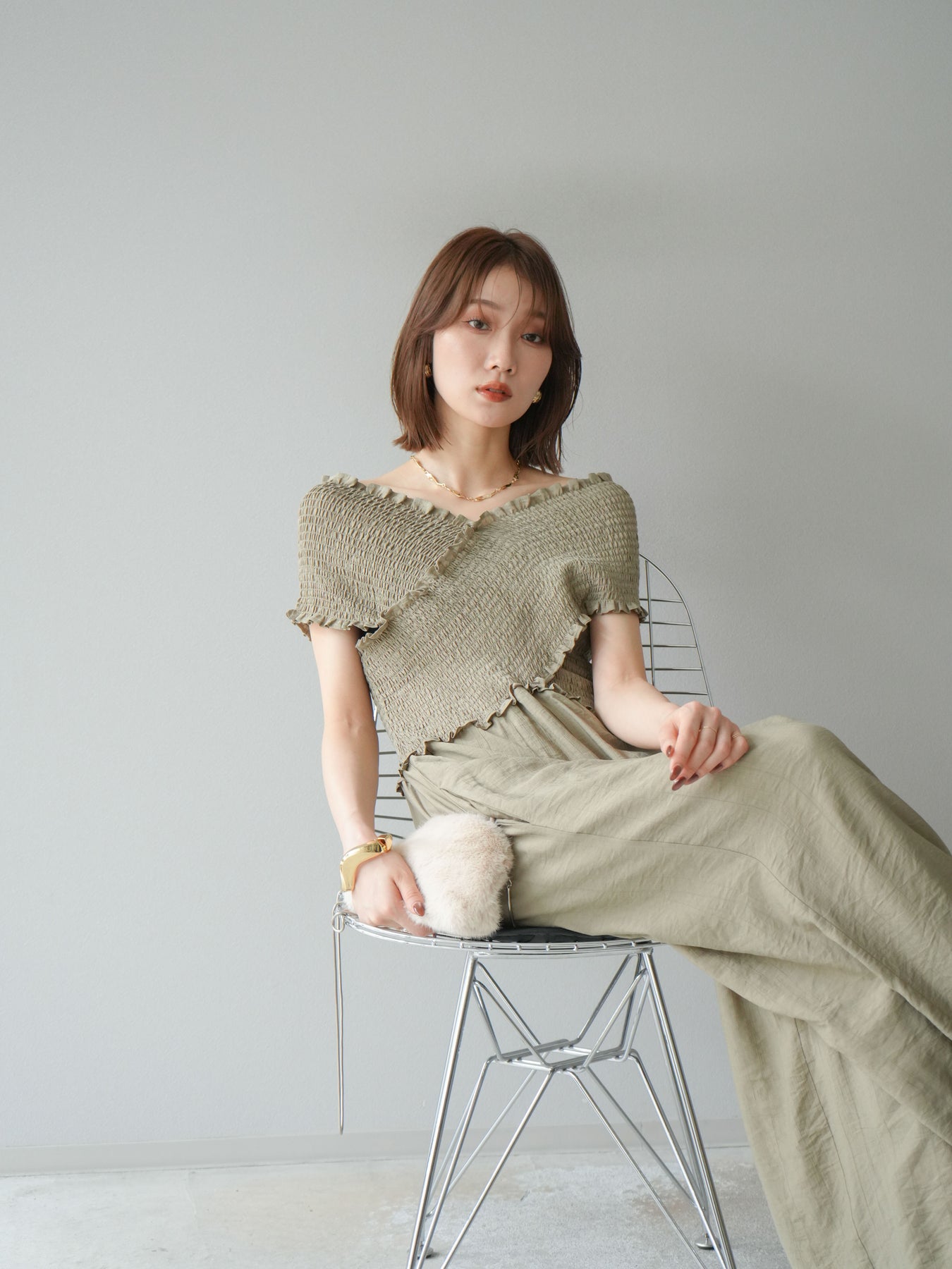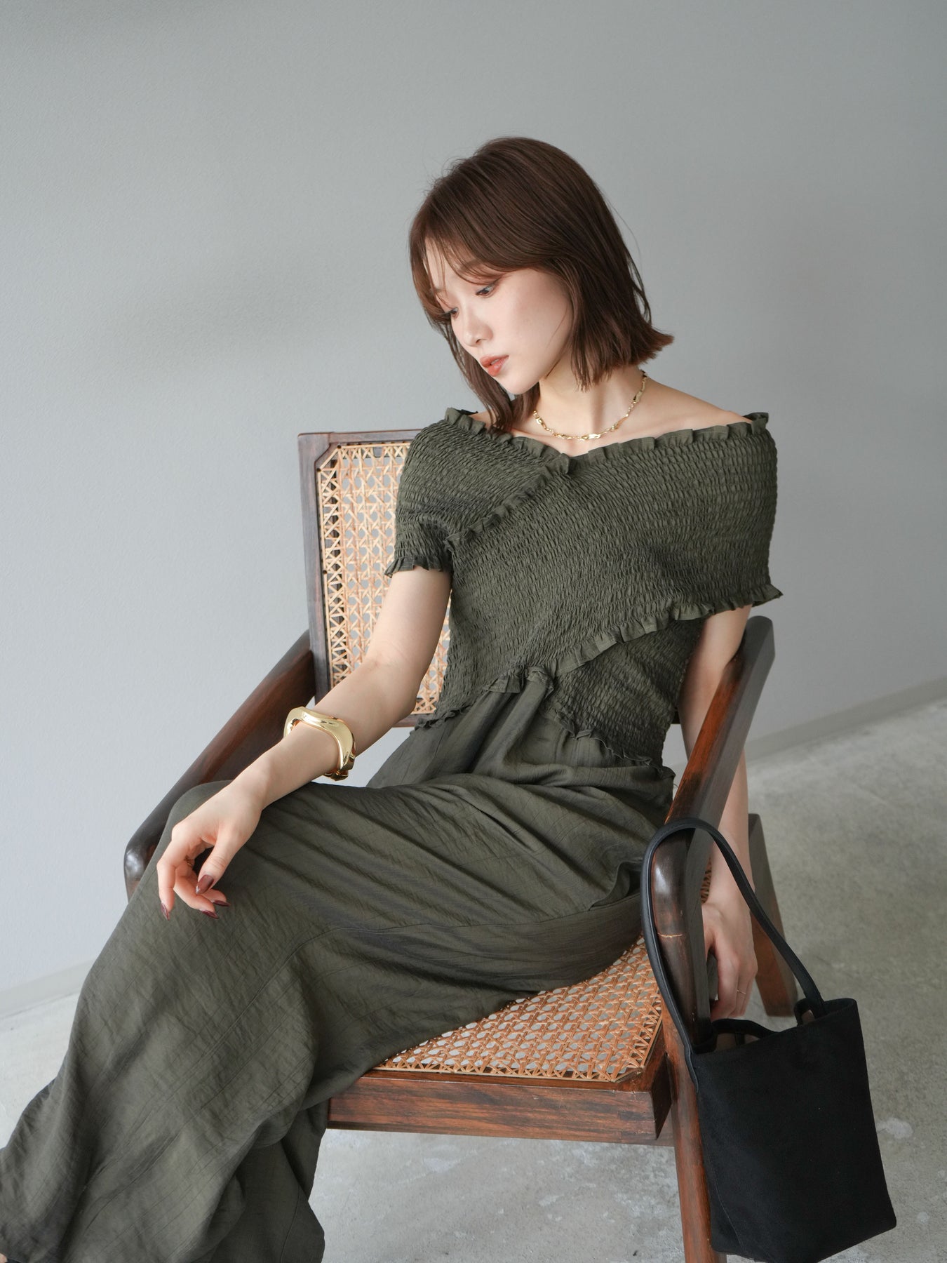 クロス状に切り替えたシャーリングデザインが目を惹くサロペット。 デコルテを美しく見せるオフショルダー風のネックラインが、女性らしさを引き立てます。 ボリューム感のあるパンツシルエットで、リラックス感と華やかさを両立。 一枚で着映えする存在感のあるデザインで、夏のお出かけシーンにもおすすめのアイテムです。