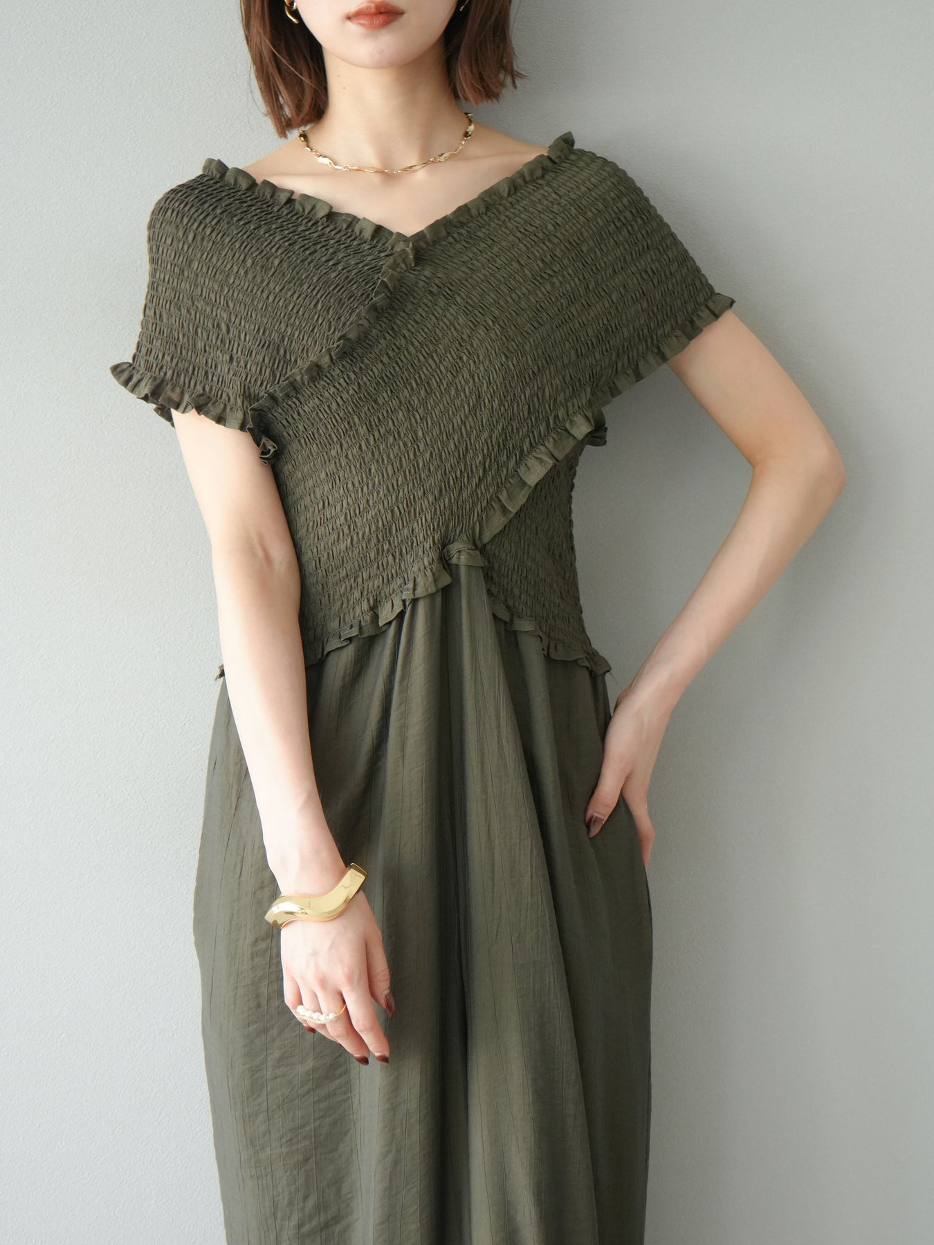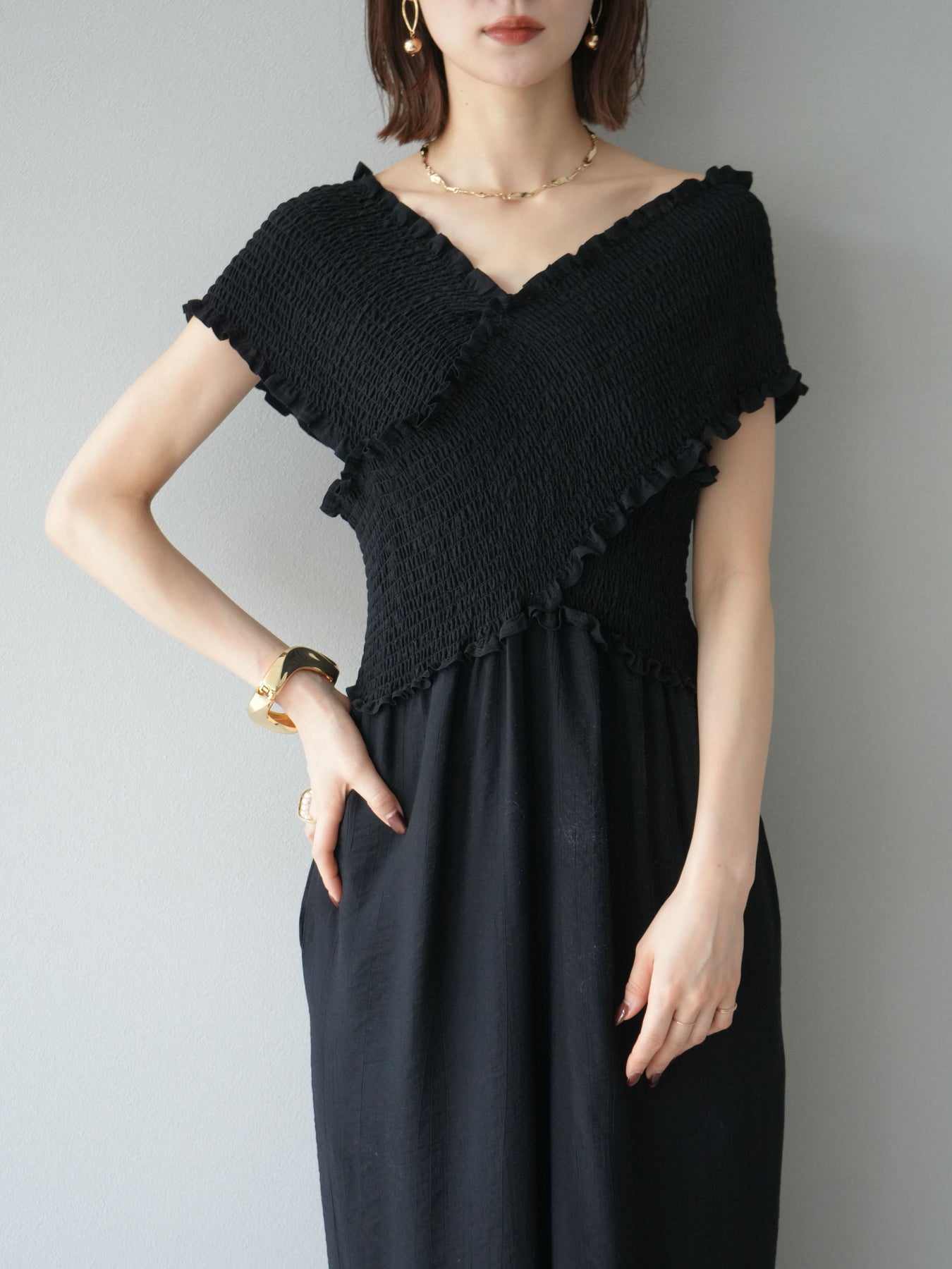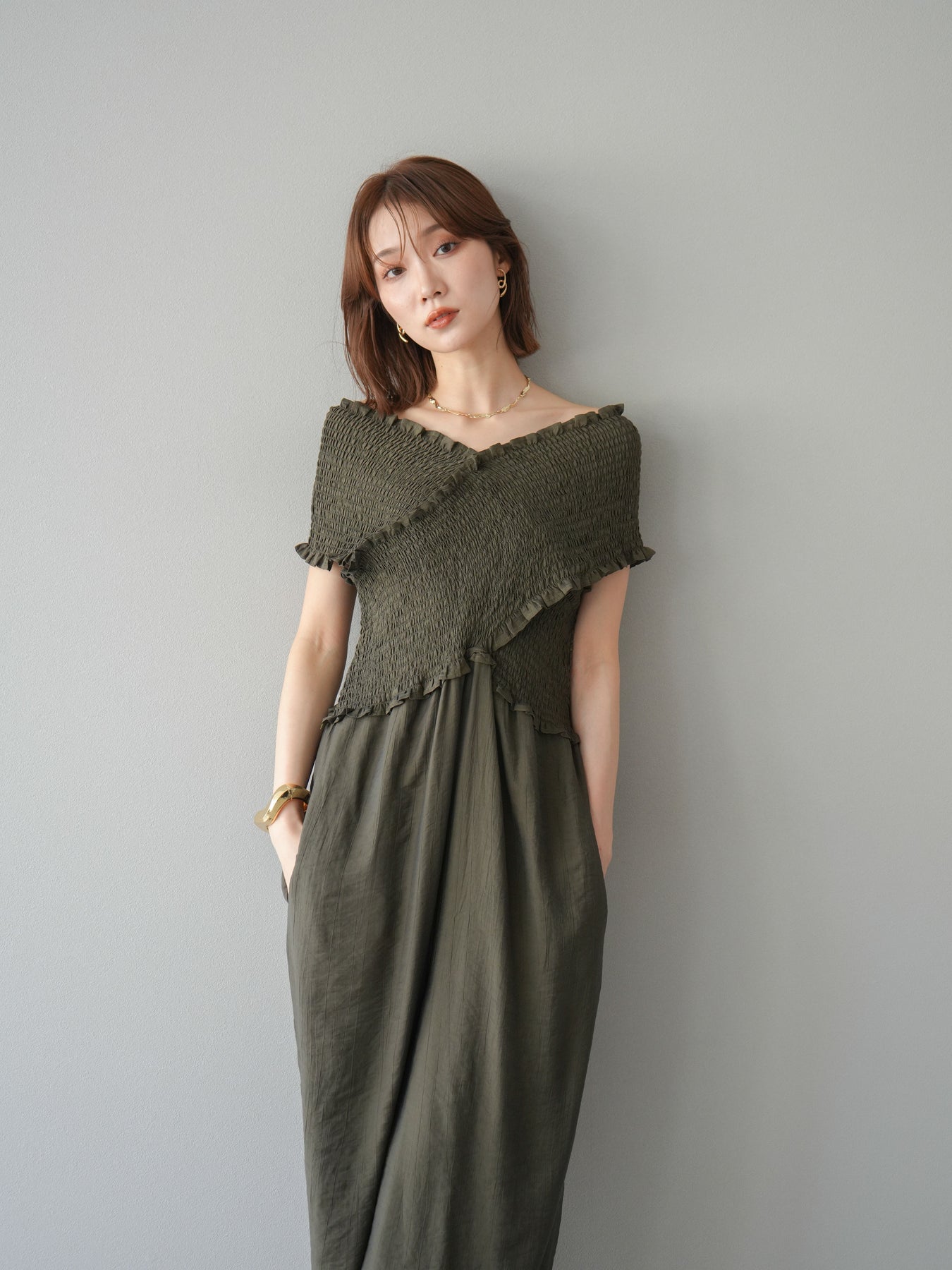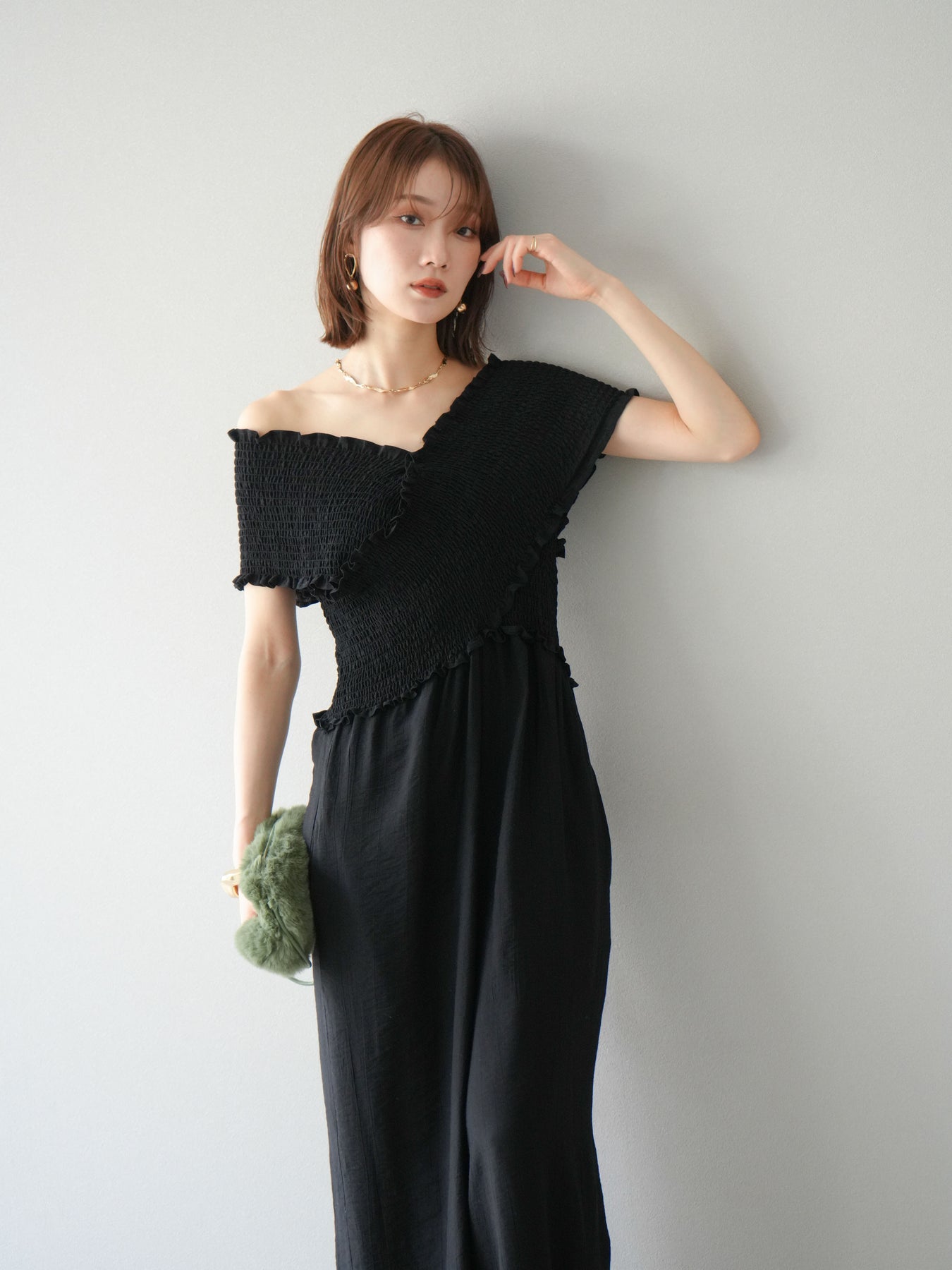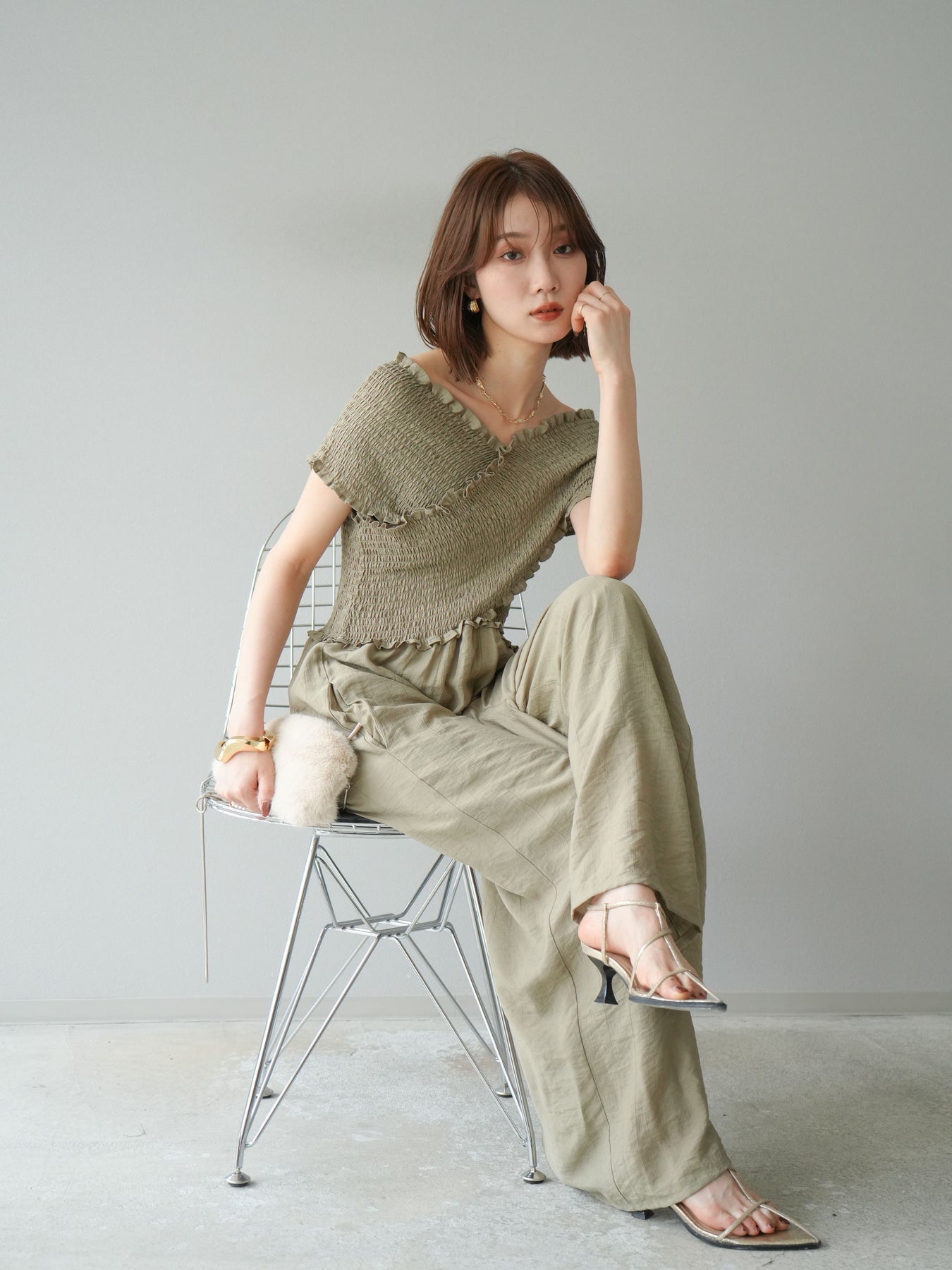 クロス状に切り替えたシャーリングデザインが目を惹くサロペット。 デコルテを美しく見せるオフショルダー風のネックラインが、女性らしさを引き立てます。 ボリューム感のあるパンツシルエットで、リラックス感と華やかさを両立。 一枚で着映えする存在感のあるデザインで、夏のお出かけシーンにもおすすめのアイテムです。