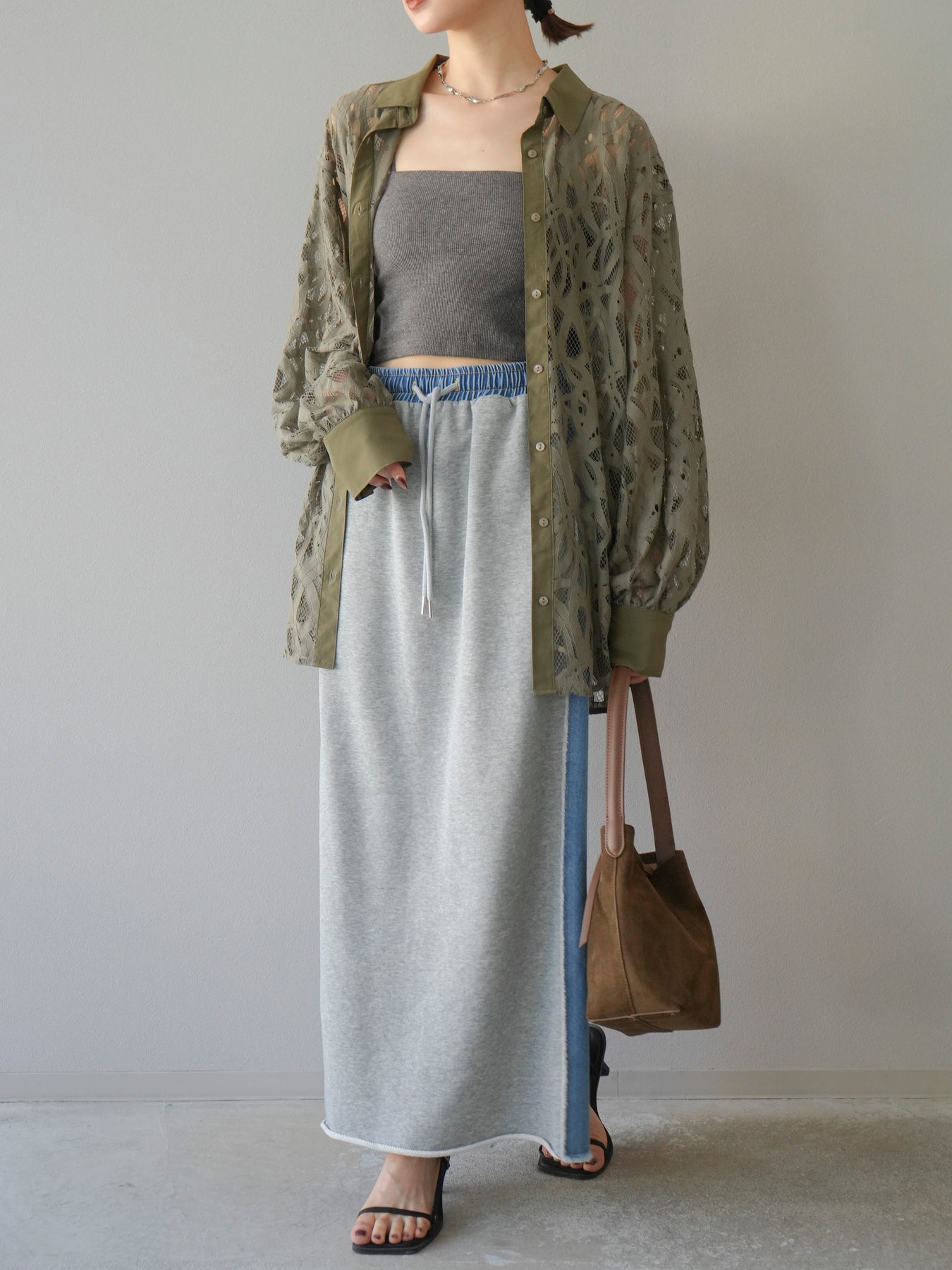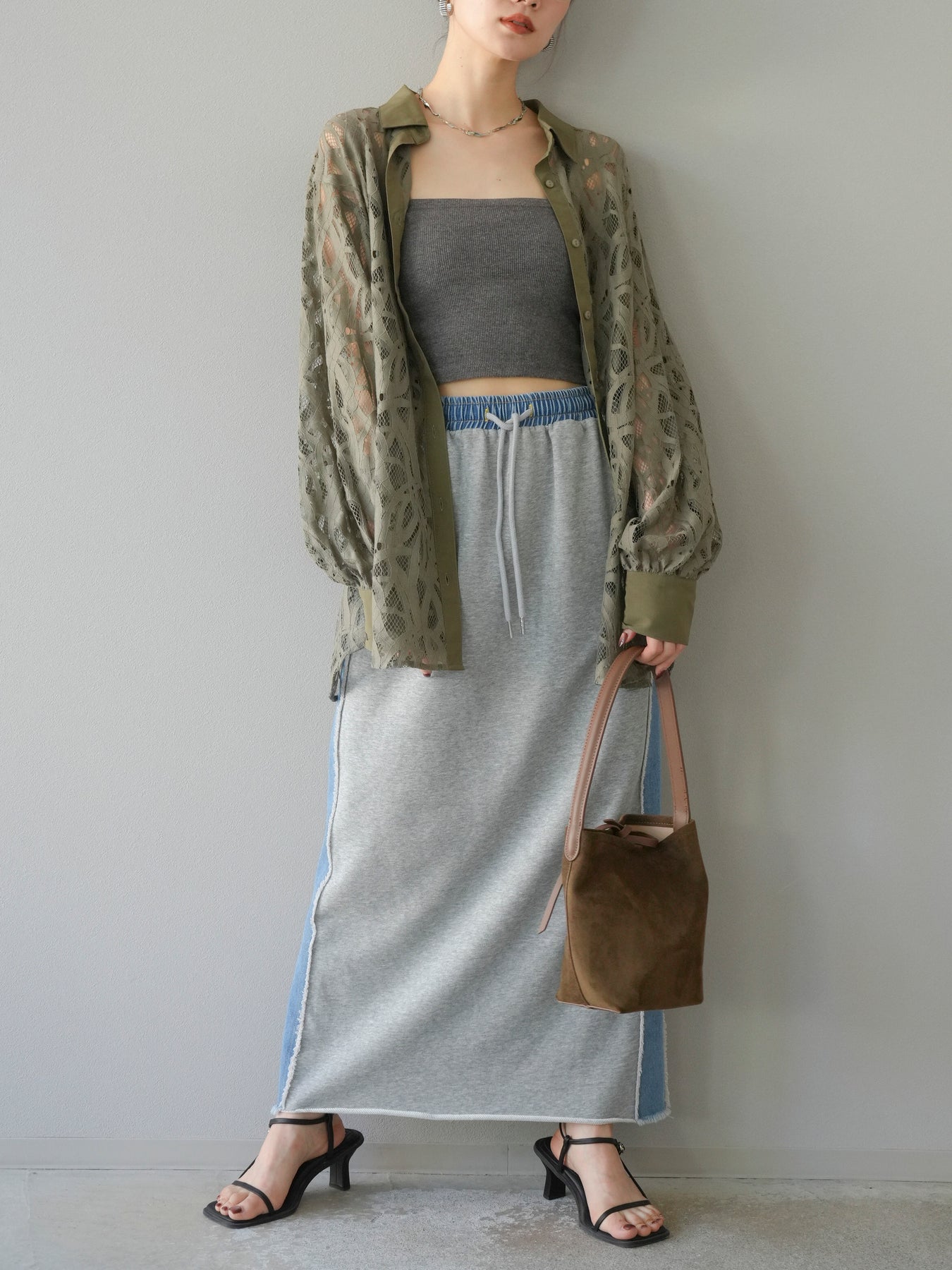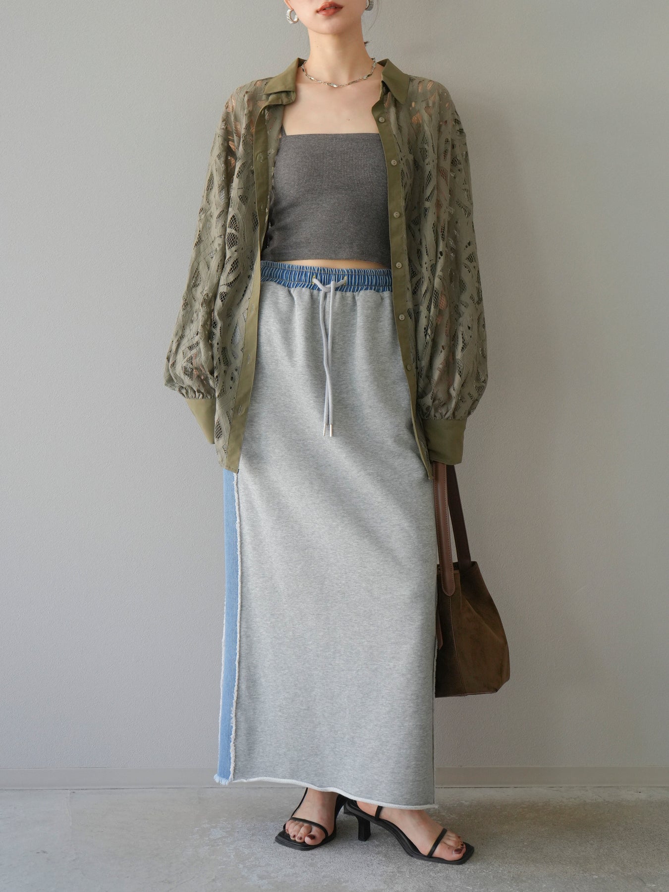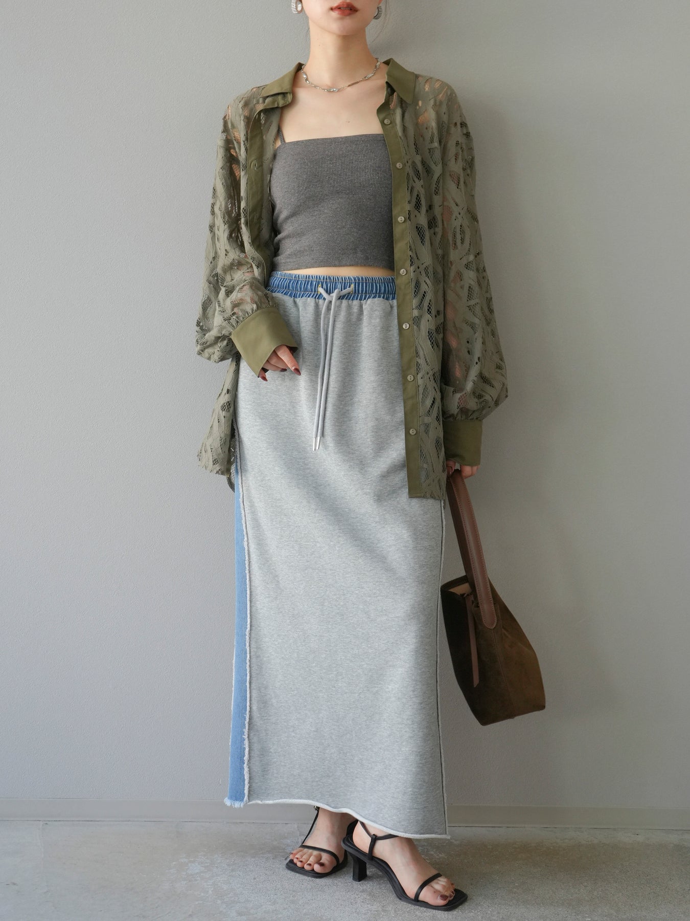 [SET]コードレースオーバーシャツ+デニムドッキングスウェットスカート(2set)
