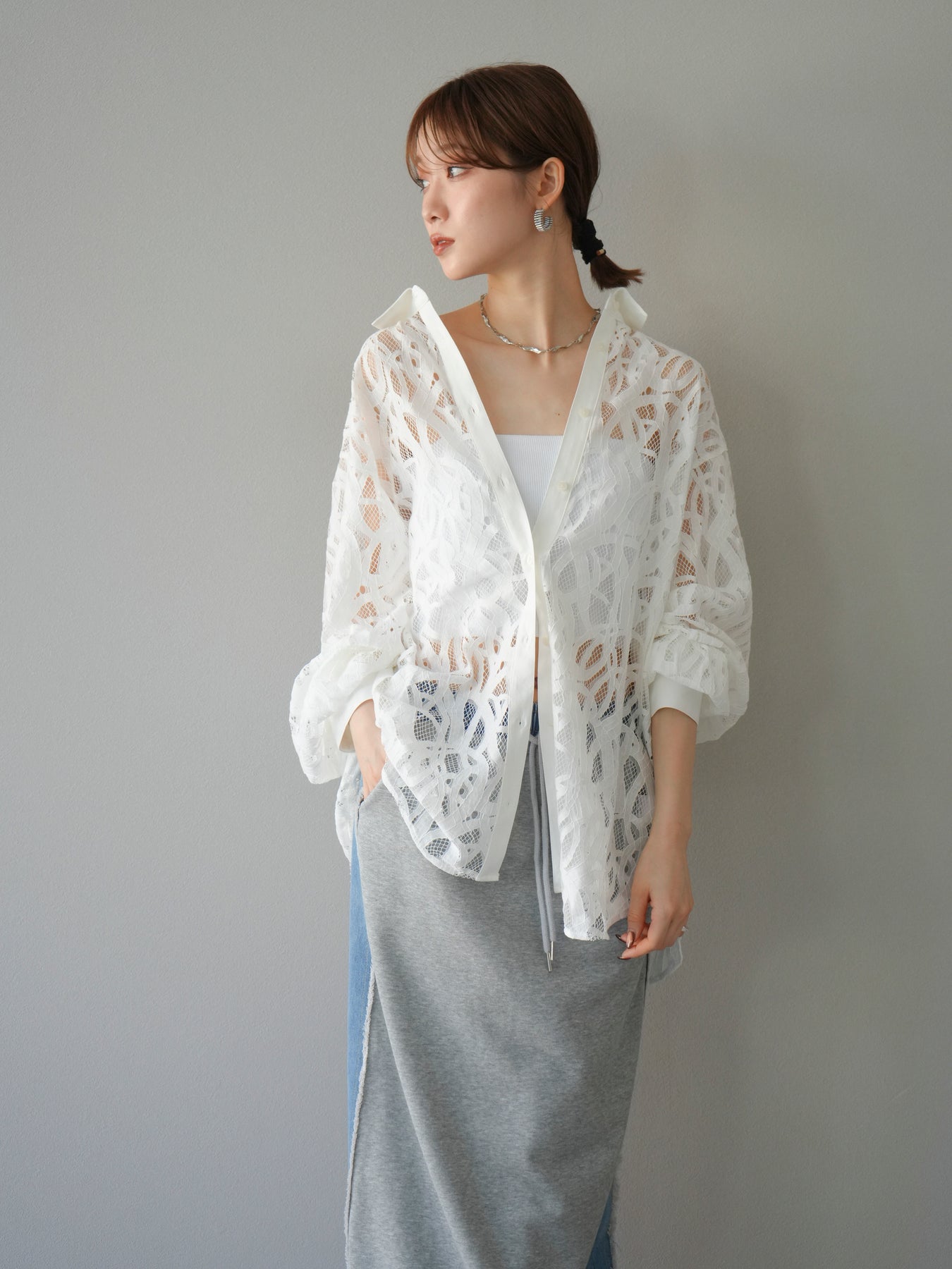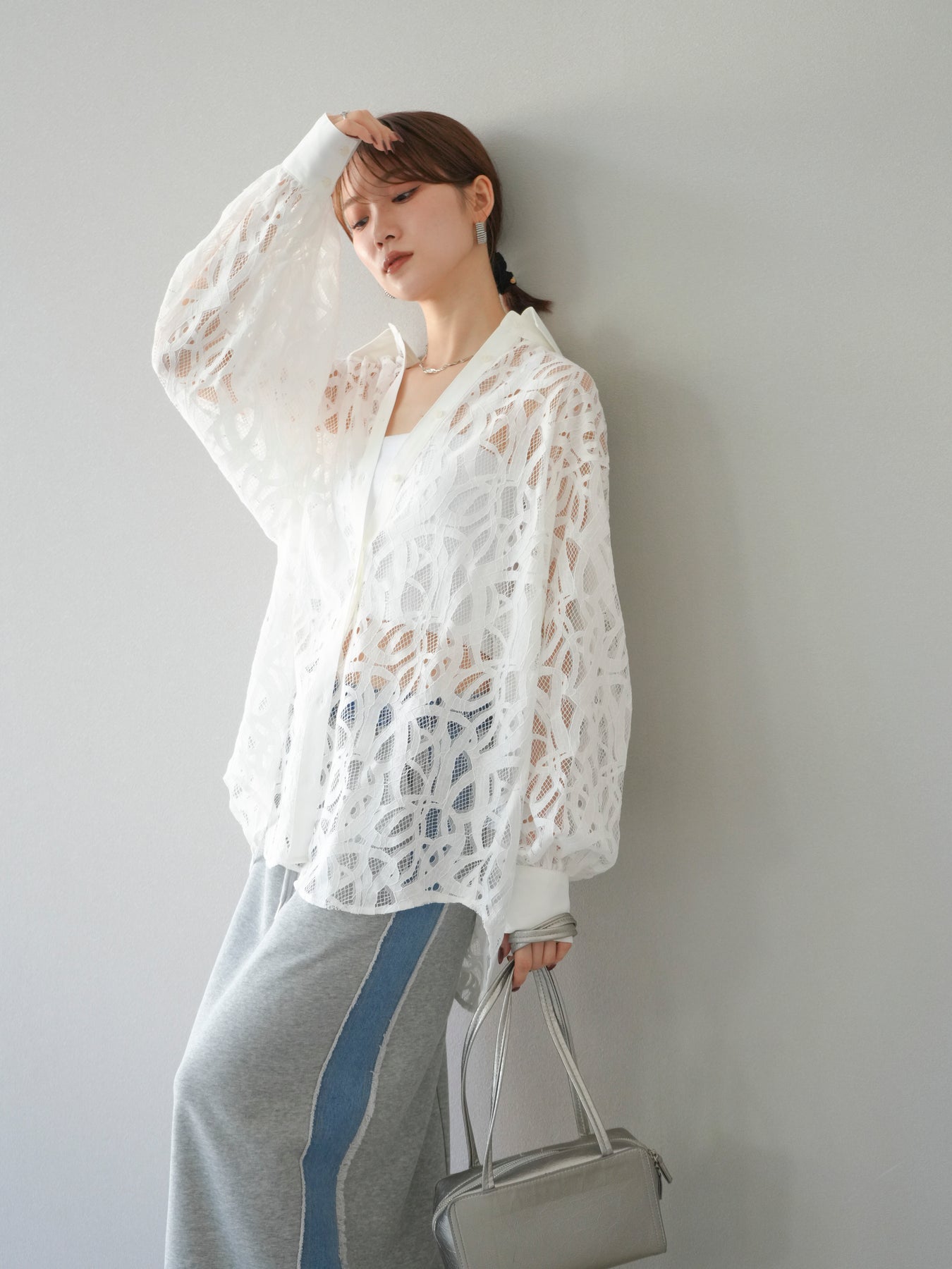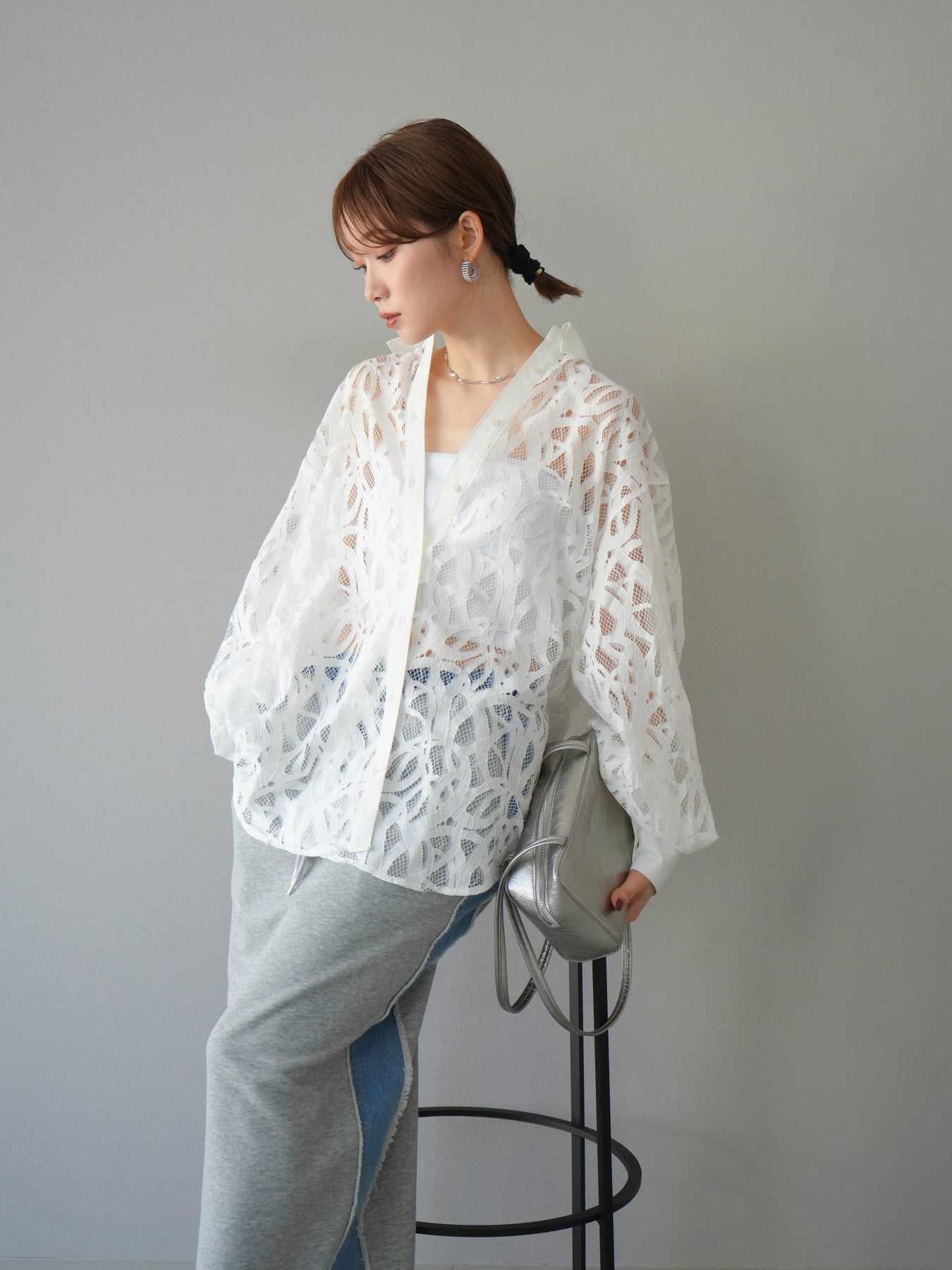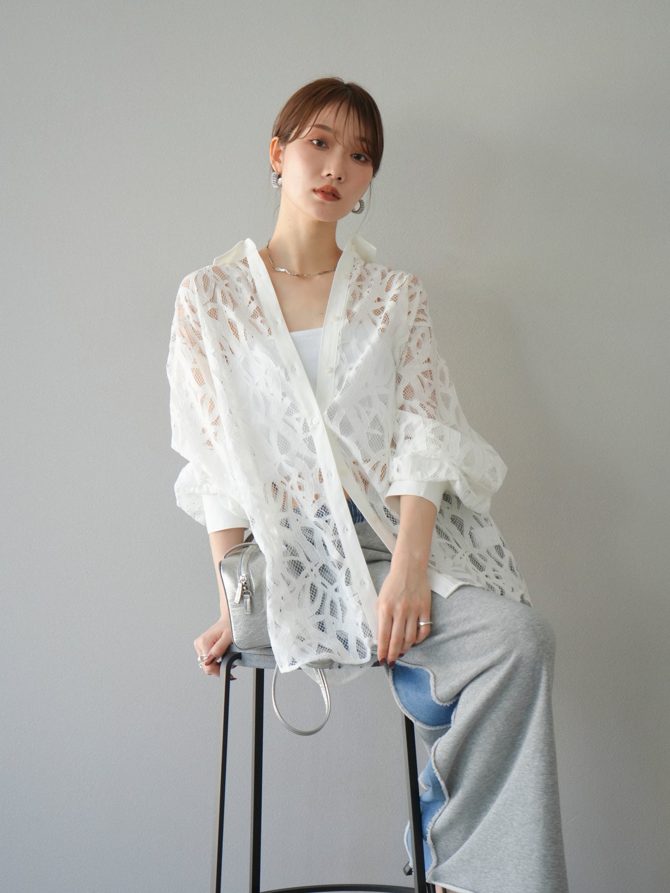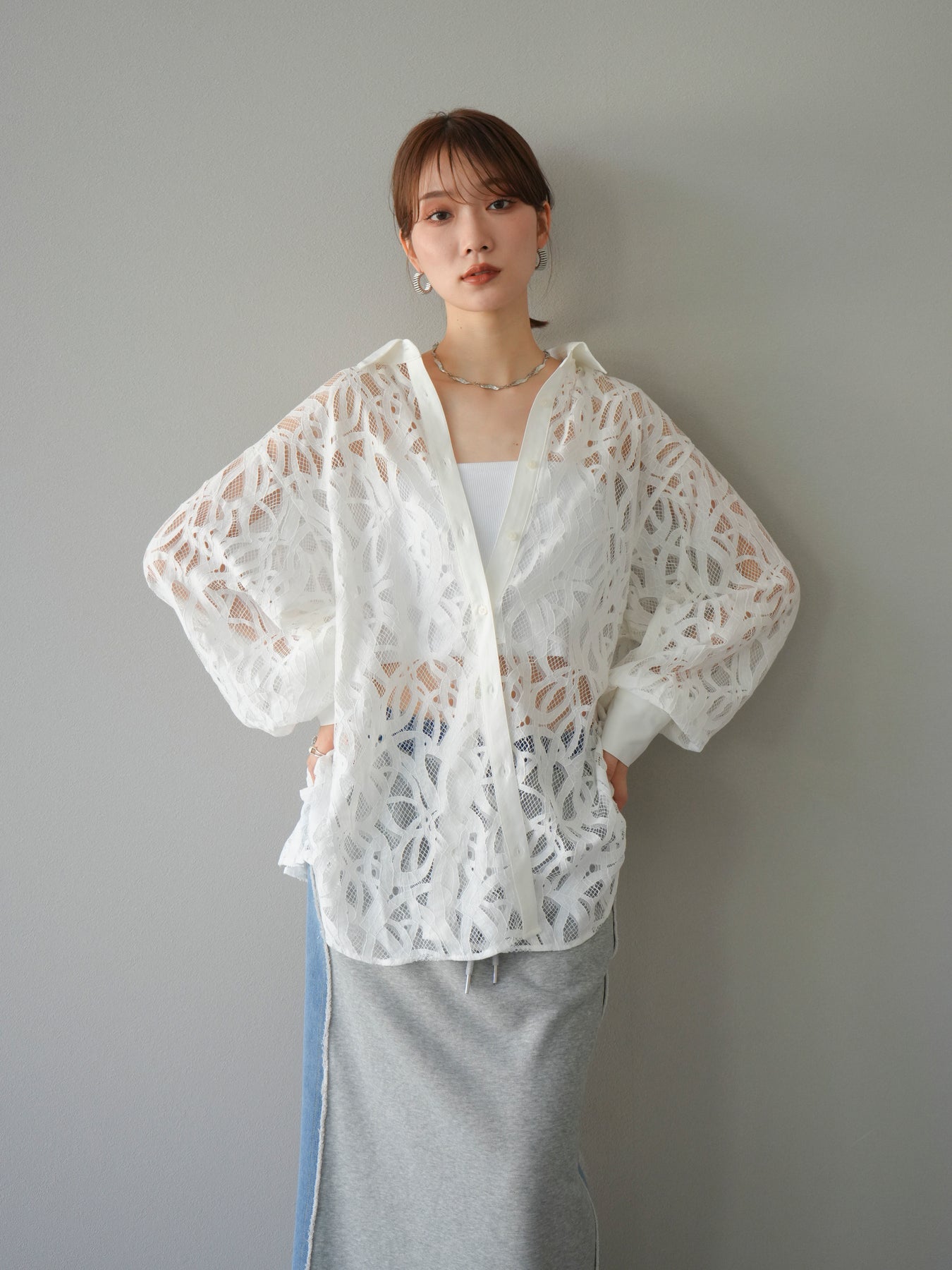 コードレースの立体感と透け感が美しく、羽織るだけで華やかさをプラスできる一枚。ゆったりとしたオーバーサイズシルエットで、抜け感のあるスタイリングが完成します。襟・袖口・前立て部分には布帛素材を使用し、程よいコントラストが洗練された印象に。前を閉じてトップスとしても、開けて羽織りとしても使える万能アイテムです。デイリーからお出かけシーンまで幅広く活躍する、レイヤードにもぴったりなレースシャツ。 ※ボトムス、キャミソール(インナー)以外の商品は一律でインナーは付属していません。