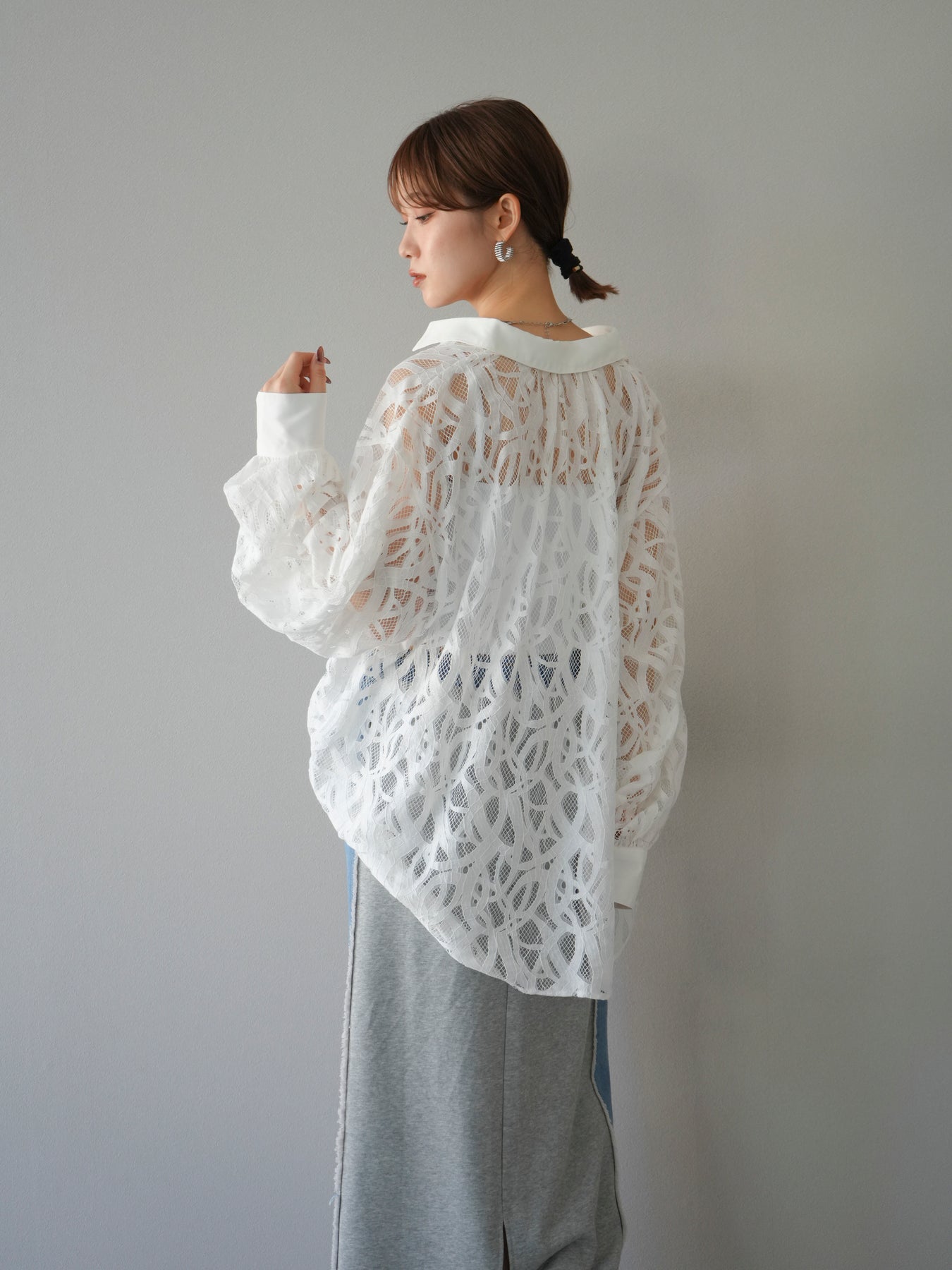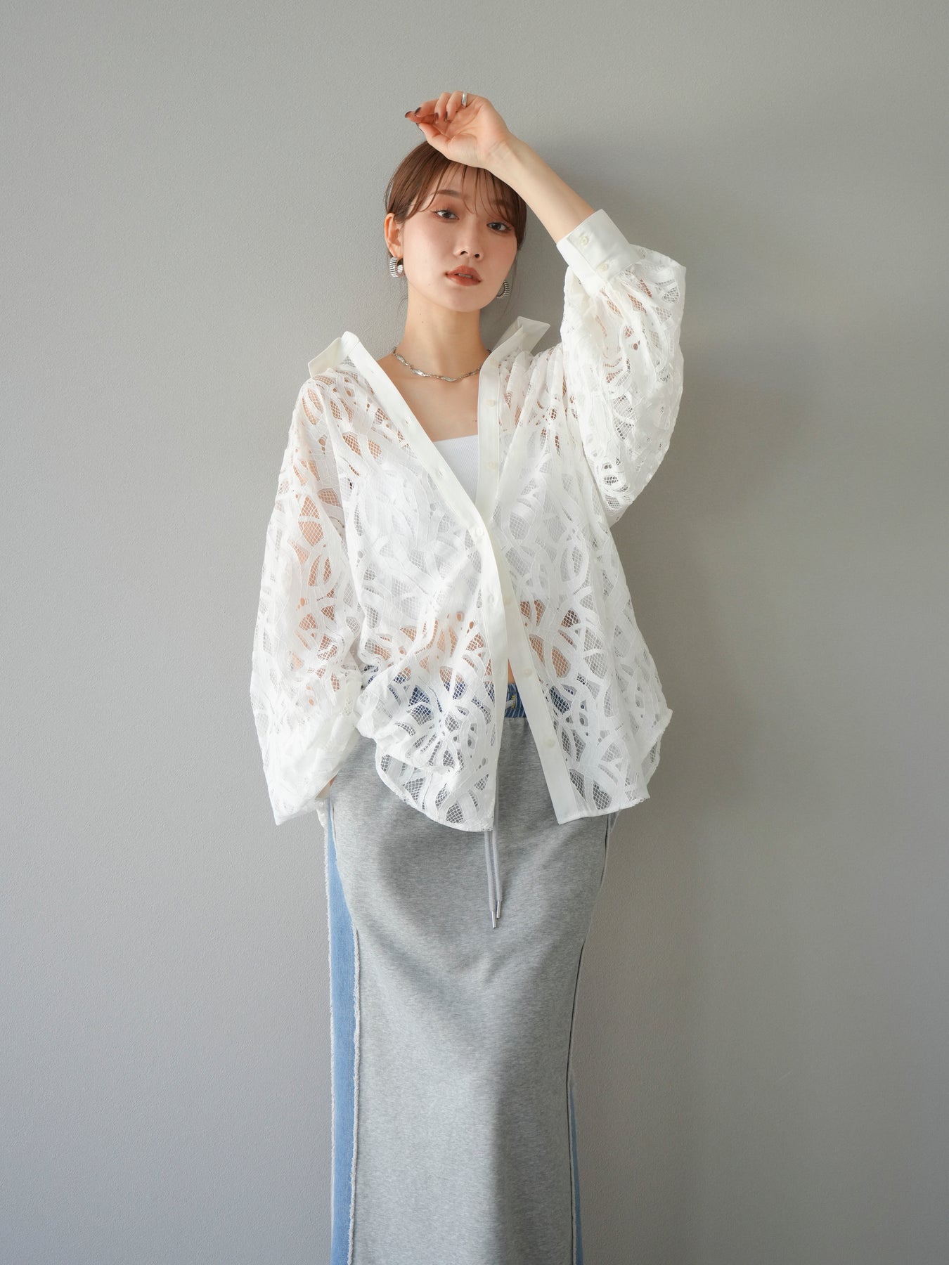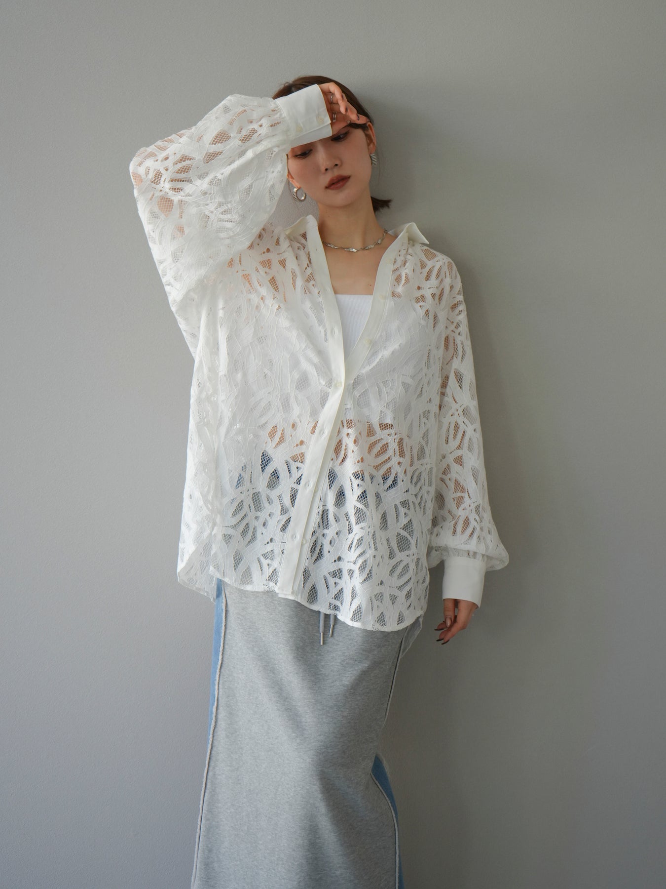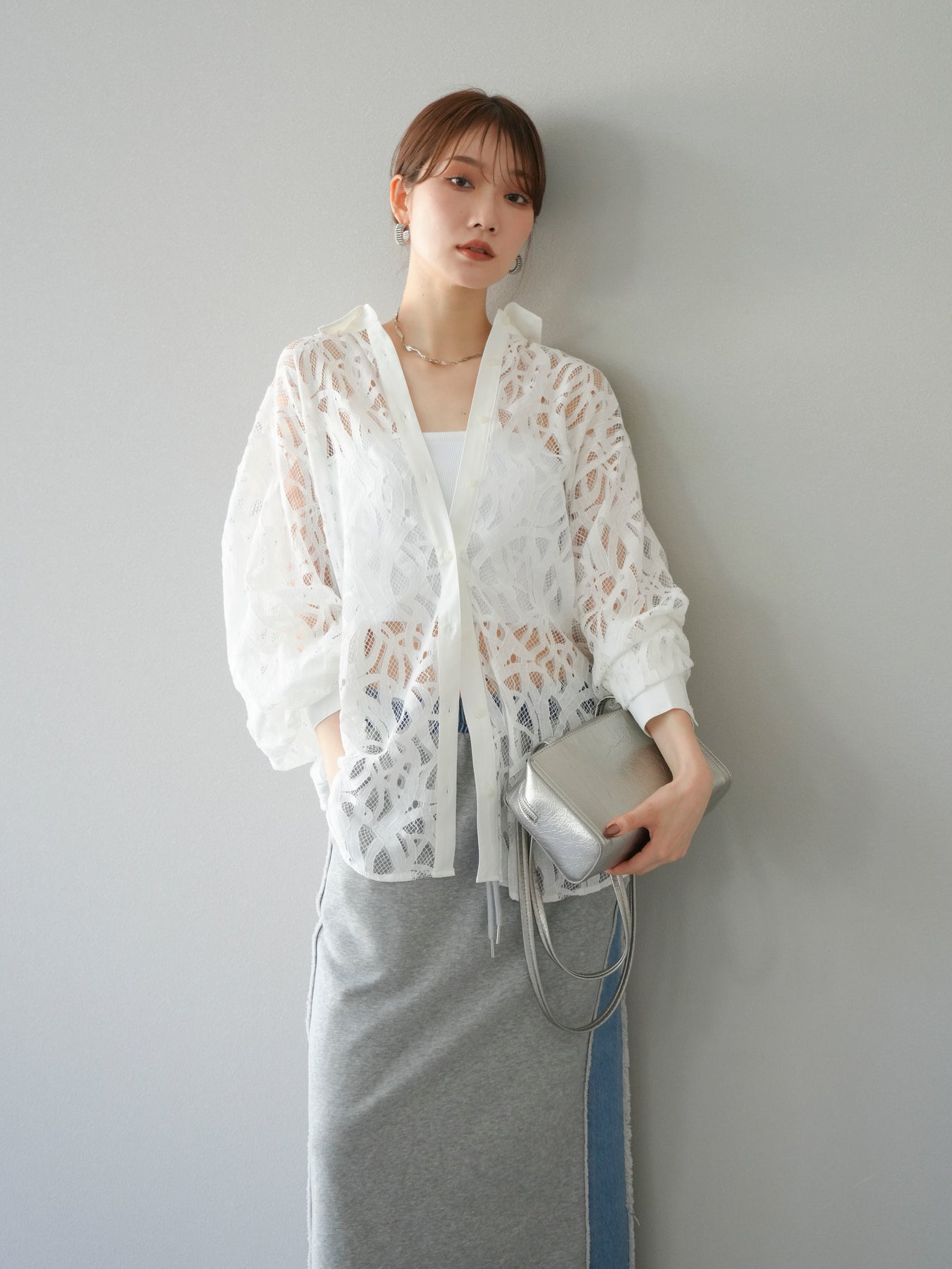 コードレースの立体感と透け感が美しく、羽織るだけで華やかさをプラスできる一枚。ゆったりとしたオーバーサイズシルエットで、抜け感のあるスタイリングが完成します。襟・袖口・前立て部分には布帛素材を使用し、程よいコントラストが洗練された印象に。前を閉じてトップスとしても、開けて羽織りとしても使える万能アイテムです。デイリーからお出かけシーンまで幅広く活躍する、レイヤードにもぴったりなレースシャツ。 ※ボトムス、キャミソール(インナー)以外の商品は一律でインナーは付属していません。