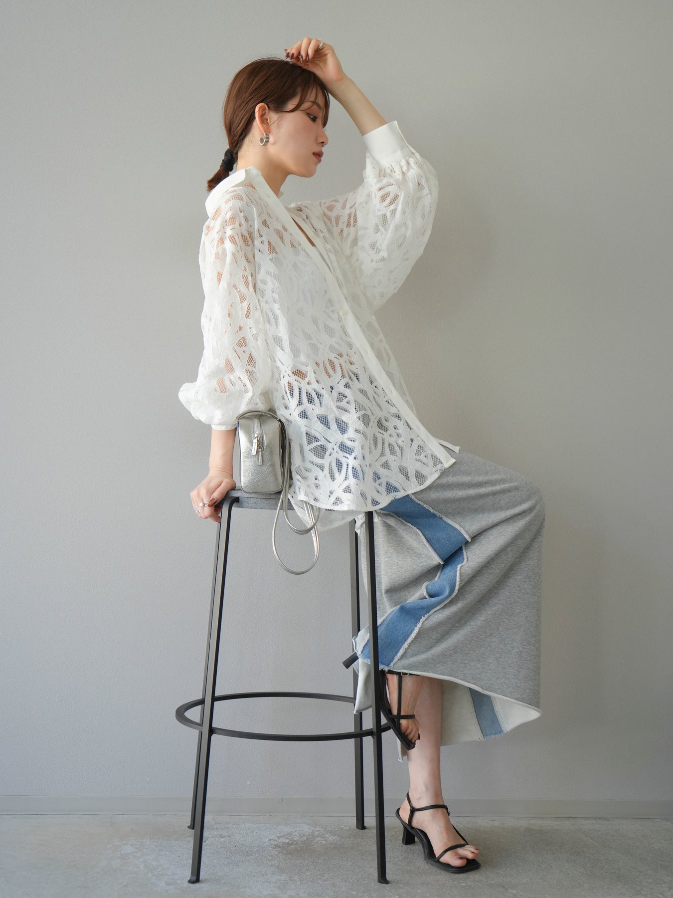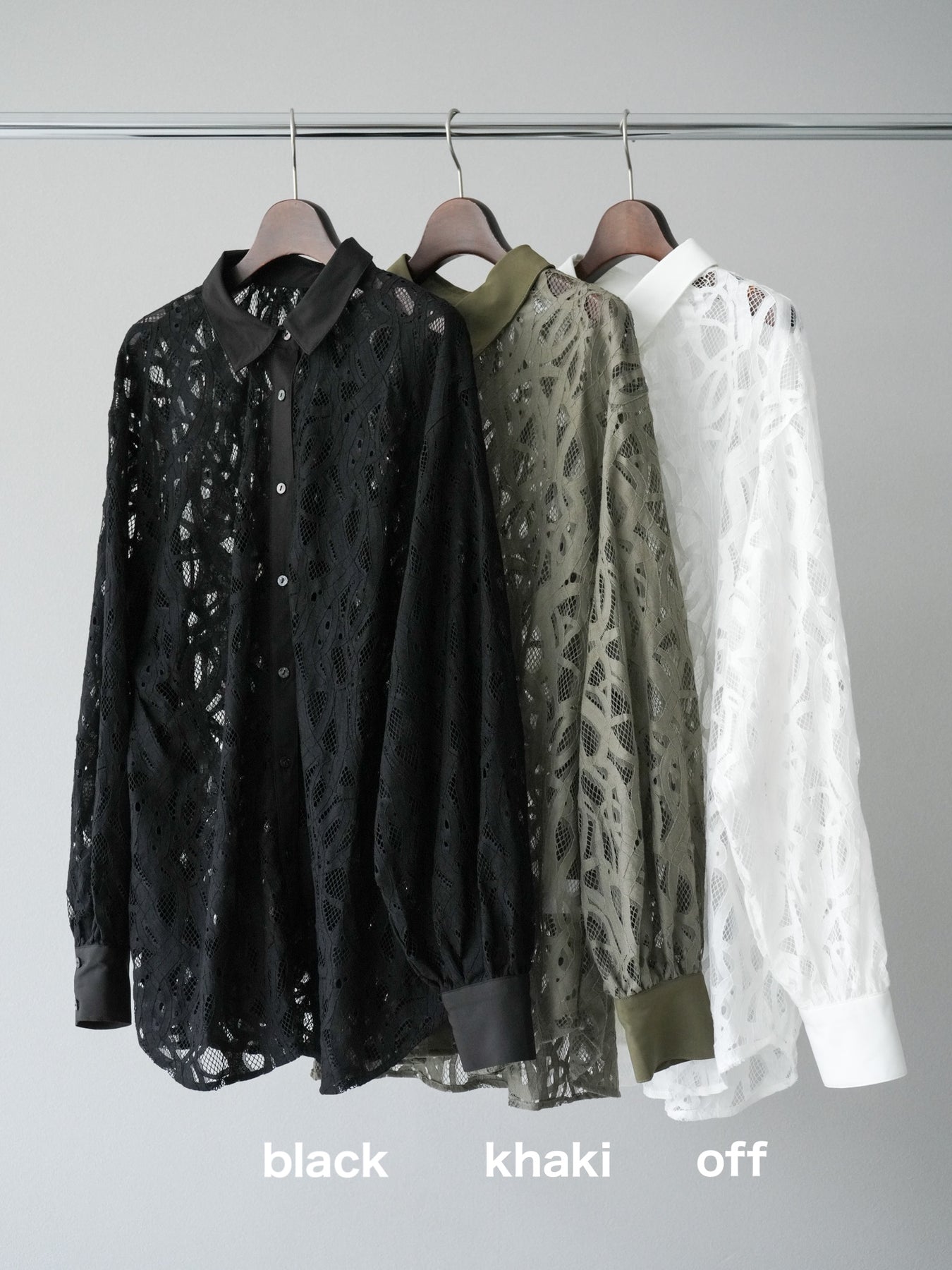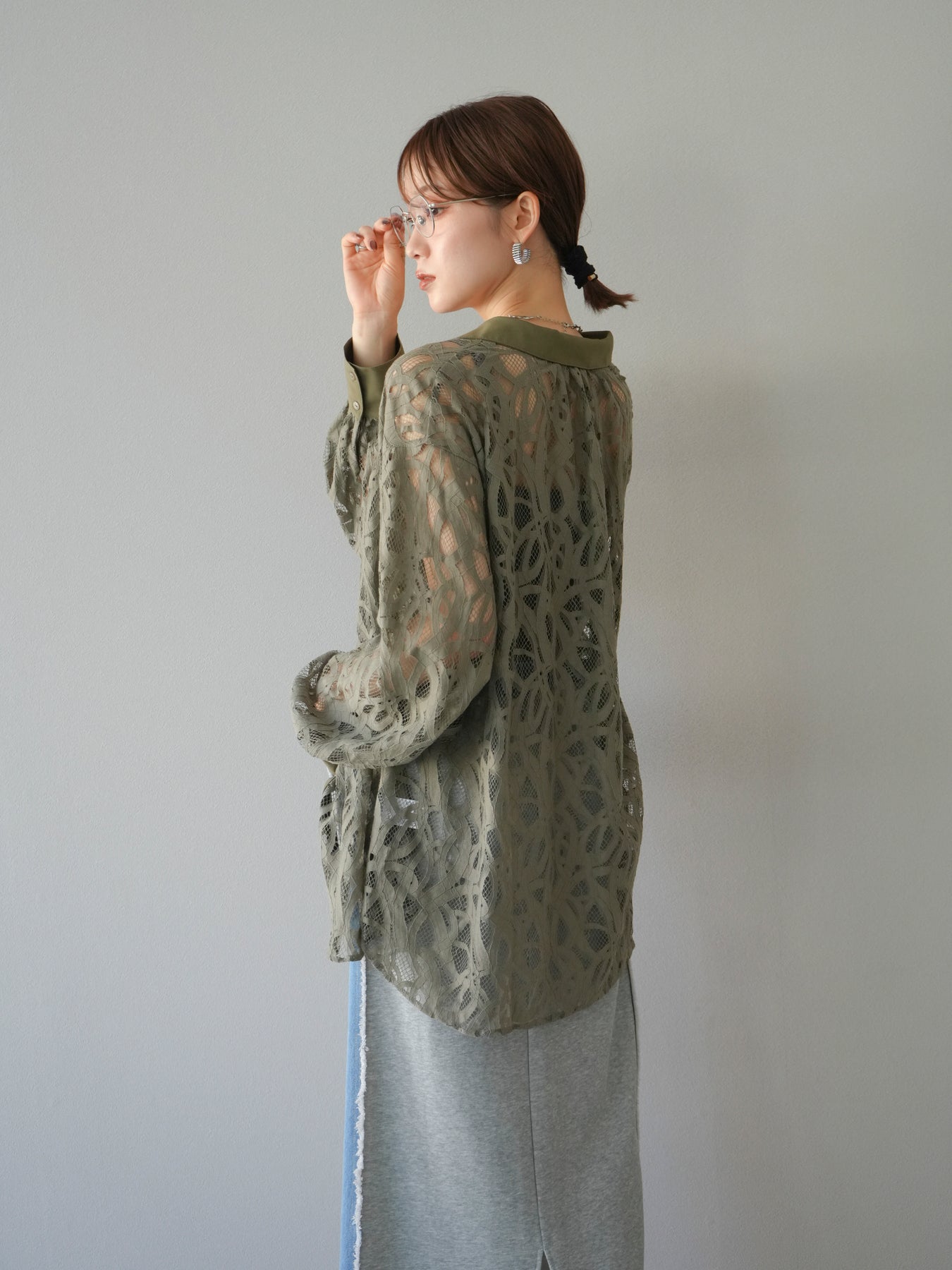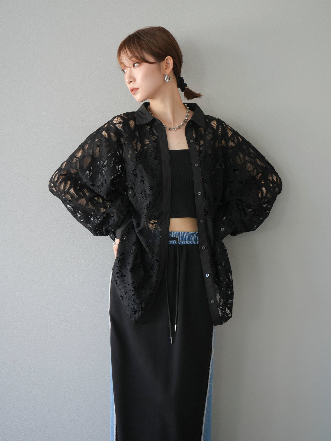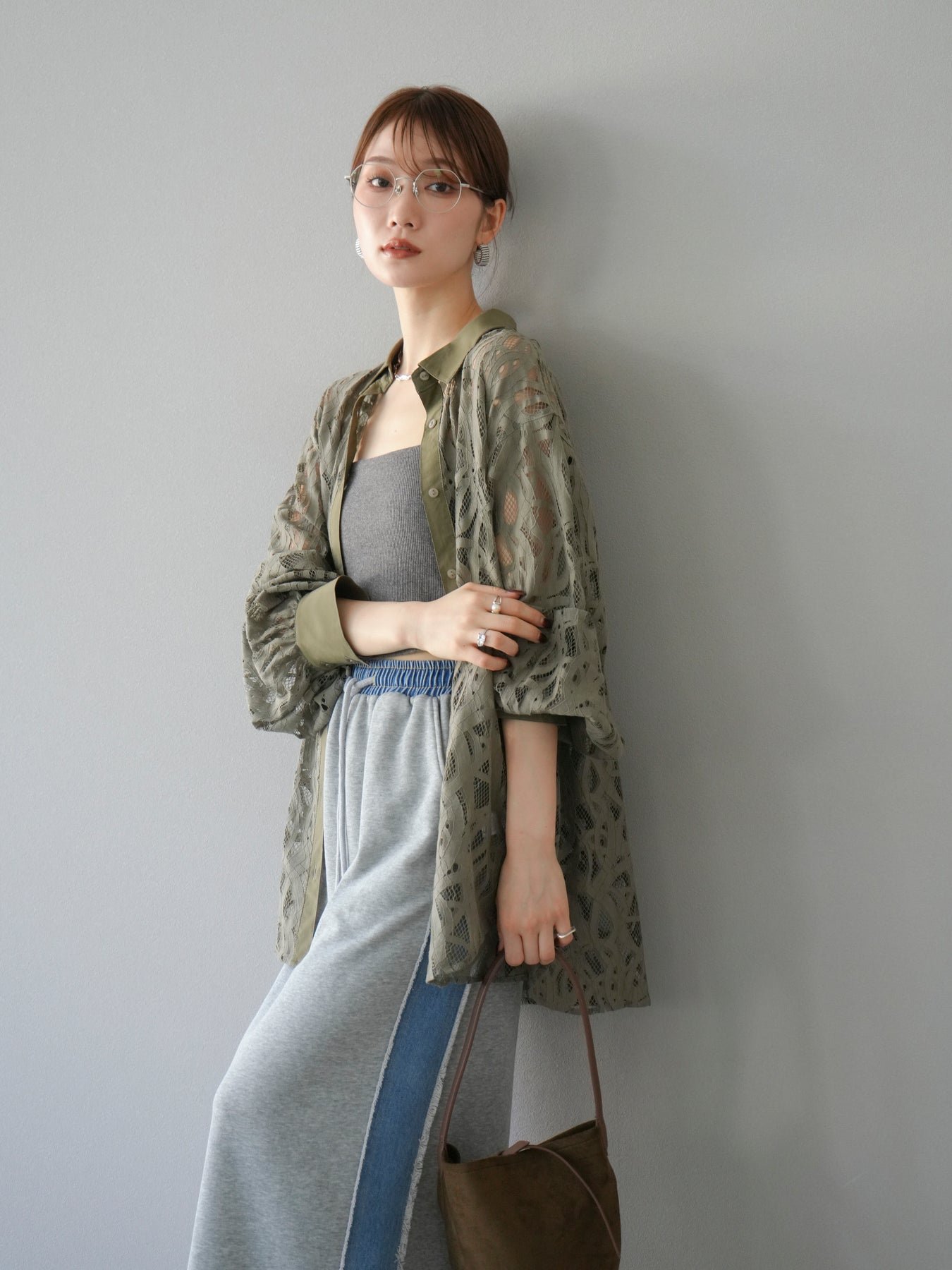 コードレースの立体感と透け感が美しく、羽織るだけで華やかさをプラスできる一枚。ゆったりとしたオーバーサイズシルエットで、抜け感のあるスタイリングが完成します。襟・袖口・前立て部分には布帛素材を使用し、程よいコントラストが洗練された印象に。前を閉じてトップスとしても、開けて羽織りとしても使える万能アイテムです。デイリーからお出かけシーンまで幅広く活躍する、レイヤードにもぴったりなレースシャツ。 ※ボトムス、キャミソール(インナー)以外の商品は一律でインナーは付属していません。