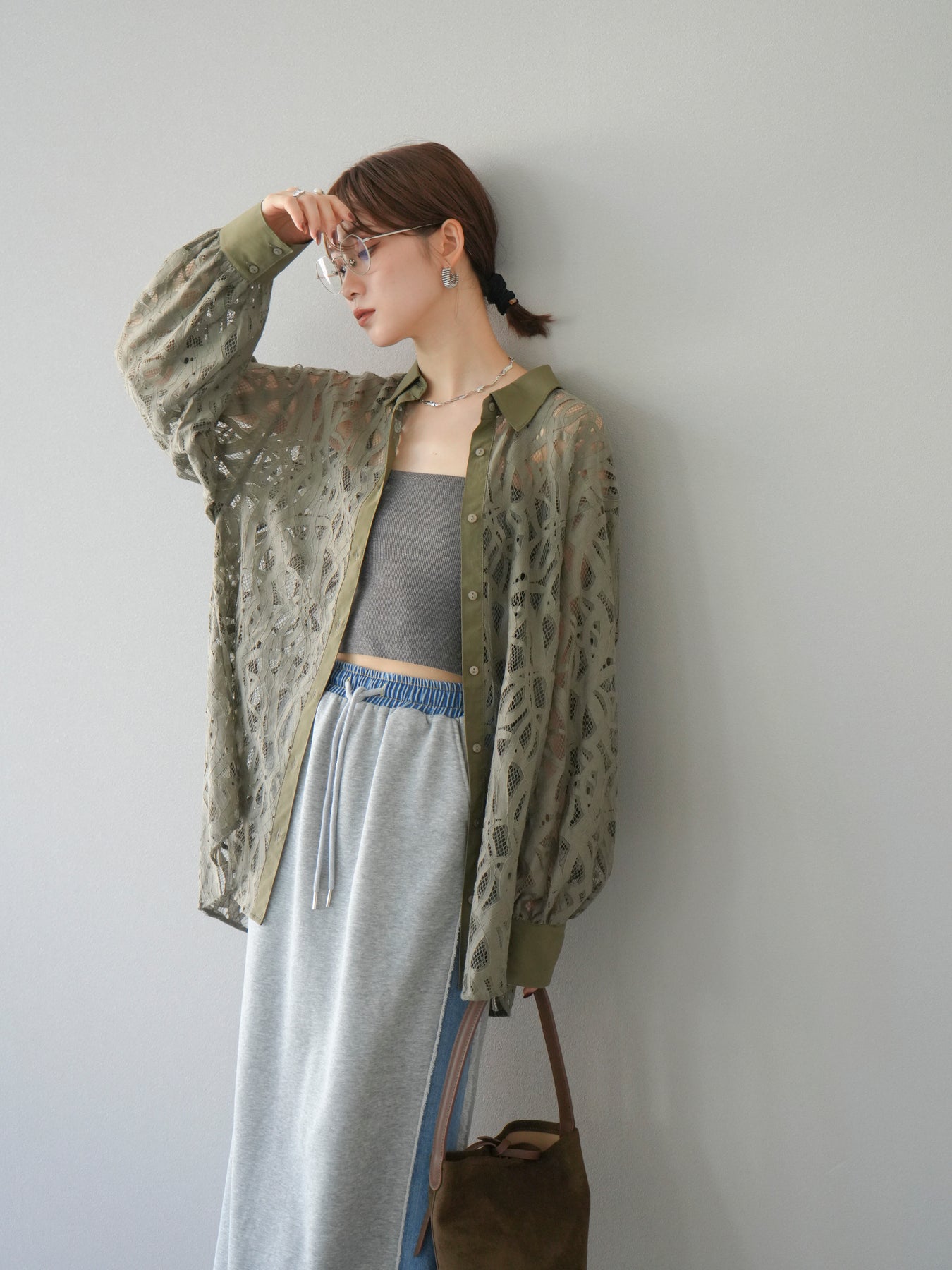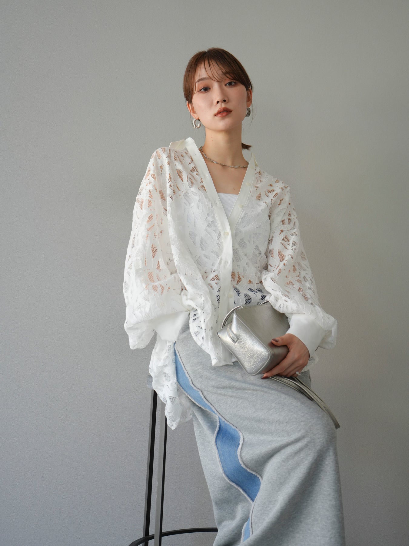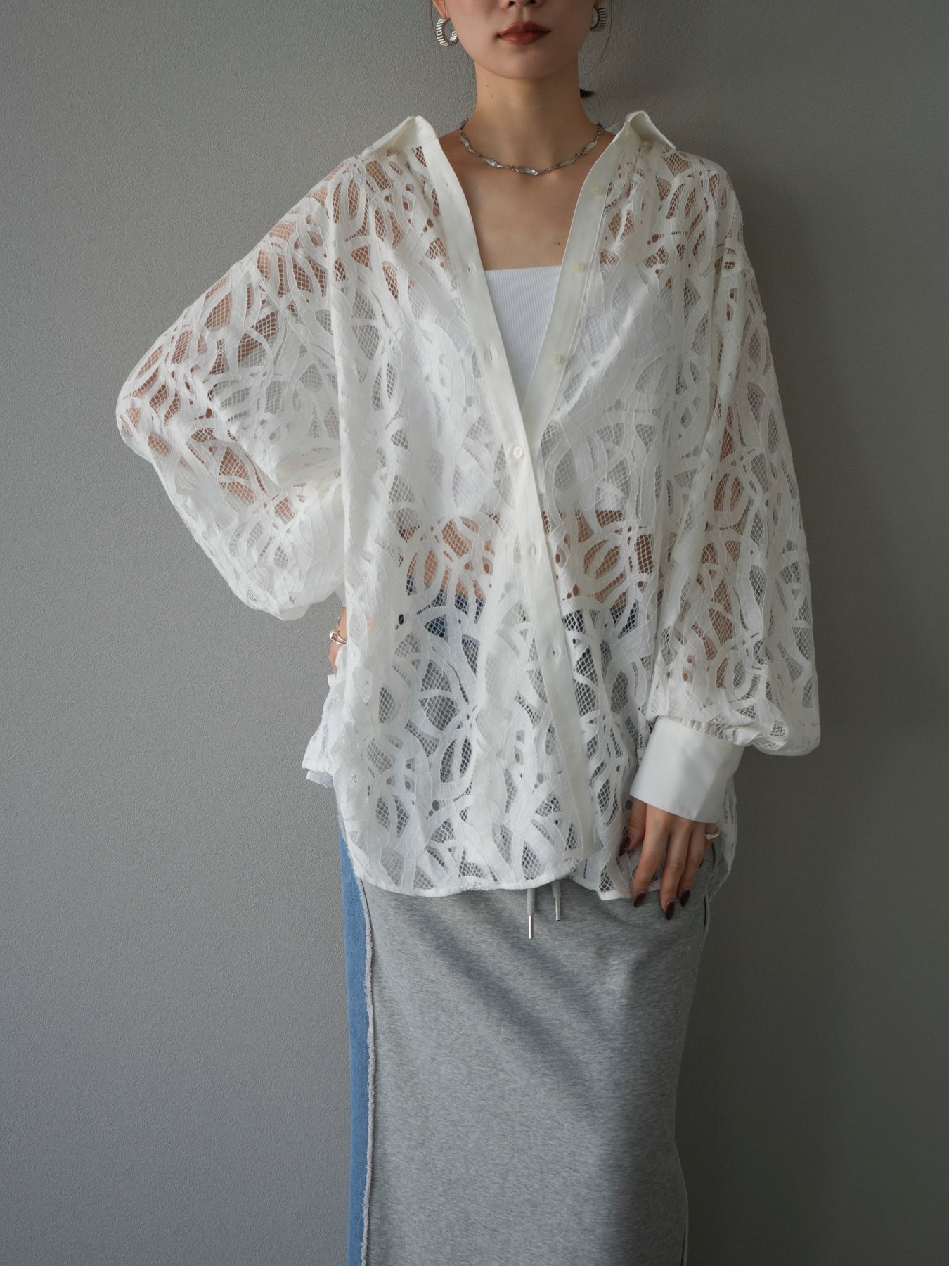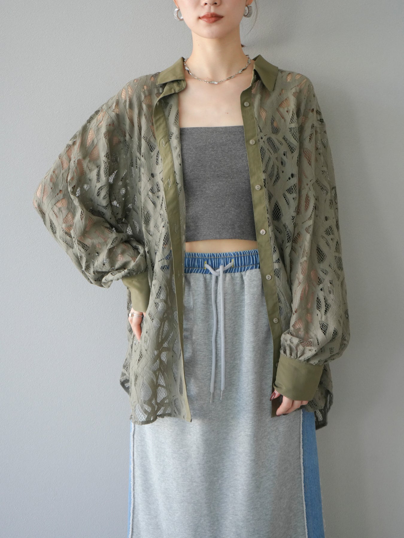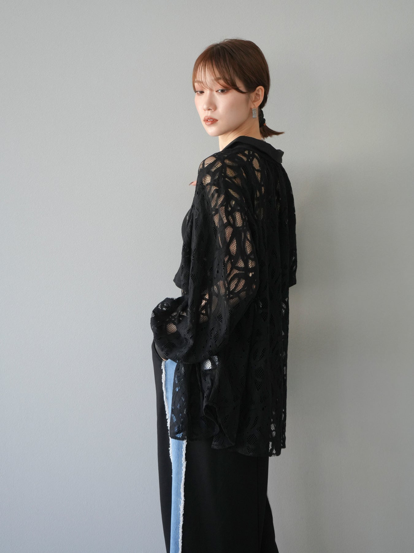 コードレースの立体感と透け感が美しく、羽織るだけで華やかさをプラスできる一枚。ゆったりとしたオーバーサイズシルエットで、抜け感のあるスタイリングが完成します。襟・袖口・前立て部分には布帛素材を使用し、程よいコントラストが洗練された印象に。前を閉じてトップスとしても、開けて羽織りとしても使える万能アイテムです。デイリーからお出かけシーンまで幅広く活躍する、レイヤードにもぴったりなレースシャツ。 ※ボトムス、キャミソール(インナー)以外の商品は一律でインナーは付属していません。