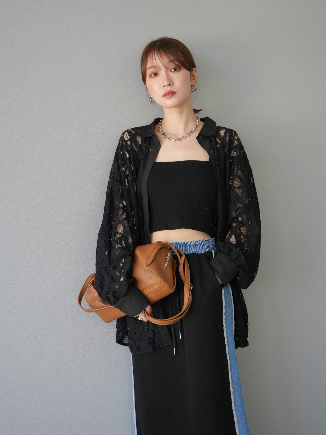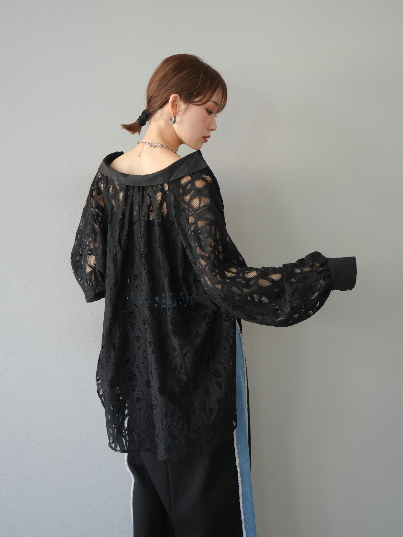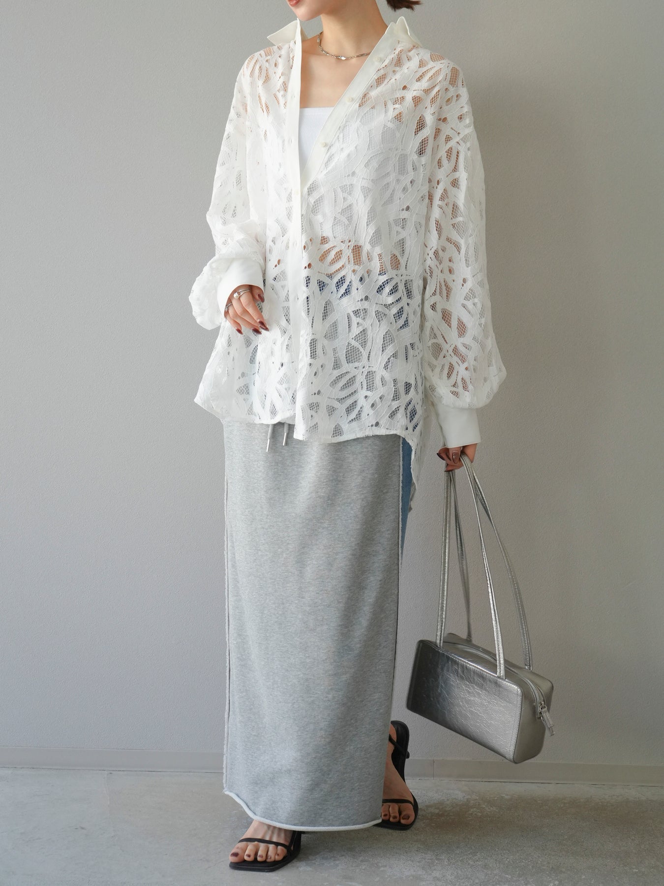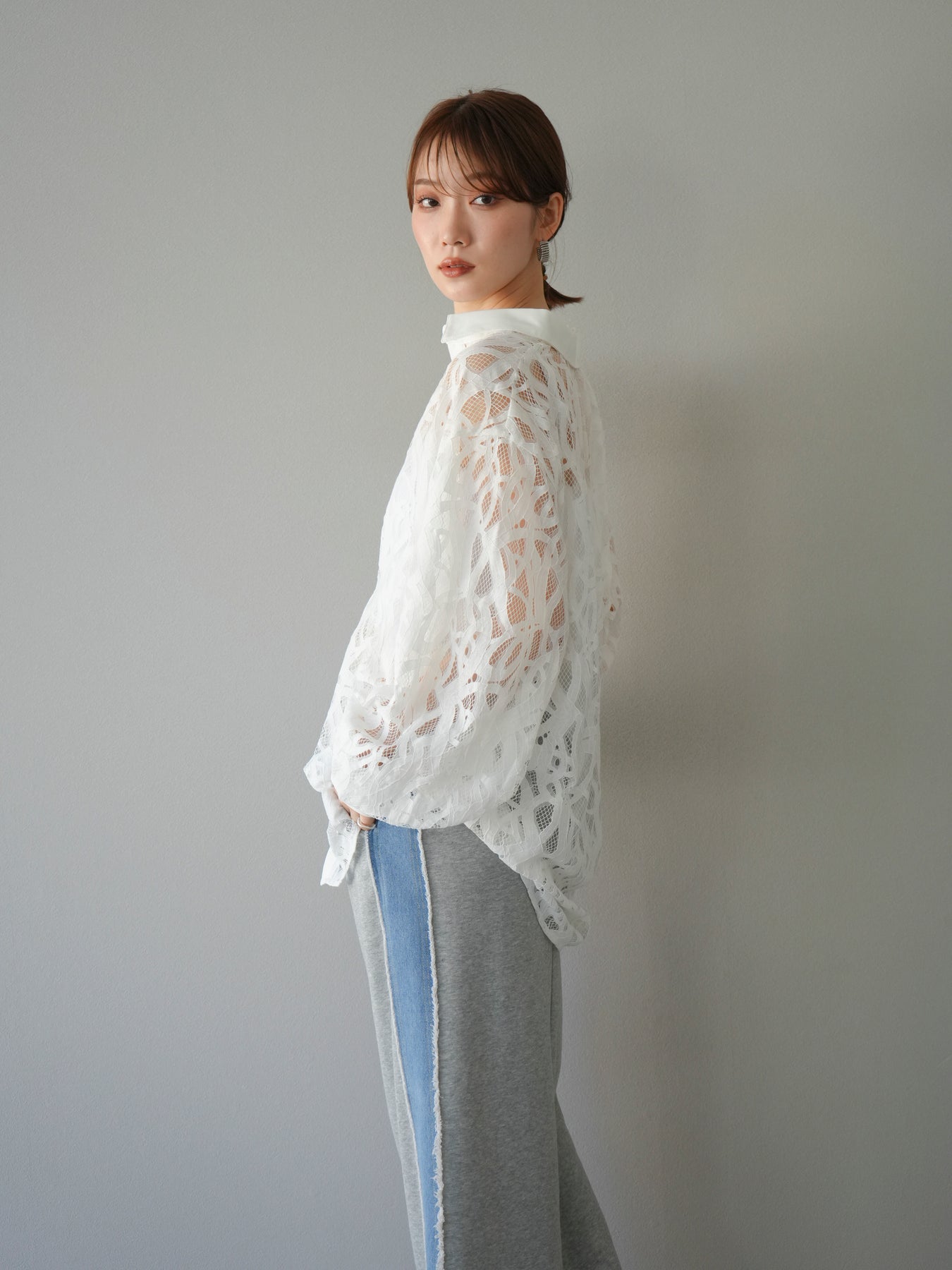 コードレースの立体感と透け感が美しく、羽織るだけで華やかさをプラスできる一枚。ゆったりとしたオーバーサイズシルエットで、抜け感のあるスタイリングが完成します。襟・袖口・前立て部分には布帛素材を使用し、程よいコントラストが洗練された印象に。前を閉じてトップスとしても、開けて羽織りとしても使える万能アイテムです。デイリーからお出かけシーンまで幅広く活躍する、レイヤードにもぴったりなレースシャツ。 ※ボトムス、キャミソール(インナー)以外の商品は一律でインナーは付属していません。