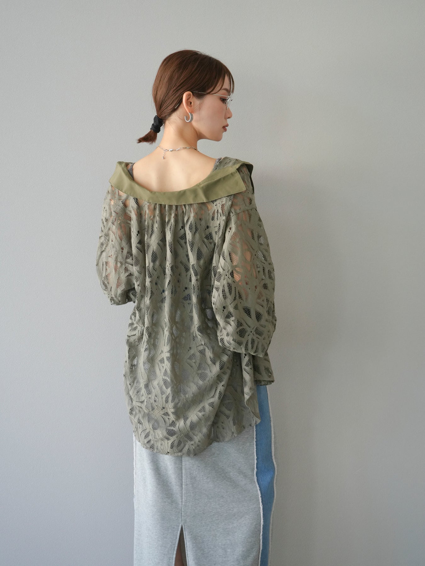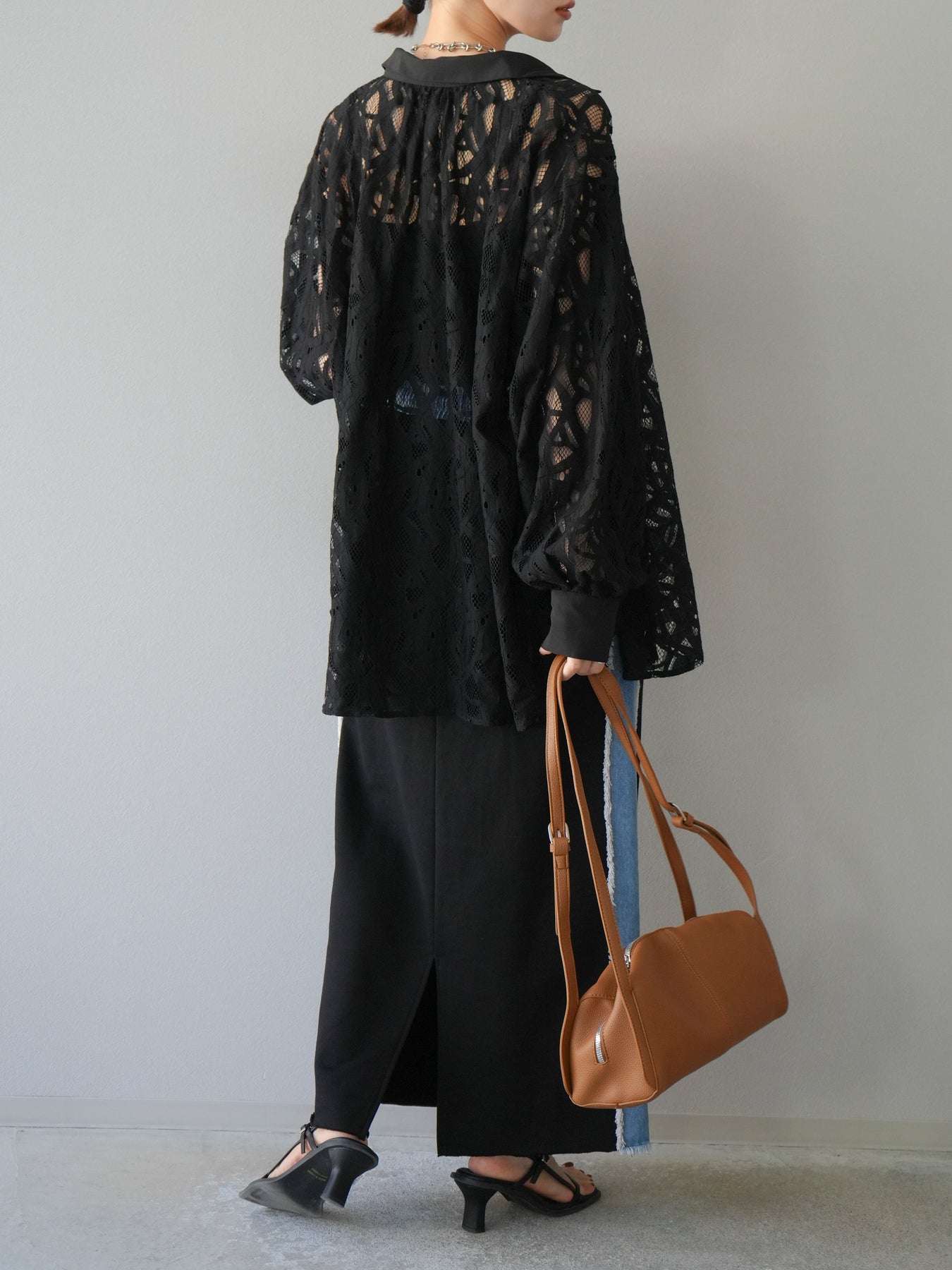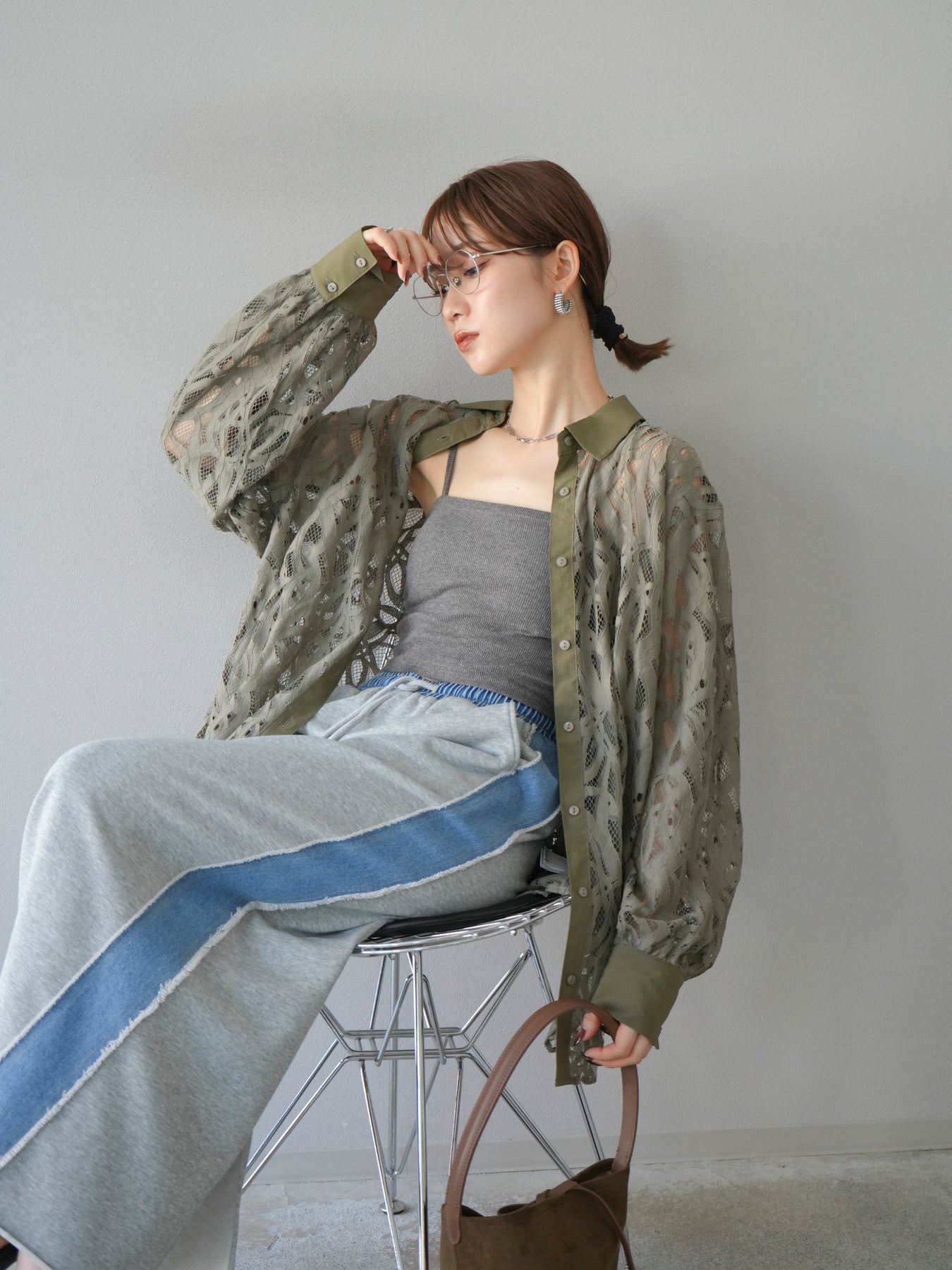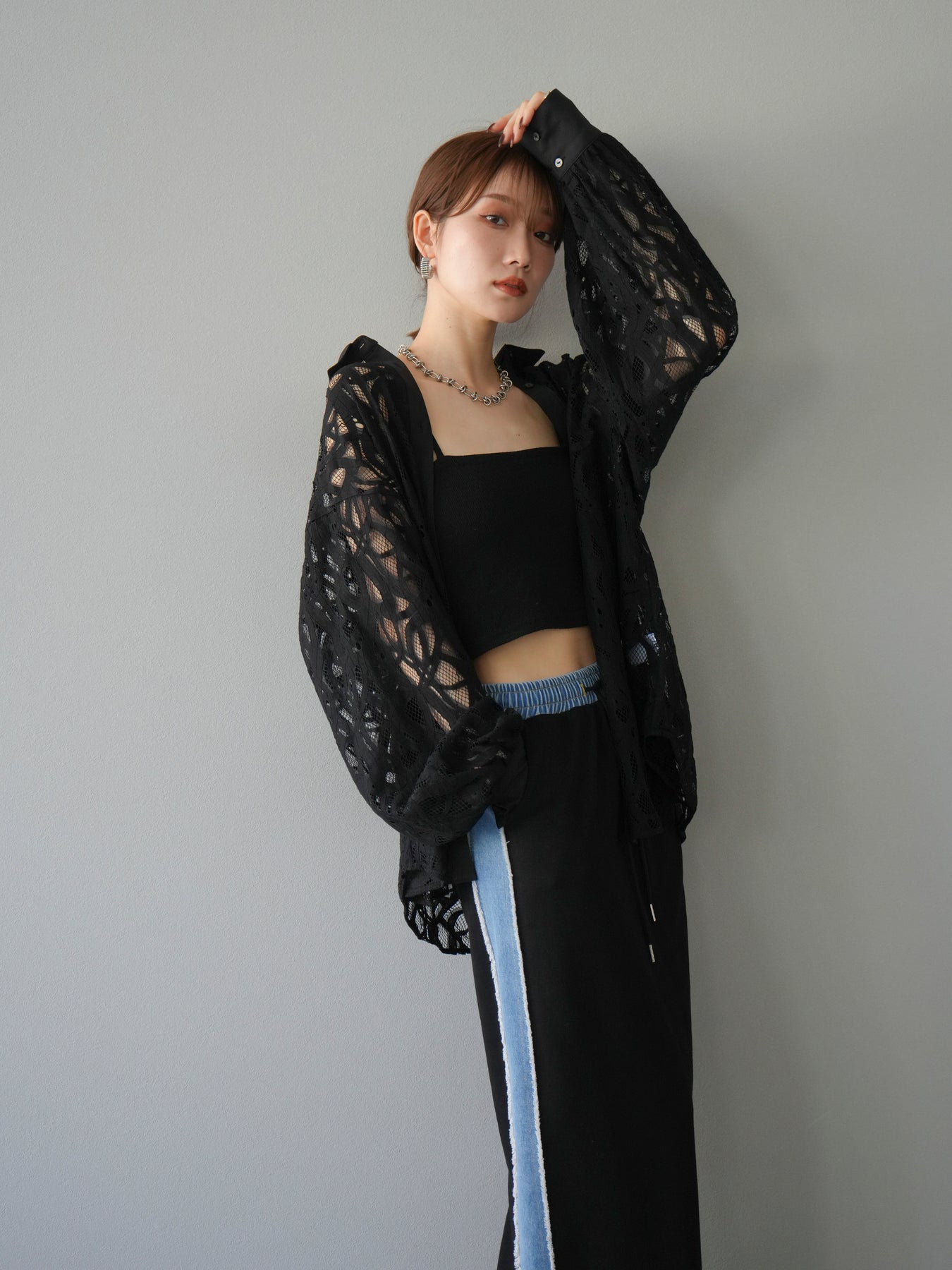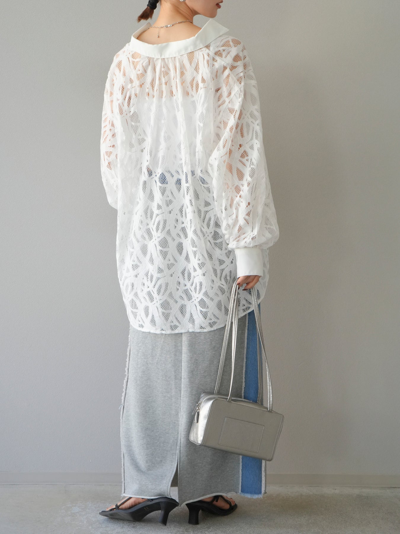 コードレースの立体感と透け感が美しく、羽織るだけで華やかさをプラスできる一枚。ゆったりとしたオーバーサイズシルエットで、抜け感のあるスタイリングが完成します。襟・袖口・前立て部分には布帛素材を使用し、程よいコントラストが洗練された印象に。前を閉じてトップスとしても、開けて羽織りとしても使える万能アイテムです。デイリーからお出かけシーンまで幅広く活躍する、レイヤードにもぴったりなレースシャツ。 ※ボトムス、キャミソール(インナー)以外の商品は一律でインナーは付属していません。