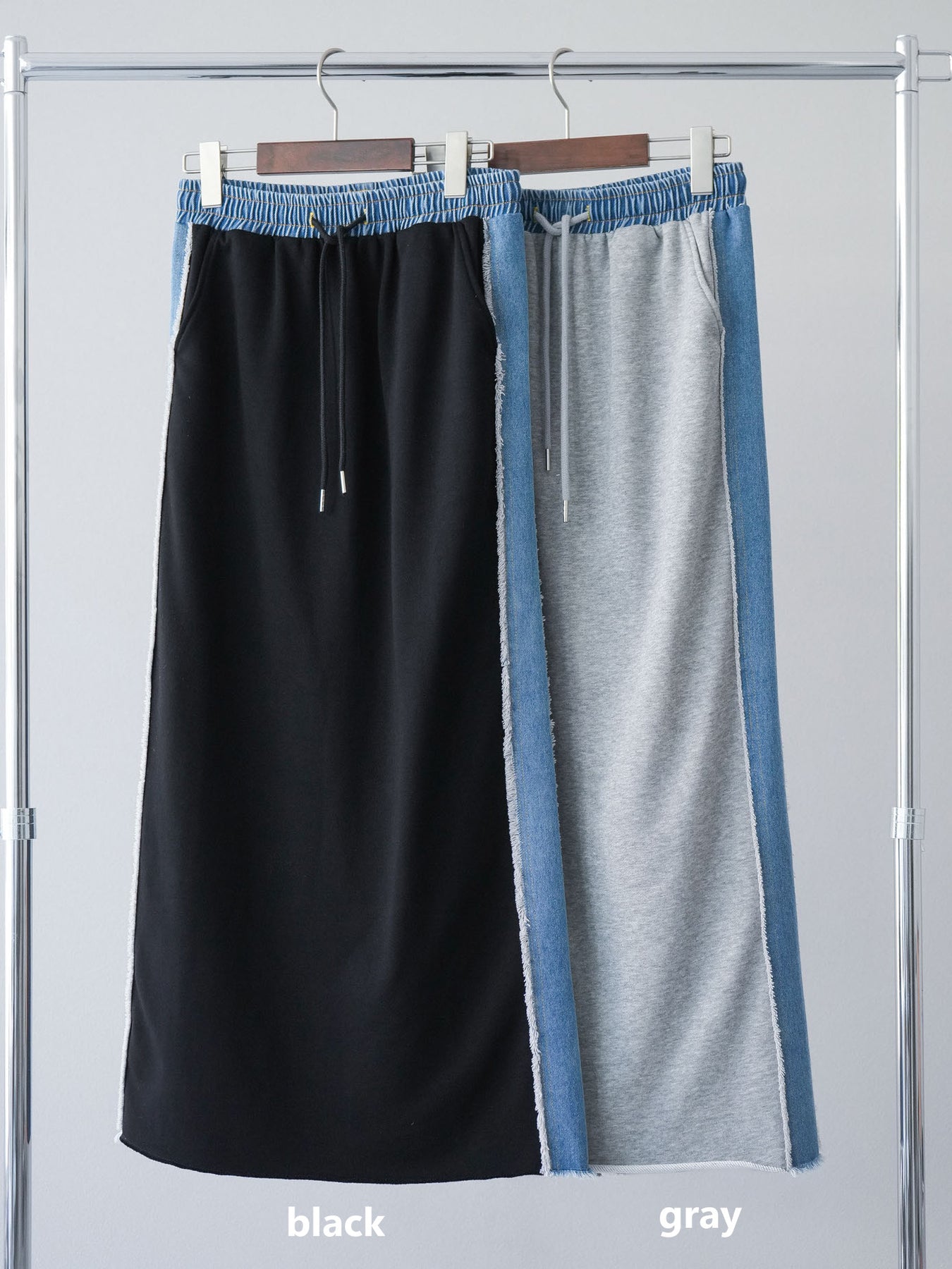 スウェット素材のリラクシーな着心地に、サイドのデニム切り替えでアクセントを加えたスカート。カジュアルな中にもすっきりとしたIラインシルエットで、大人っぽく着こなせます。ウエストはゴム仕様でストレスフリー。Tシャツやシャツを合わせたデイリーコーデにおすすめの1枚です。