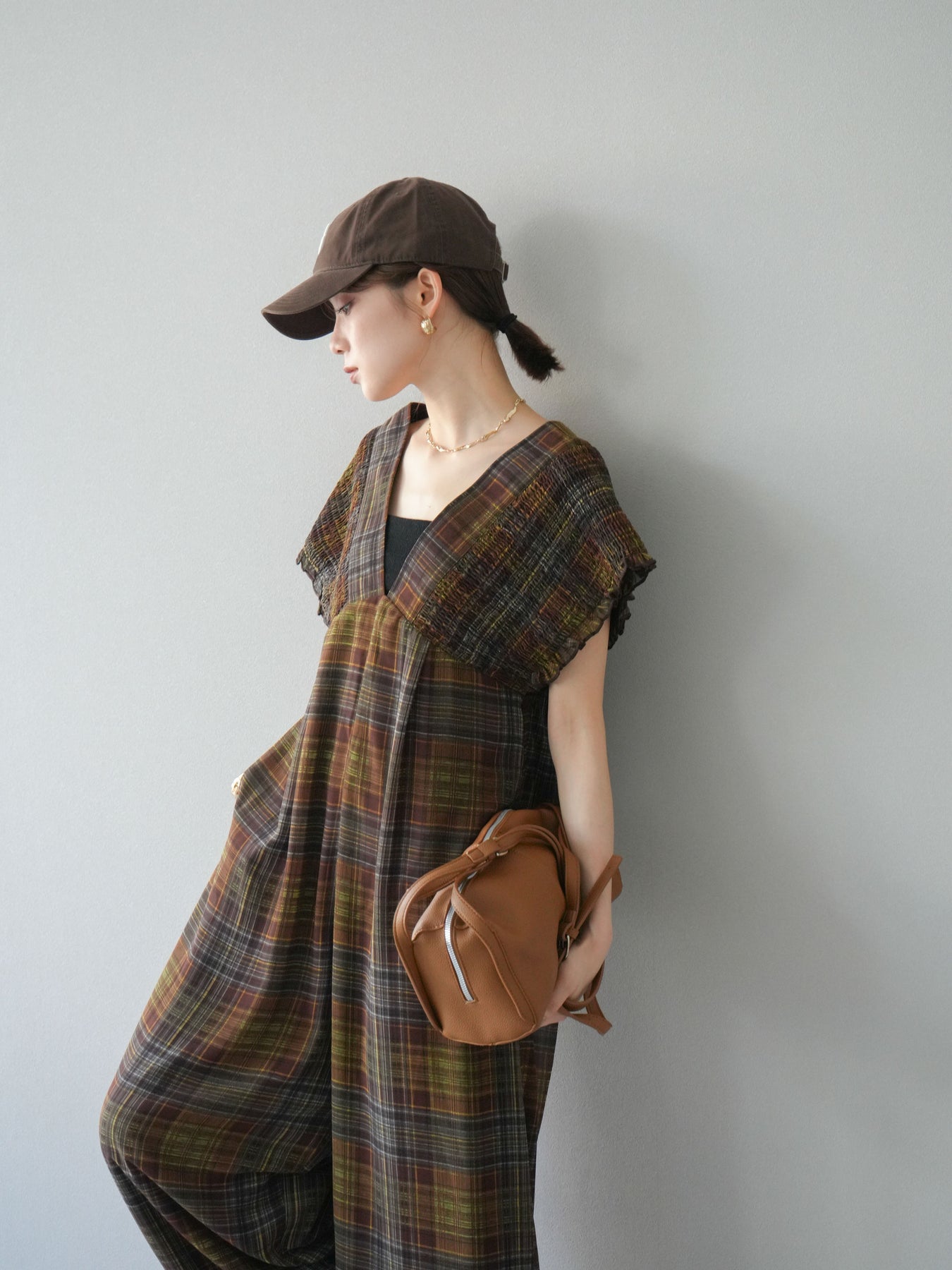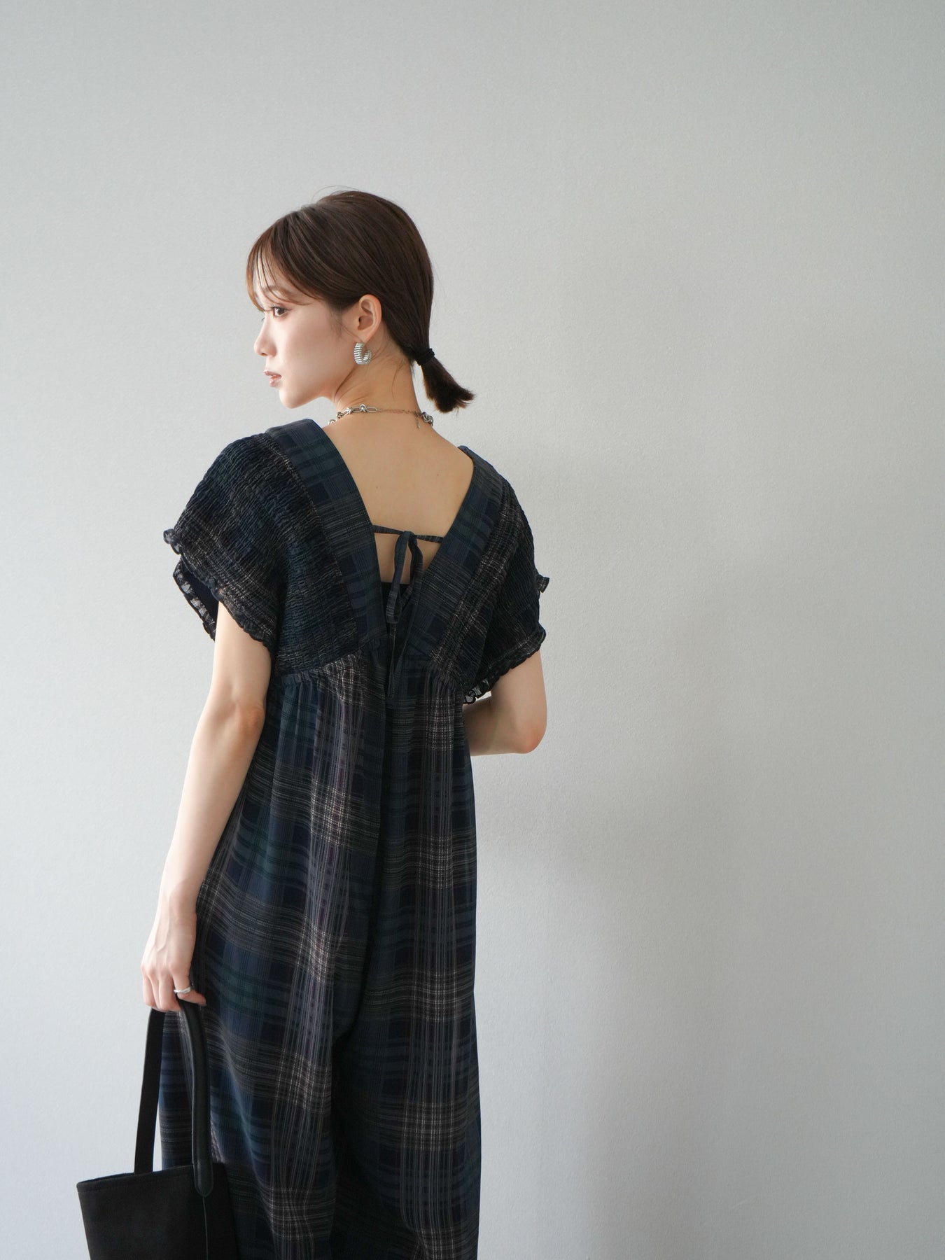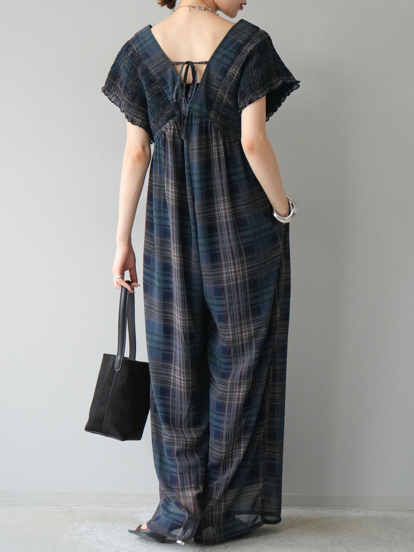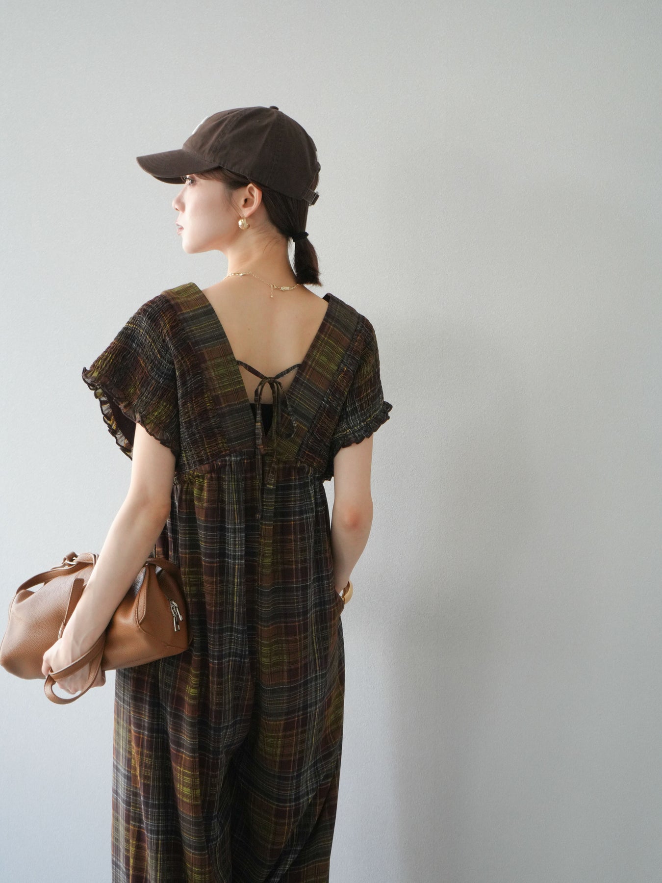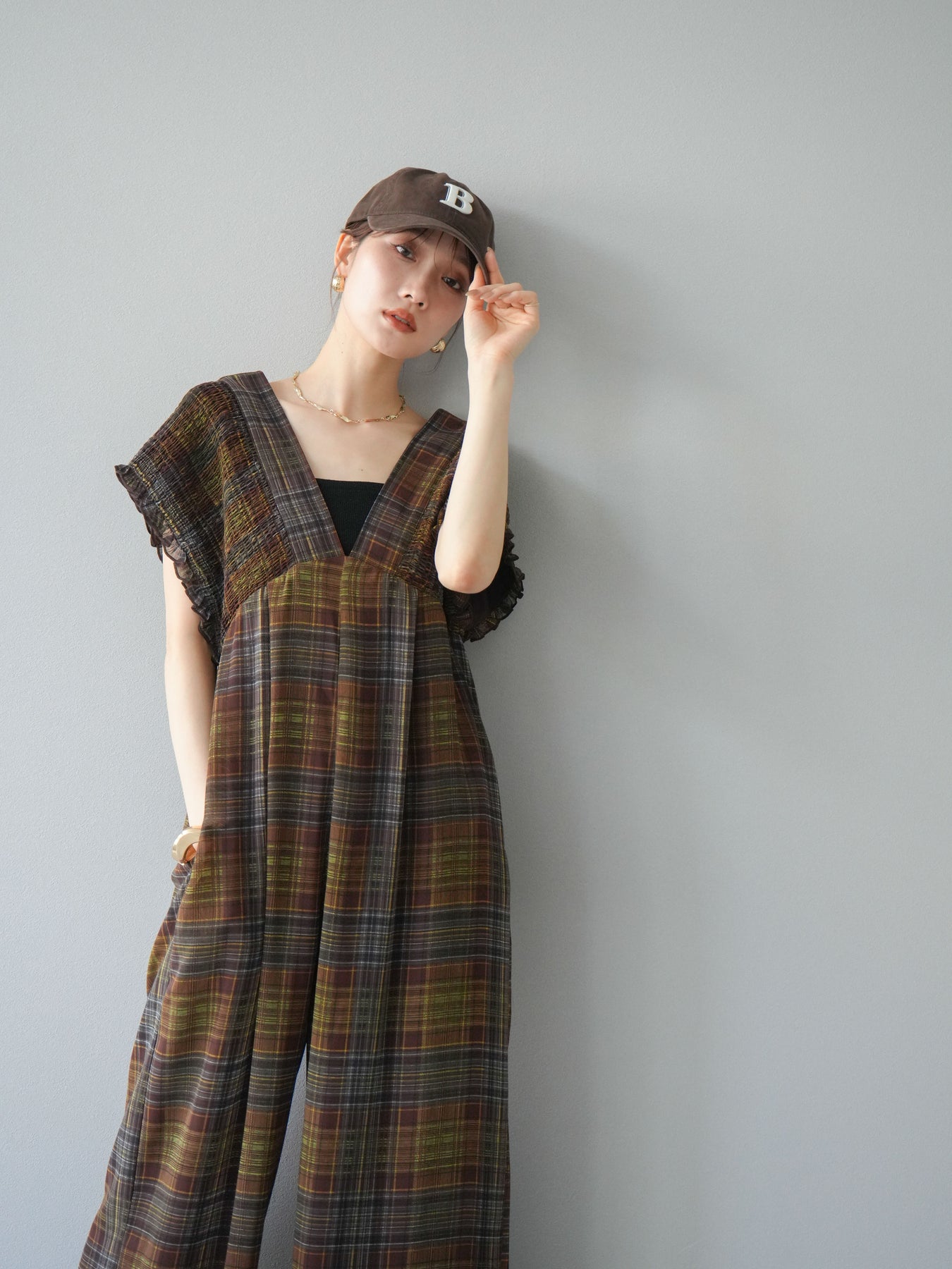 軽やかなシアー素材に繊細なチェック柄をのせたサロペット。胸元~肩にかけたシャーリングがフィット感を生み、前後Vネックで抜け感のあるデザインです。背中のリボンでサイズ調整ができ、身体からふわりと離れるワイドシルエットがスタイルをすっきり見せてくれます。Tシャツやリブタンク、薄手ニットとのレイヤードでロングシーズン活躍する一枚。 ※ボトムス、キャミソール(インナー)以外の商品は一律でインナーは付属していません。