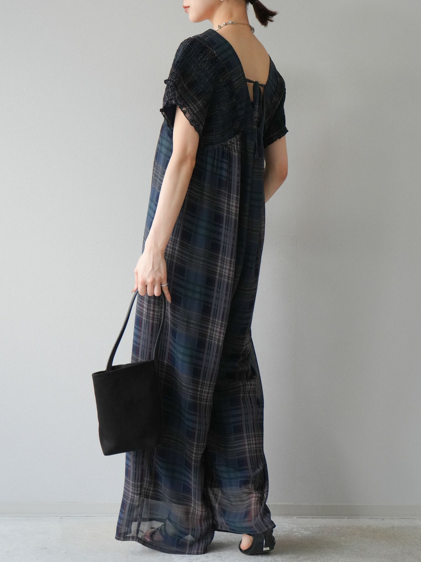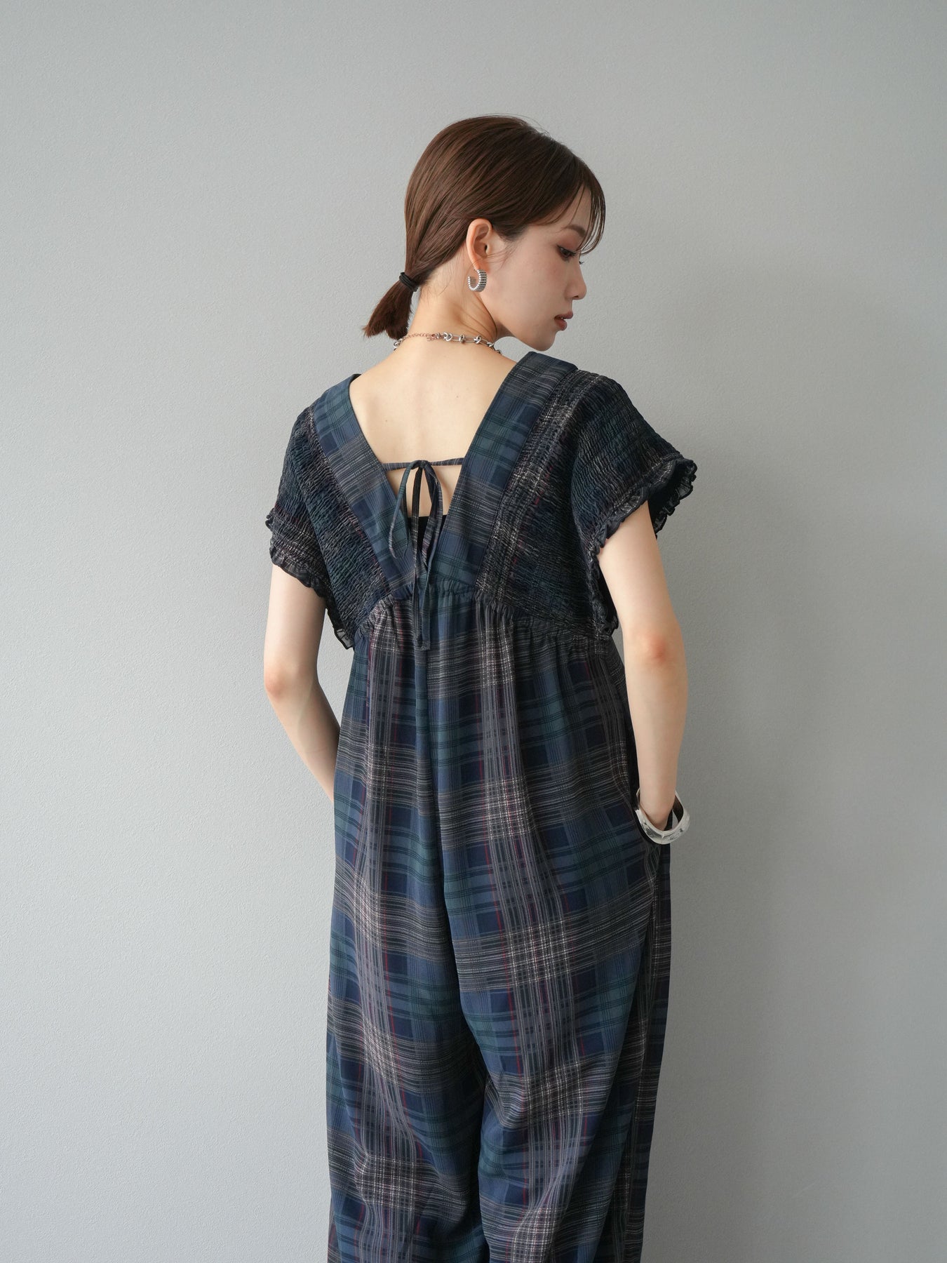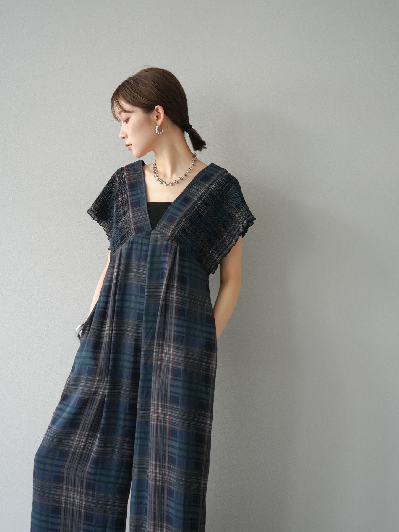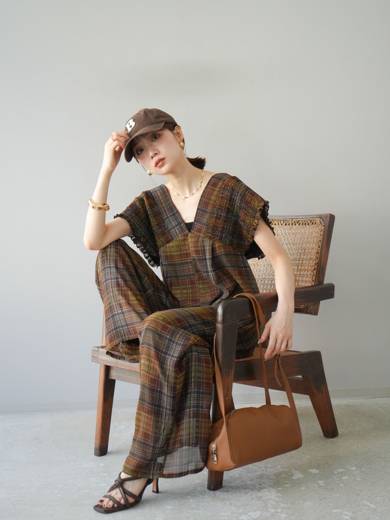 軽やかなシアー素材に繊細なチェック柄をのせたサロペット。胸元~肩にかけたシャーリングがフィット感を生み、前後Vネックで抜け感のあるデザインです。背中のリボンでサイズ調整ができ、身体からふわりと離れるワイドシルエットがスタイルをすっきり見せてくれます。Tシャツやリブタンク、薄手ニットとのレイヤードでロングシーズン活躍する一枚。 ※ボトムス、キャミソール(インナー)以外の商品は一律でインナーは付属していません。
