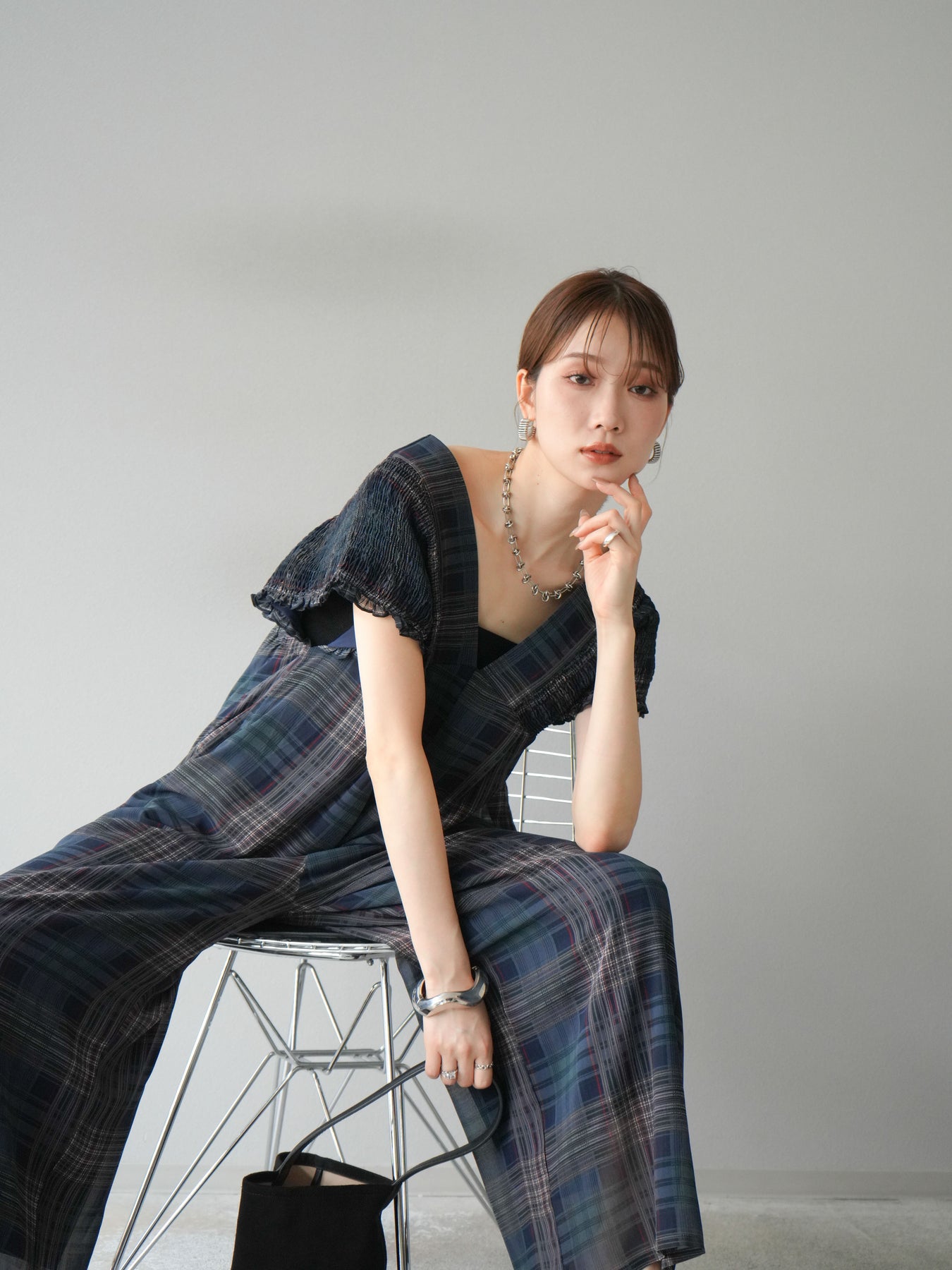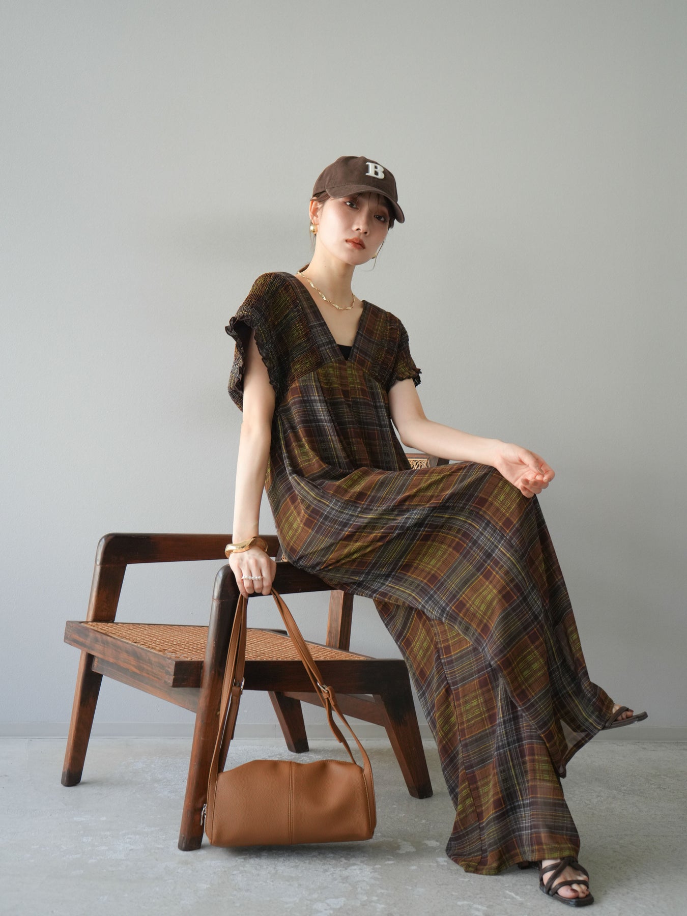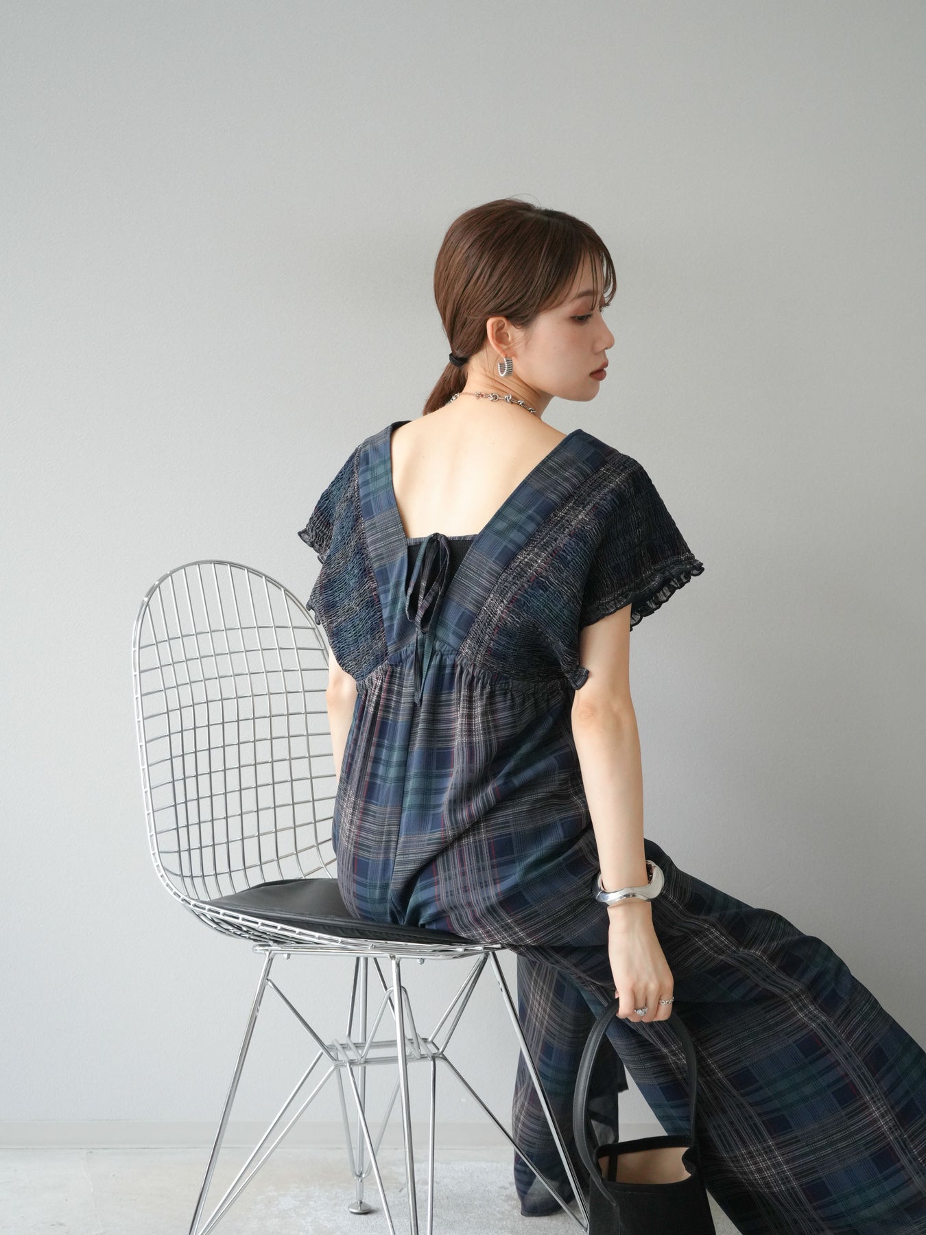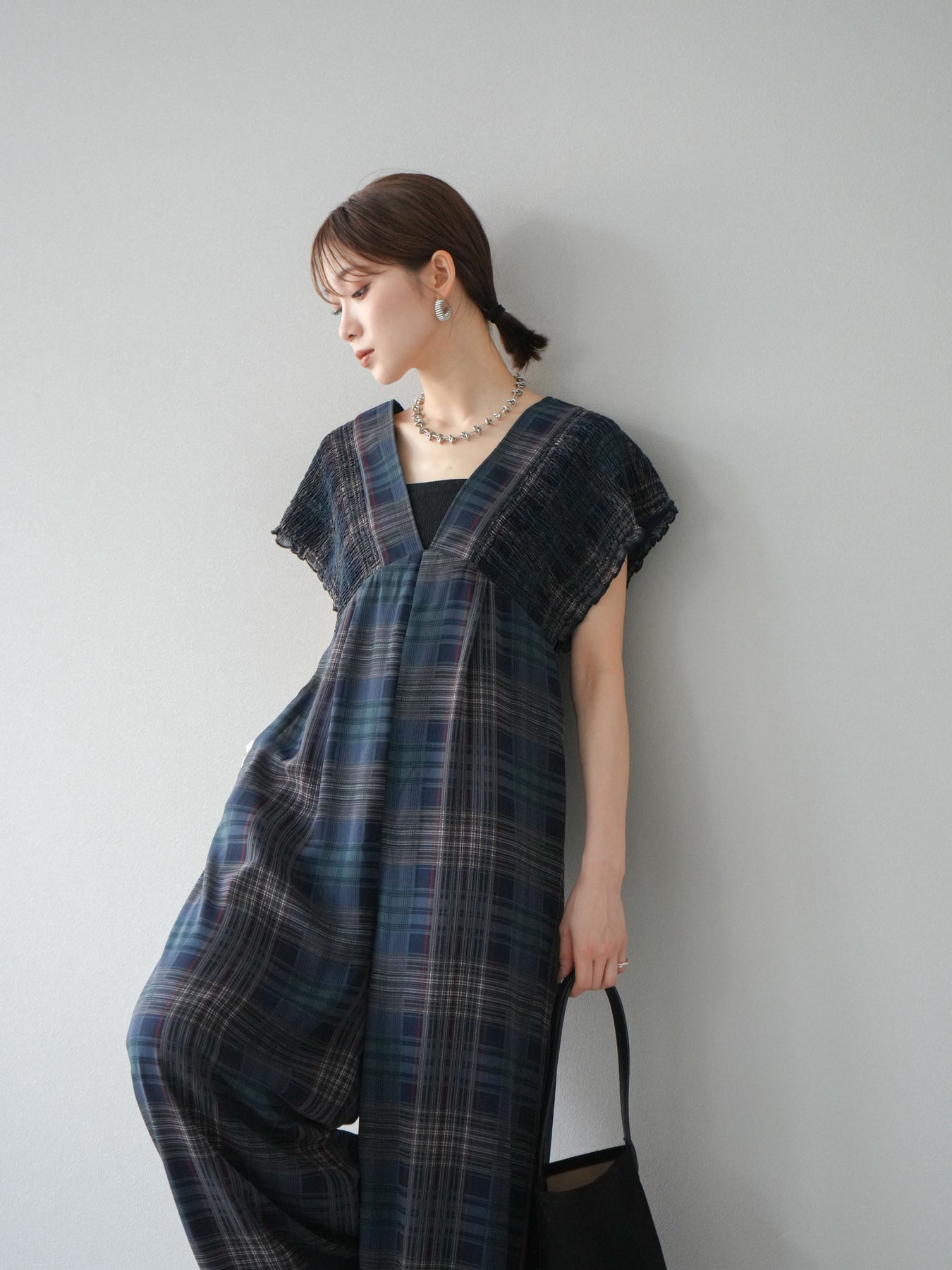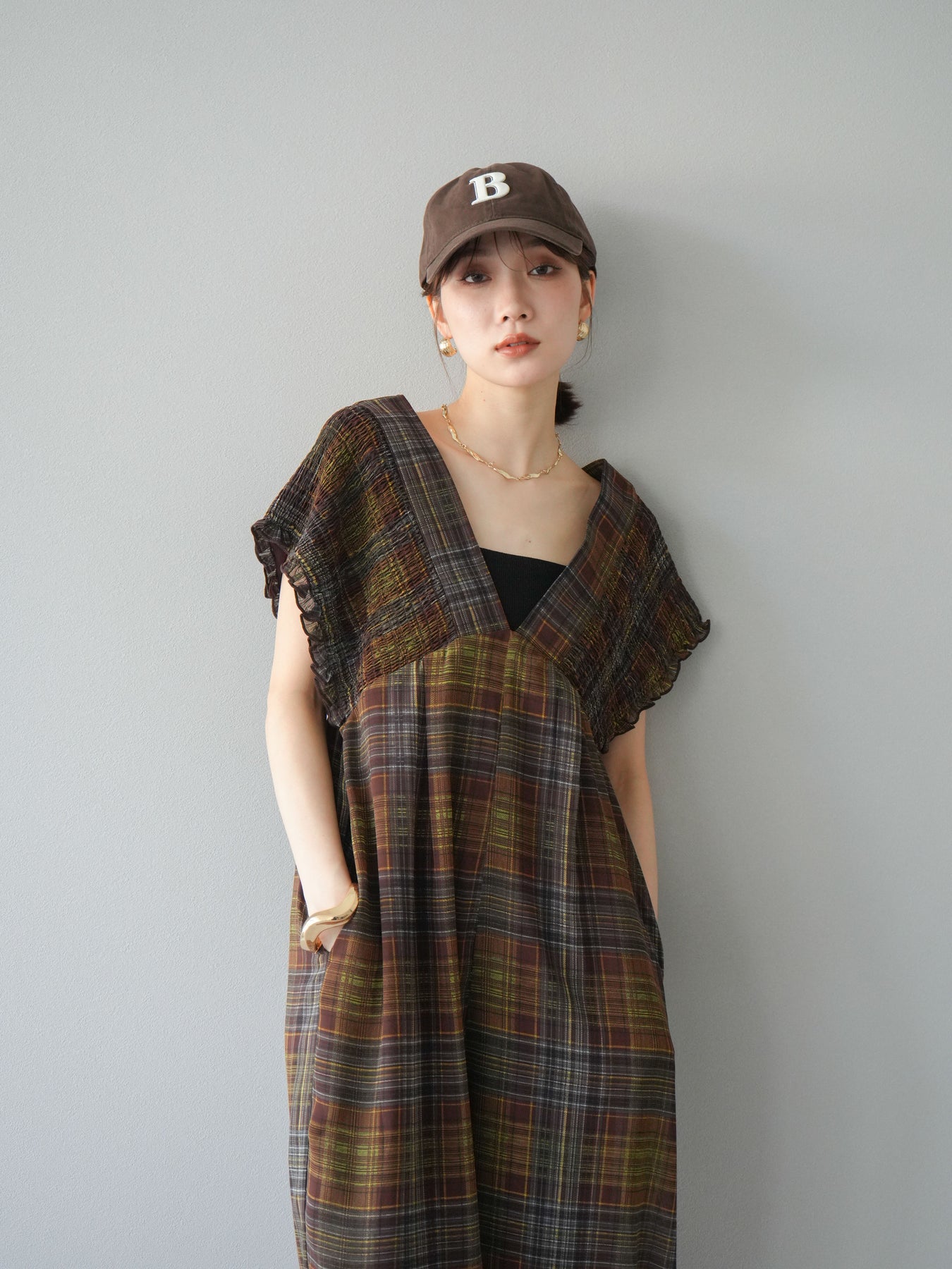 軽やかなシアー素材に繊細なチェック柄をのせたサロペット。胸元~肩にかけたシャーリングがフィット感を生み、前後Vネックで抜け感のあるデザインです。背中のリボンでサイズ調整ができ、身体からふわりと離れるワイドシルエットがスタイルをすっきり見せてくれます。Tシャツやリブタンク、薄手ニットとのレイヤードでロングシーズン活躍する一枚。 ※ボトムス、キャミソール(インナー)以外の商品は一律でインナーは付属していません。