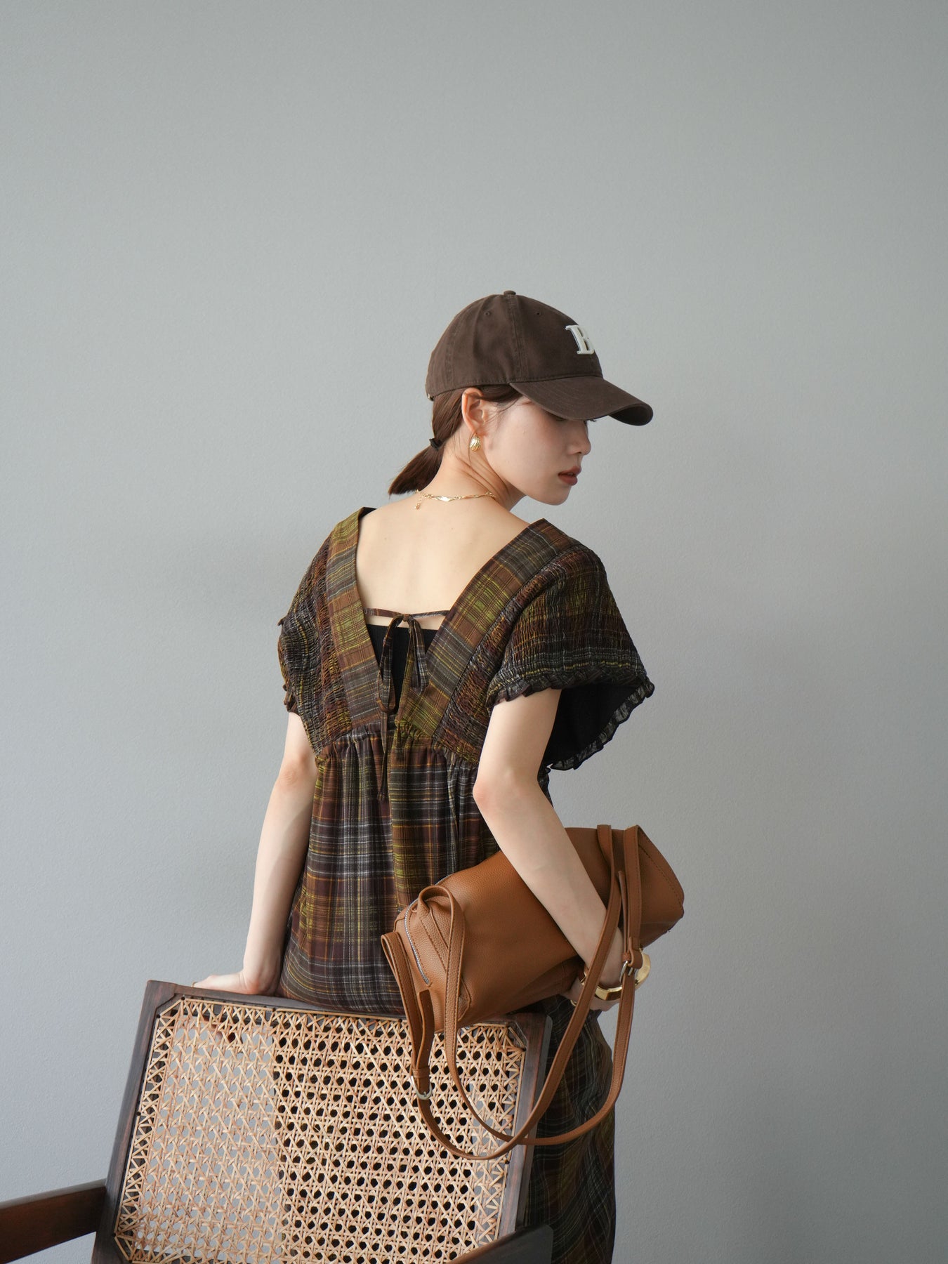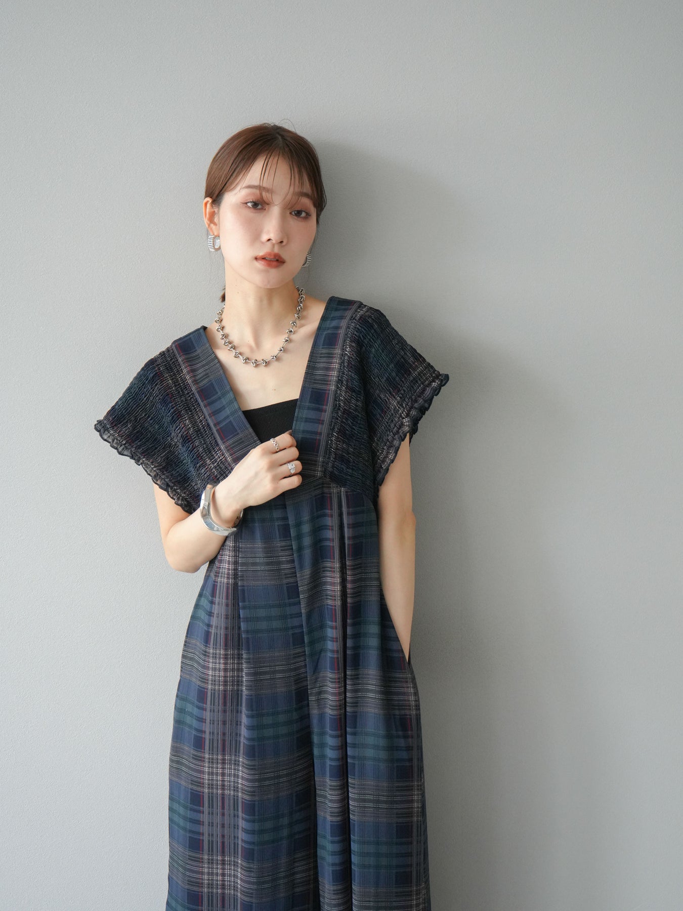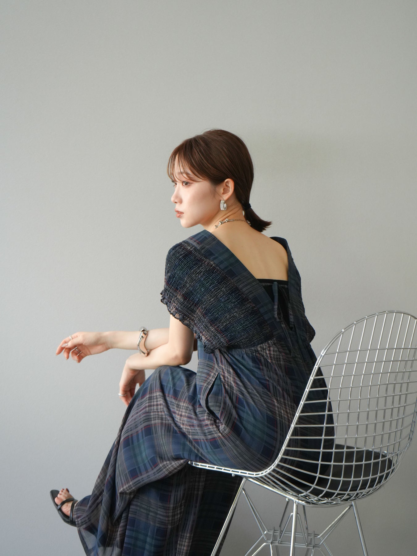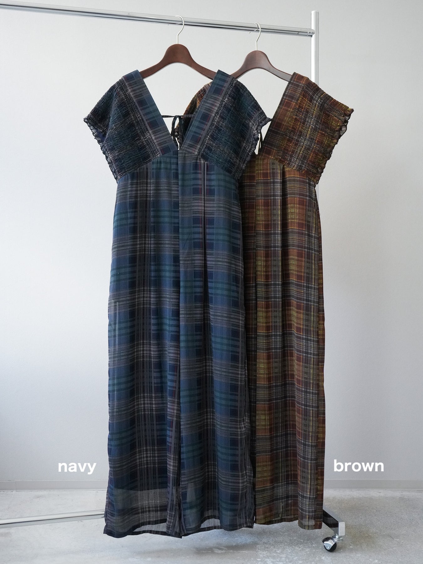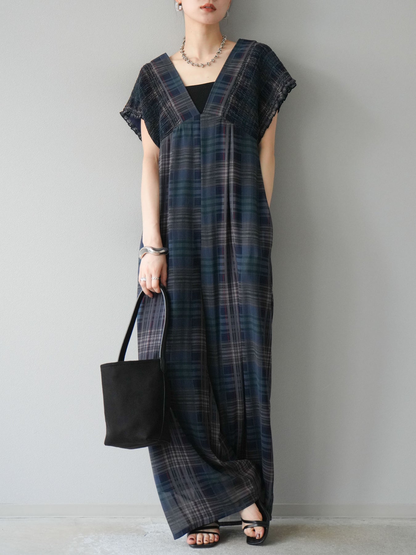 軽やかなシアー素材に繊細なチェック柄をのせたサロペット。胸元~肩にかけたシャーリングがフィット感を生み、前後Vネックで抜け感のあるデザインです。背中のリボンでサイズ調整ができ、身体からふわりと離れるワイドシルエットがスタイルをすっきり見せてくれます。Tシャツやリブタンク、薄手ニットとのレイヤードでロングシーズン活躍する一枚。 ※ボトムス、キャミソール(インナー)以外の商品は一律でインナーは付属していません。
