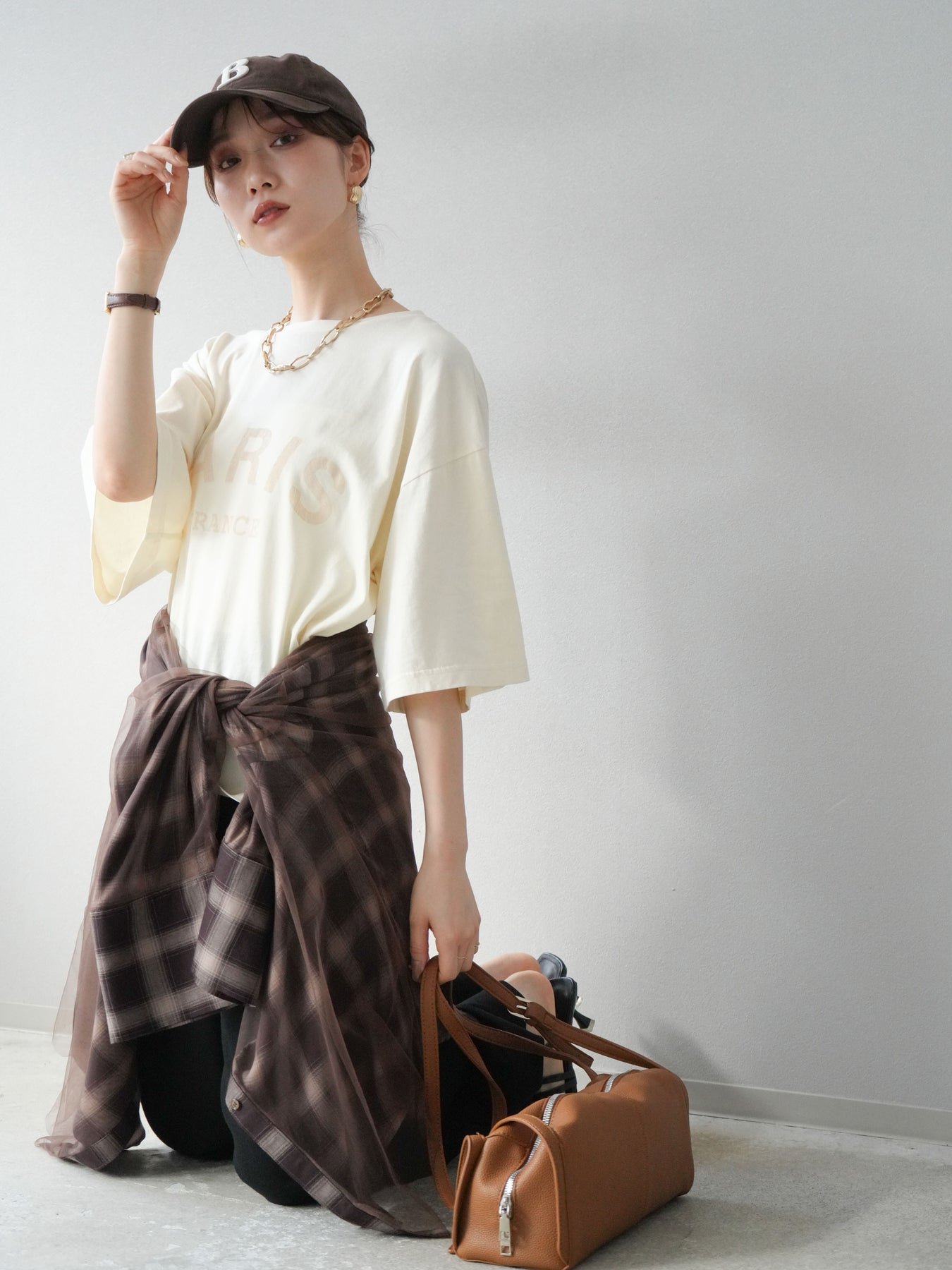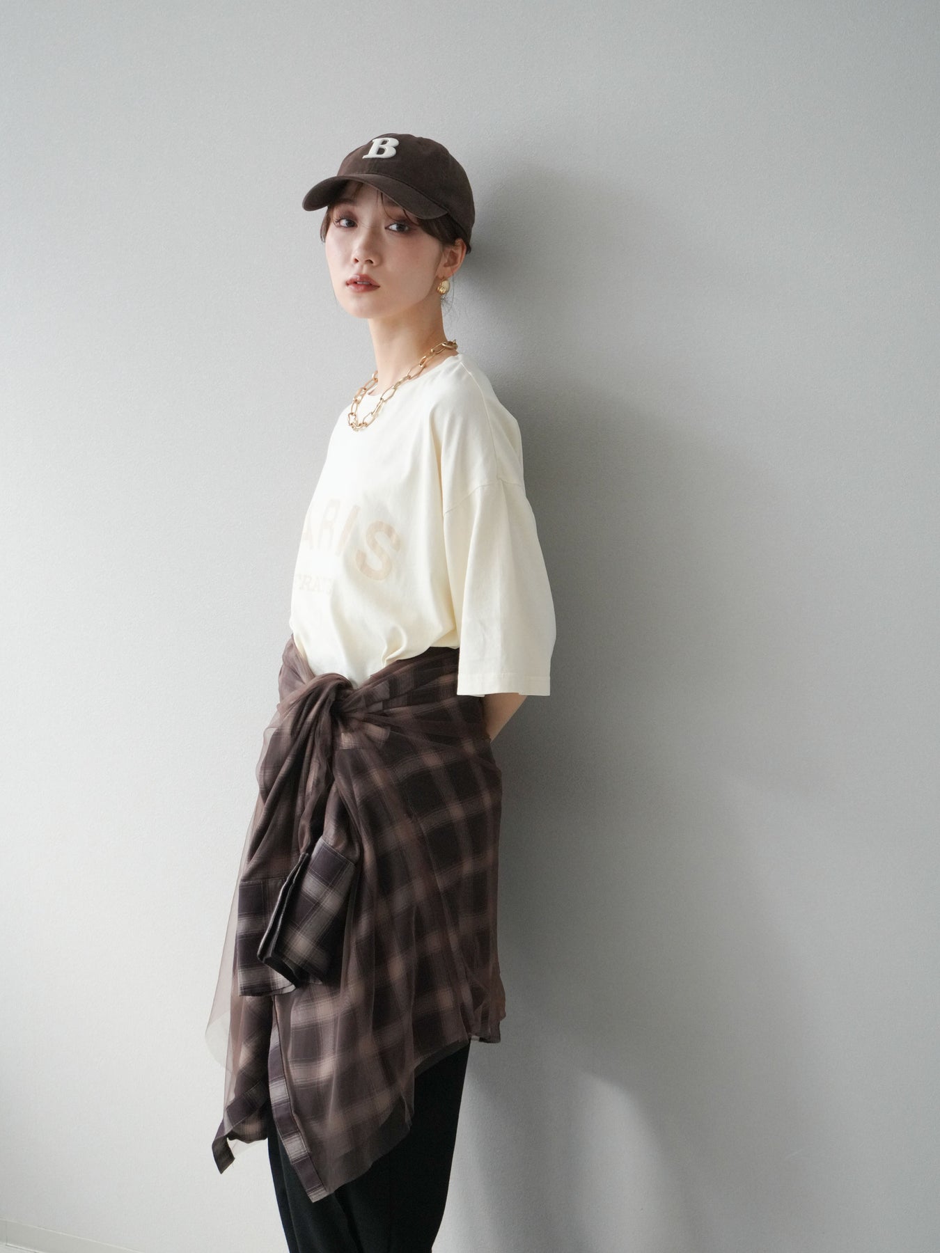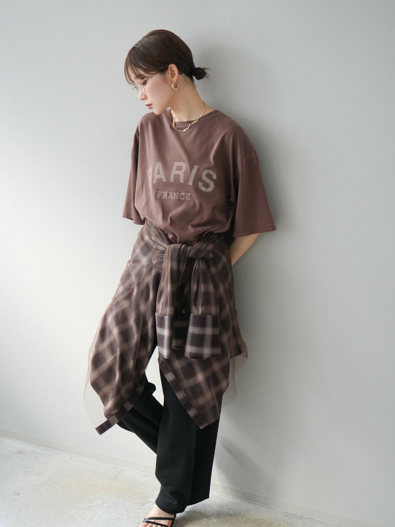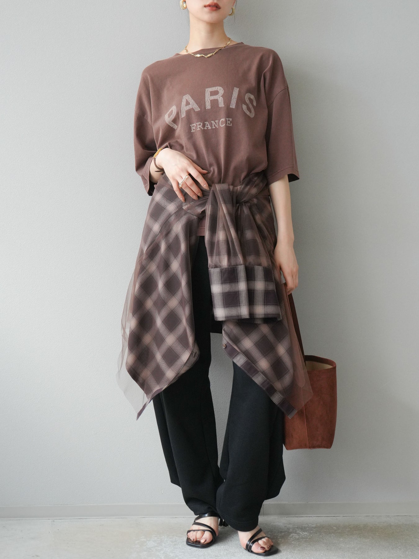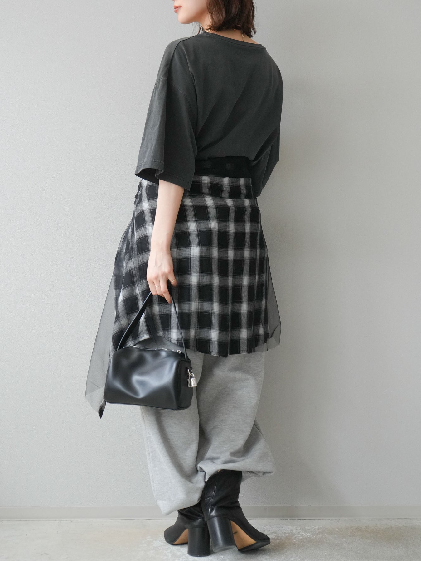 [SET]ピグメントロゴプリントTシャツ+2WAYデザインスウェットパンツ+チュールドッキングチェック柄オーバーサイズシャツ(3set)