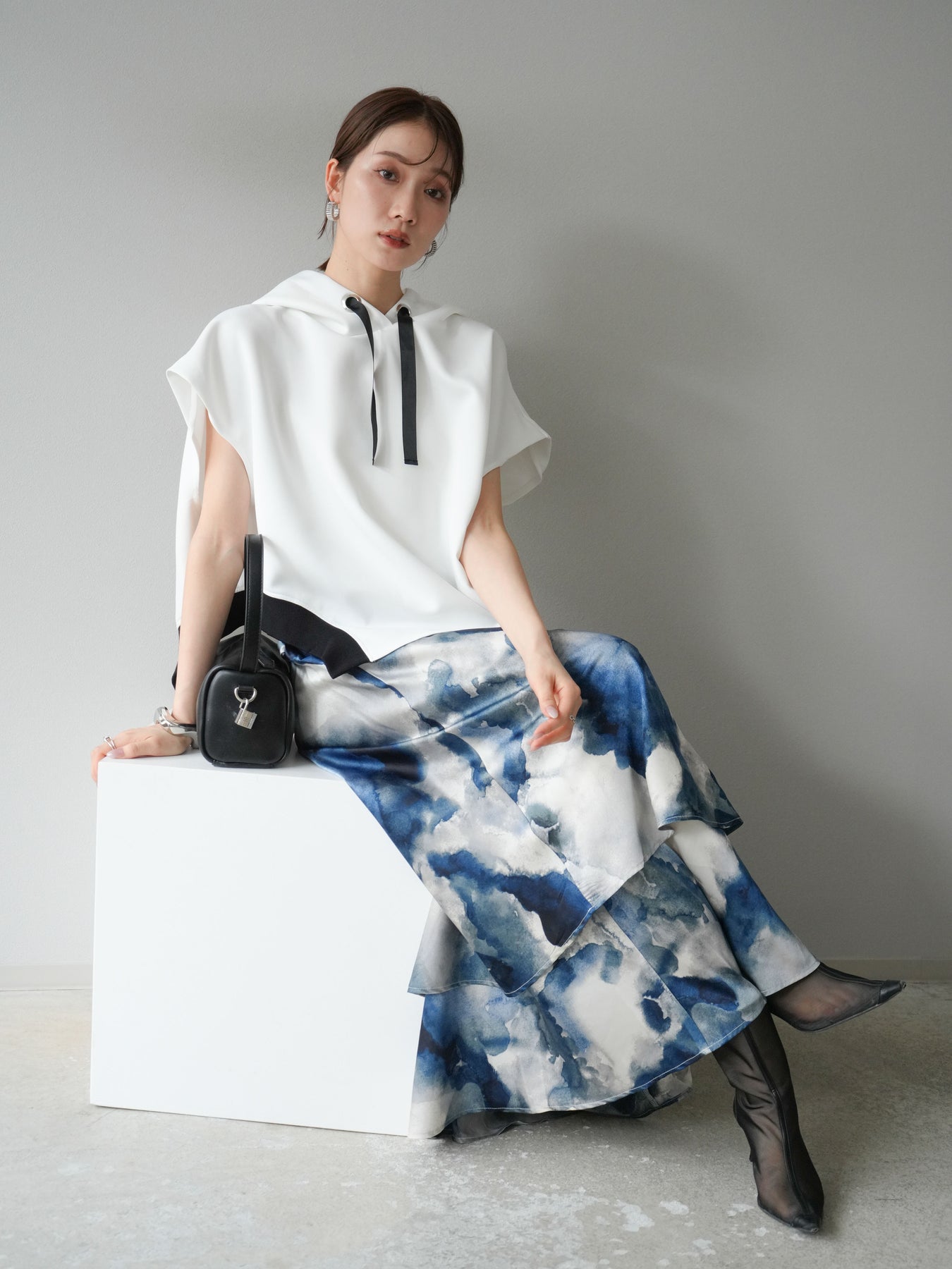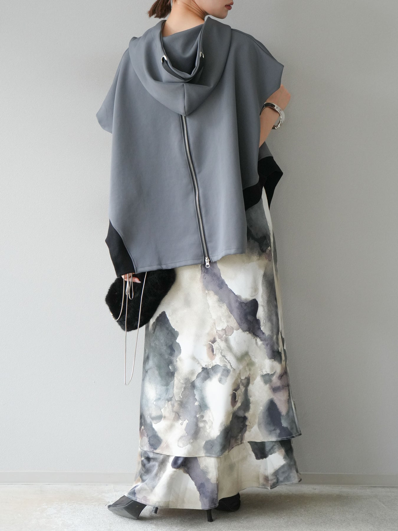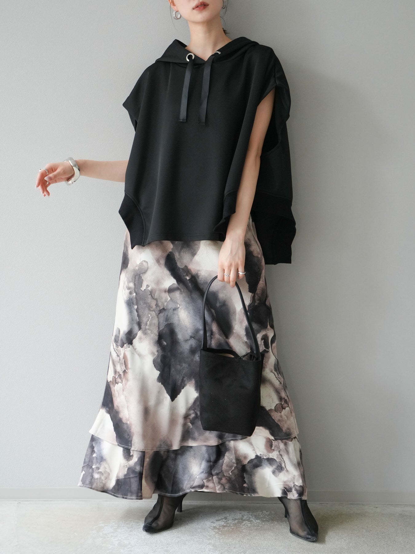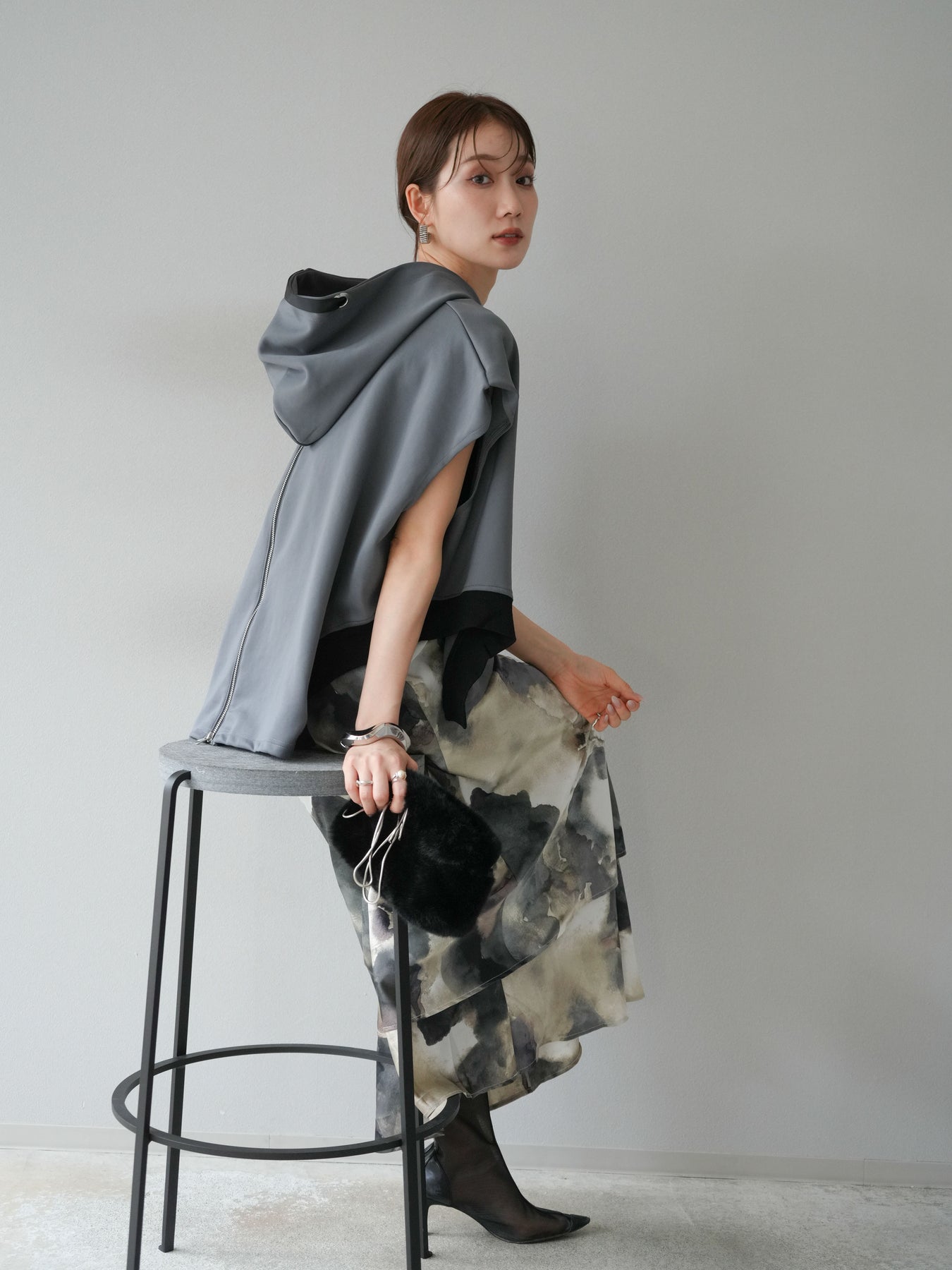 [SET]アシンメトリードルマンバックZIPフーディー+ニュアンスサテンフリルスカート(2set)