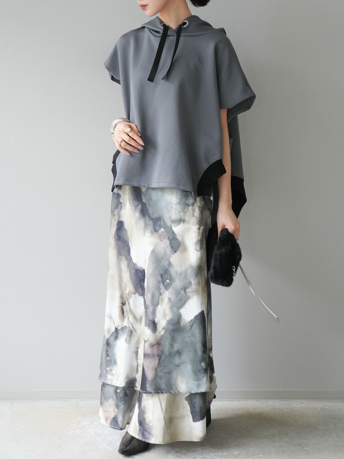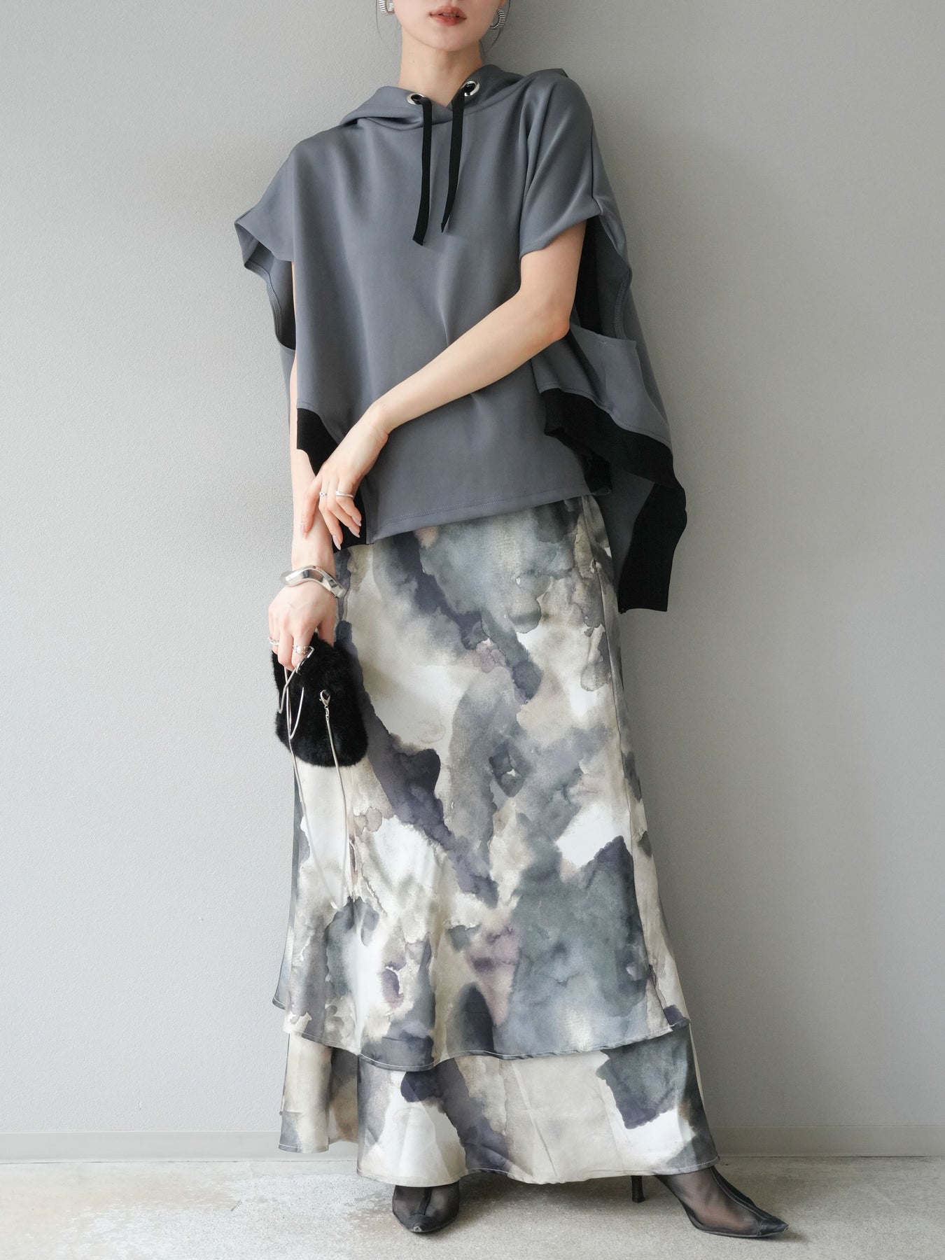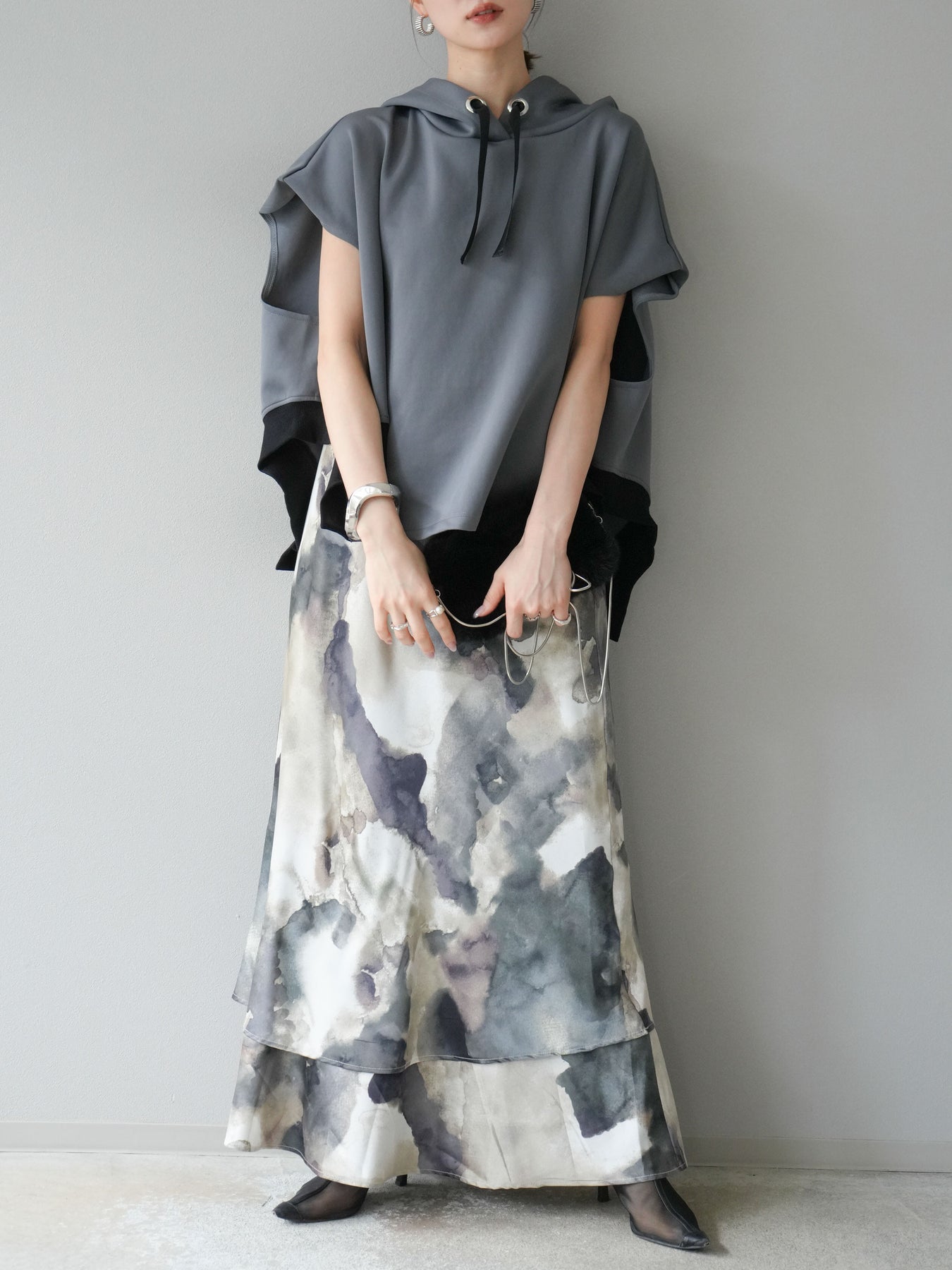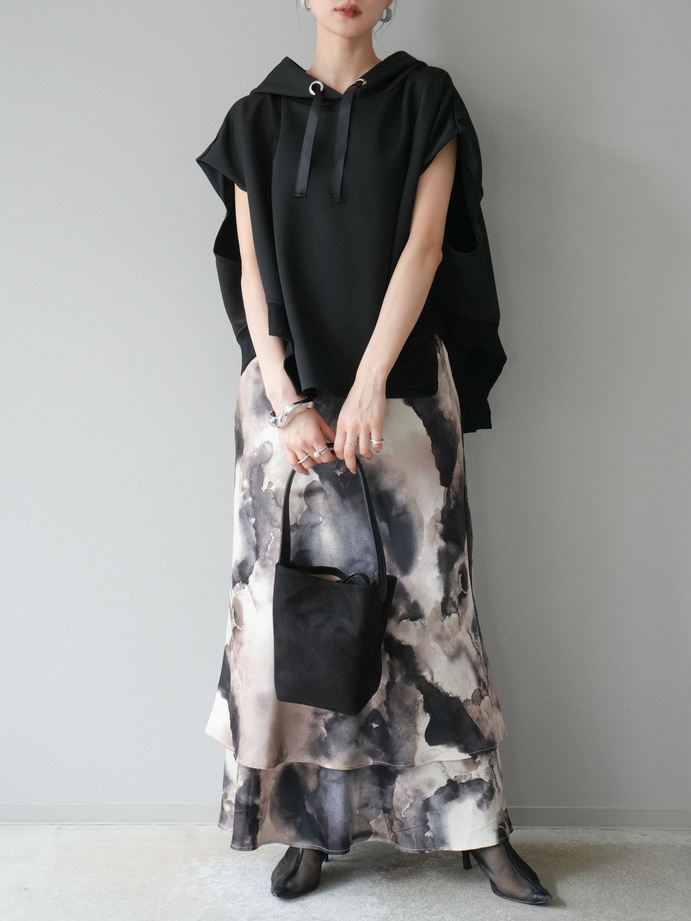 [SET]アシンメトリードルマンバックZIPフーディー+ニュアンスサテンフリルスカート(2set)