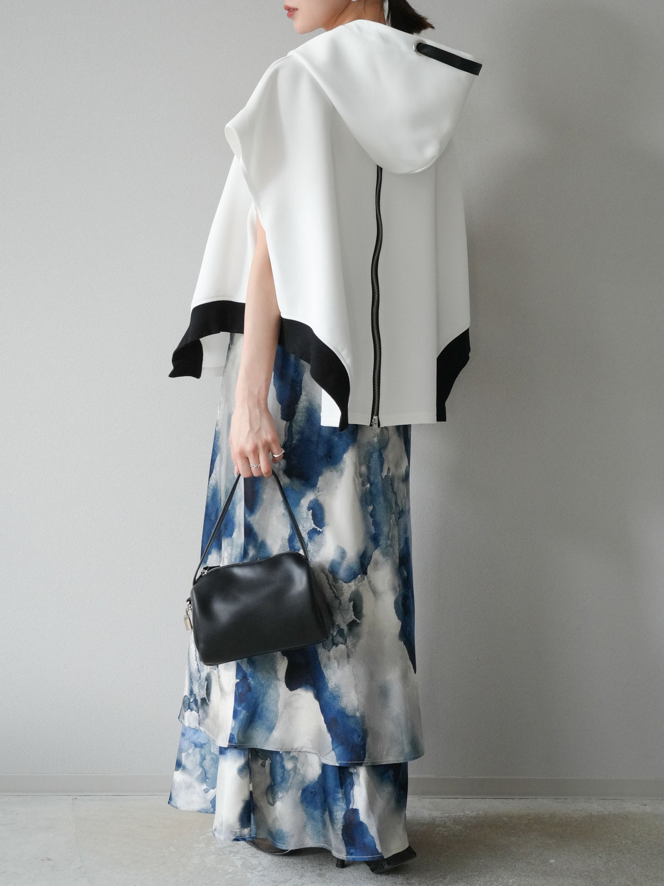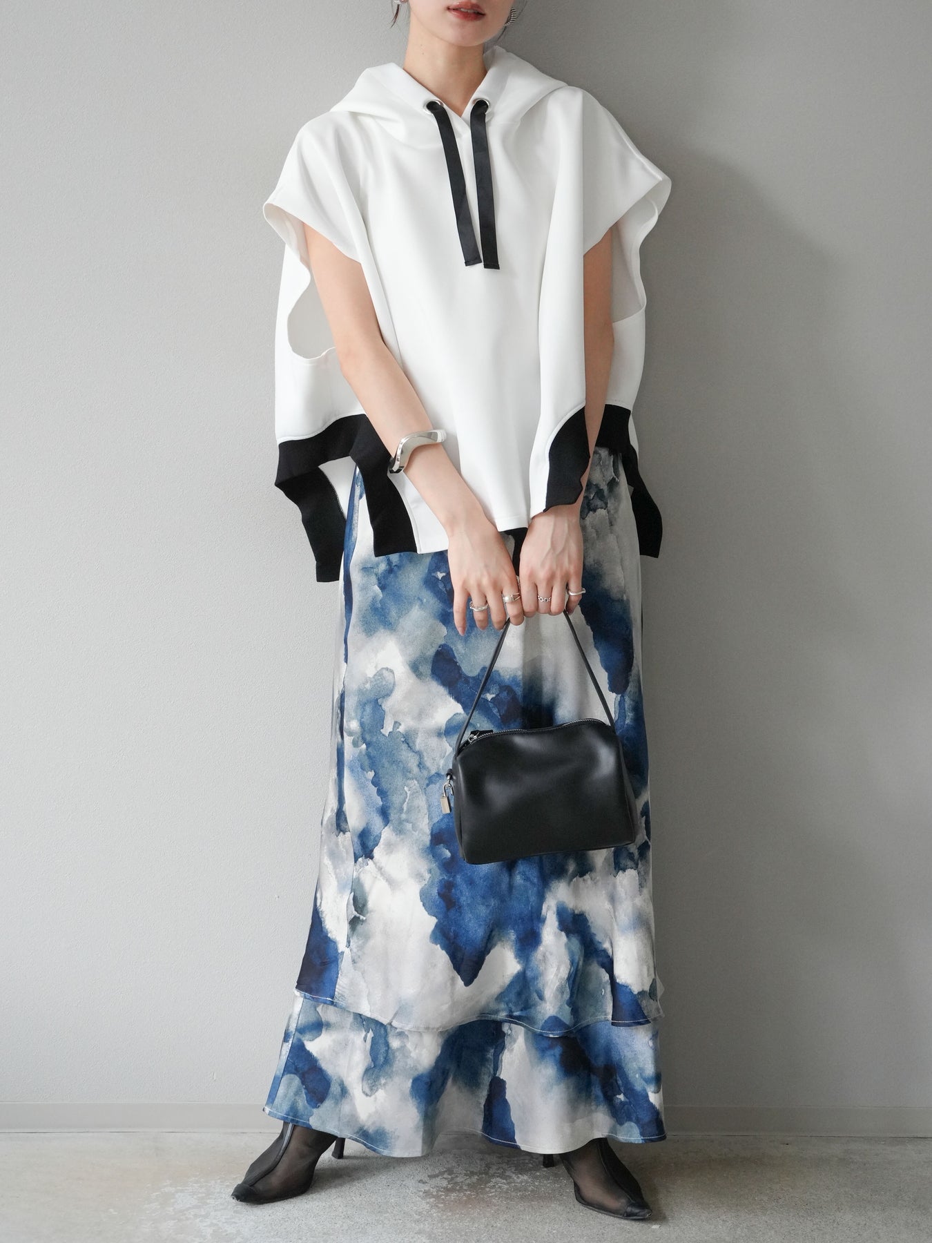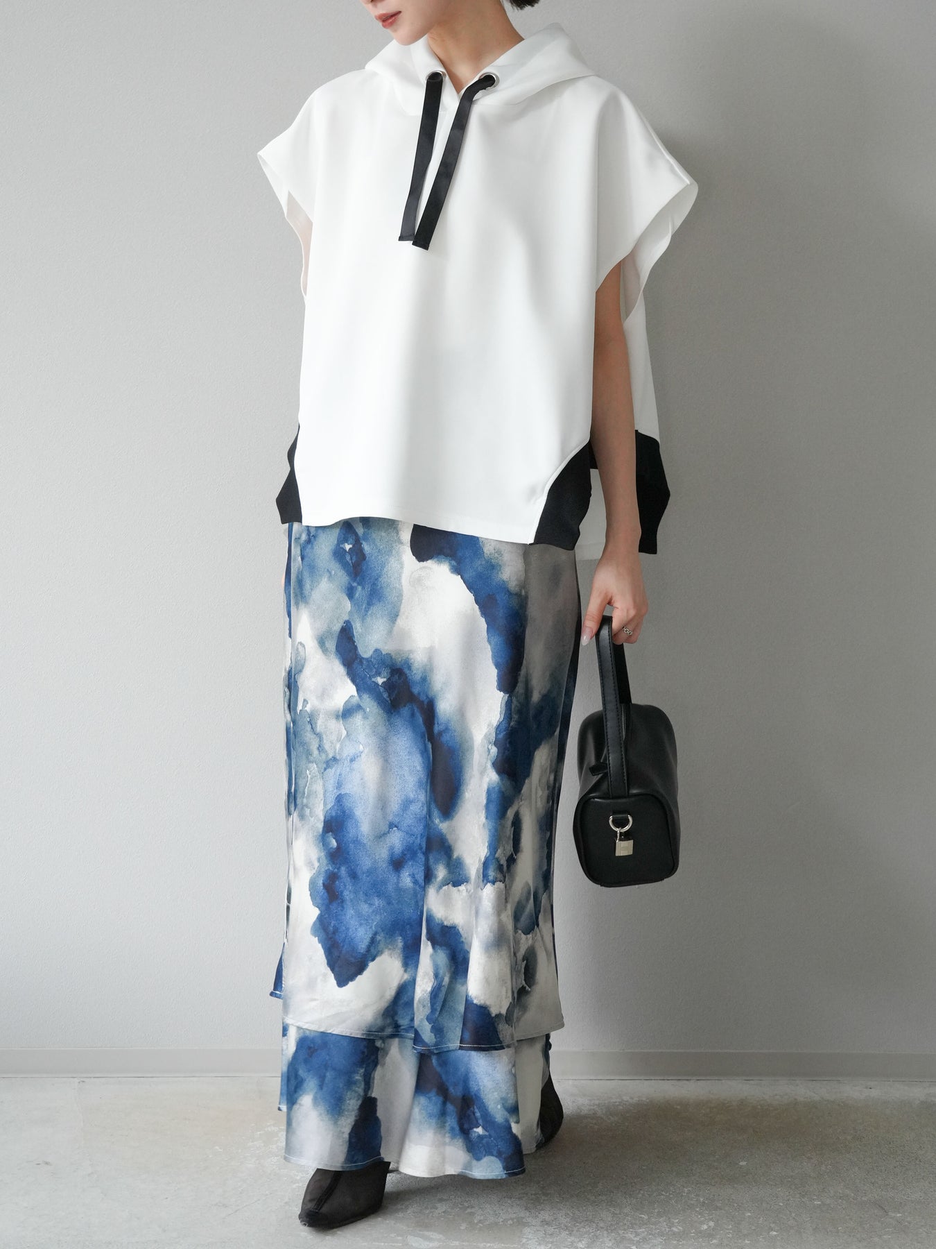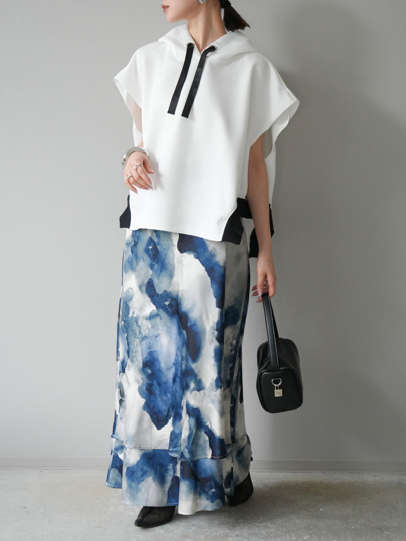 [SET]アシンメトリードルマンバックZIPフーディー+ニュアンスサテンフリルスカート(2set)