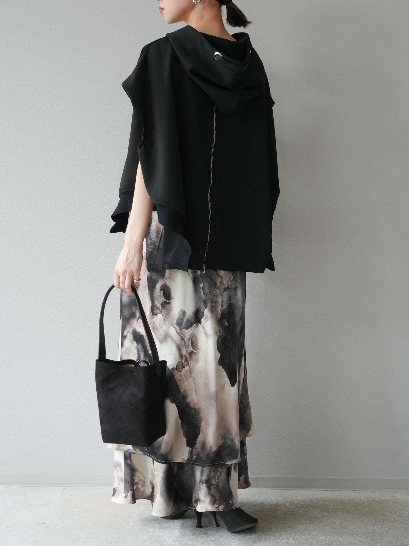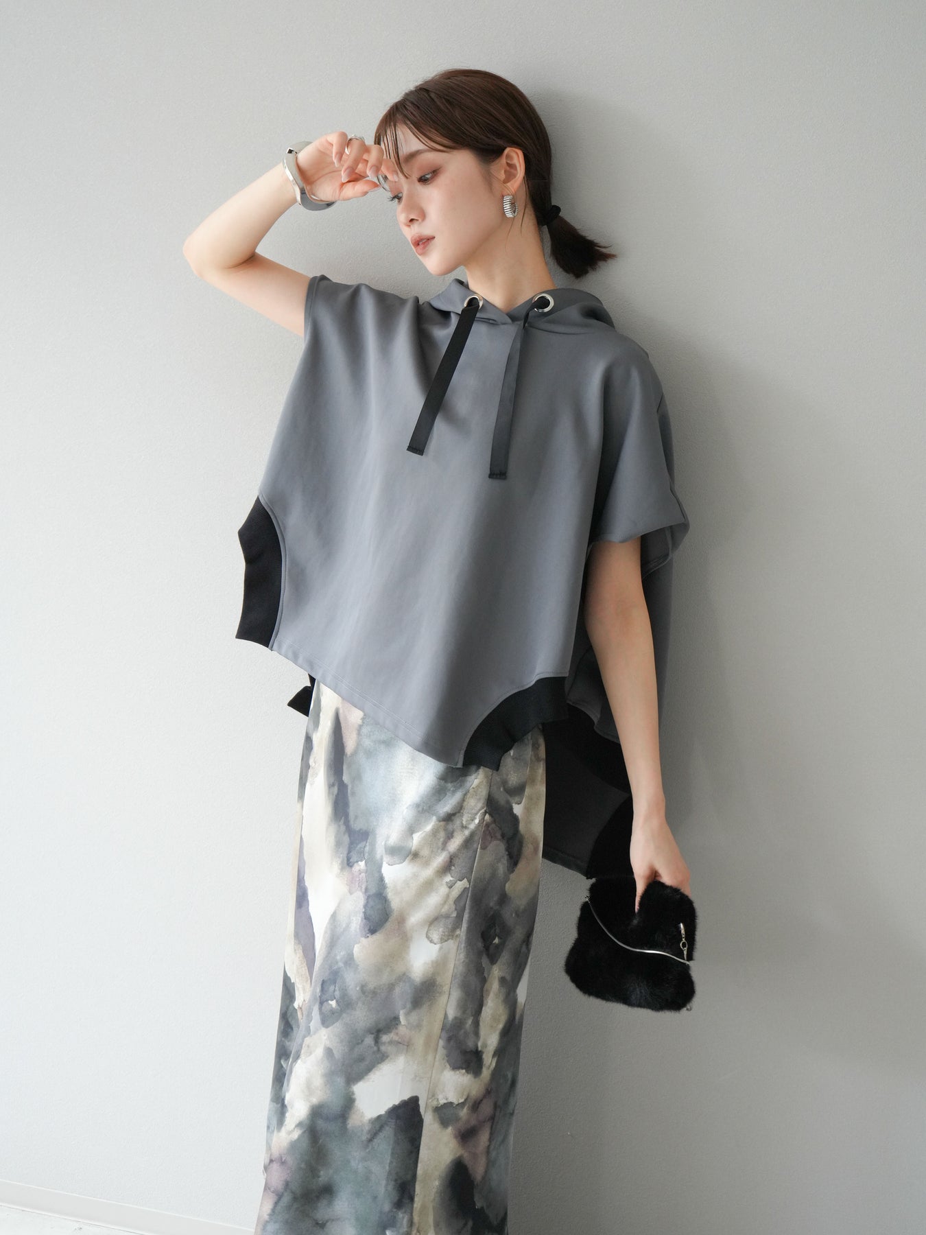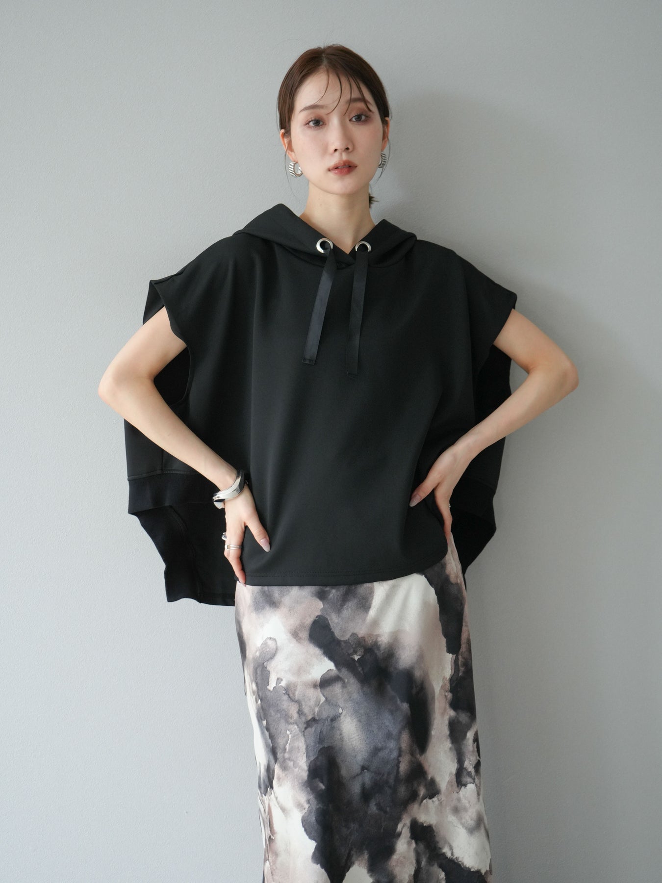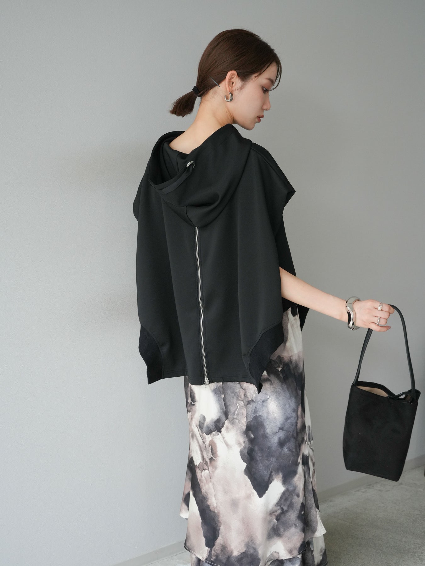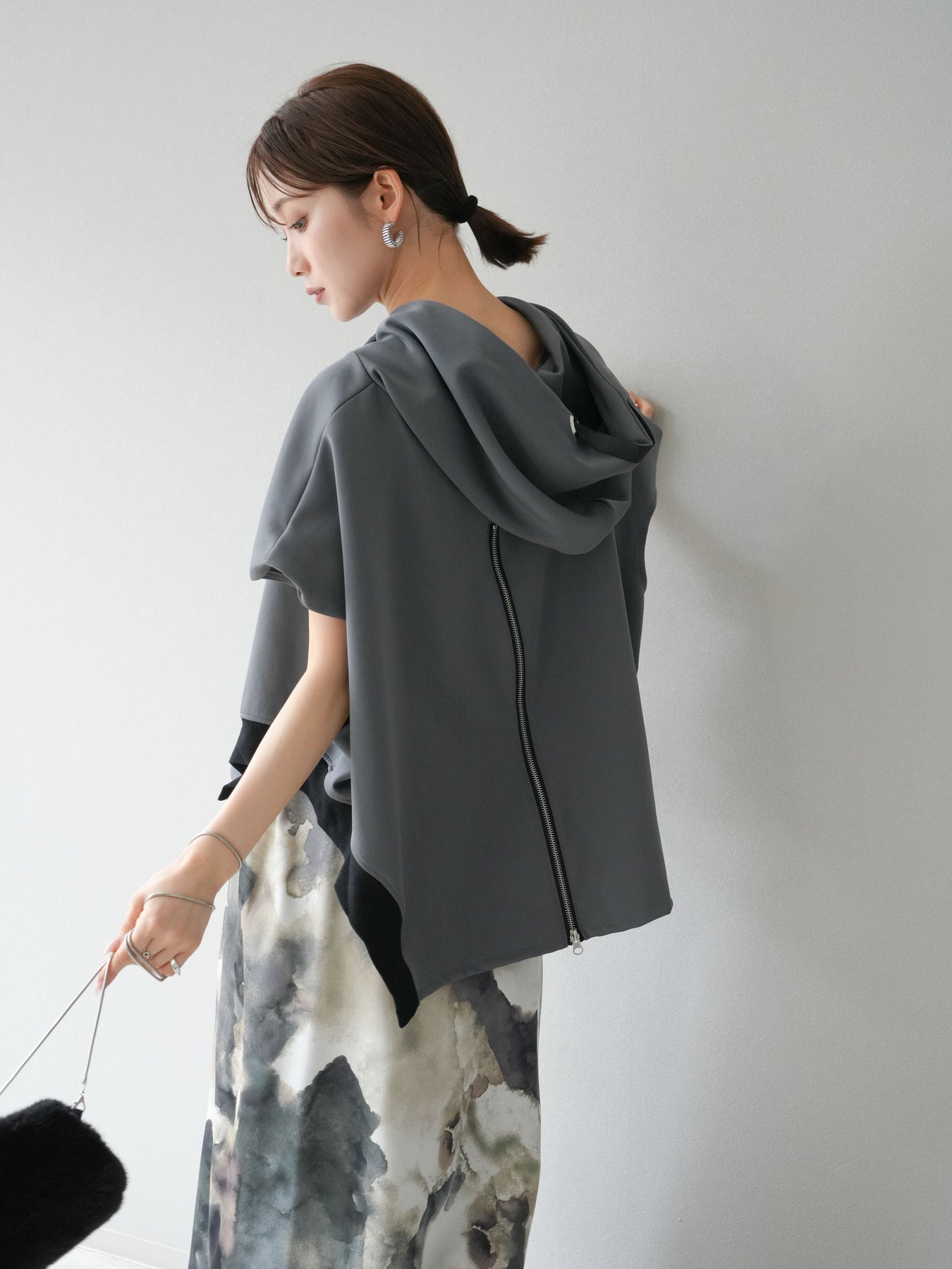 アシンメトリーな裾ラインが印象的なドルマンフーディー。ゆったりとしたシルエットと落ち感のある生地がリラックス感を与えつつ、モードな雰囲気も漂わせます。背面にはZIPを配し、開閉によってスタイリングに変化をつけられるデザイン性の高い一枚。ドロップショルダーとワイドスリーブが抜け感を演出し、カットソーやシャツを合わせたレイヤードスタイルにも好相性。軽やかに羽織れるため、カジュアルからきれいめまで幅広く活躍するアイテムです。 ※ボトムス、キャミソール(インナー)以外の商品は一律でインナーは付属していません。
