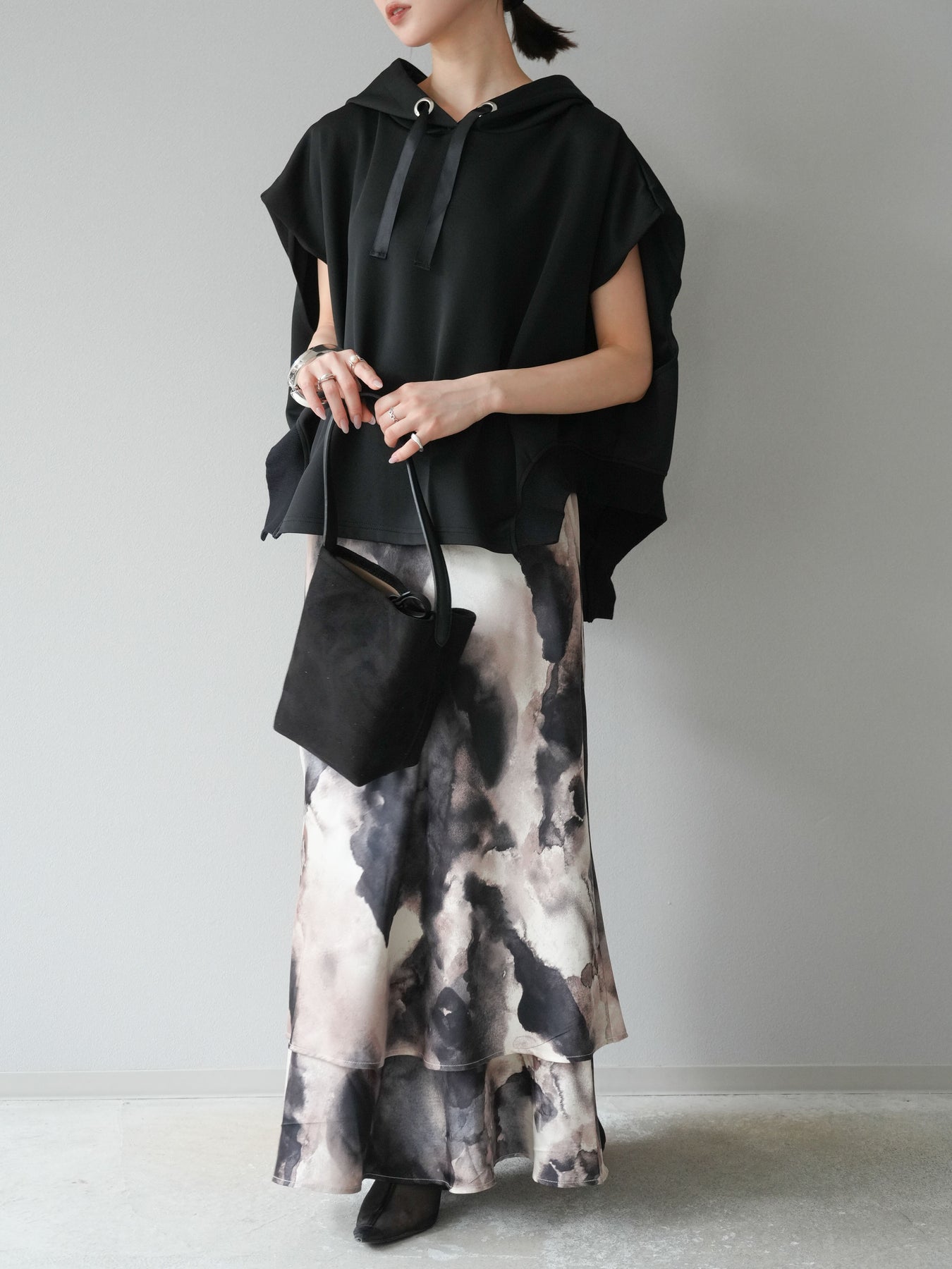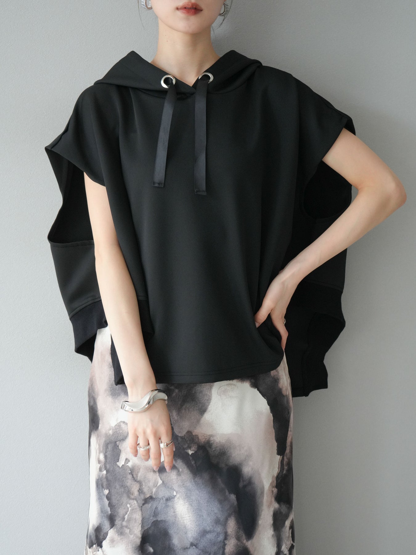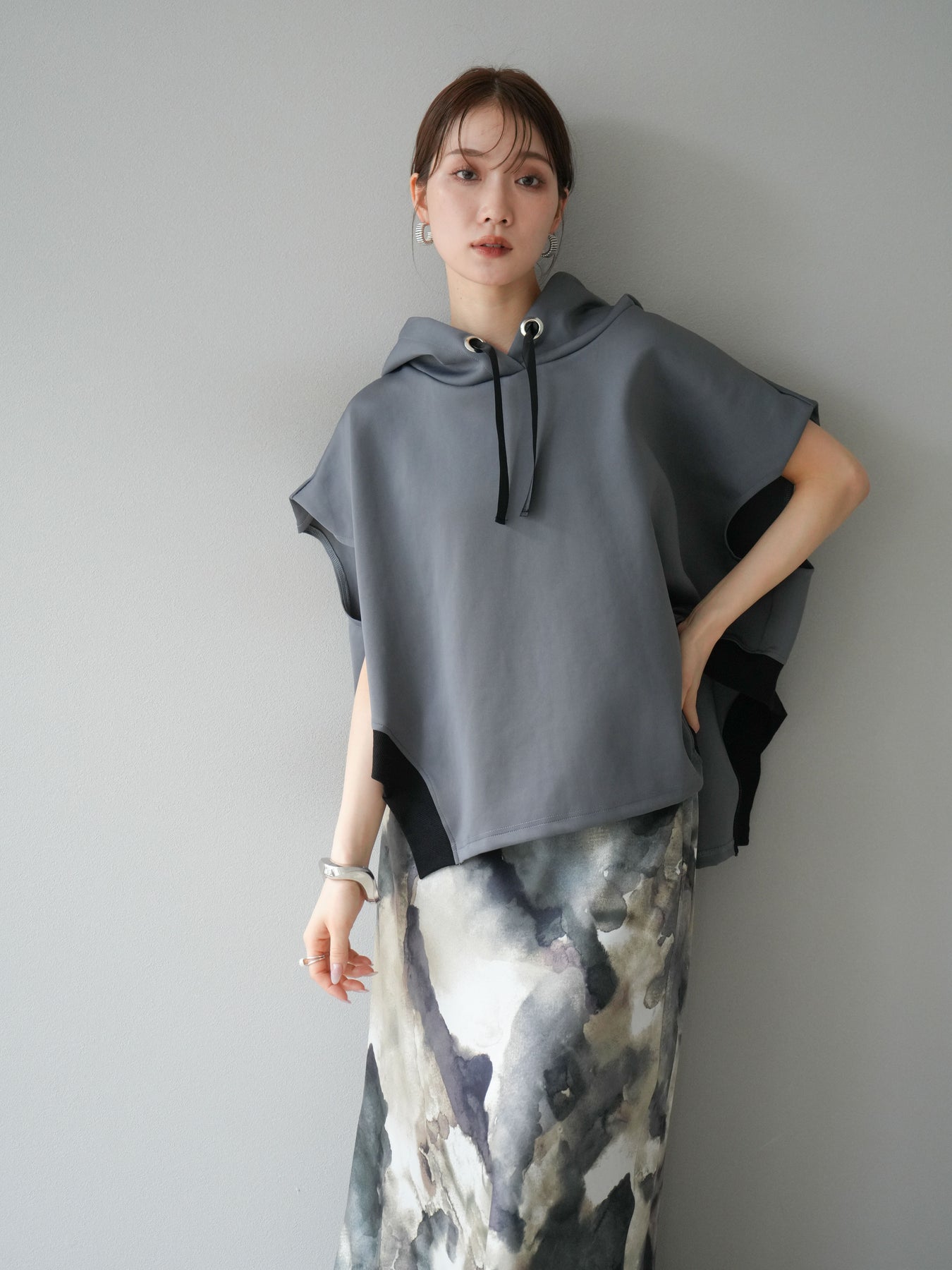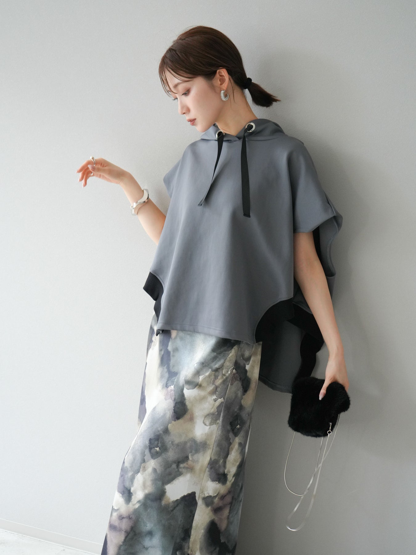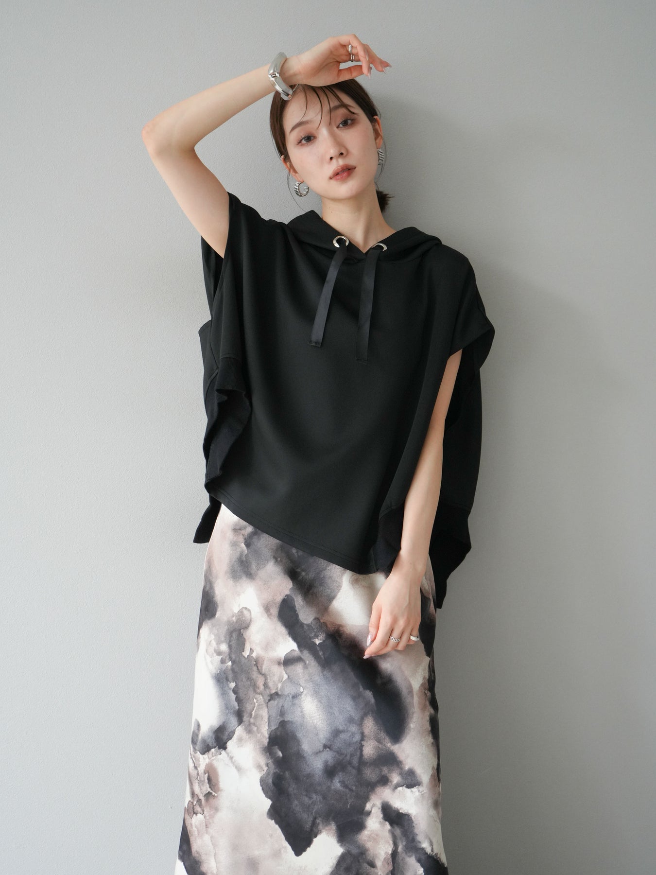 アシンメトリーな裾ラインが印象的なドルマンフーディー。ゆったりとしたシルエットと落ち感のある生地がリラックス感を与えつつ、モードな雰囲気も漂わせます。背面にはZIPを配し、開閉によってスタイリングに変化をつけられるデザイン性の高い一枚。ドロップショルダーとワイドスリーブが抜け感を演出し、カットソーやシャツを合わせたレイヤードスタイルにも好相性。軽やかに羽織れるため、カジュアルからきれいめまで幅広く活躍するアイテムです。 ※ボトムス、キャミソール(インナー)以外の商品は一律でインナーは付属していません。
