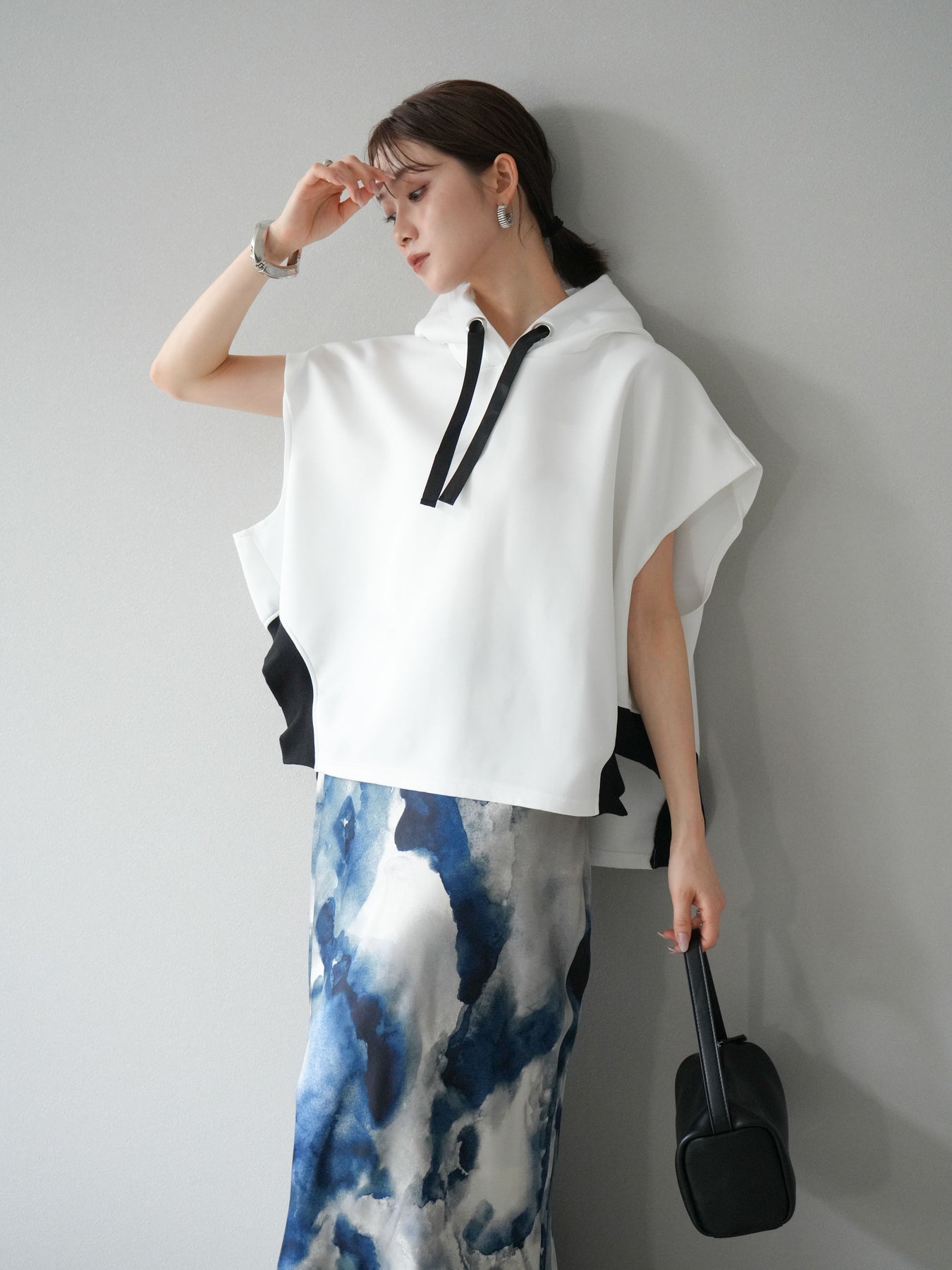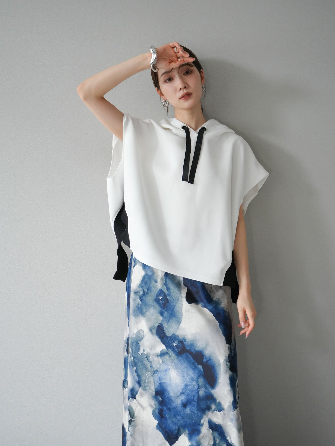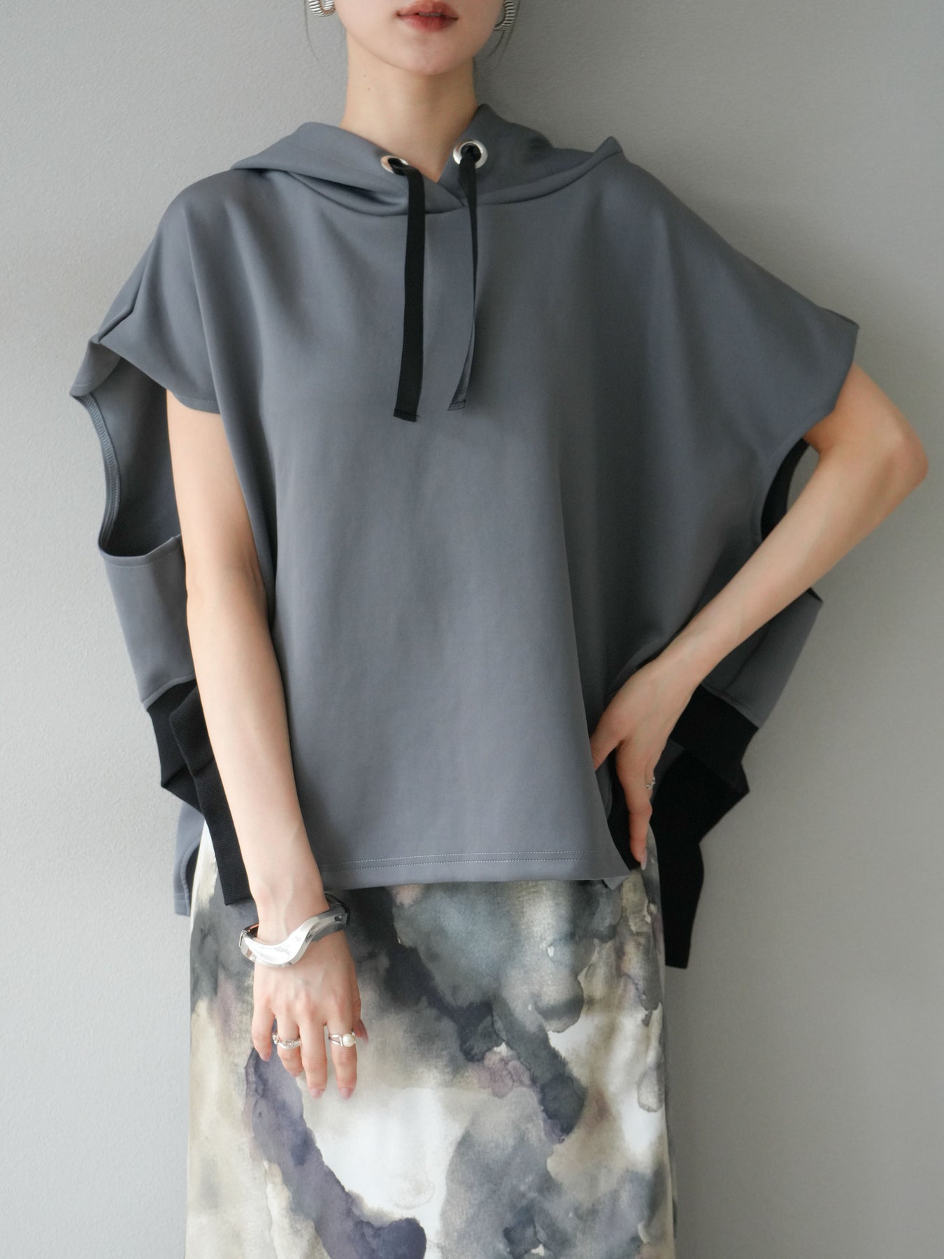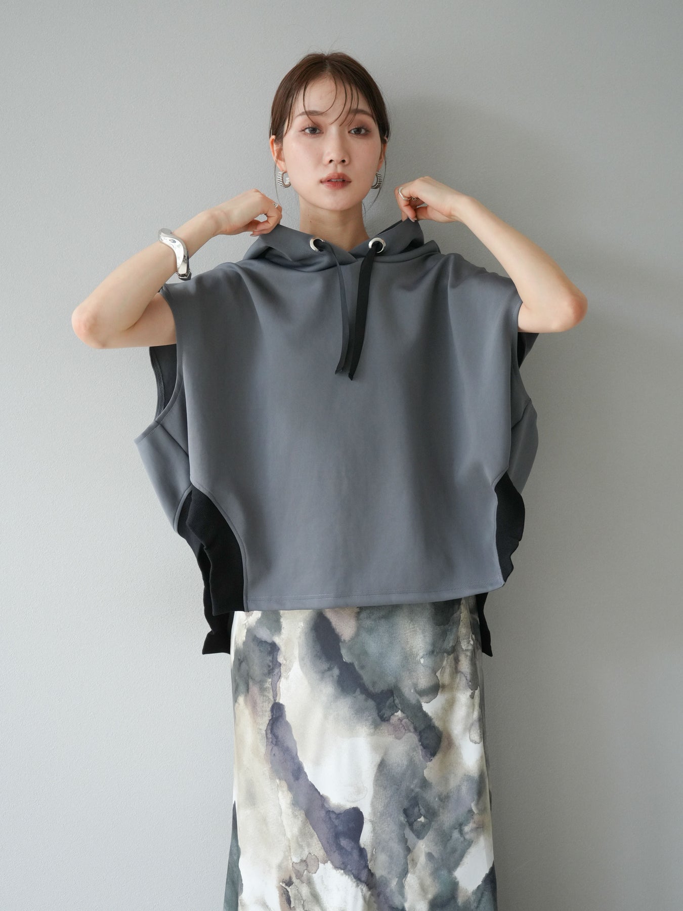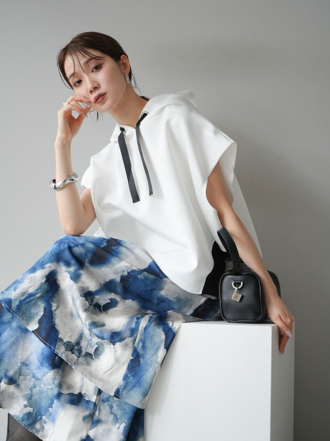 アシンメトリーな裾ラインが印象的なドルマンフーディー。ゆったりとしたシルエットと落ち感のある生地がリラックス感を与えつつ、モードな雰囲気も漂わせます。背面にはZIPを配し、開閉によってスタイリングに変化をつけられるデザイン性の高い一枚。ドロップショルダーとワイドスリーブが抜け感を演出し、カットソーやシャツを合わせたレイヤードスタイルにも好相性。軽やかに羽織れるため、カジュアルからきれいめまで幅広く活躍するアイテムです。 ※ボトムス、キャミソール(インナー)以外の商品は一律でインナーは付属していません。