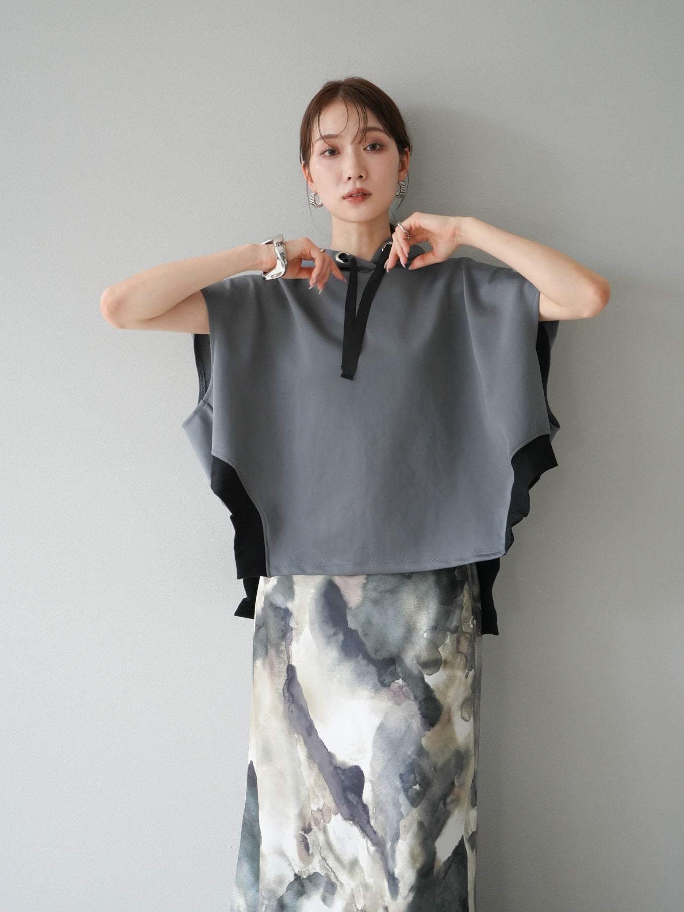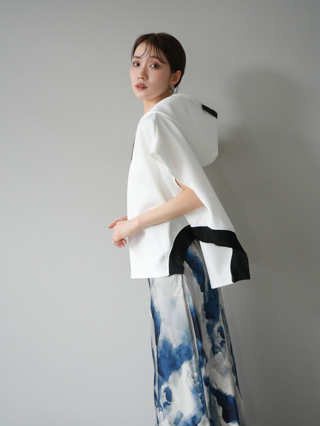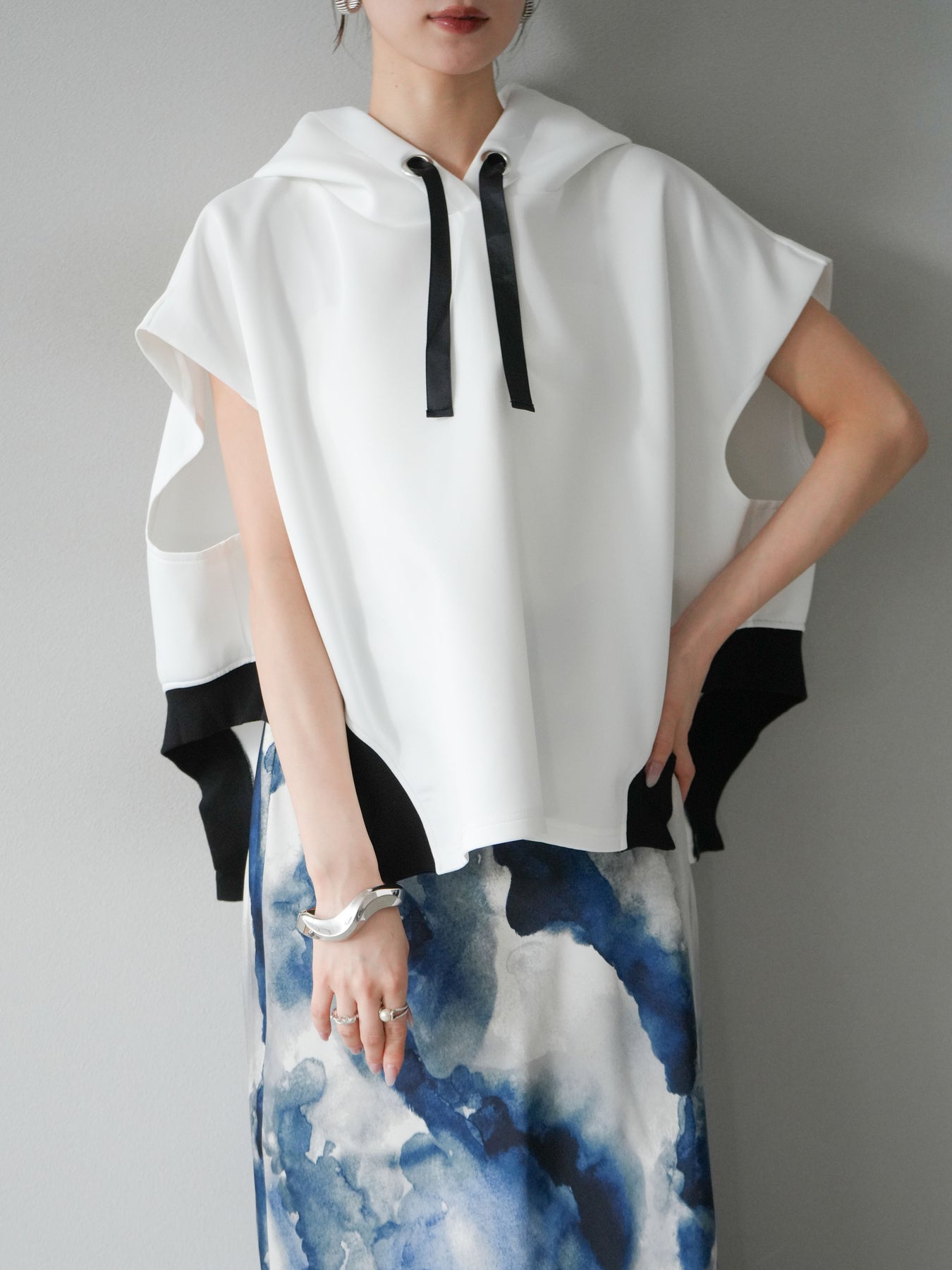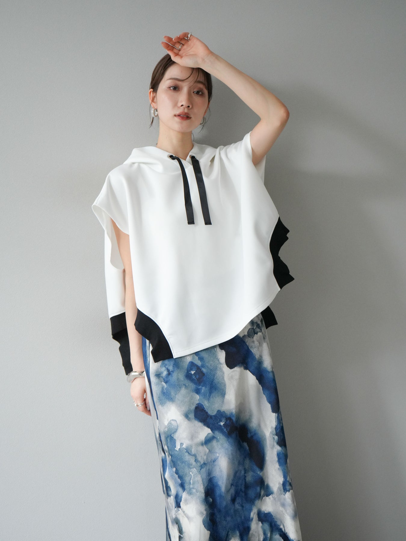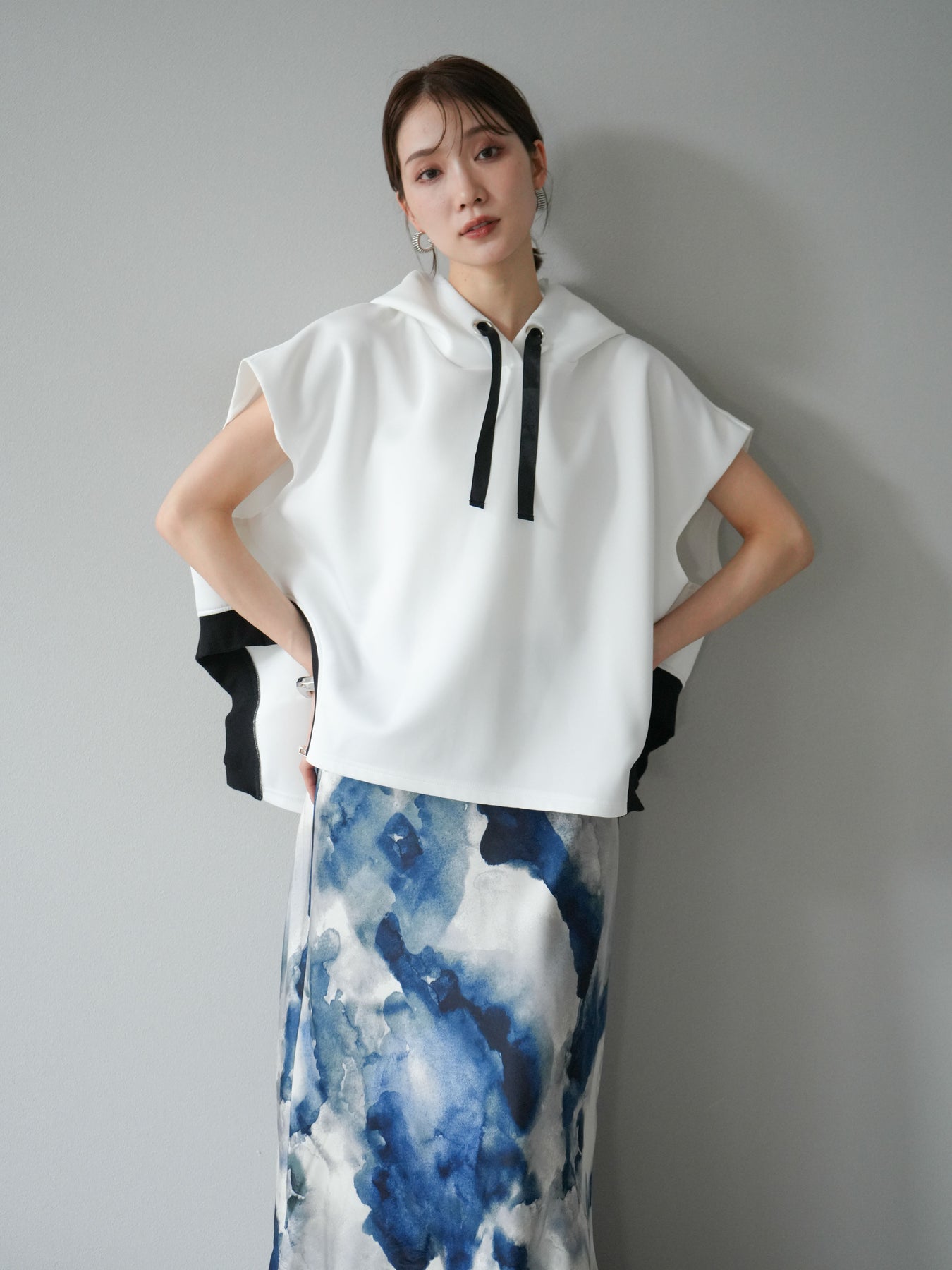 アシンメトリーな裾ラインが印象的なドルマンフーディー。ゆったりとしたシルエットと落ち感のある生地がリラックス感を与えつつ、モードな雰囲気も漂わせます。背面にはZIPを配し、開閉によってスタイリングに変化をつけられるデザイン性の高い一枚。ドロップショルダーとワイドスリーブが抜け感を演出し、カットソーやシャツを合わせたレイヤードスタイルにも好相性。軽やかに羽織れるため、カジュアルからきれいめまで幅広く活躍するアイテムです。 ※ボトムス、キャミソール(インナー)以外の商品は一律でインナーは付属していません。