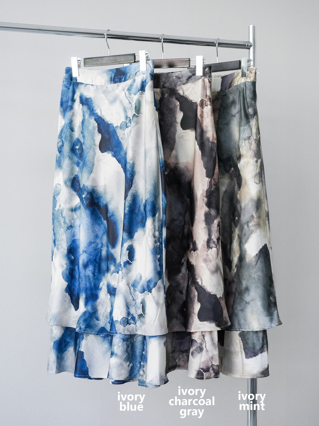 光沢感のあるサテン素材にニュアンス感のあるプリントを施したフリルスカート。動くたびに揺れる裾のフリルが女性らしさを引き立て、華やかさと軽やかさを演出します。落ち感のある生地を使用しているため広がりすぎず、すっきりとしたシルエットをキープ。トップスをインして主役として着こなすのはもちろん、シンプルなニットやシャツと合わせてもスタイリングが映える万能アイテムです。シーズンレスに取り入れられる華やぎのある一枚で、コーディネートをアップデートしてくれます。
