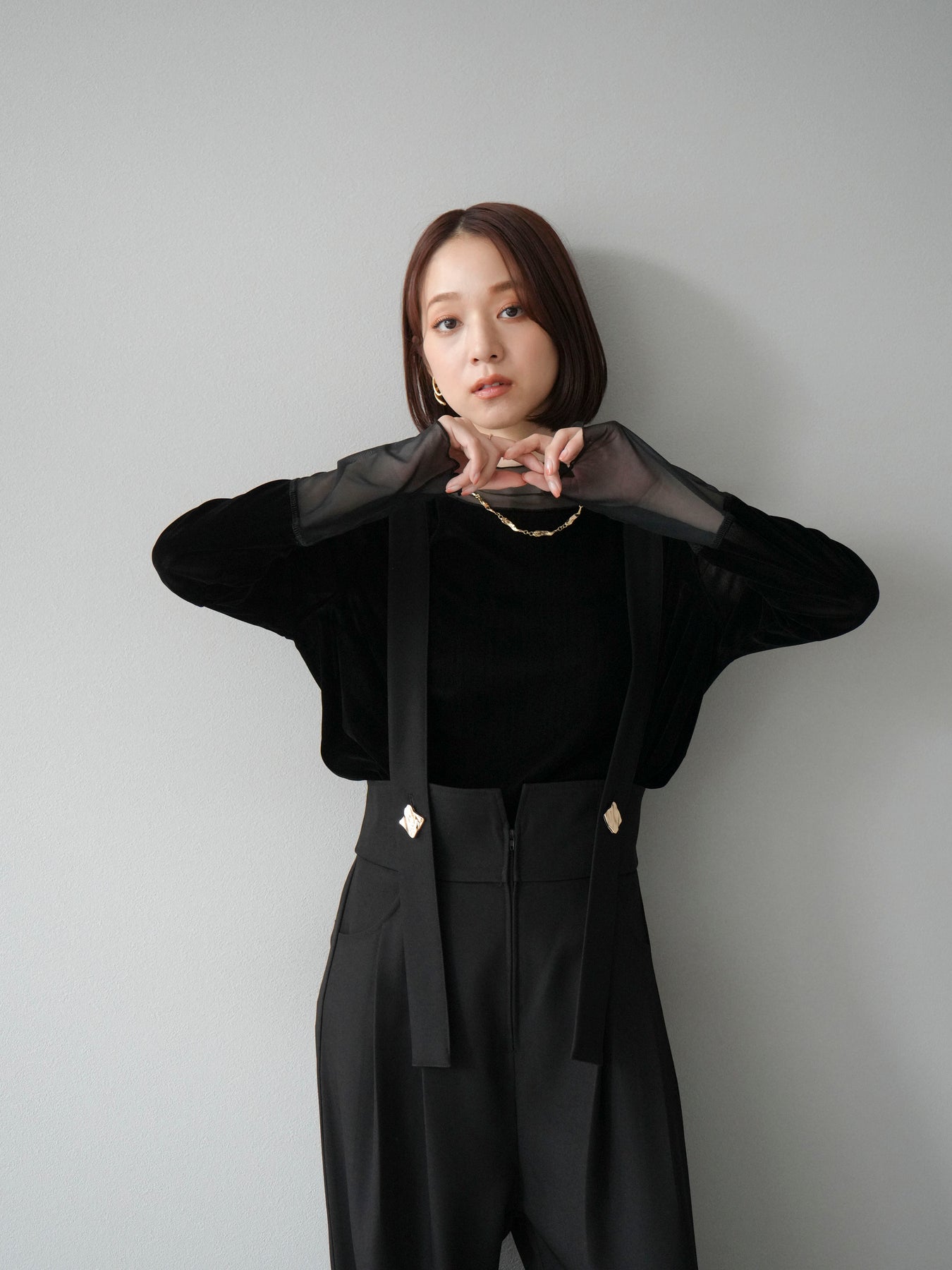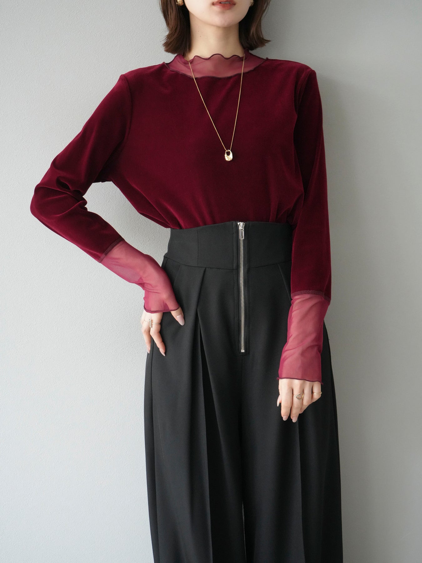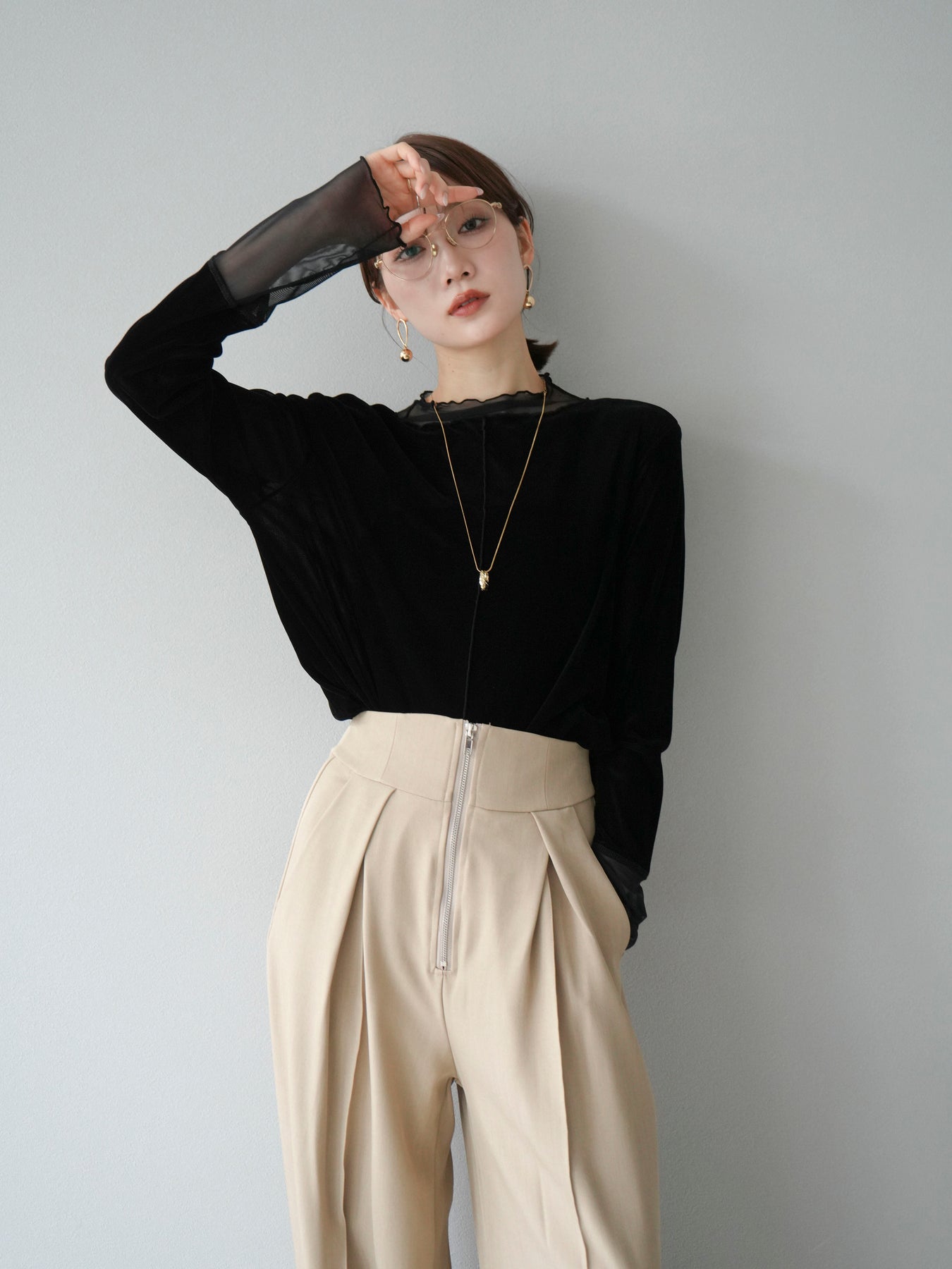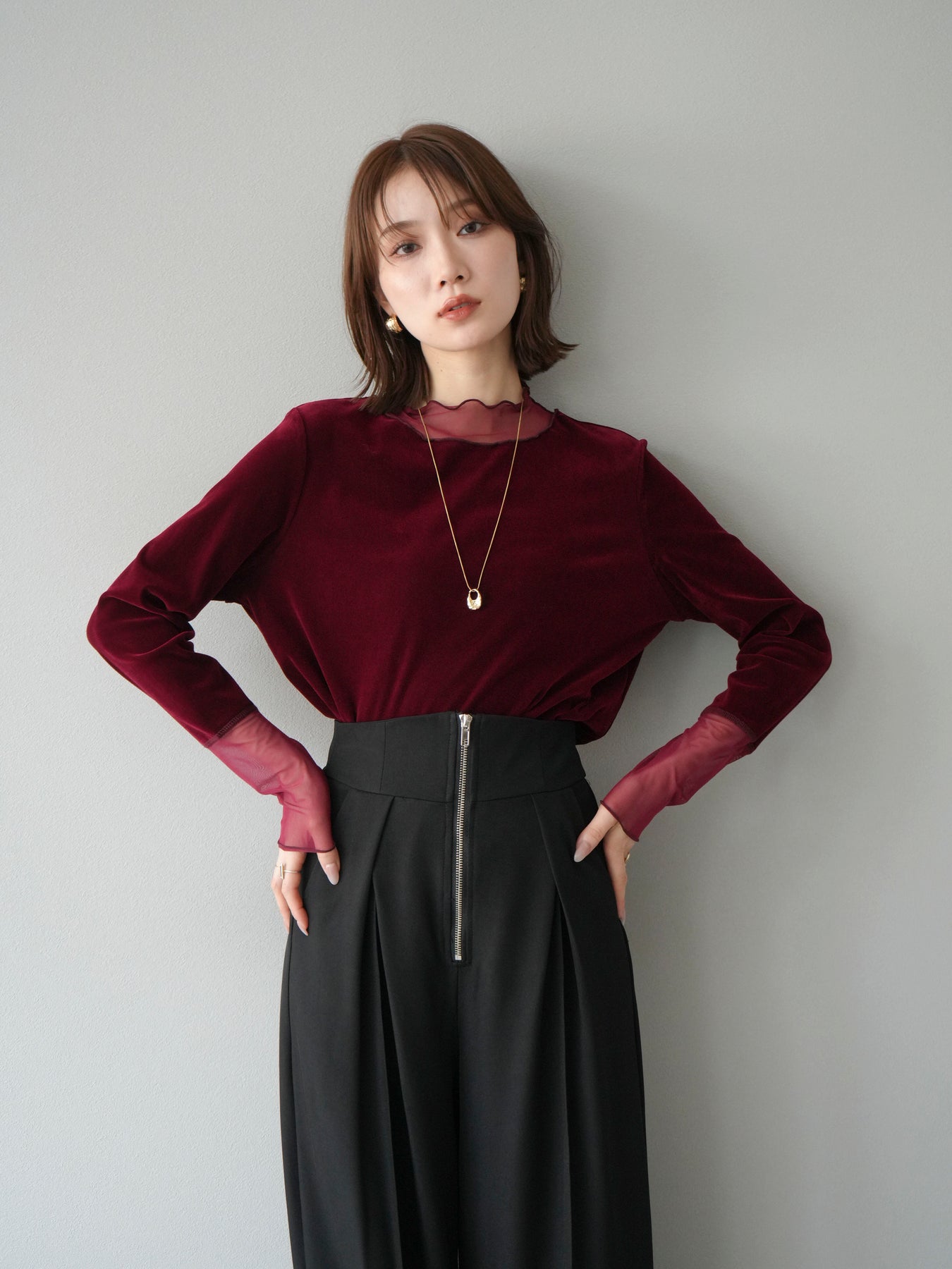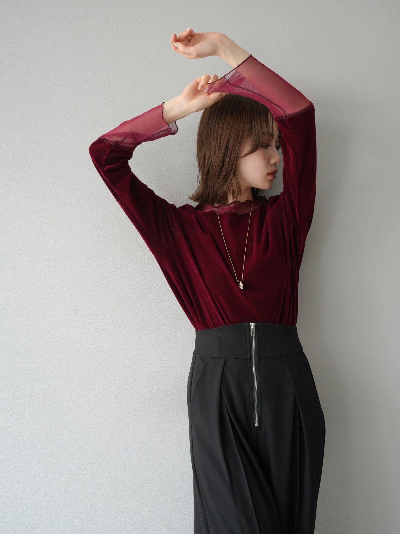 艶やかなベロア素材とシアー生地を切り替えたデザインが印象的なトップス。滑らかな質感のベロアがシーズンムードを高め、袖口やネックラインにあしらわれた透け感のあるディテールが女性らしい抜け感を演出します。コンパクトなシルエットでボトムスを選ばず、スカートにもパンツにも好相性。1枚で存在感を放ちながら、ジャケットやカーディガンのインナーとしても映える万能アイテムです。 ※ボトムス、キャミソール(インナー)以外の商品は一律でインナーは付属していません。