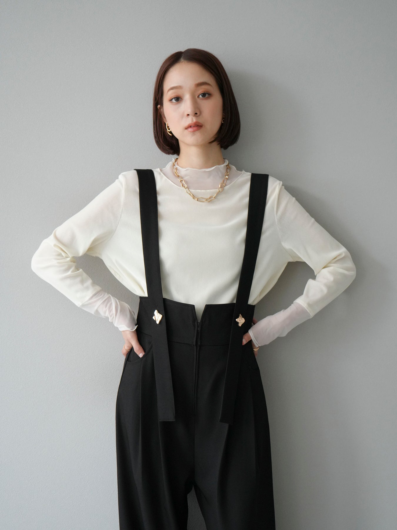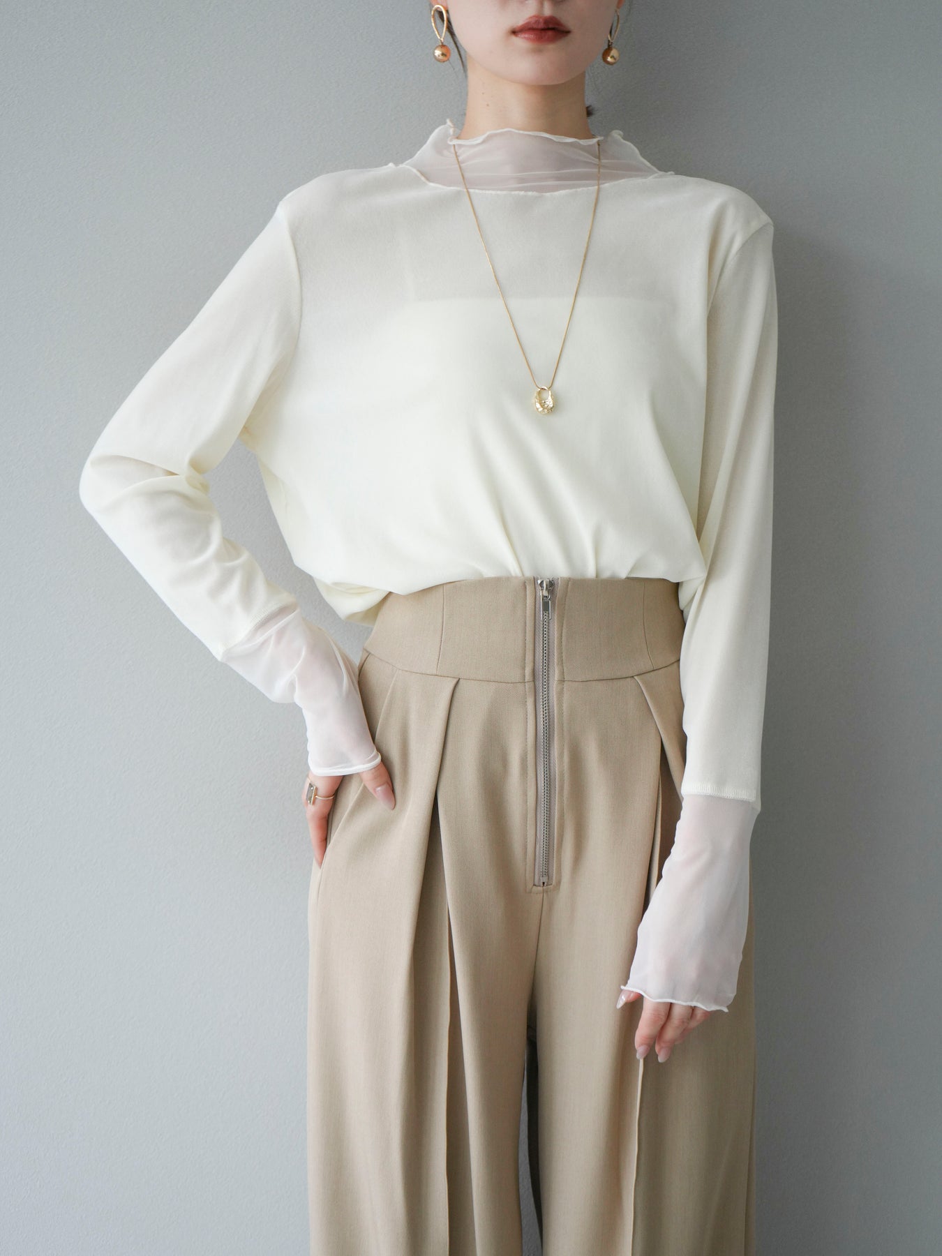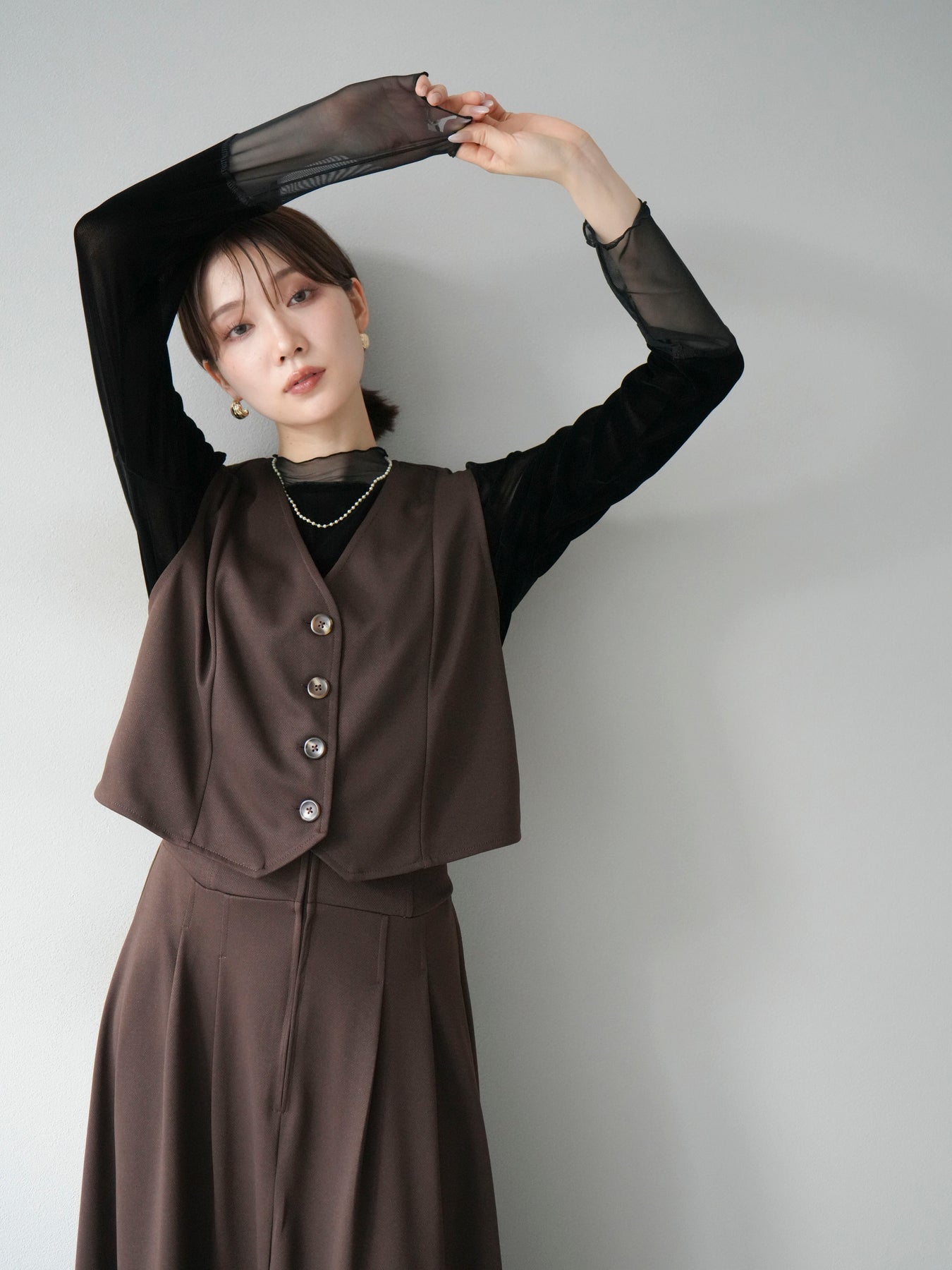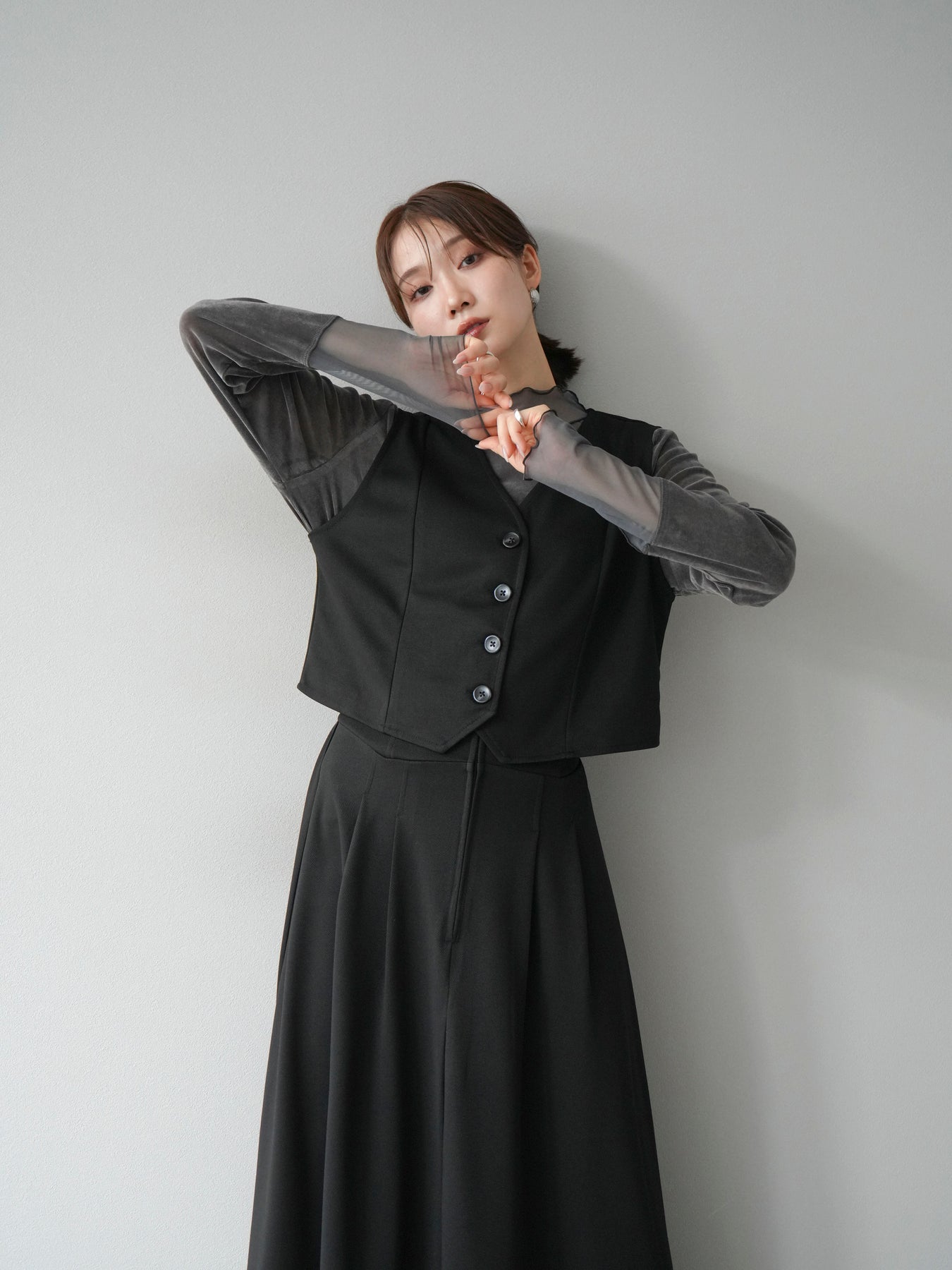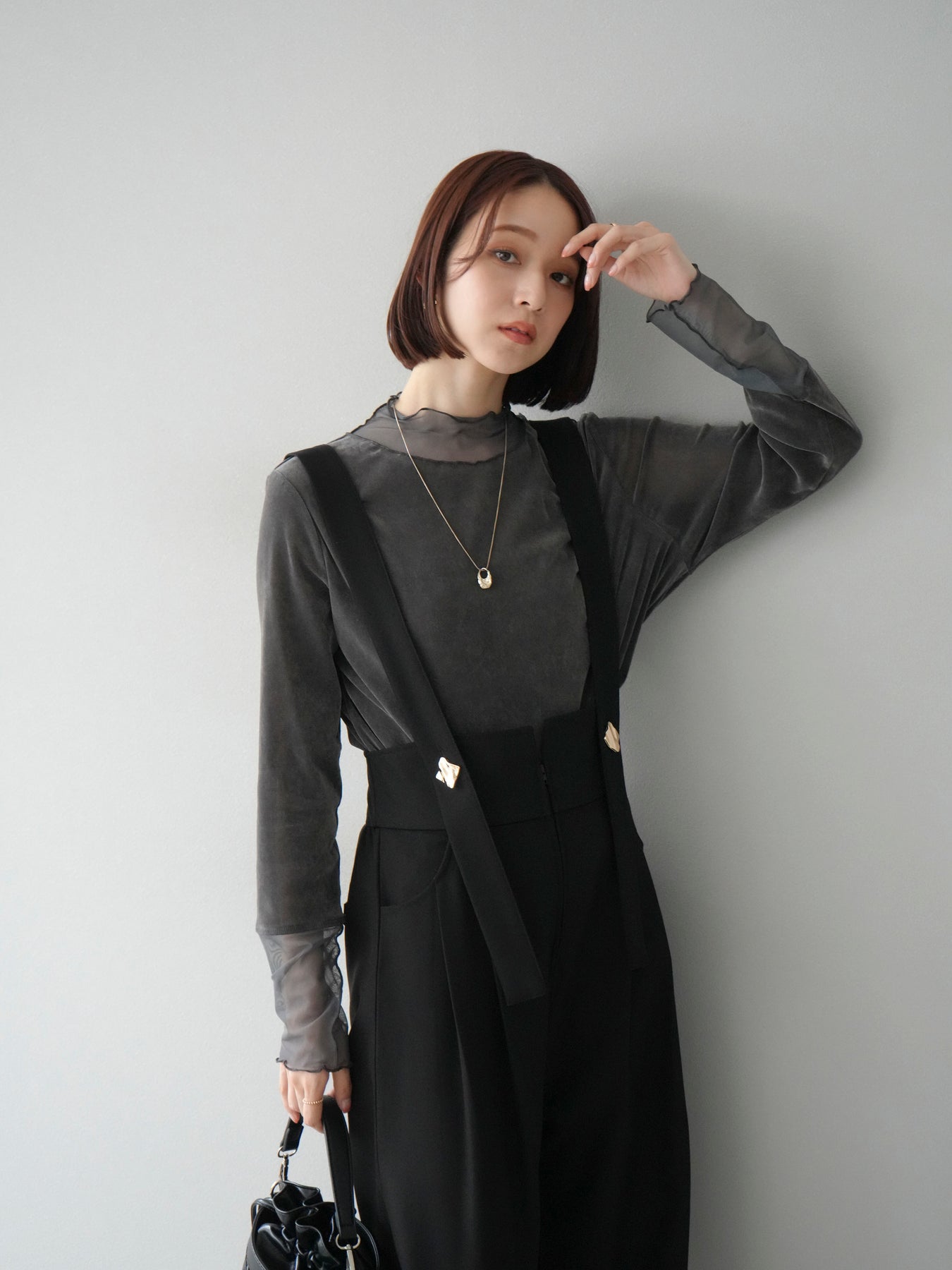 艶やかなベロア素材とシアー生地を切り替えたデザインが印象的なトップス。滑らかな質感のベロアがシーズンムードを高め、袖口やネックラインにあしらわれた透け感のあるディテールが女性らしい抜け感を演出します。コンパクトなシルエットでボトムスを選ばず、スカートにもパンツにも好相性。1枚で存在感を放ちながら、ジャケットやカーディガンのインナーとしても映える万能アイテムです。 ※ボトムス、キャミソール(インナー)以外の商品は一律でインナーは付属していません。