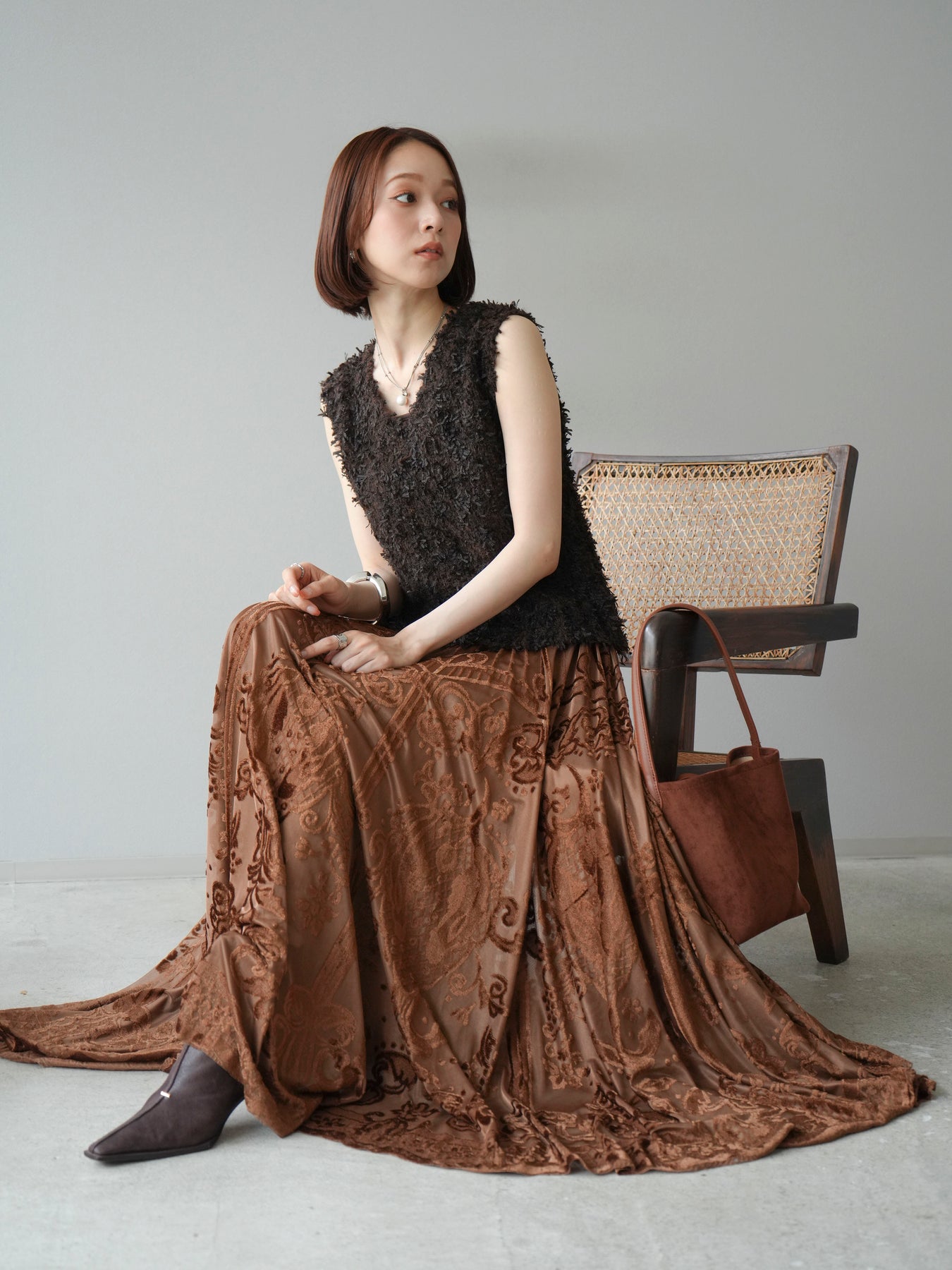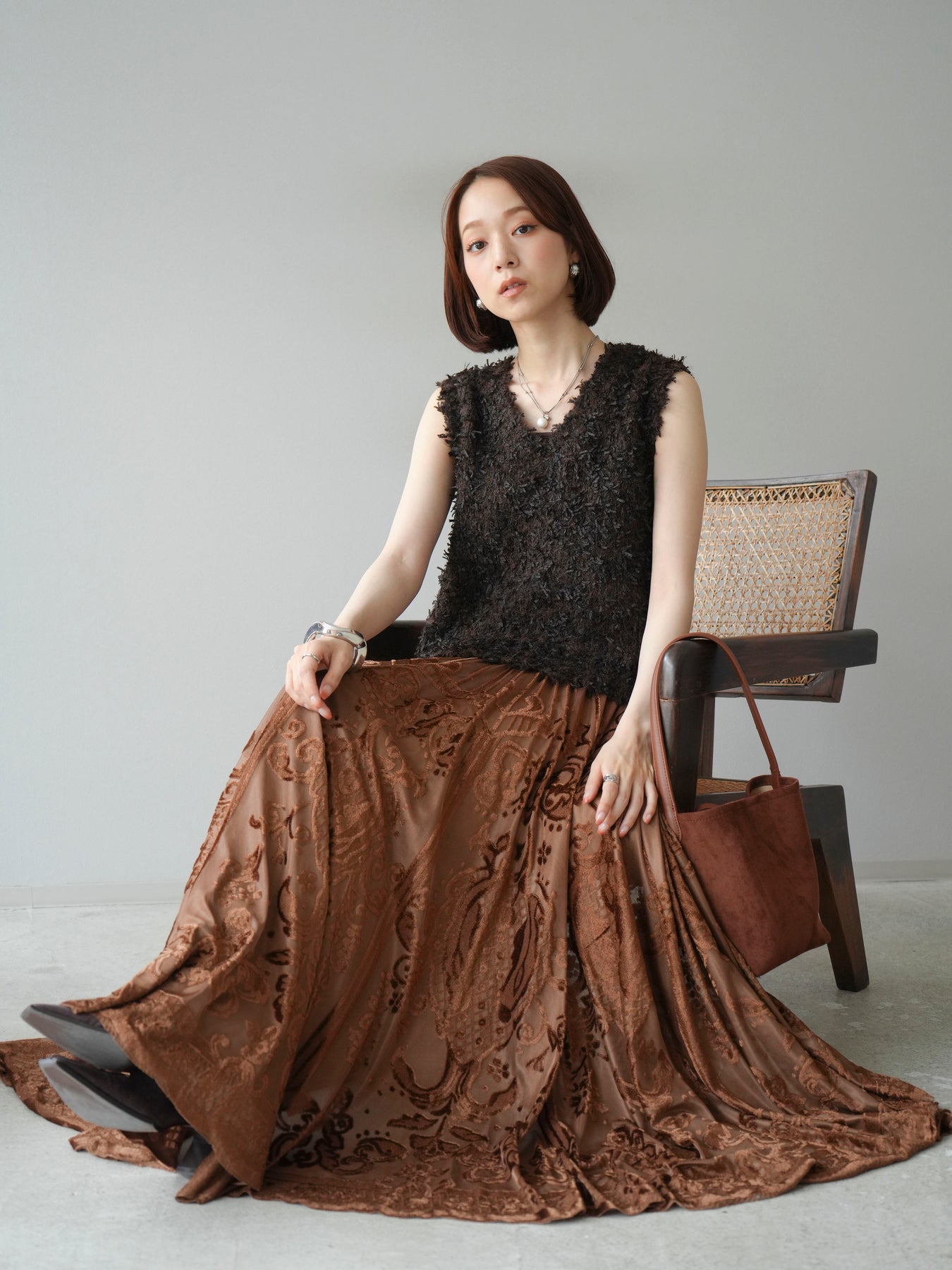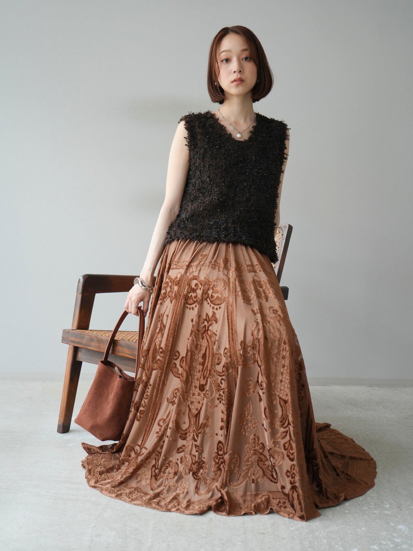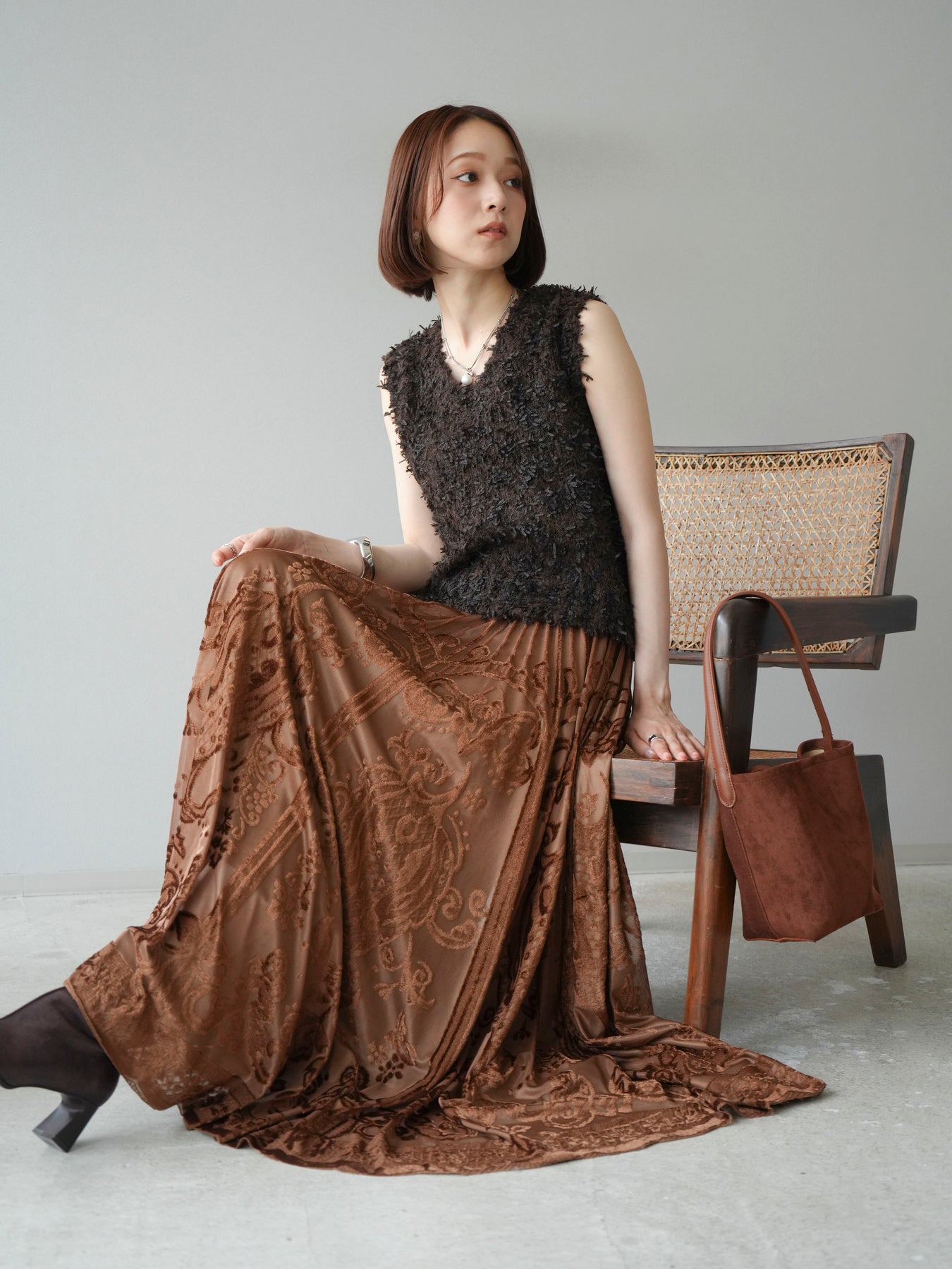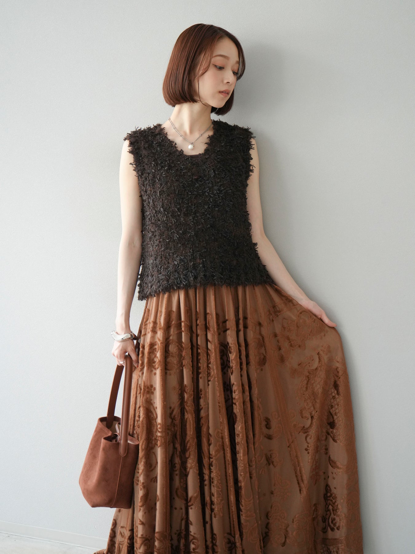[SET]テープヤーンフリンジニットベスト+アンティーク柄フロッキーマキシスカート(2set)