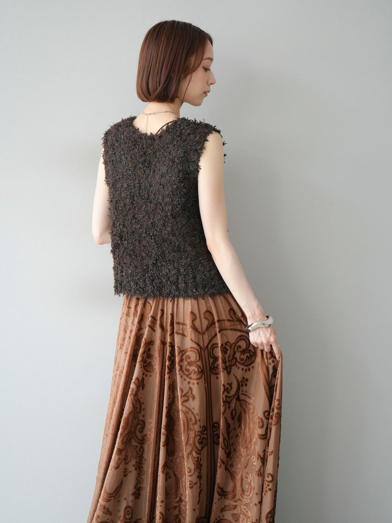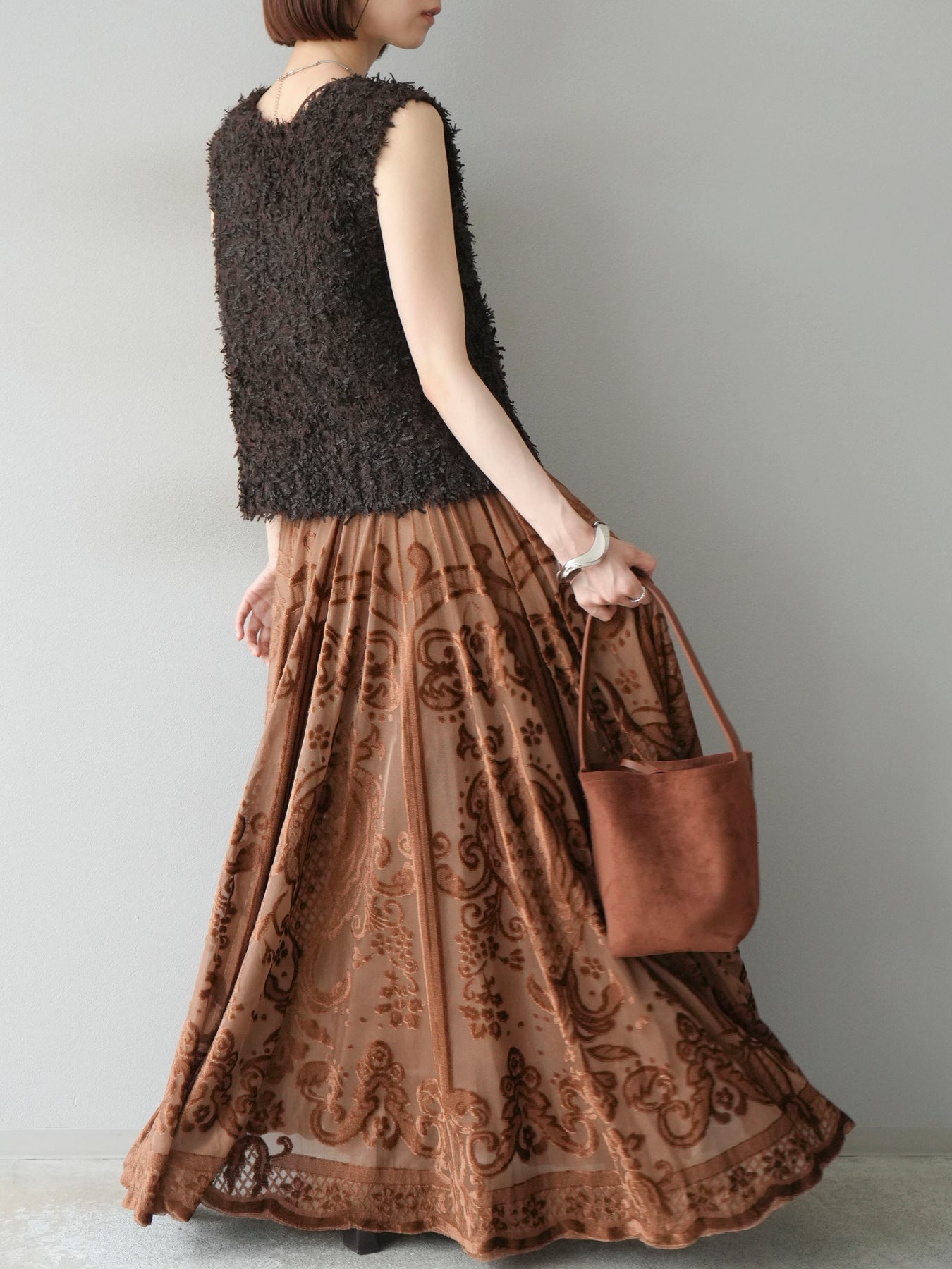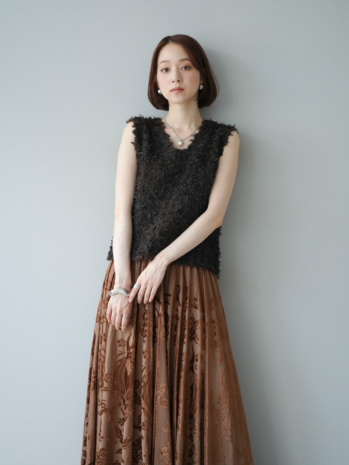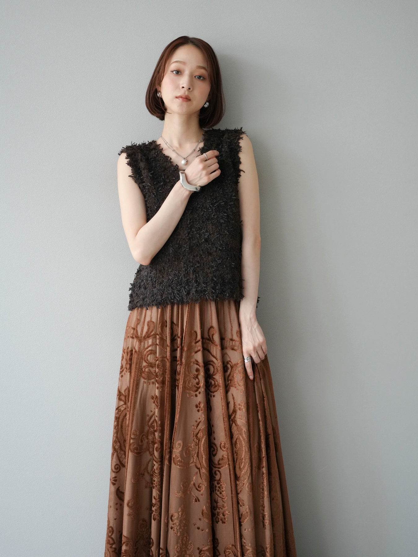[SET]テープヤーンフリンジニットベスト+アンティーク柄フロッキーマキシスカート(2set)