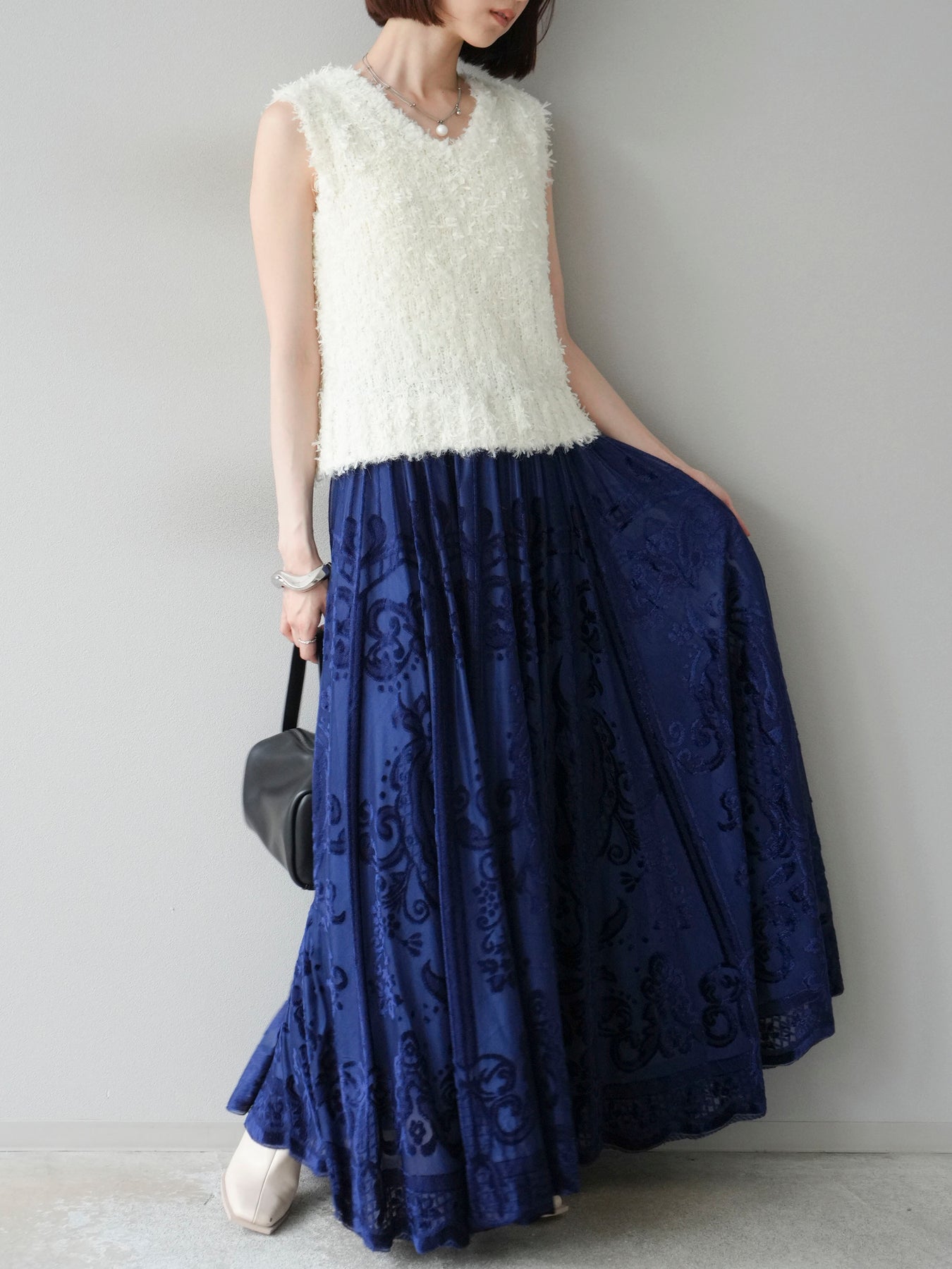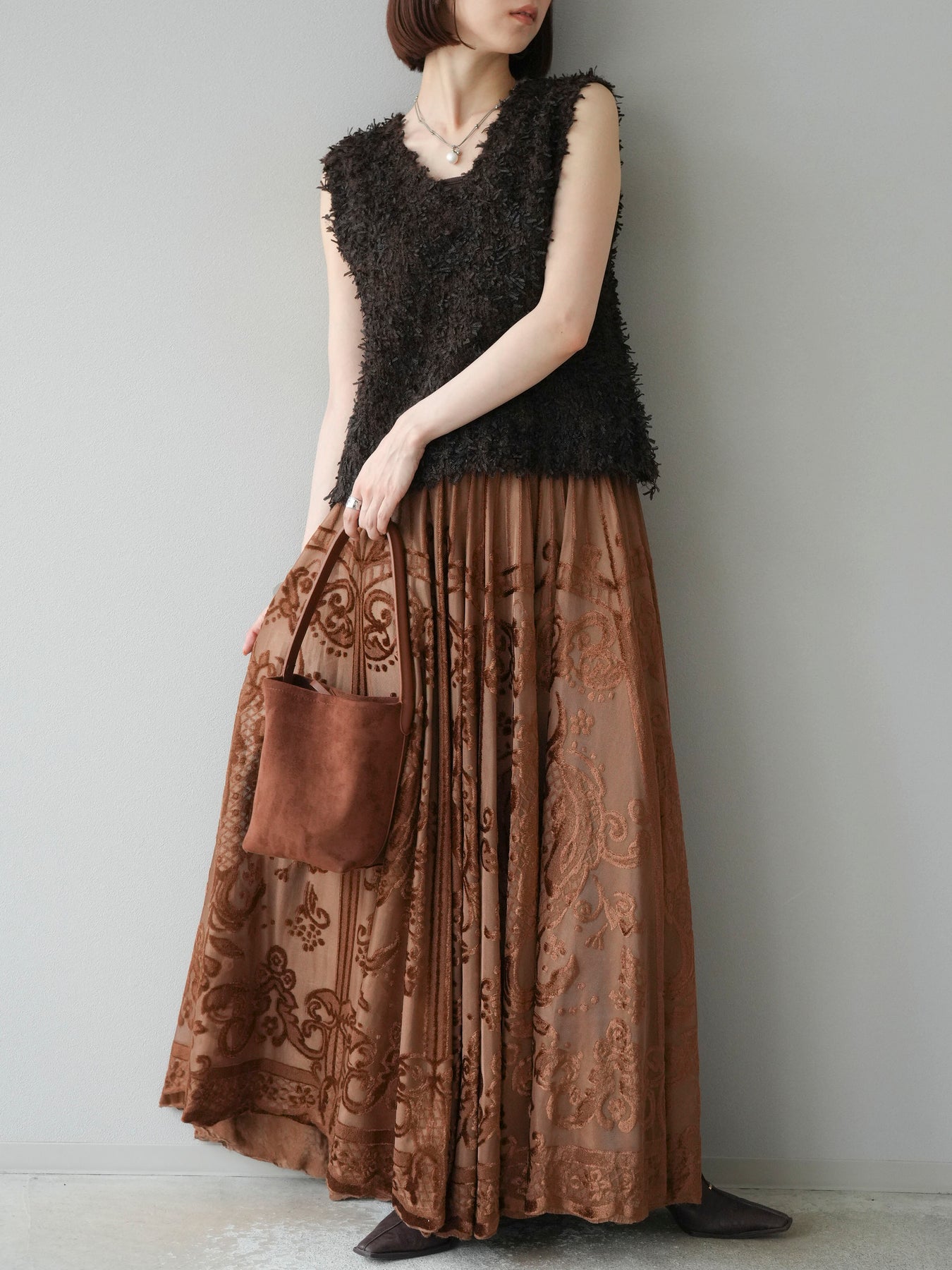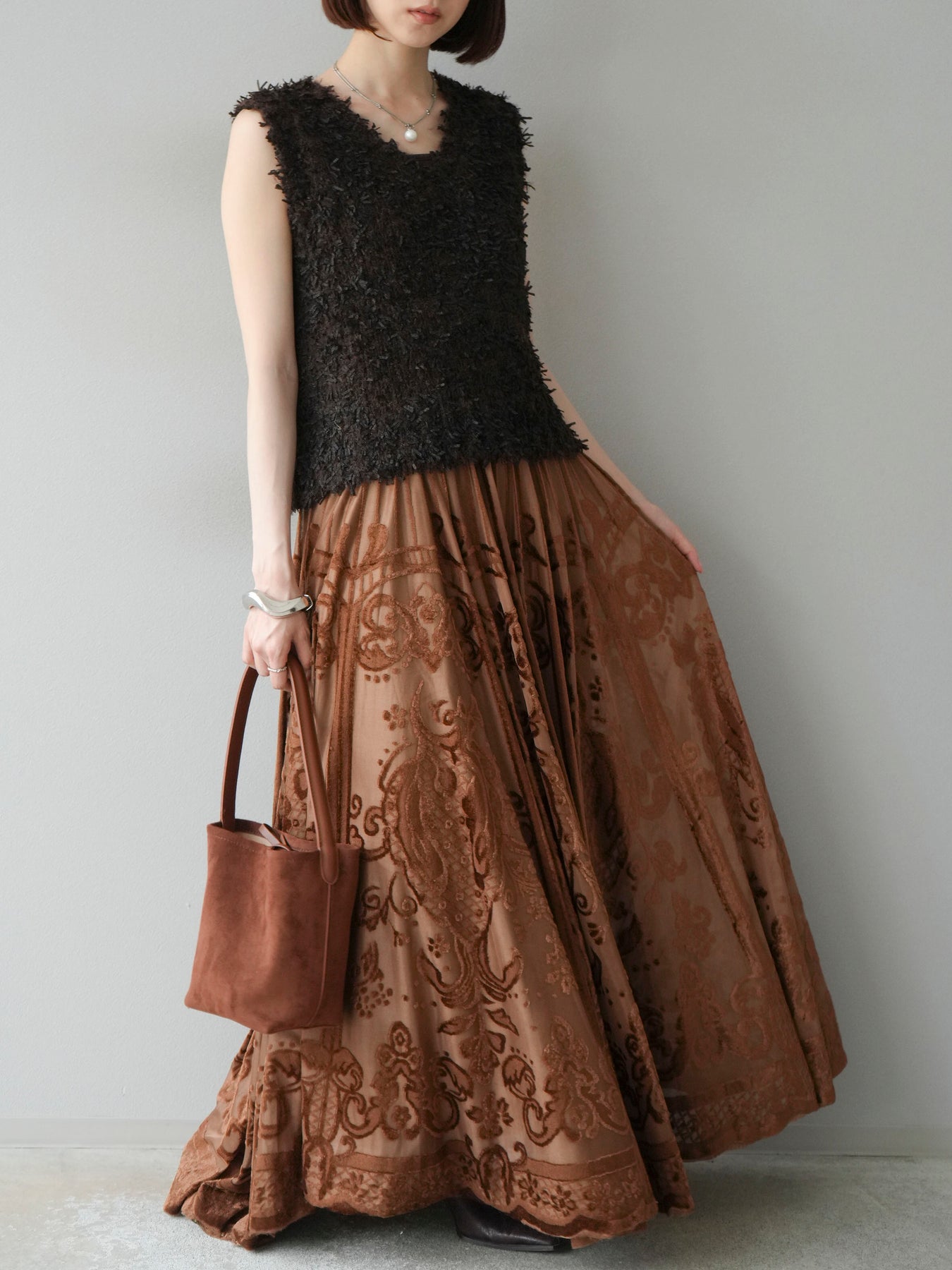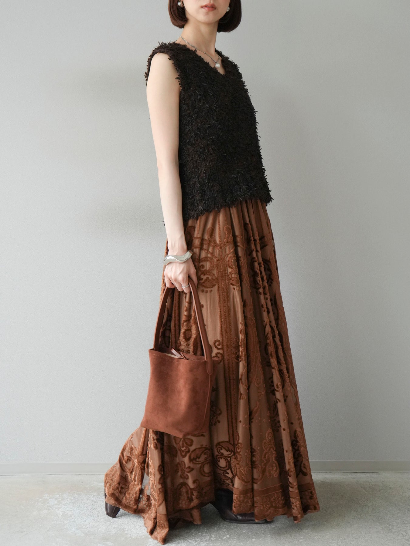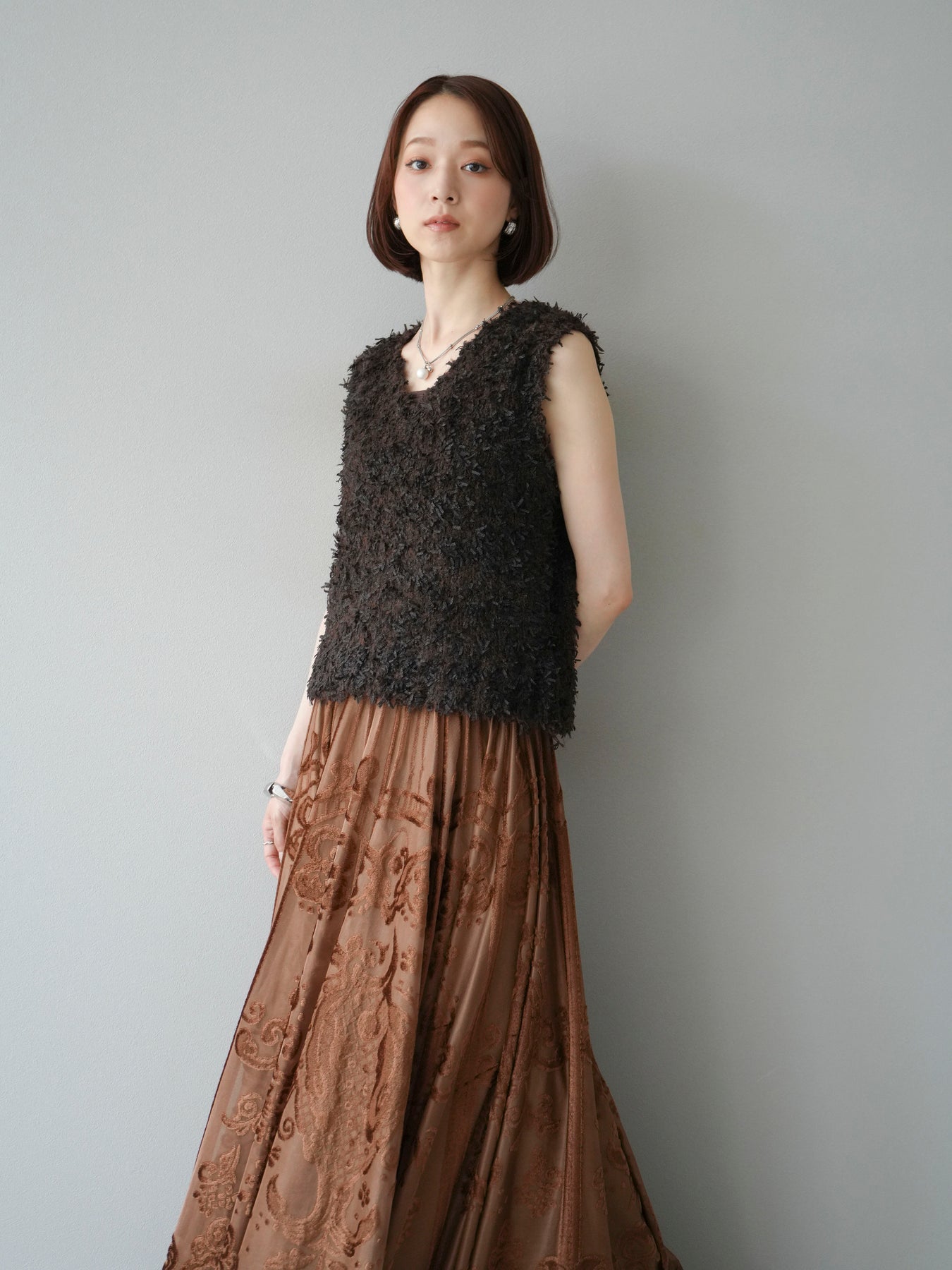 [SET]テープヤーンフリンジニットベスト+アンティーク柄フロッキーマキシスカート(2set)