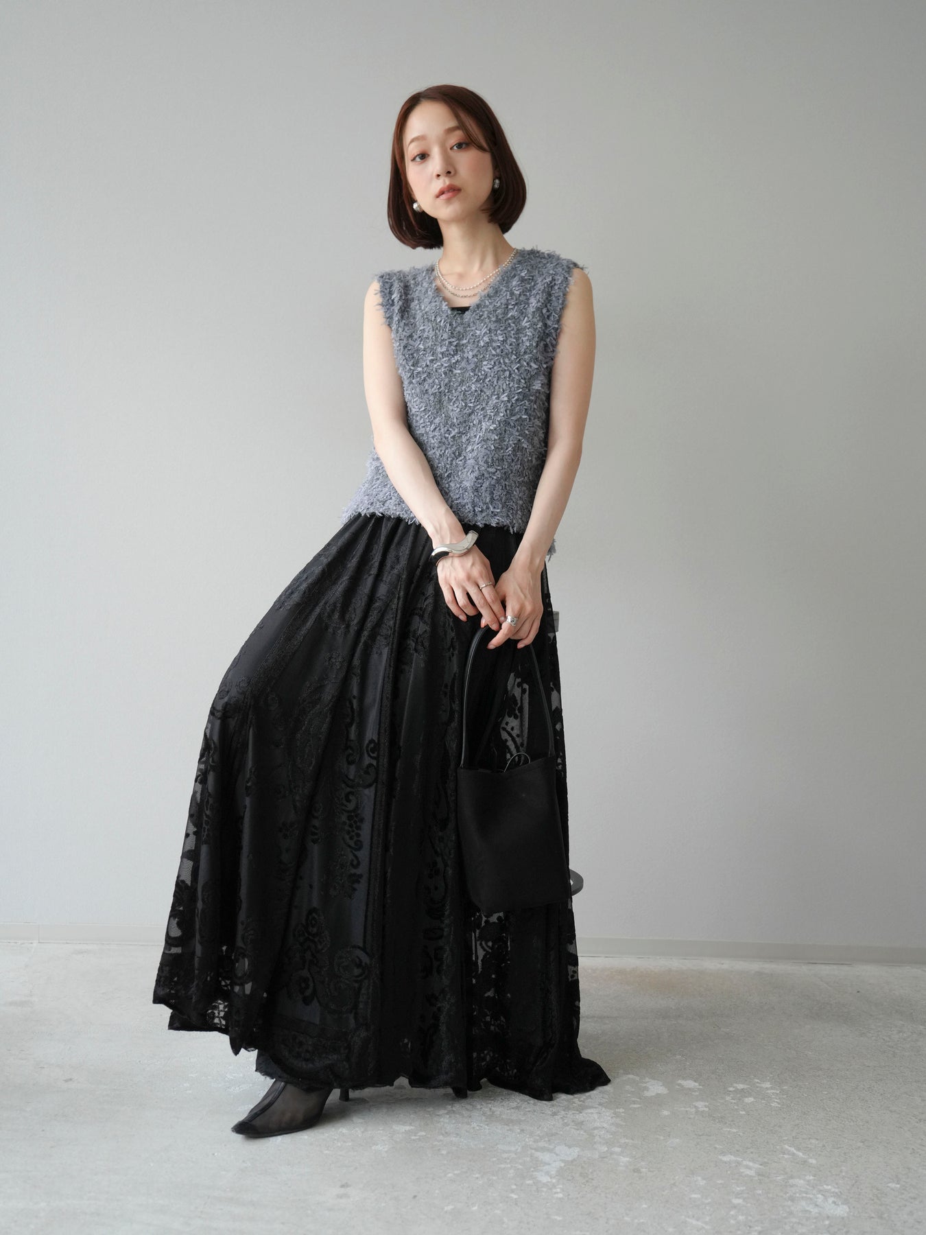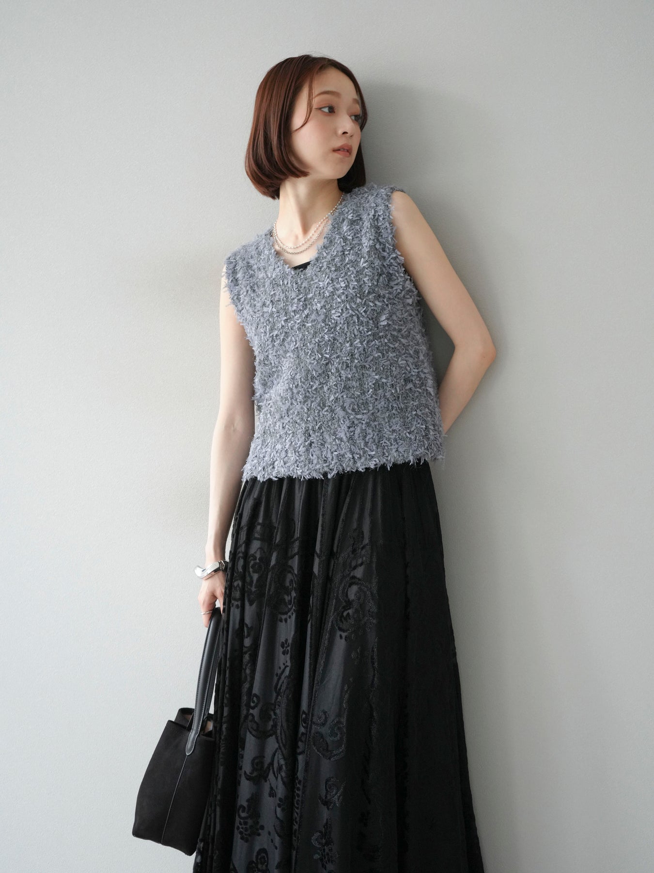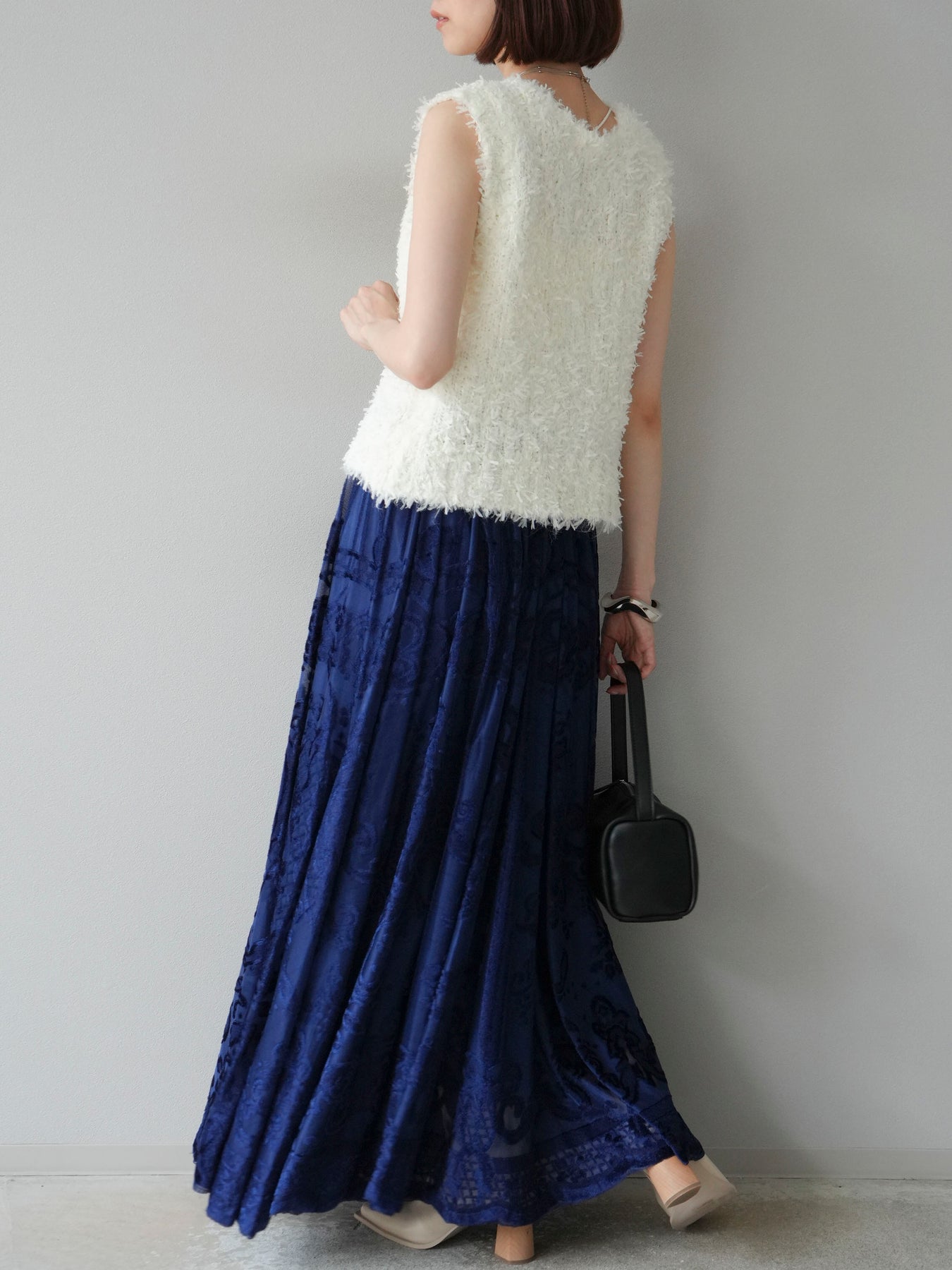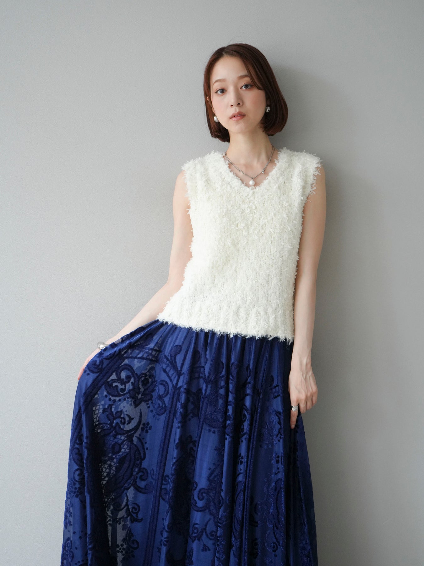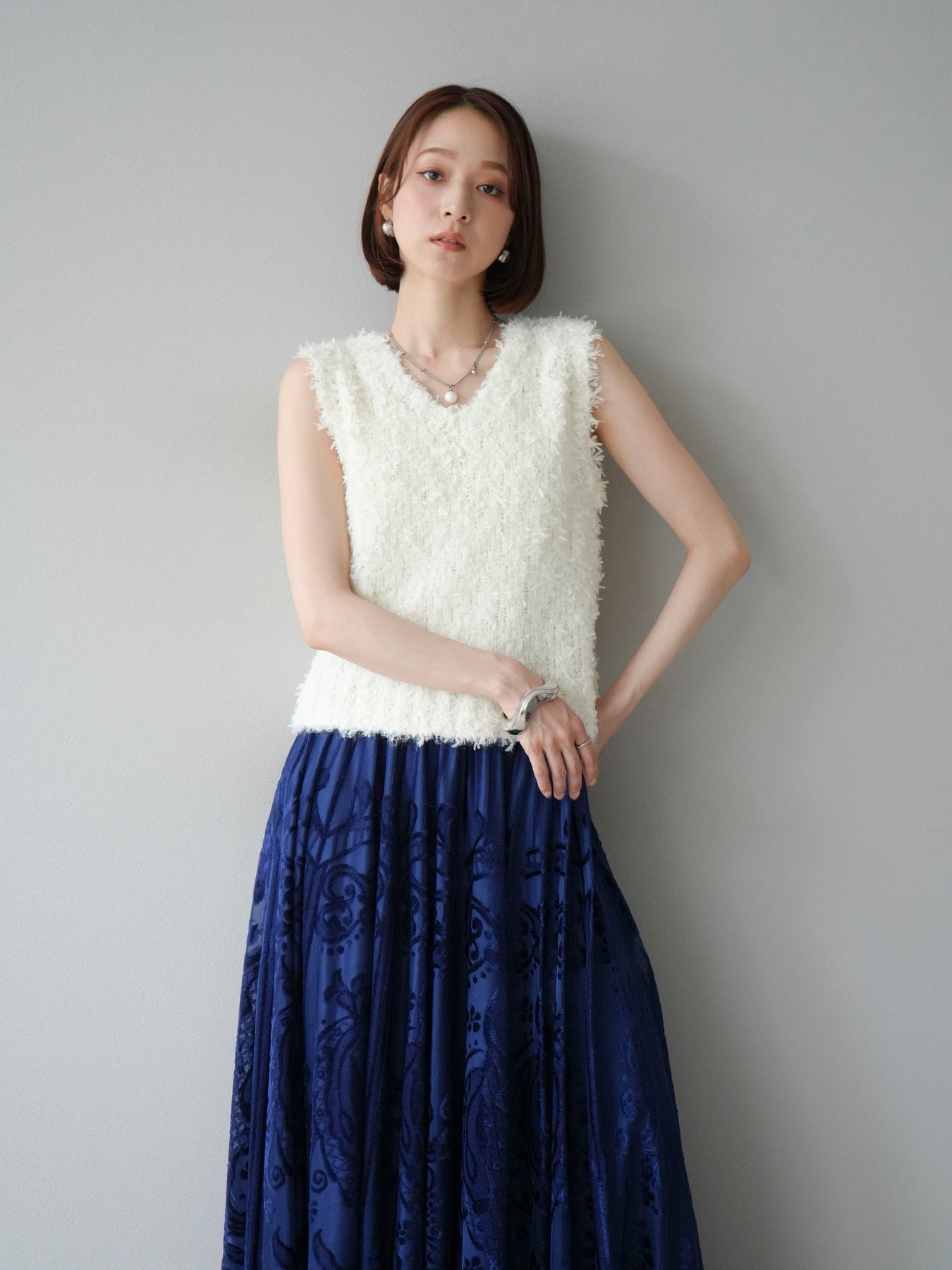 [SET]テープヤーンフリンジニットベスト+アンティーク柄フロッキーマキシスカート(2set)